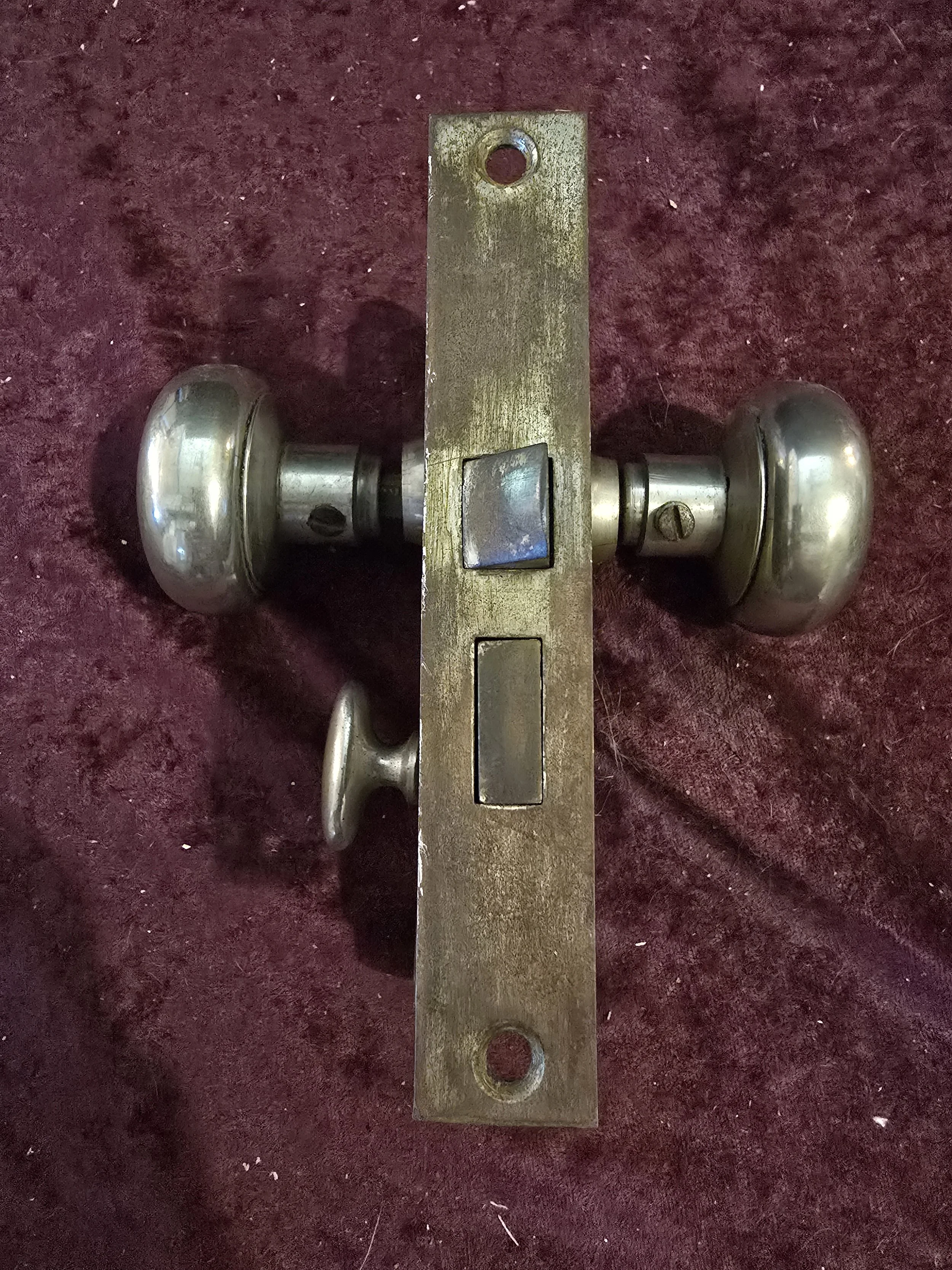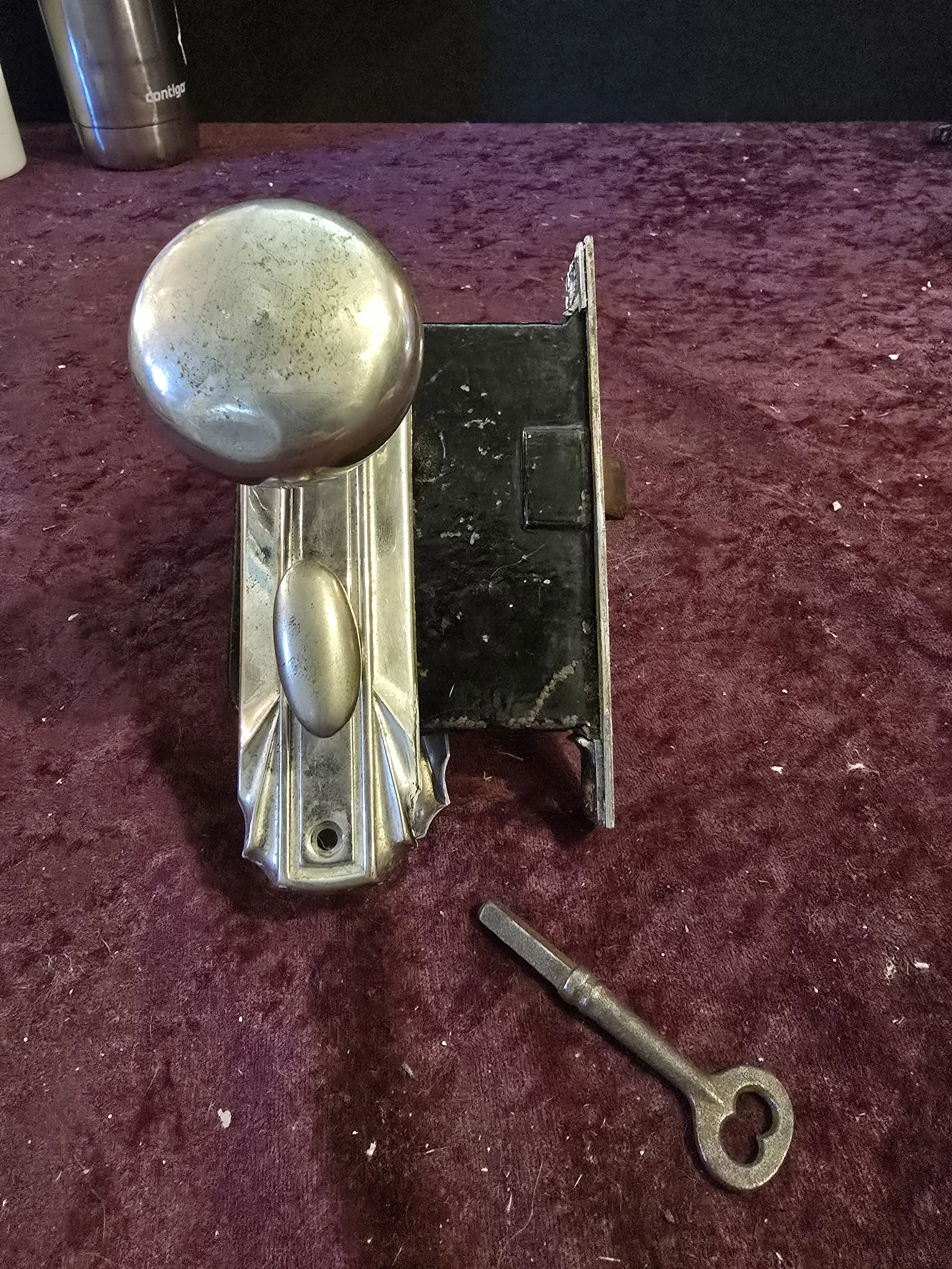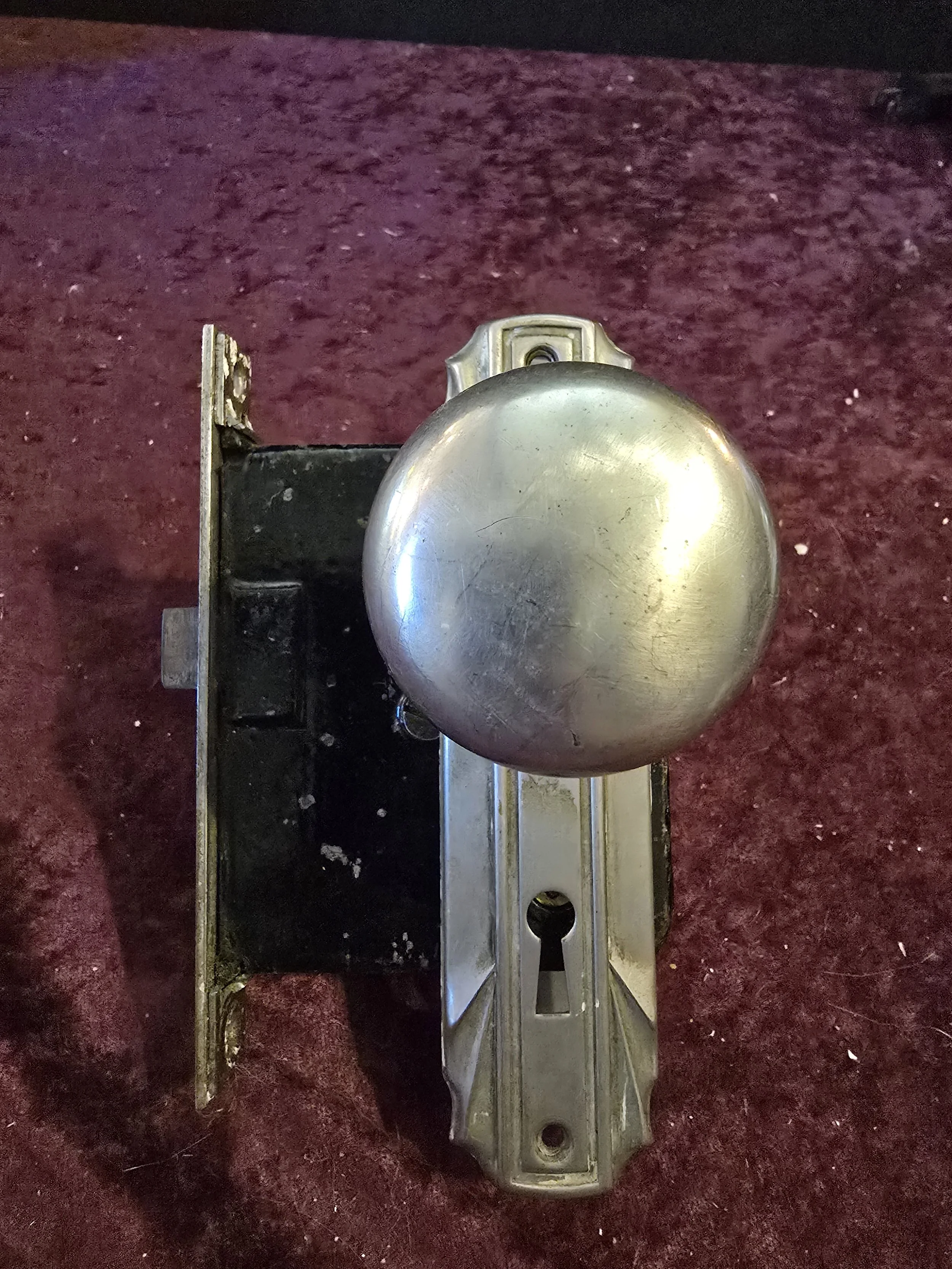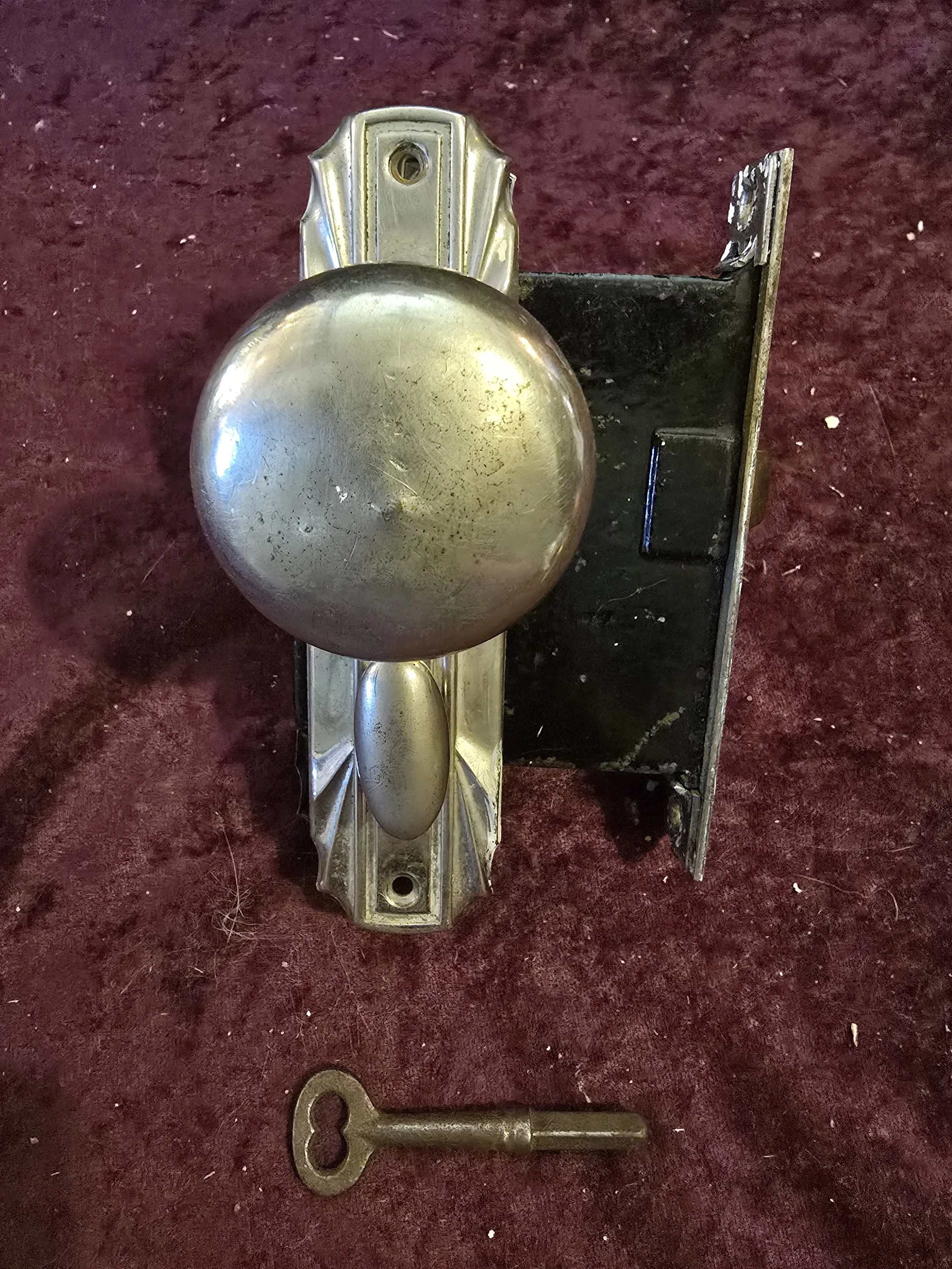 Old door knob set which includes decorative style nickel back plates, Nickel knob, privacy mortise, and a privacy lock key. This set is meant to be used on an interior door. This set was removed from a historic building in Oak Cliff.