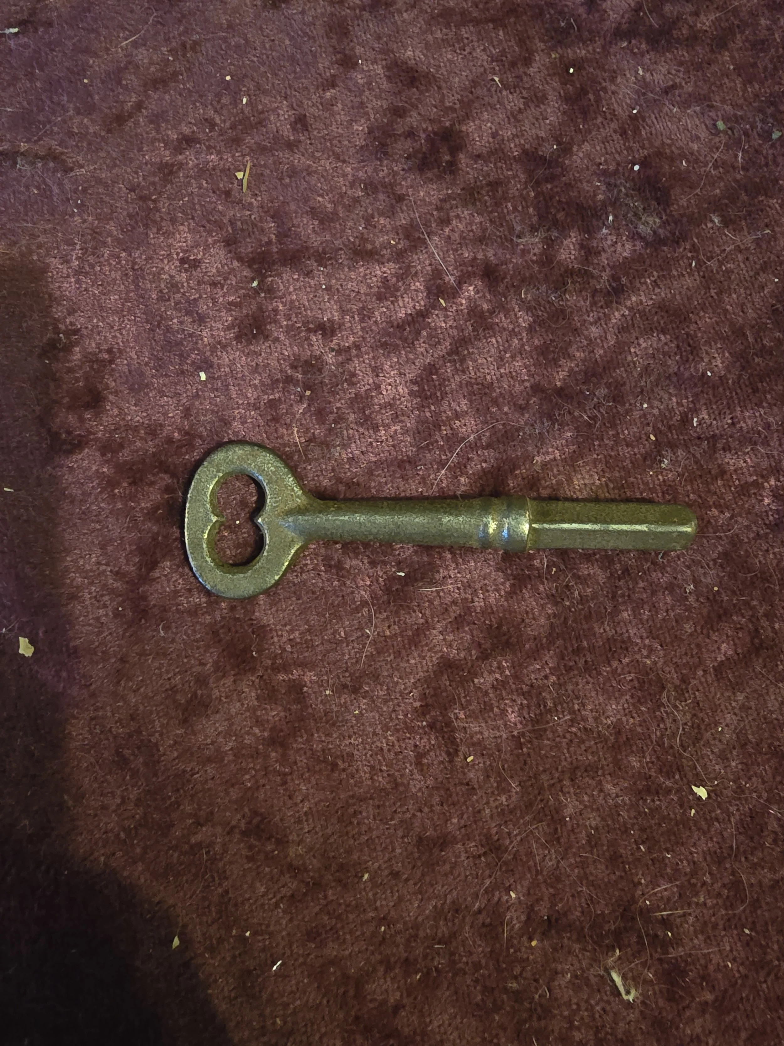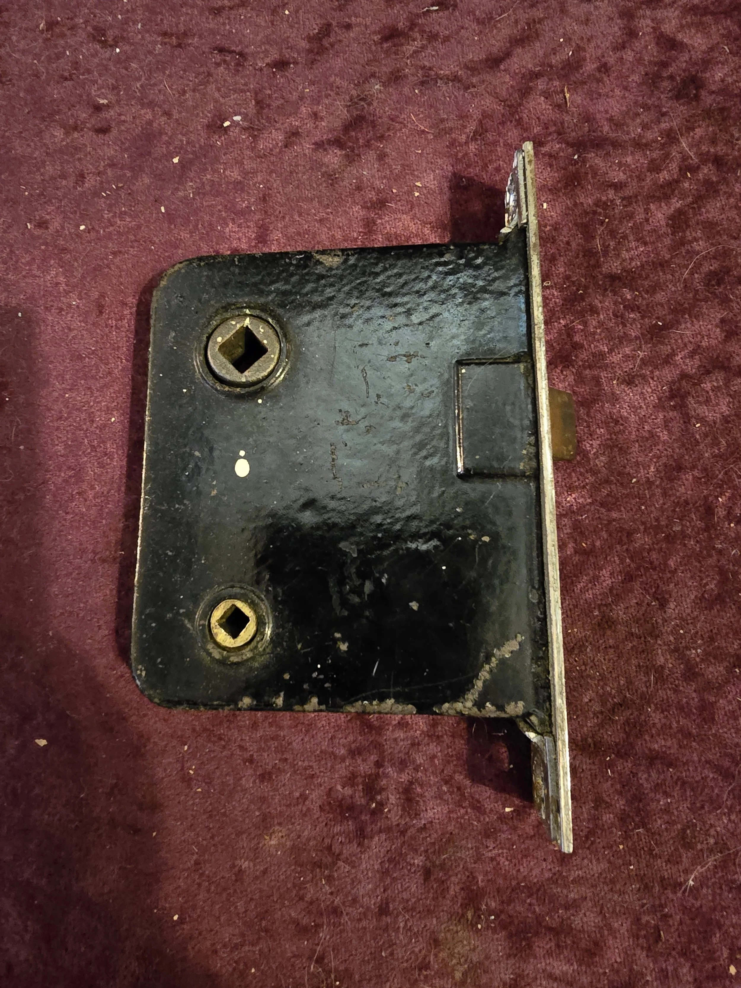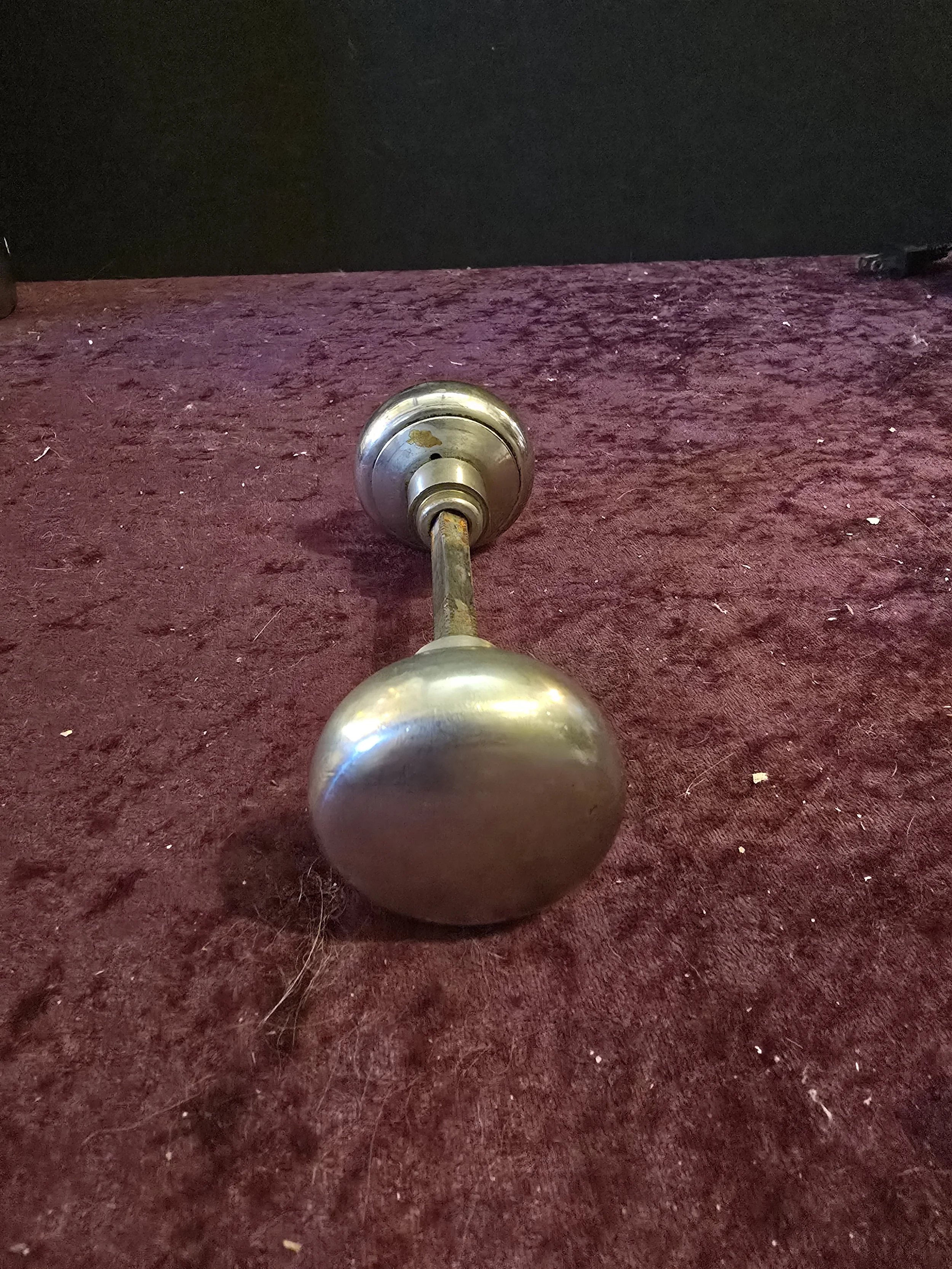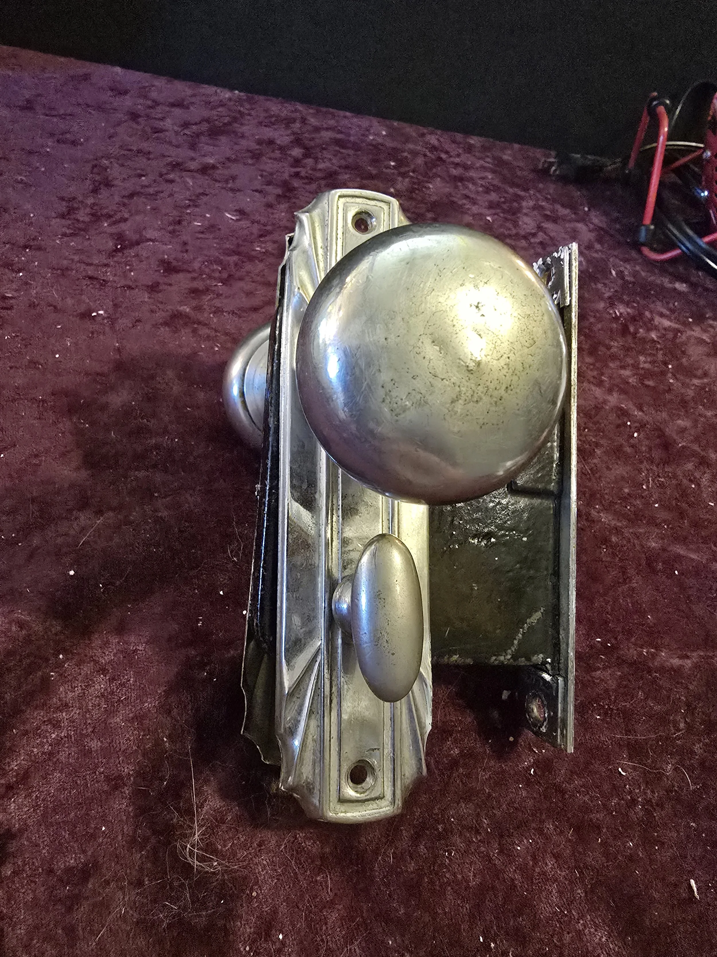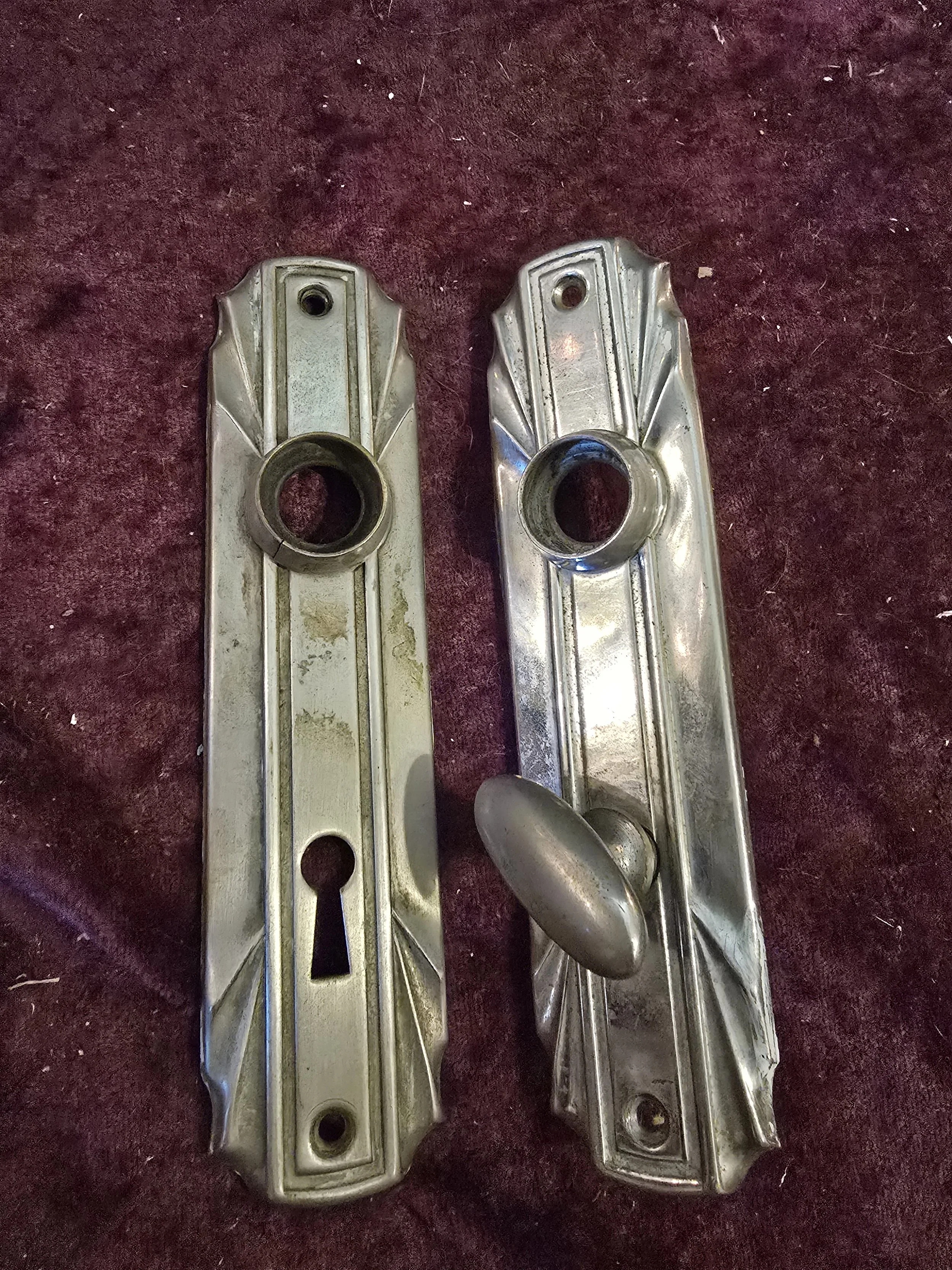 Old door knob set which includes decorative style nickel back plates, Nickel knob, privacy mortise, and a privacy lock key. This set is meant to be used on an interior door. This set was removed from a historic building in Oak Cliff.