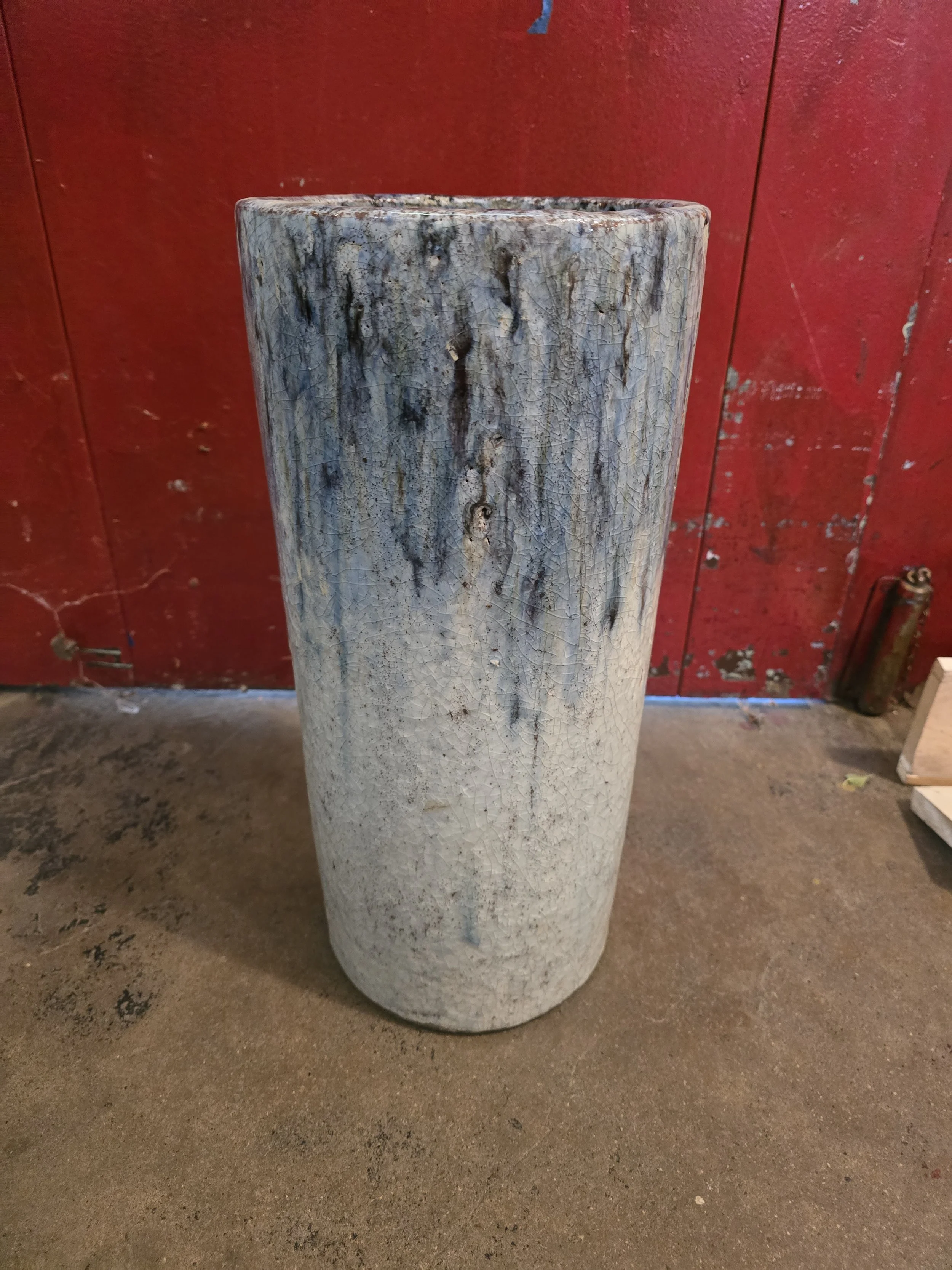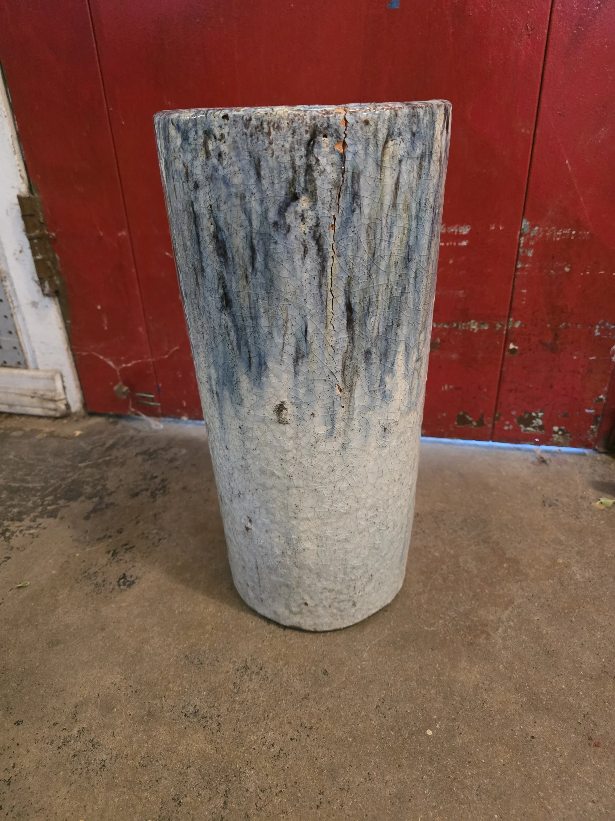 Blue and white ceramic umbrella stand. It does have 2 cracks at the top, but it is still sturdy and usable.