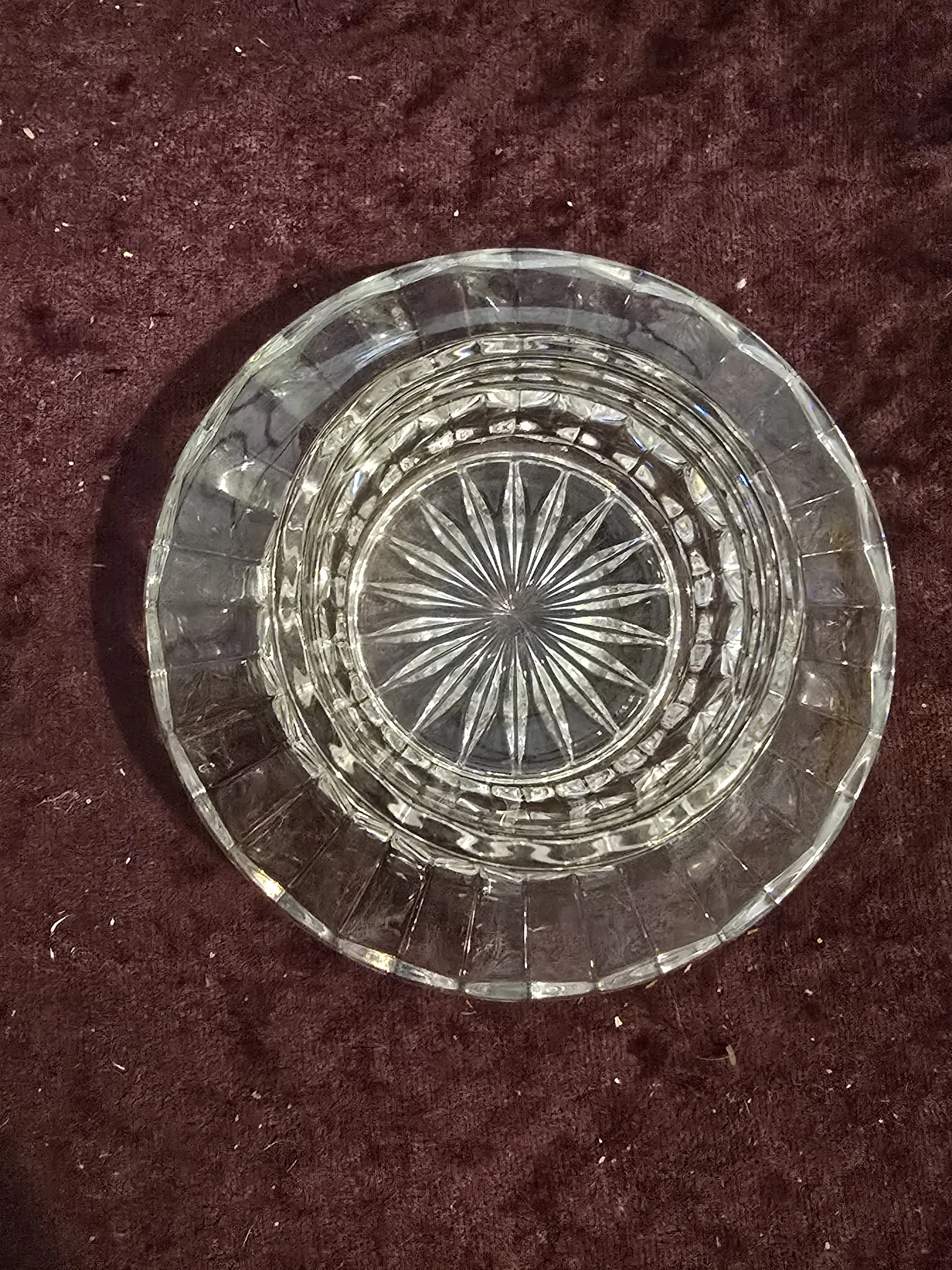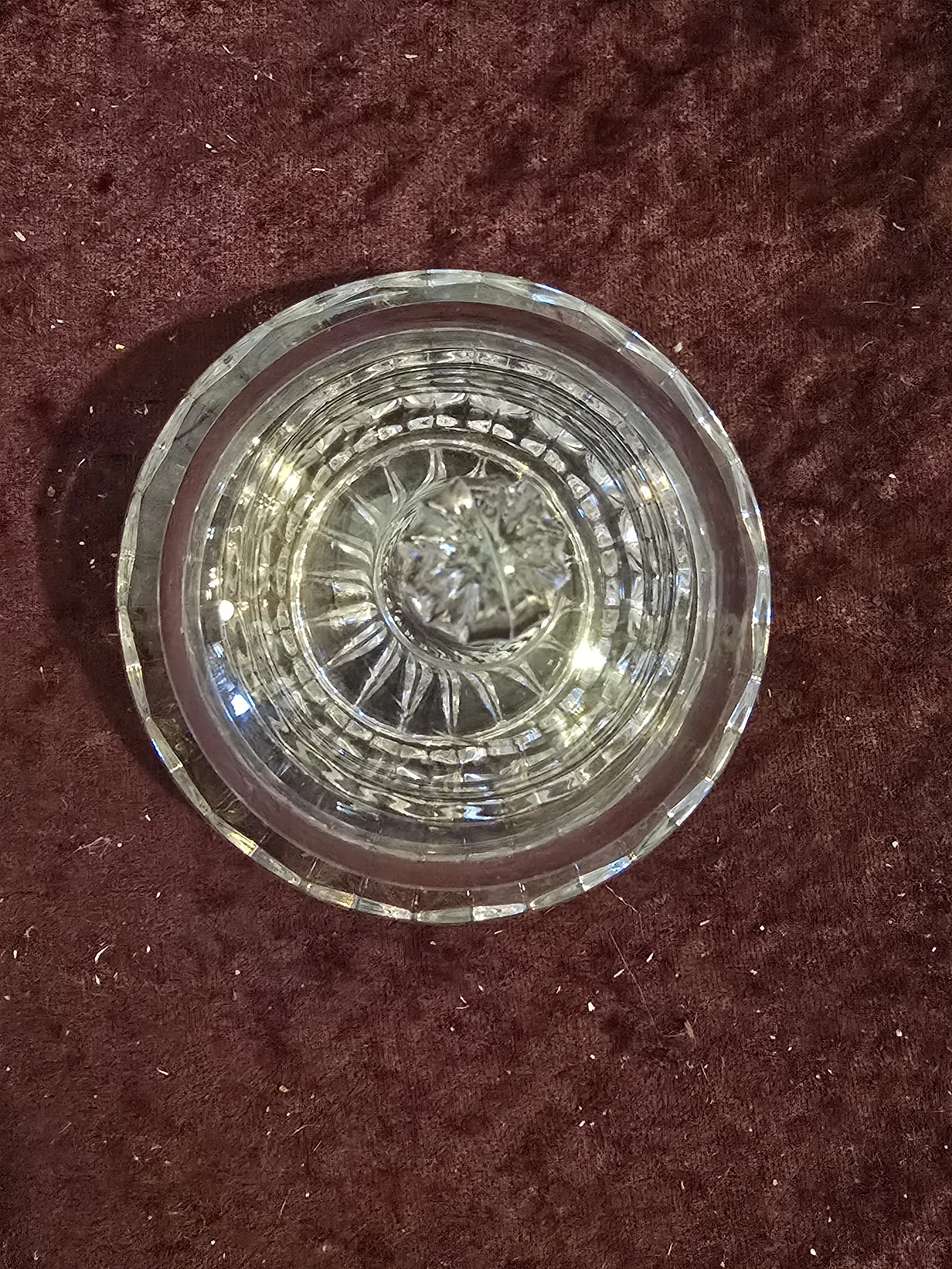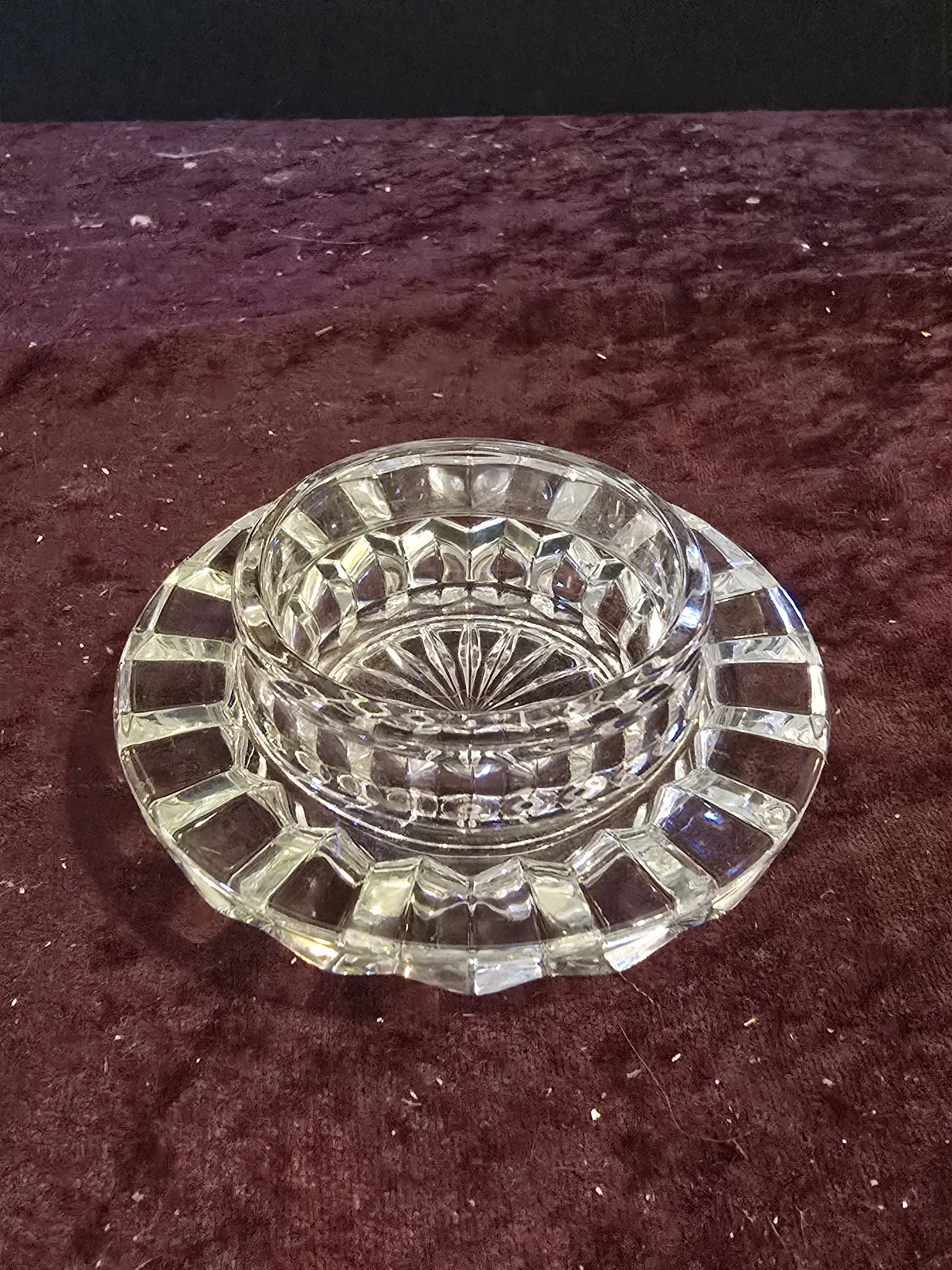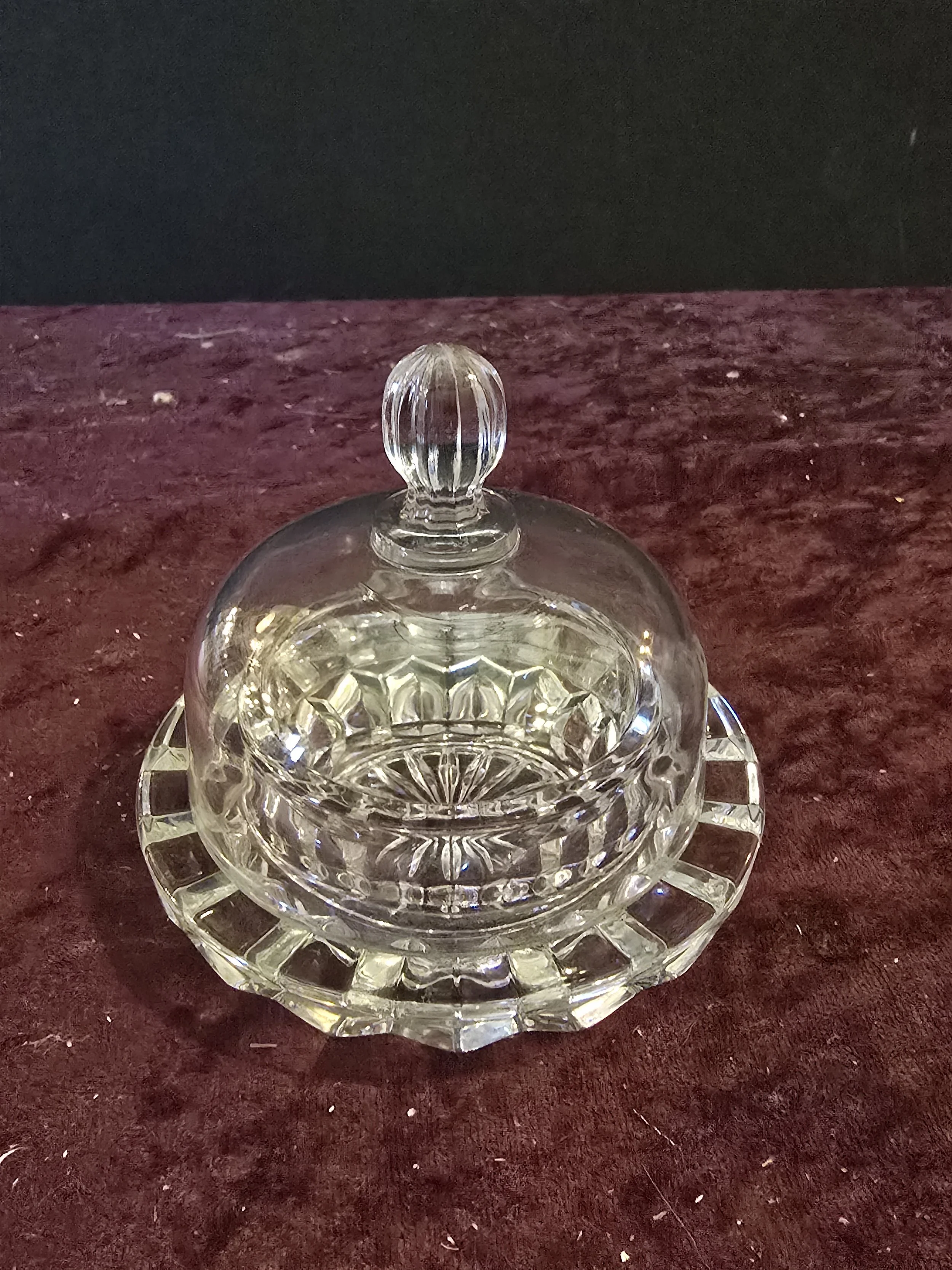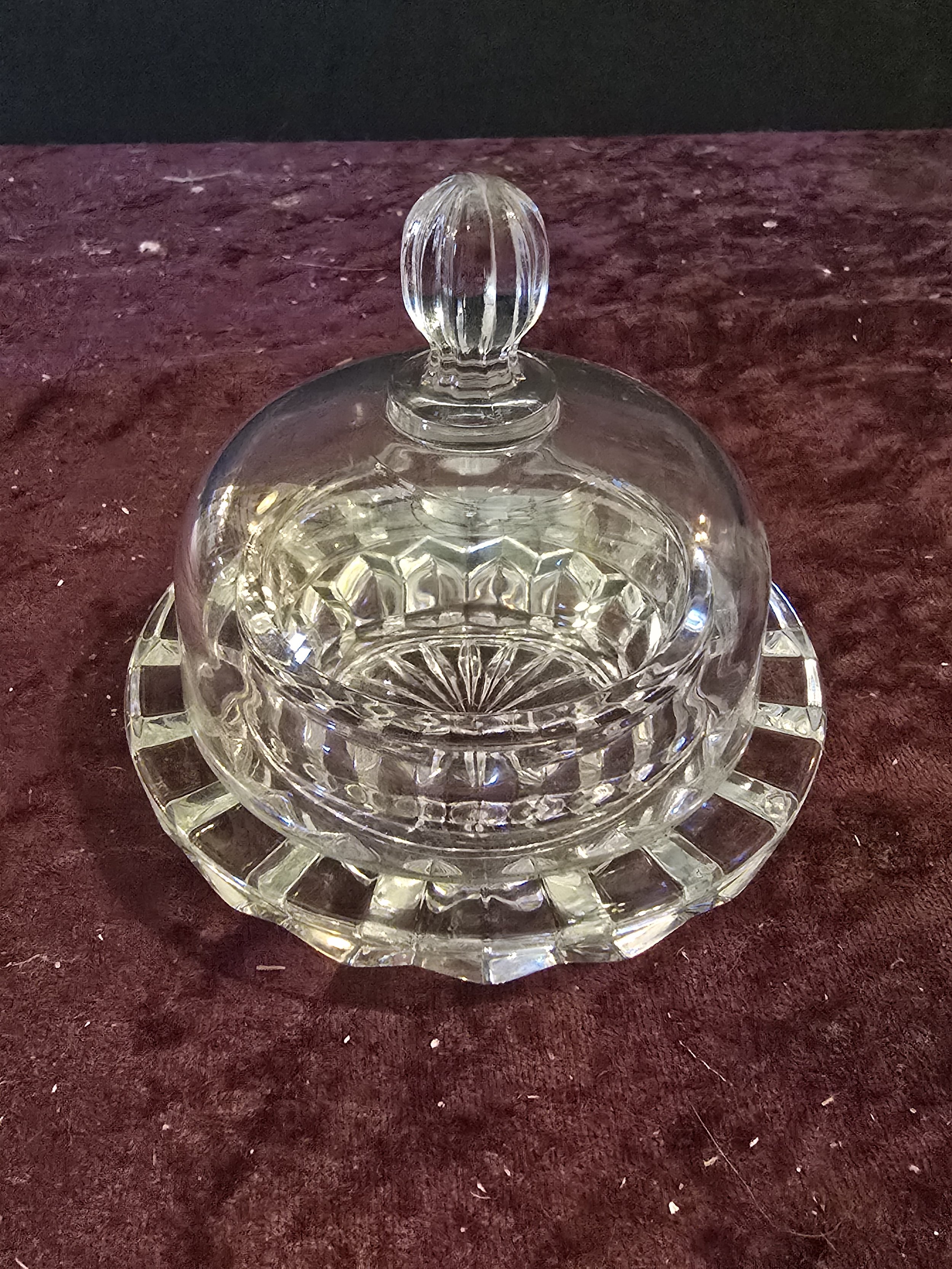 Lidded condiment or butter dish. Made of crystal. In excellent condition. Have 3 matching, sold individually.