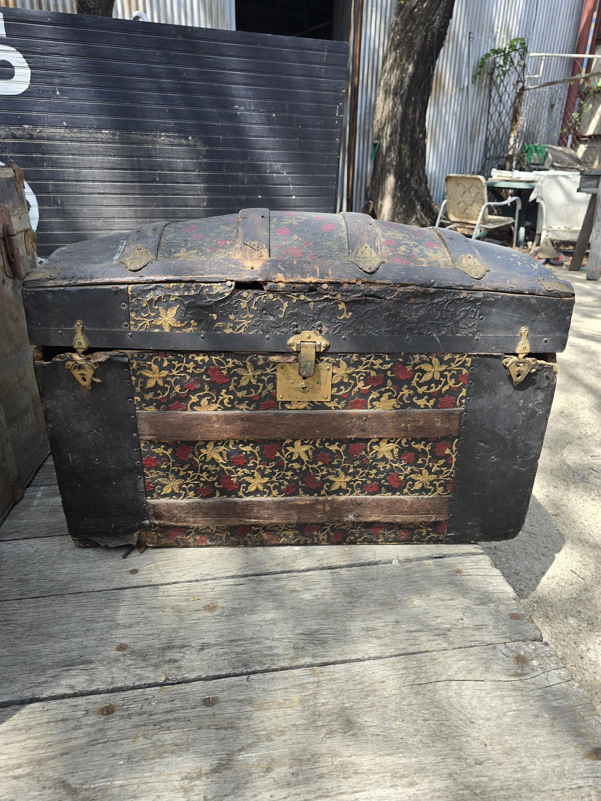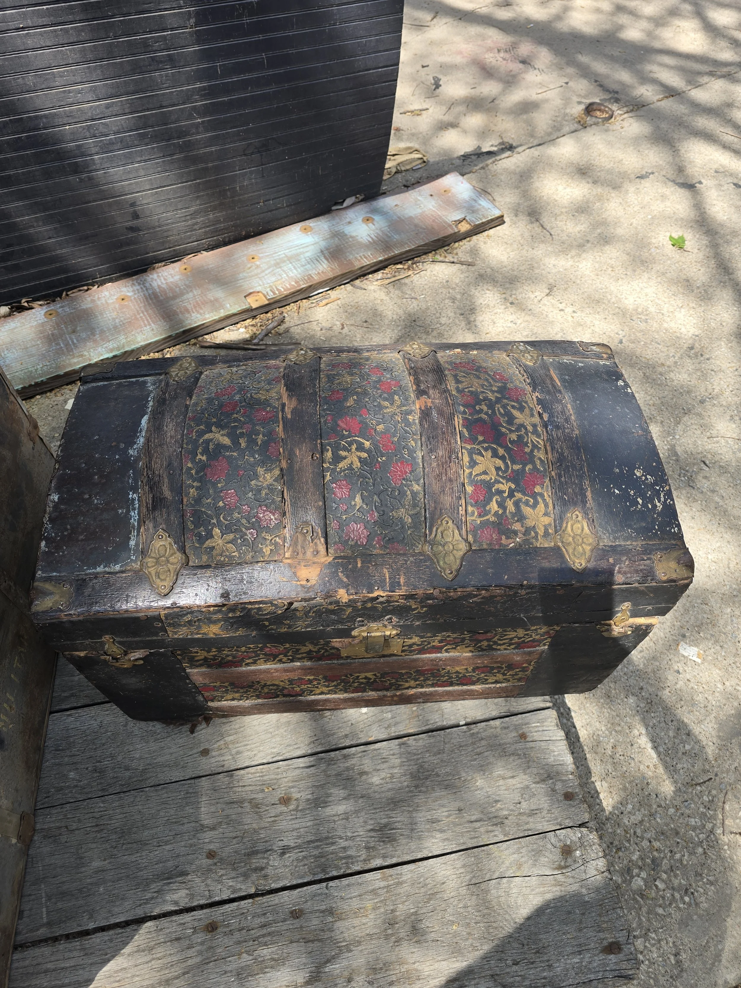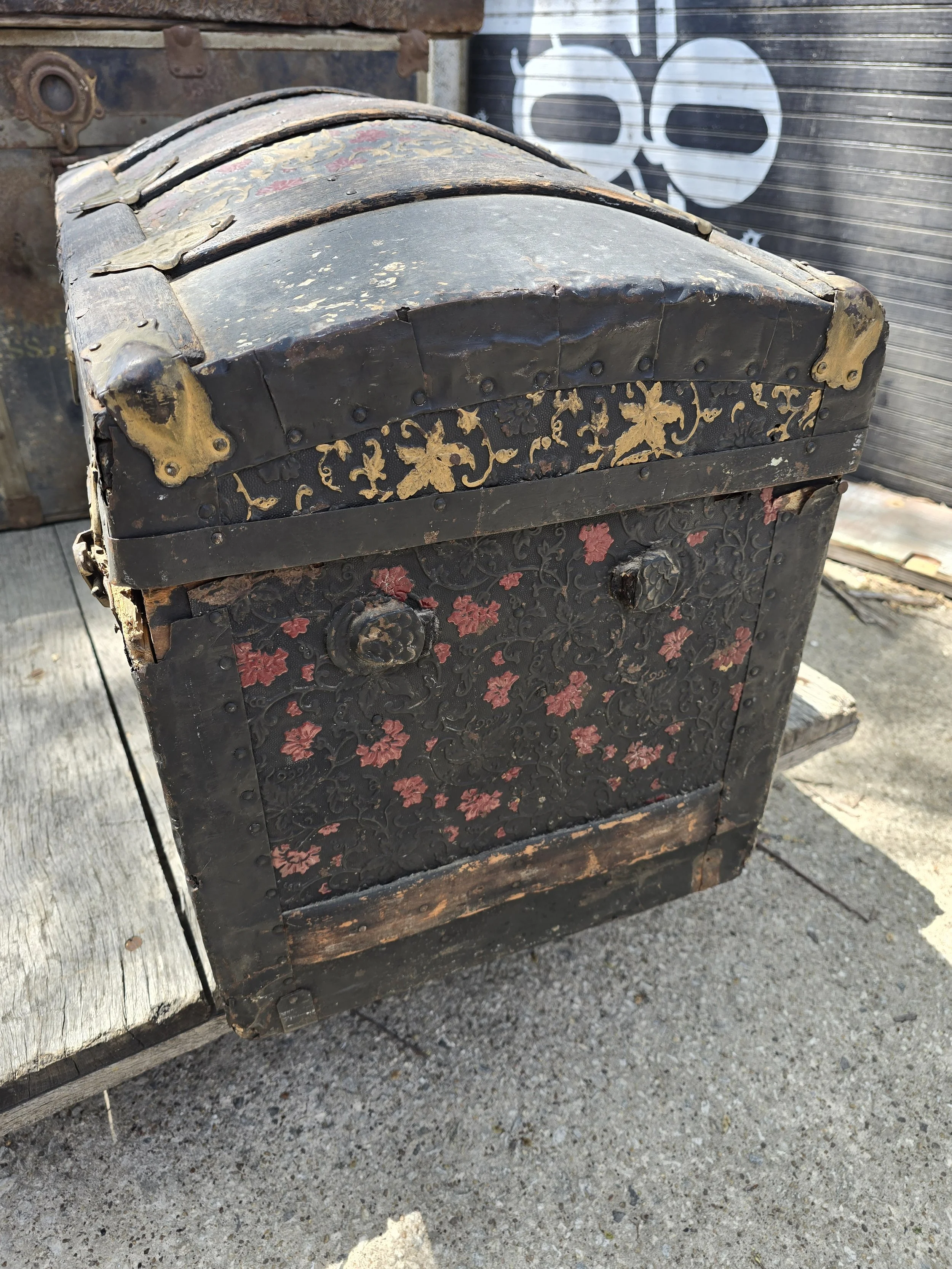 Antique humpback trunk with nice detail. Some of the tin has rusted on one of the edges.