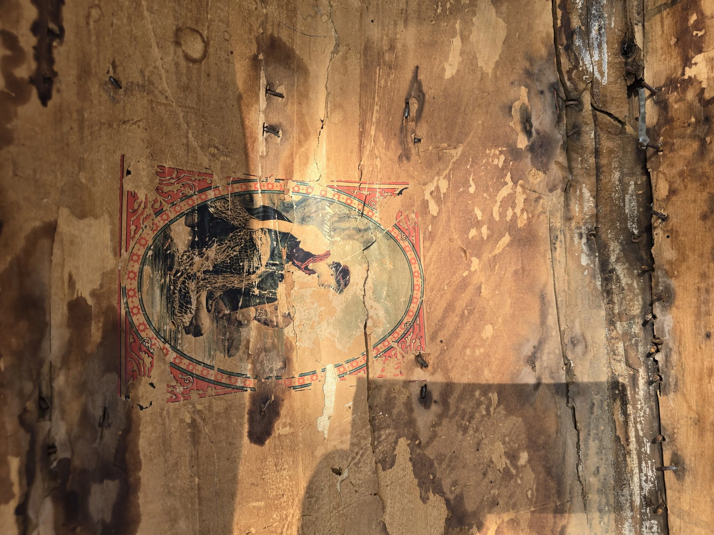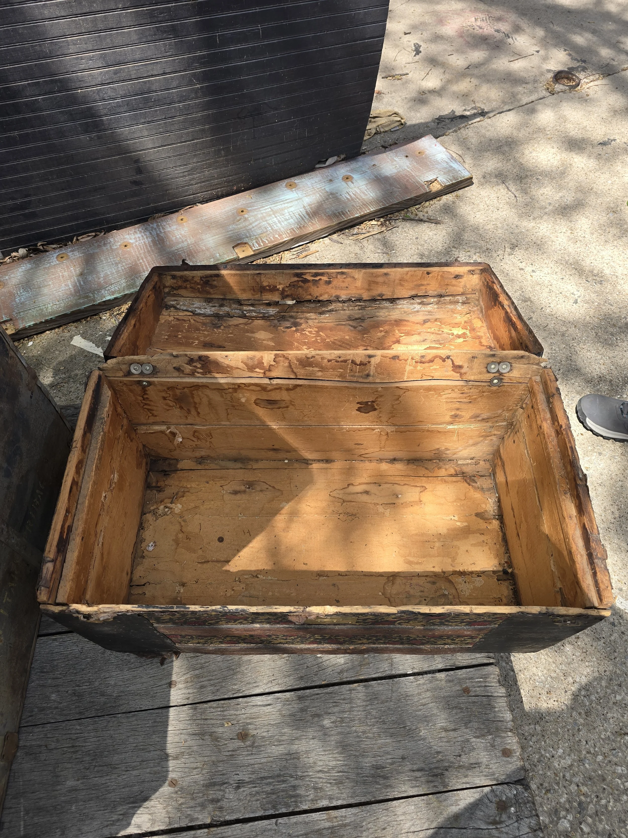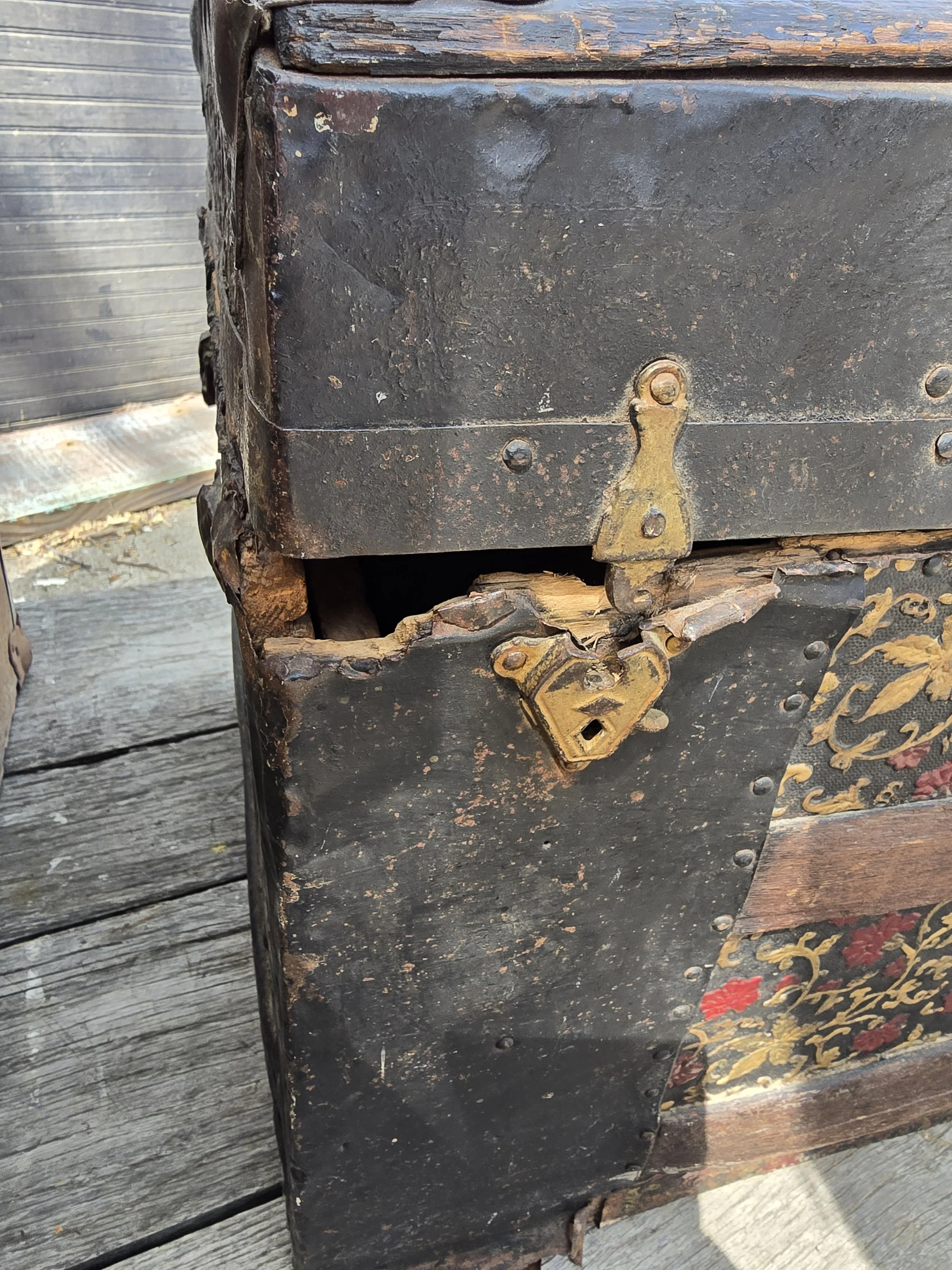 Antique humpback trunk with nice detail. Some of the tin has rusted on one of the edges.