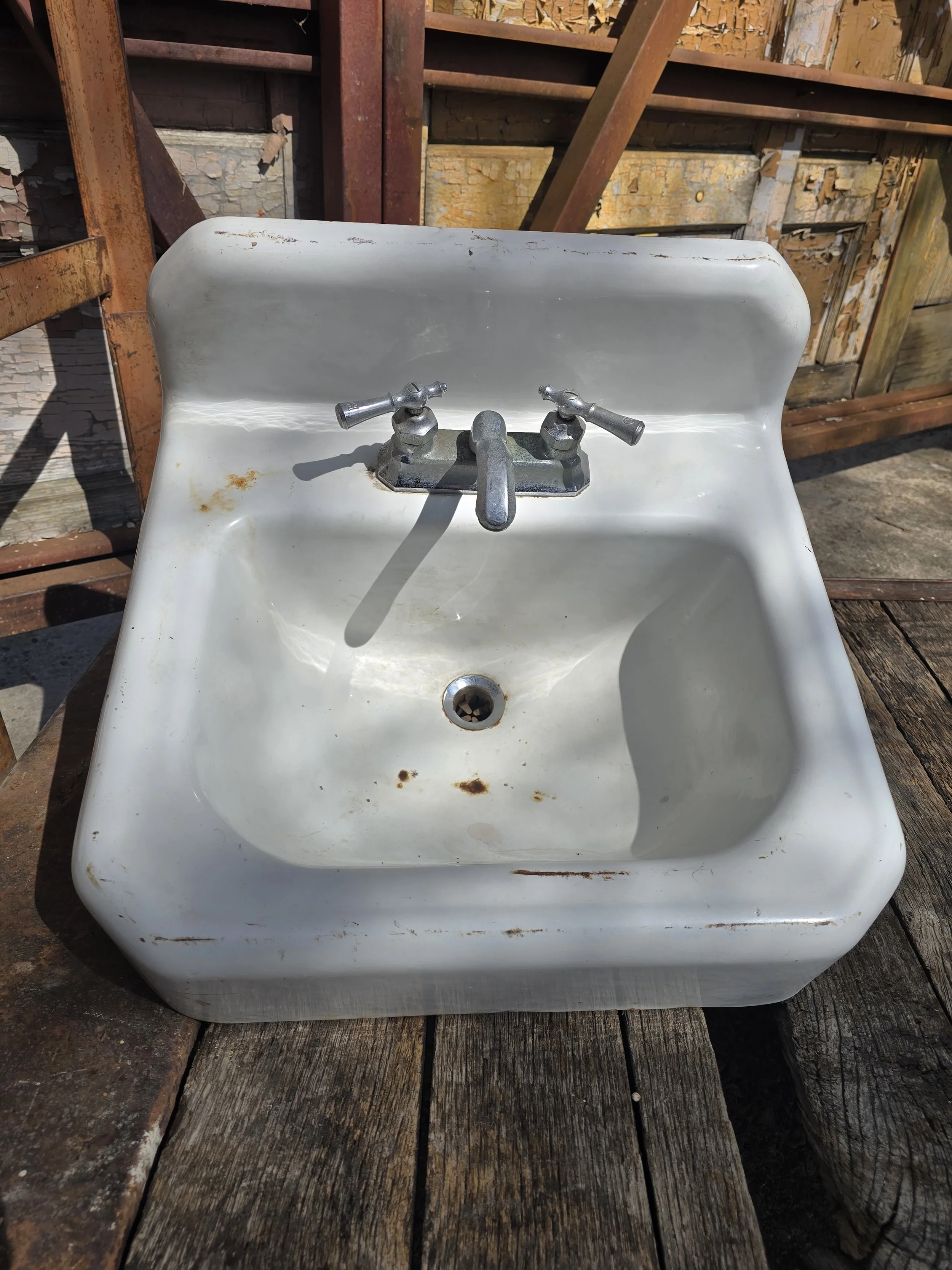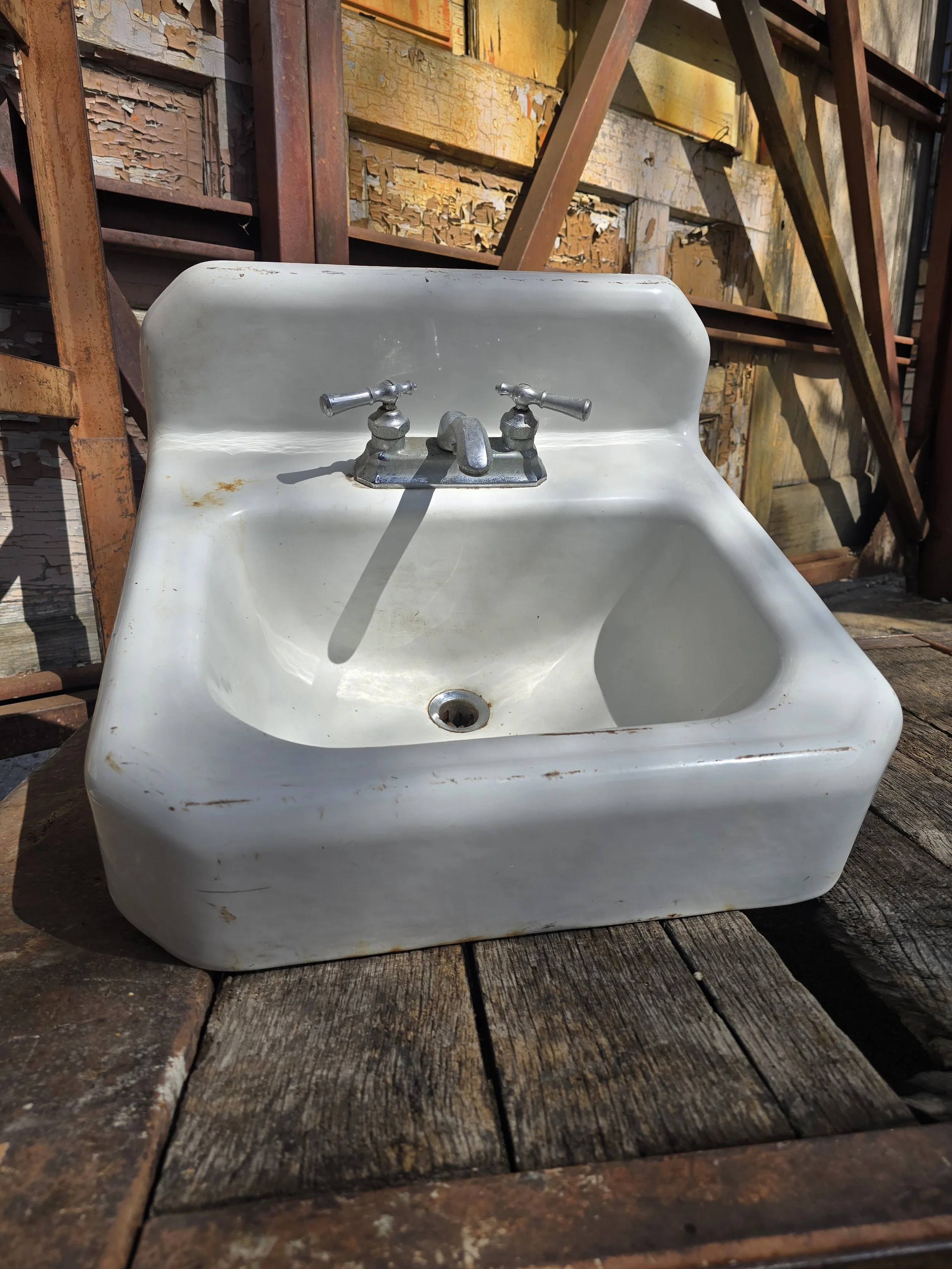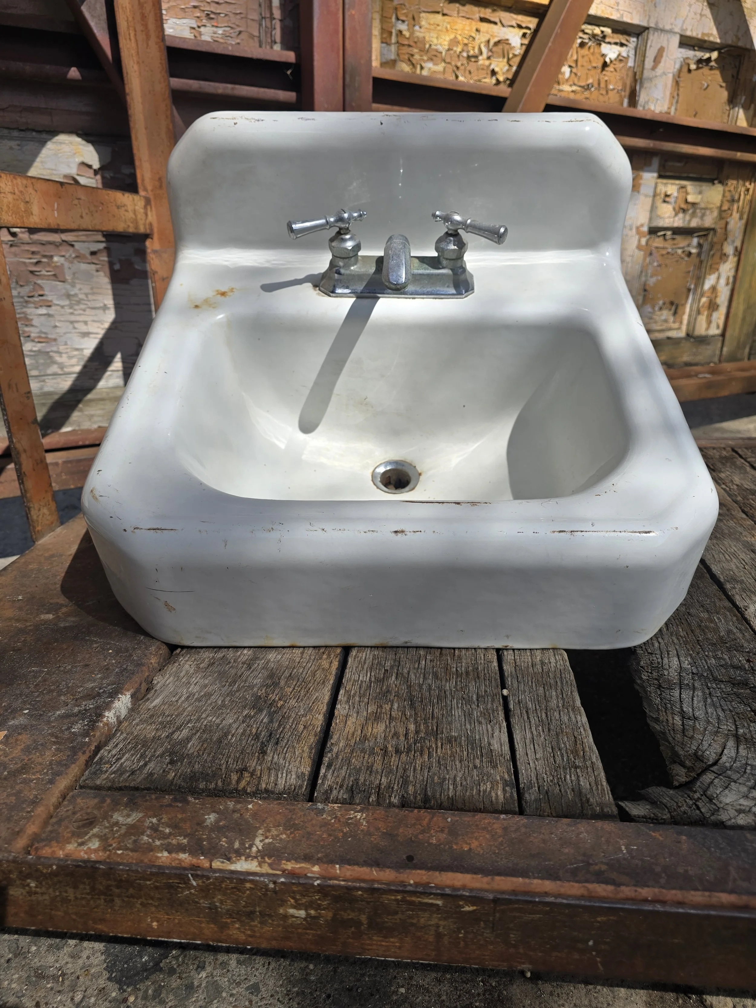 1949 Cast Iron wall mount sink with cool vintage faucet. Mostly this sink is in good condition, there are a few light rust spots.