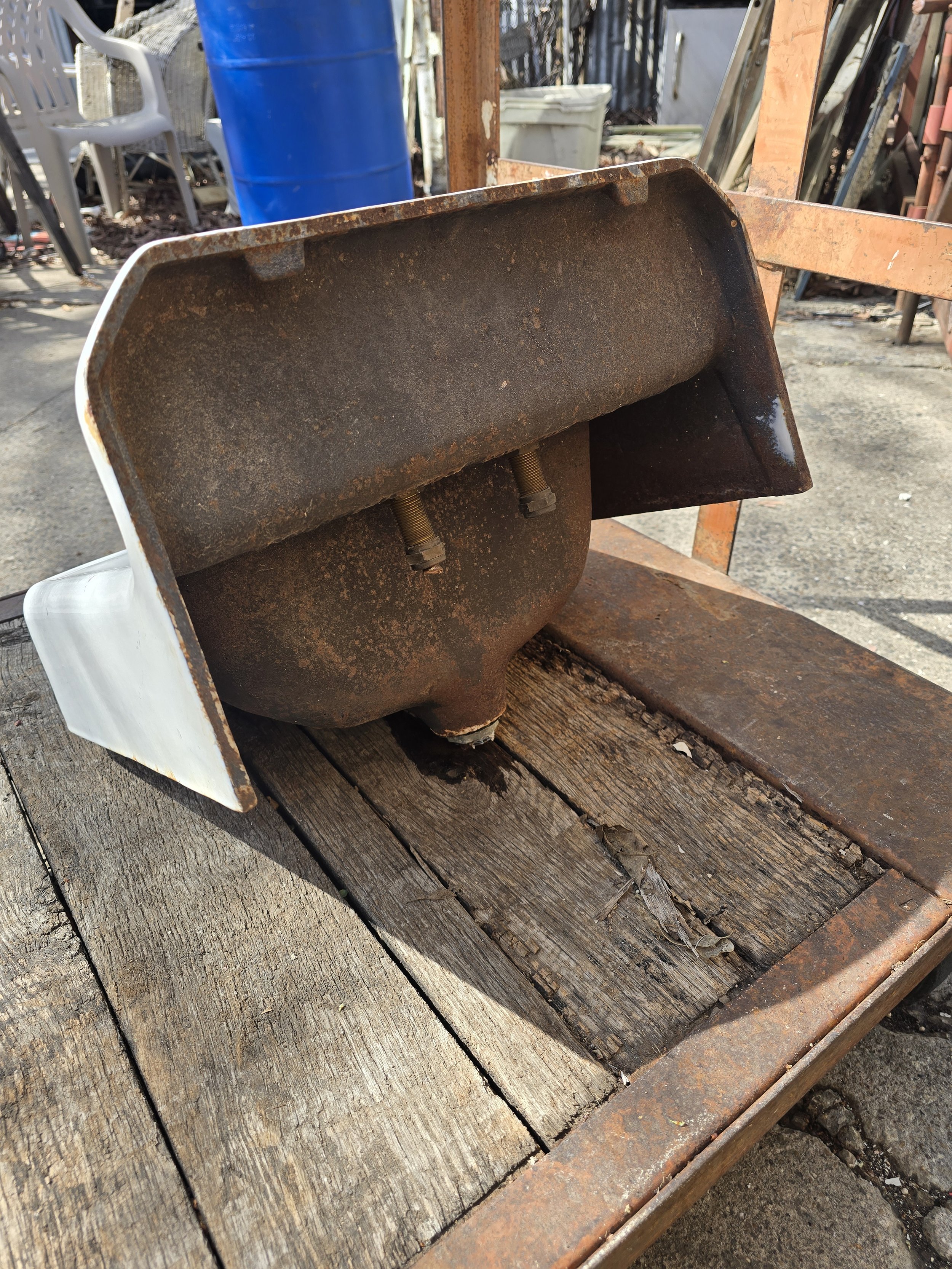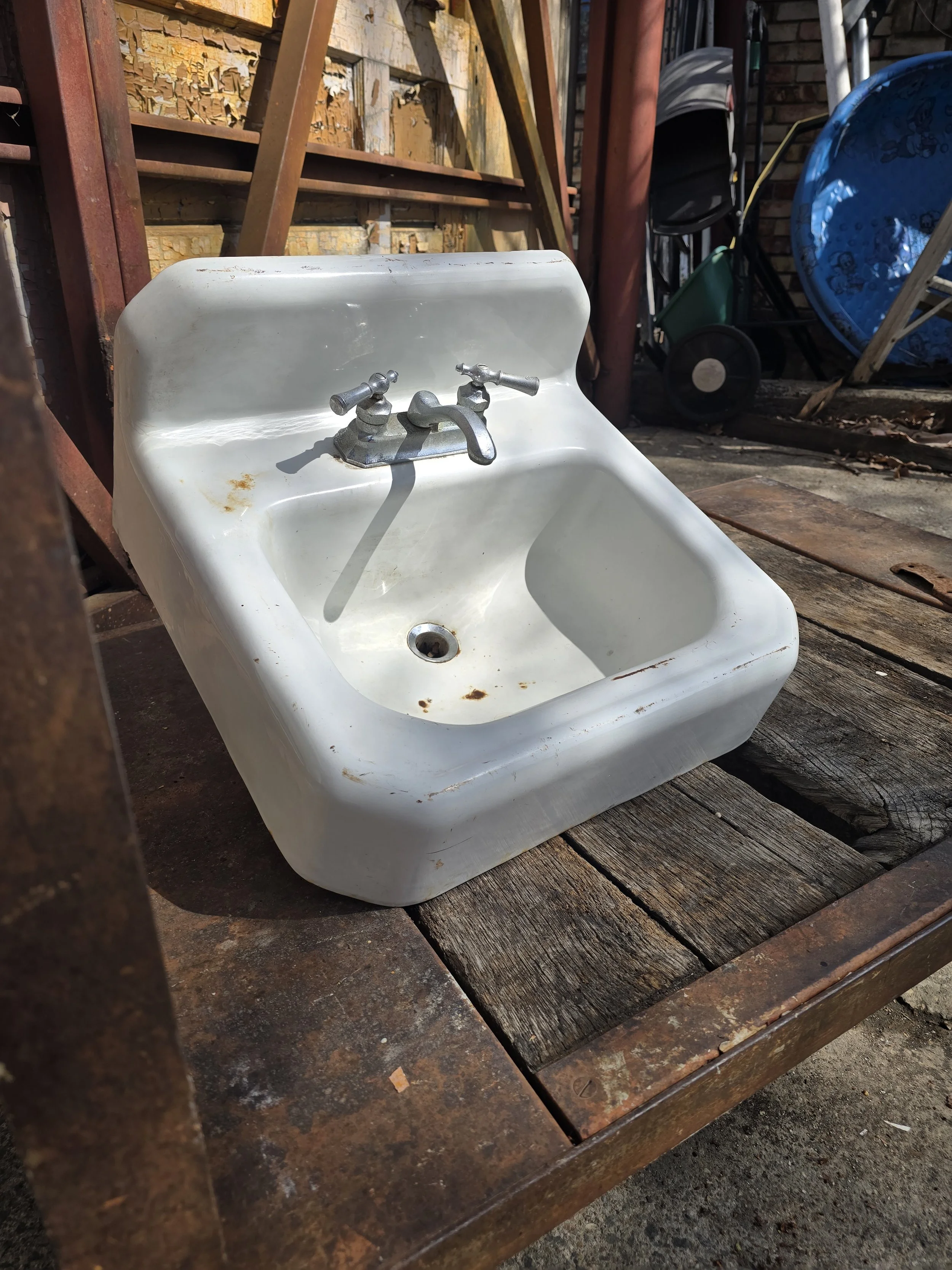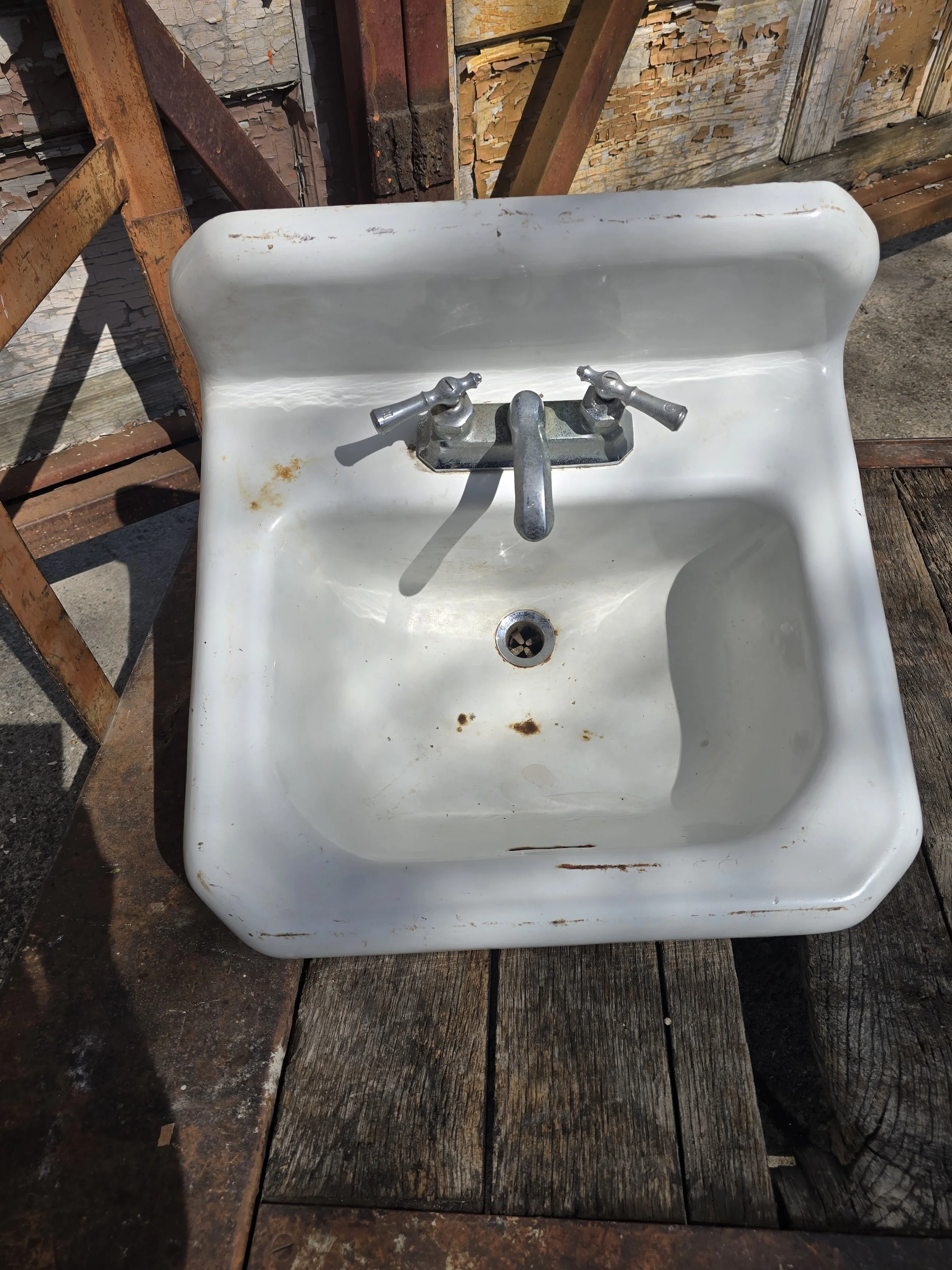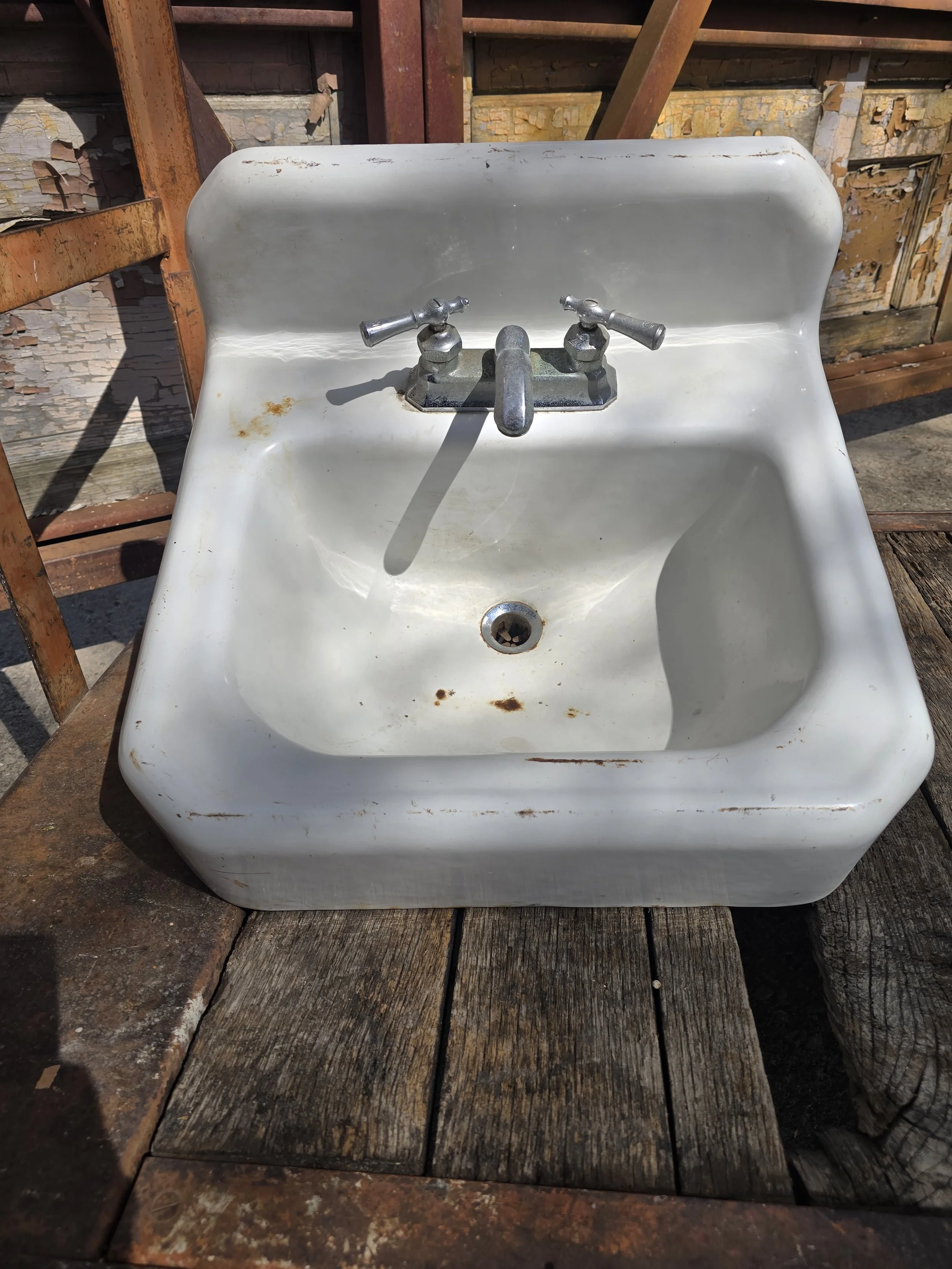 1949 Cast Iron wall mount sink with cool vintage faucet. Mostly this sink is in good condition, there are a few light rust spots.