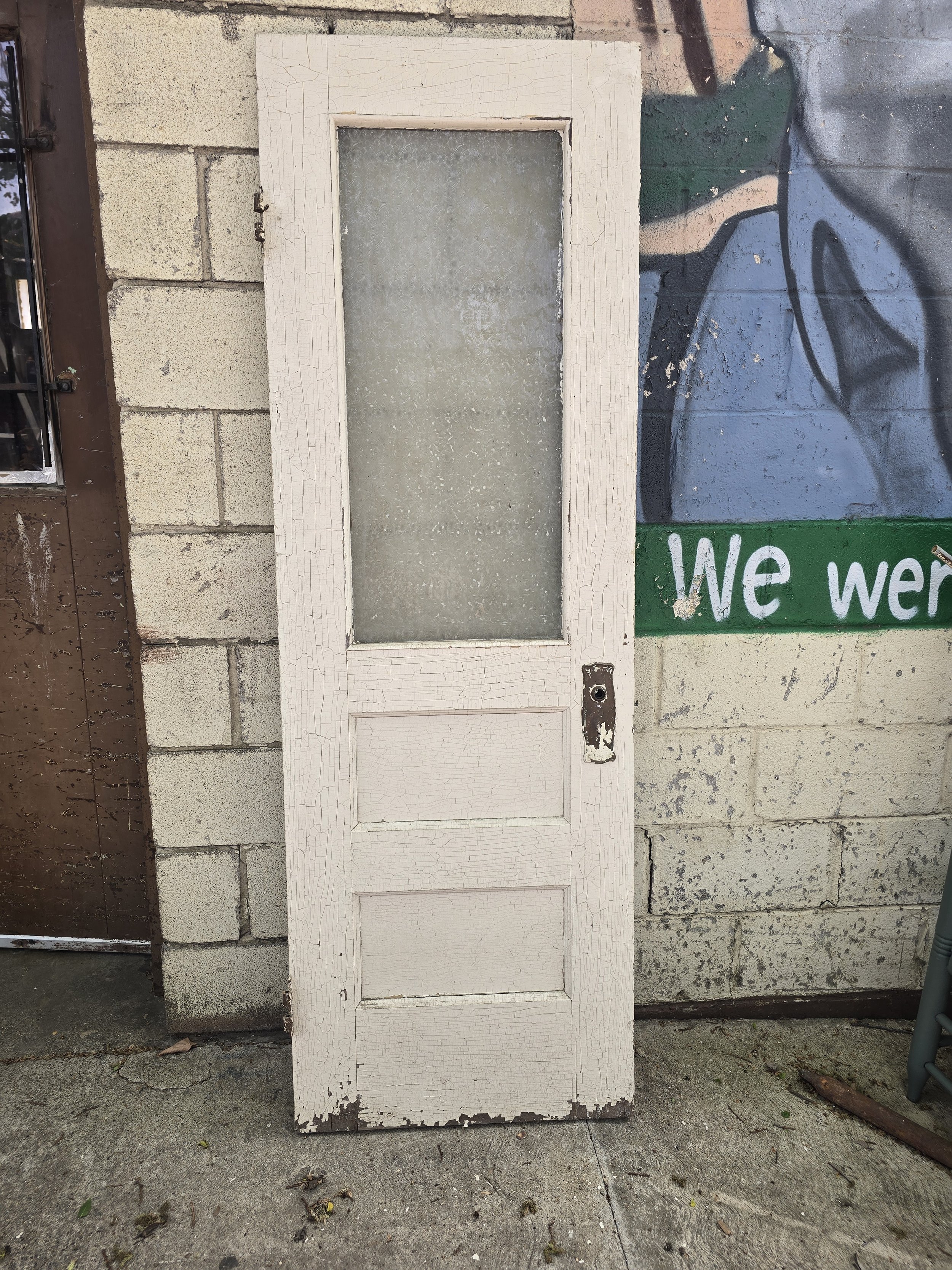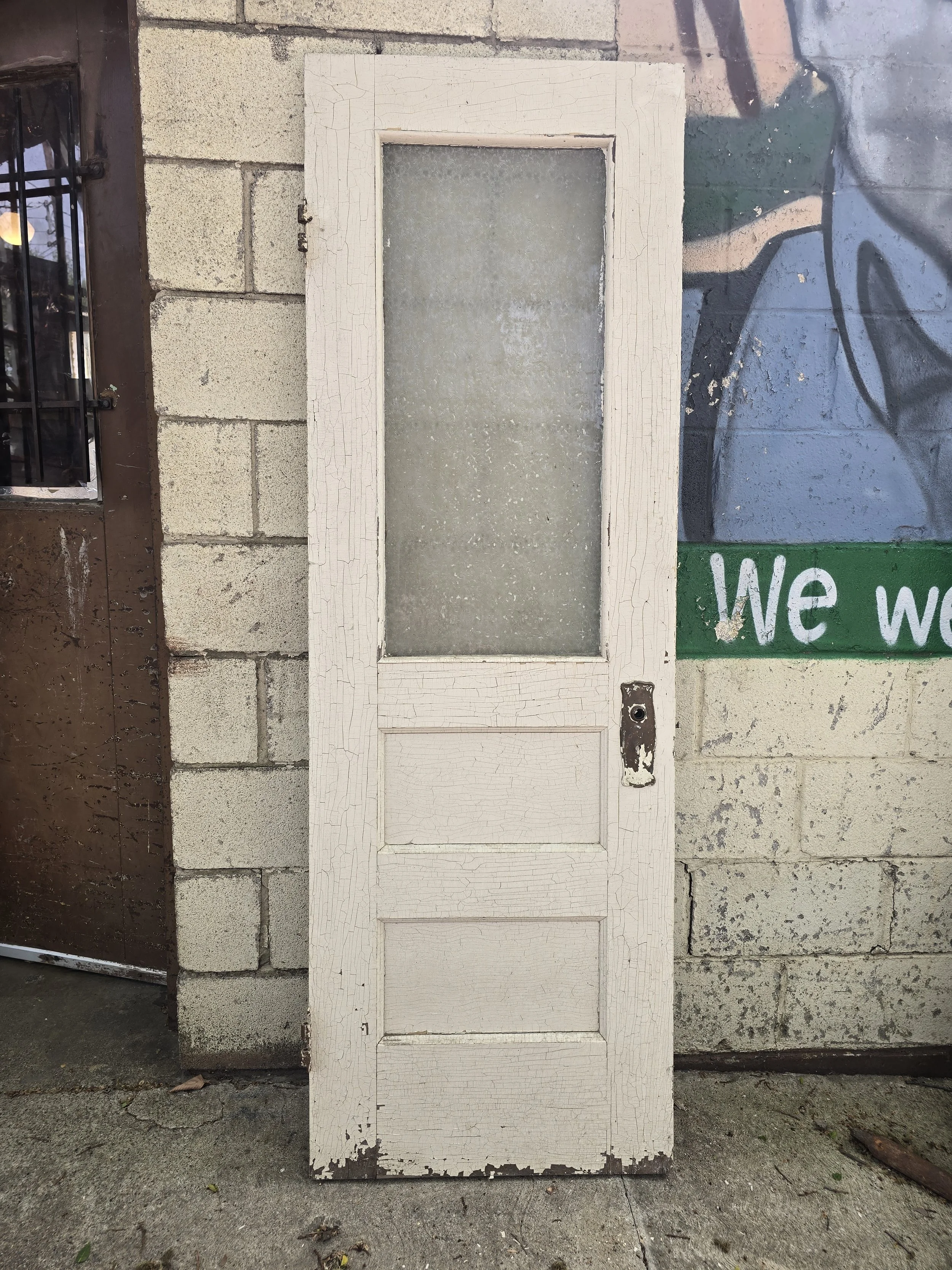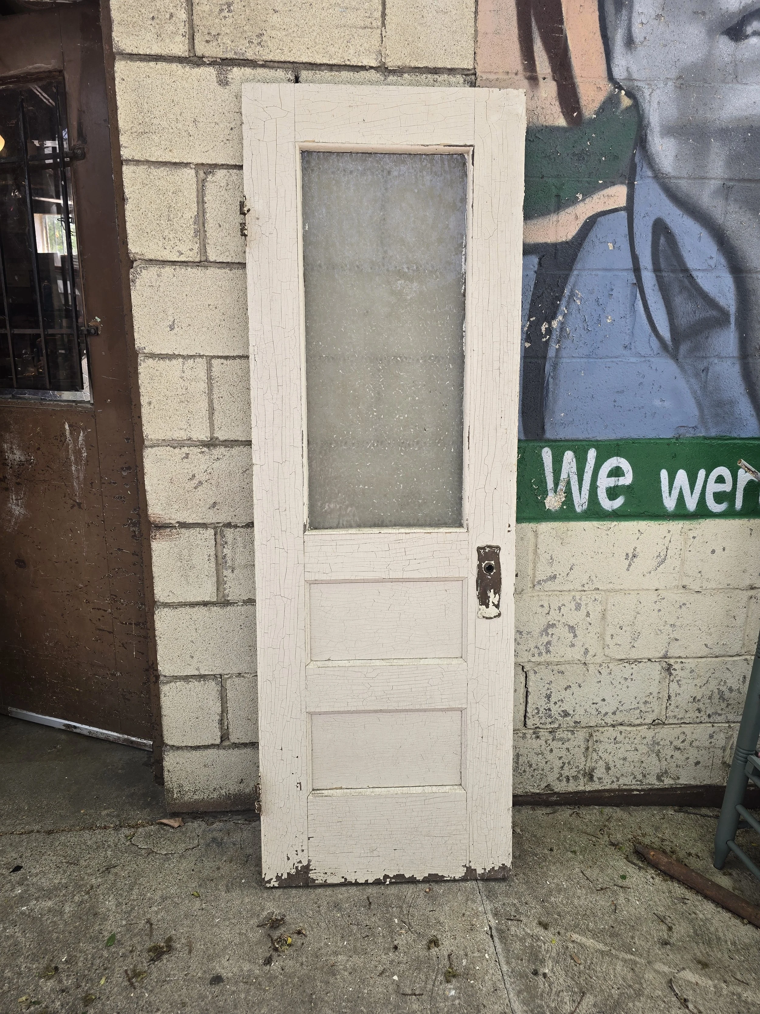 Antique wood 24” door with florentine in the glass. The glass has no cracks. The door itself is short, but since it is solid wood, it could be added on to for it to be a more standard height door. This door is priced mostly for the glass.