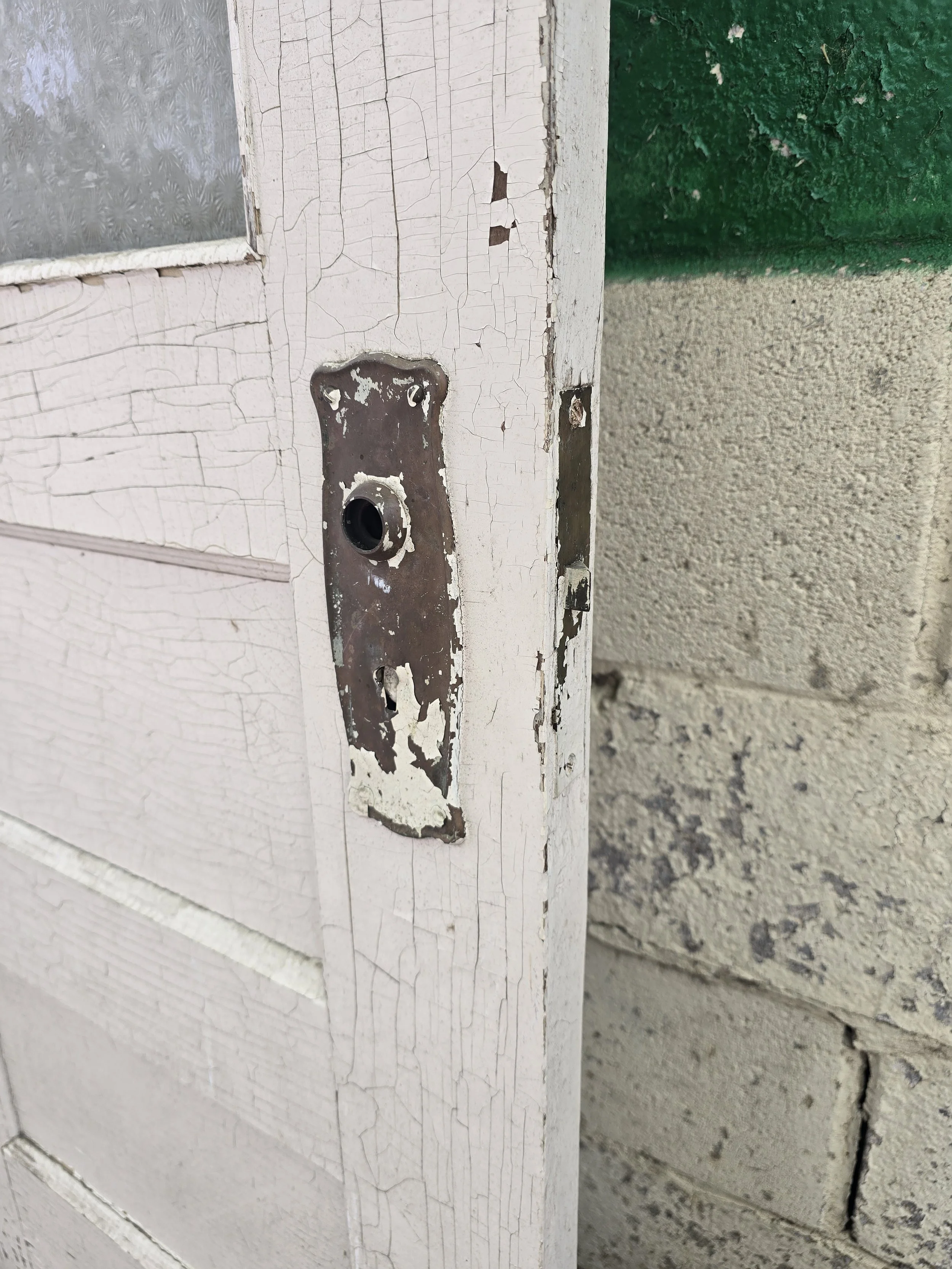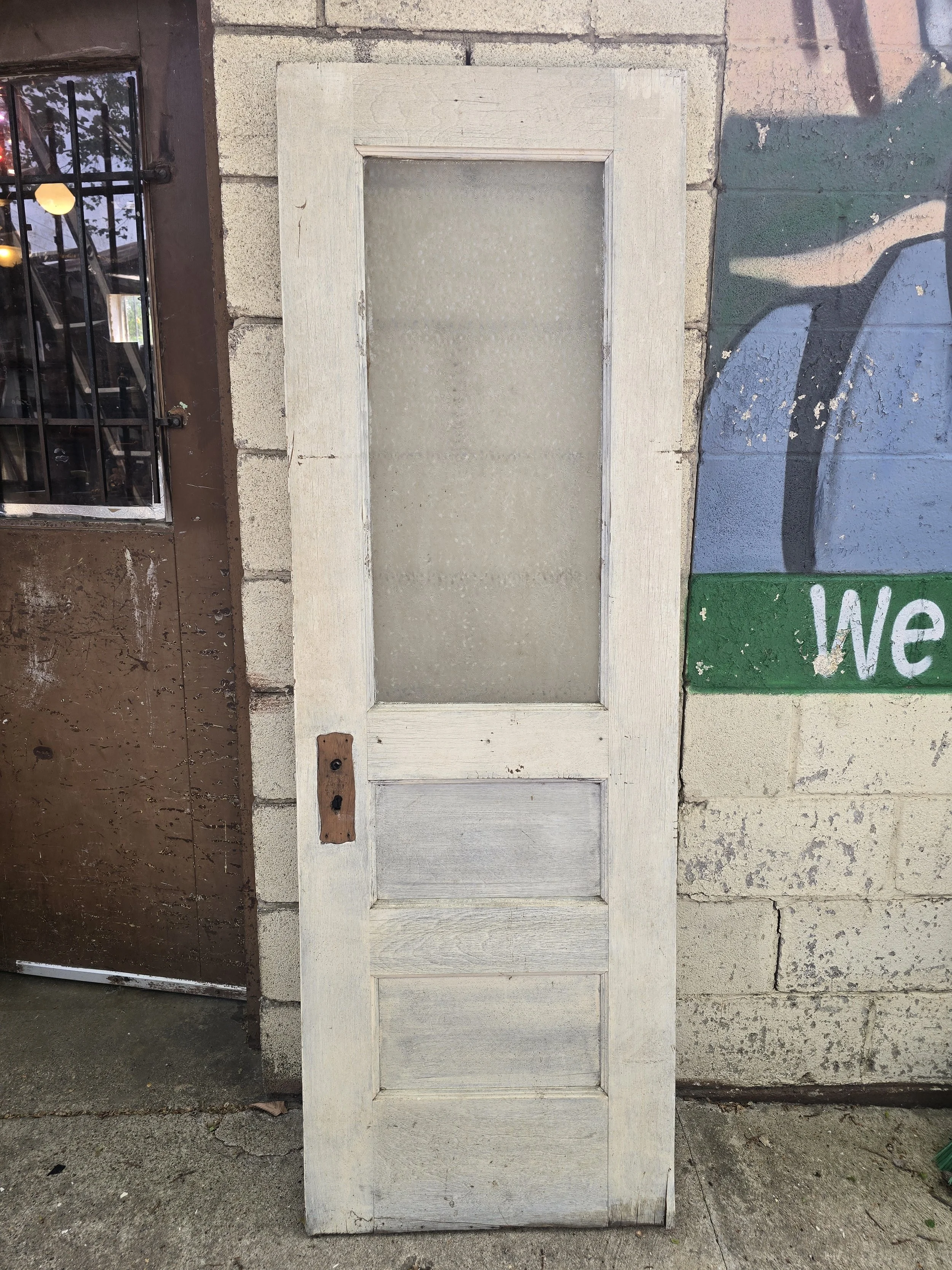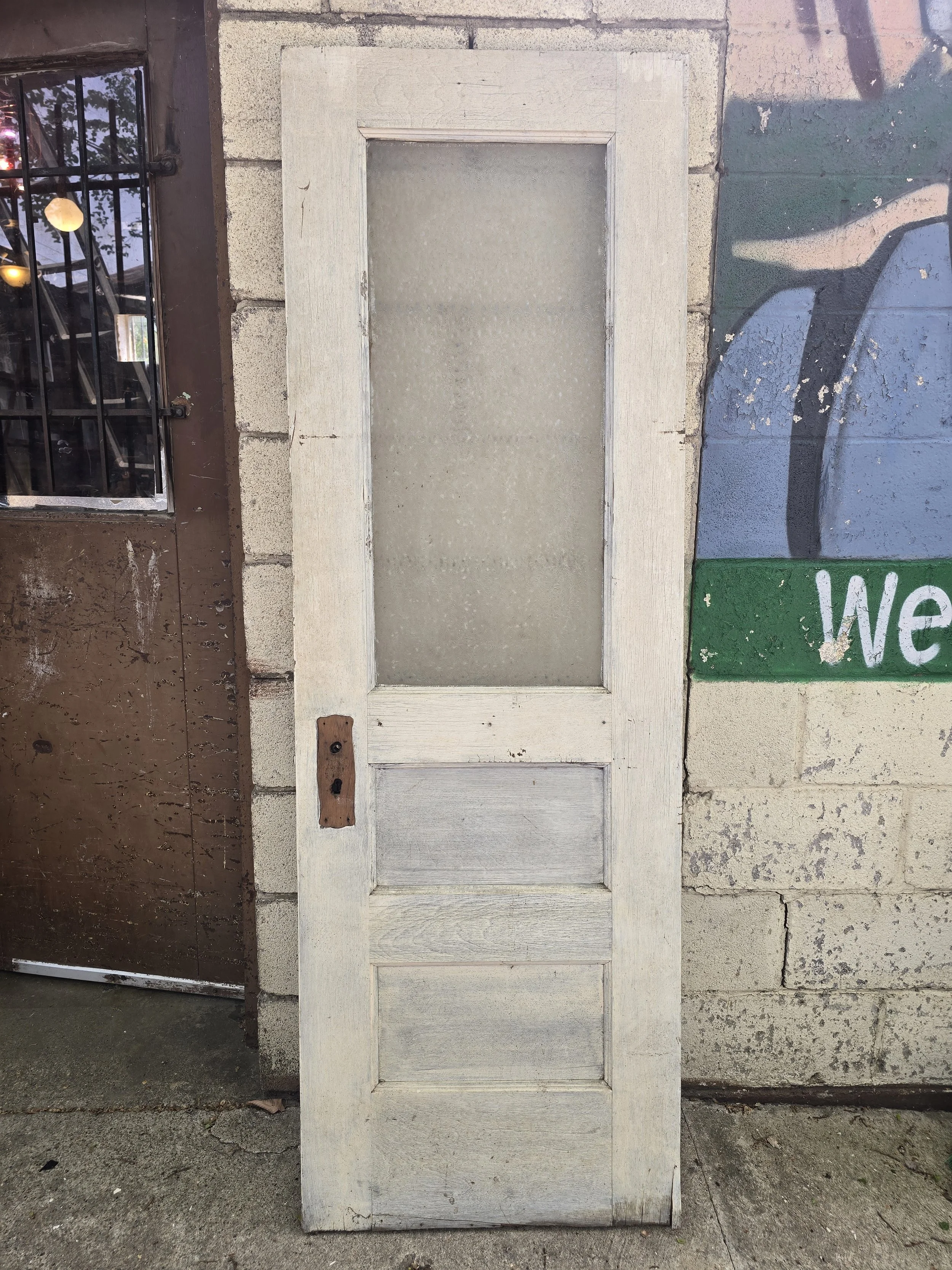 Antique wood 24” door with florentine in the glass. The glass has no cracks. The door itself is short, but since it is solid wood, it could be added on to for it to be a more standard height door. This door is priced mostly for the glass.