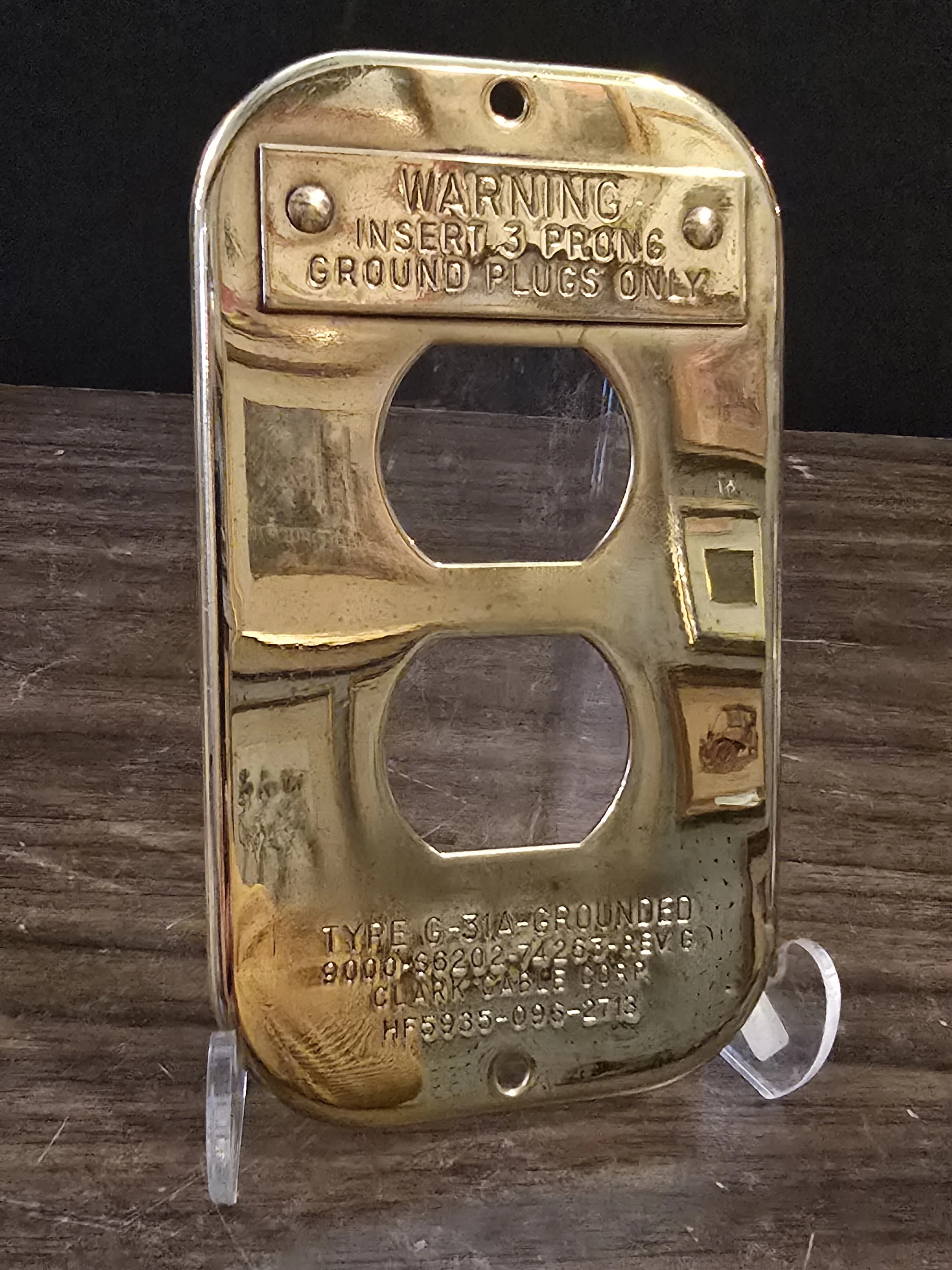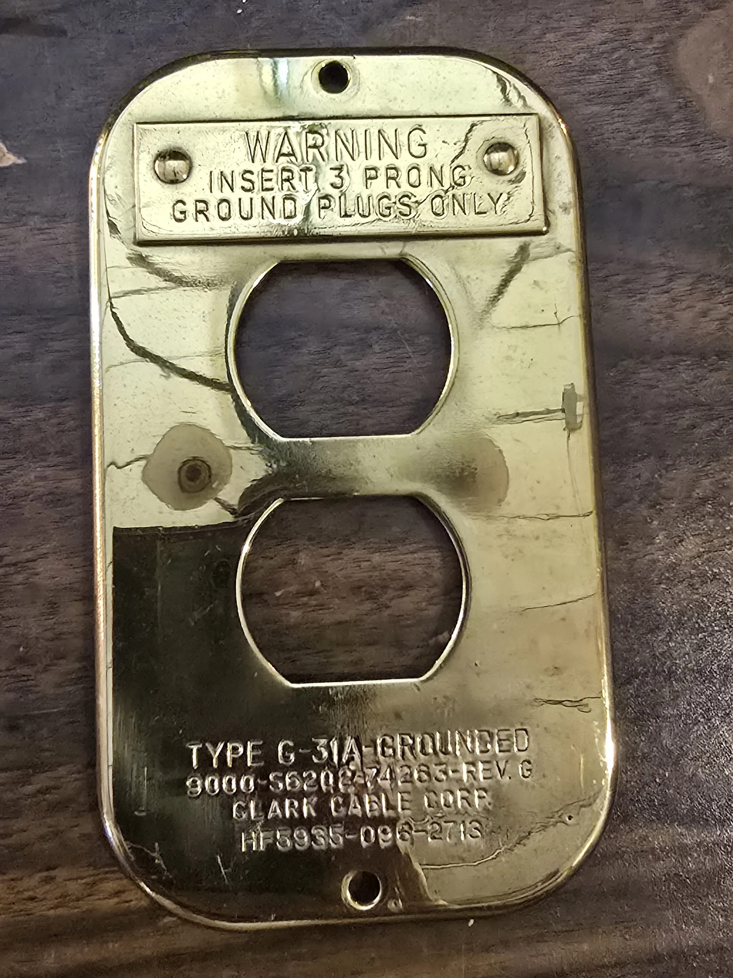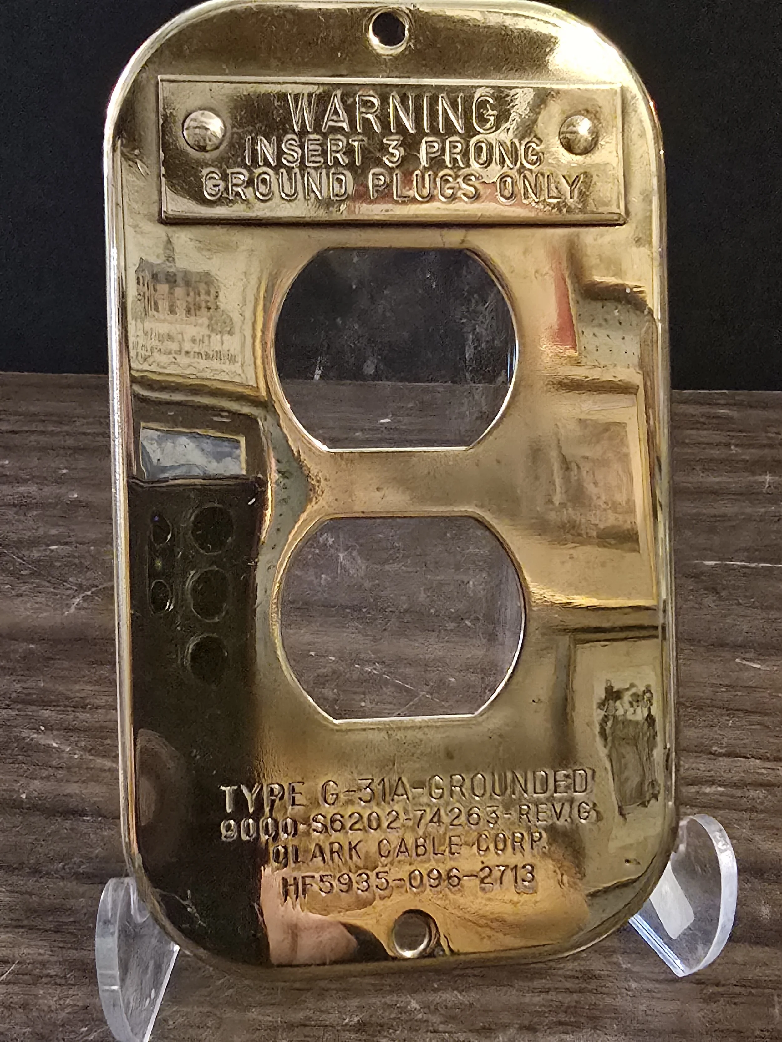 Solid brass commercial outlet covers. These things are cool. This plate says Clark Gable Corp.