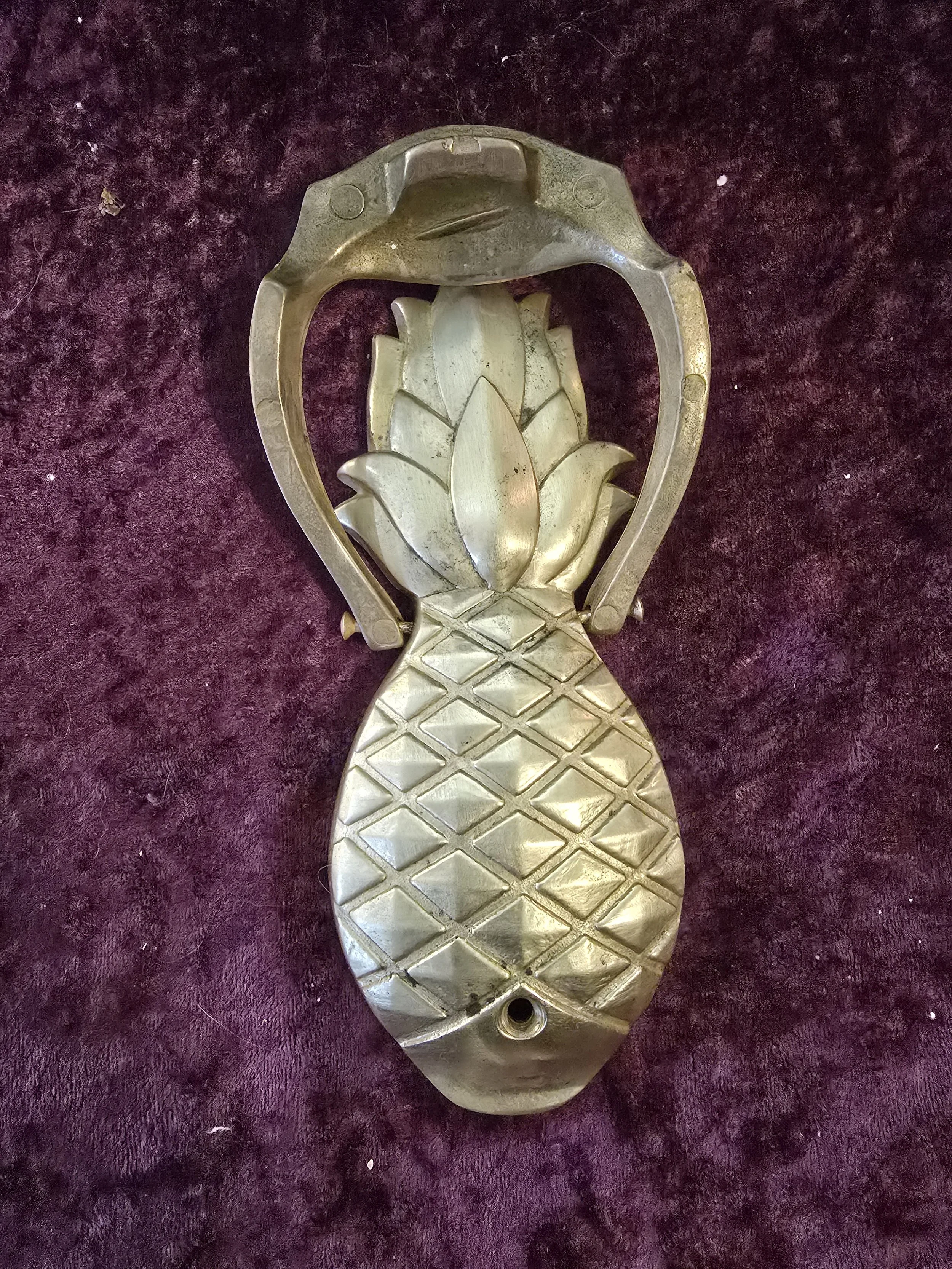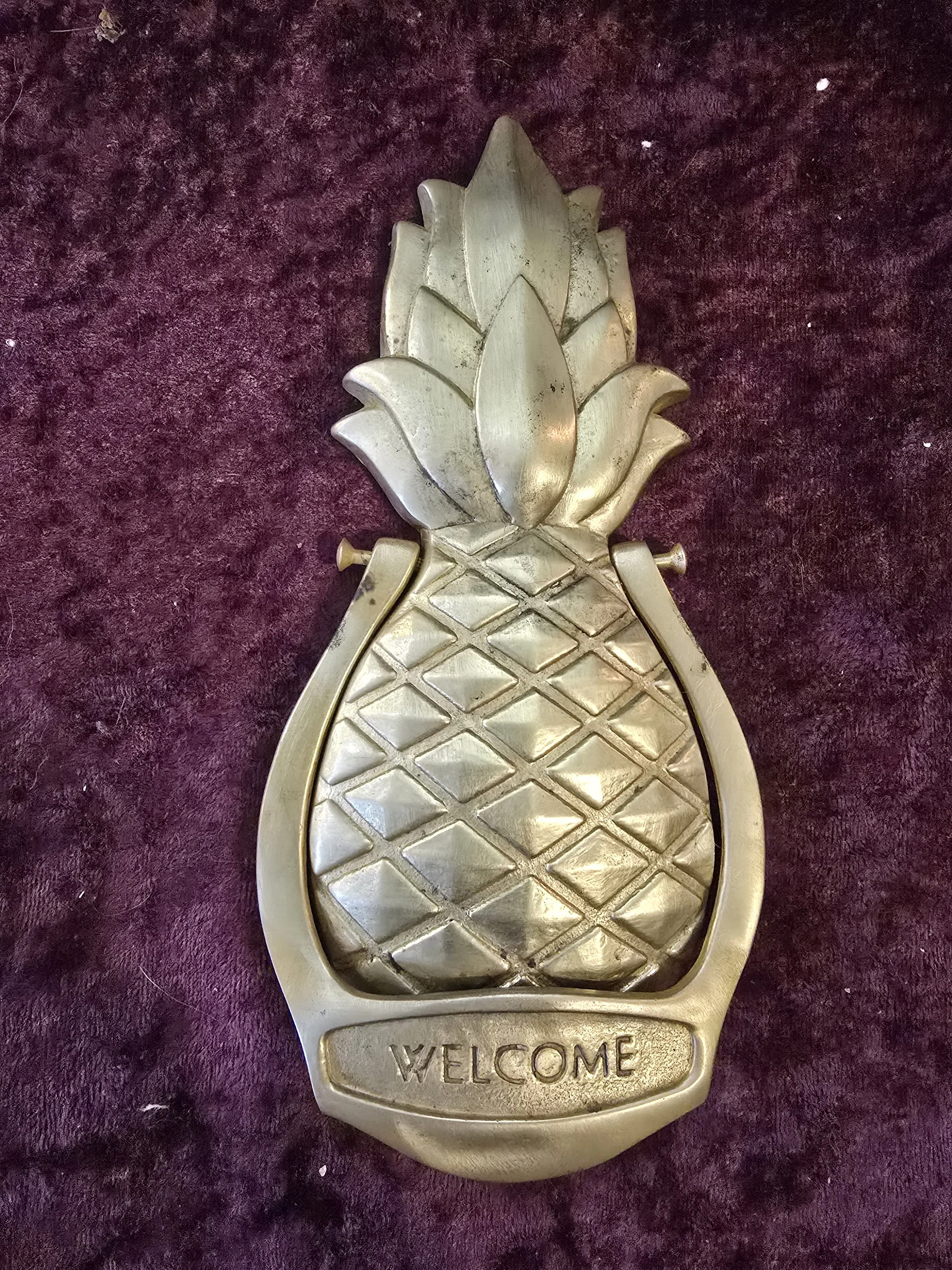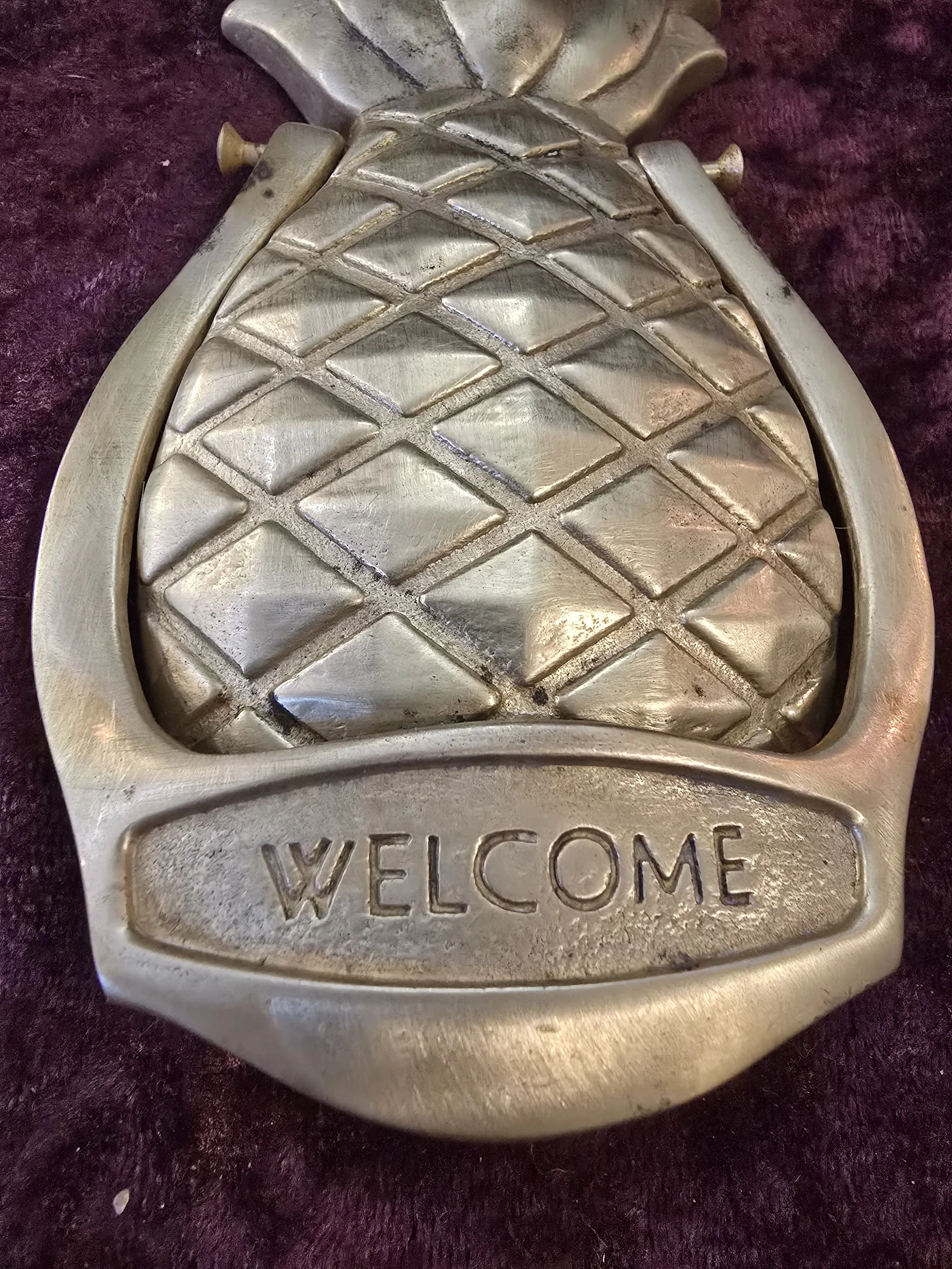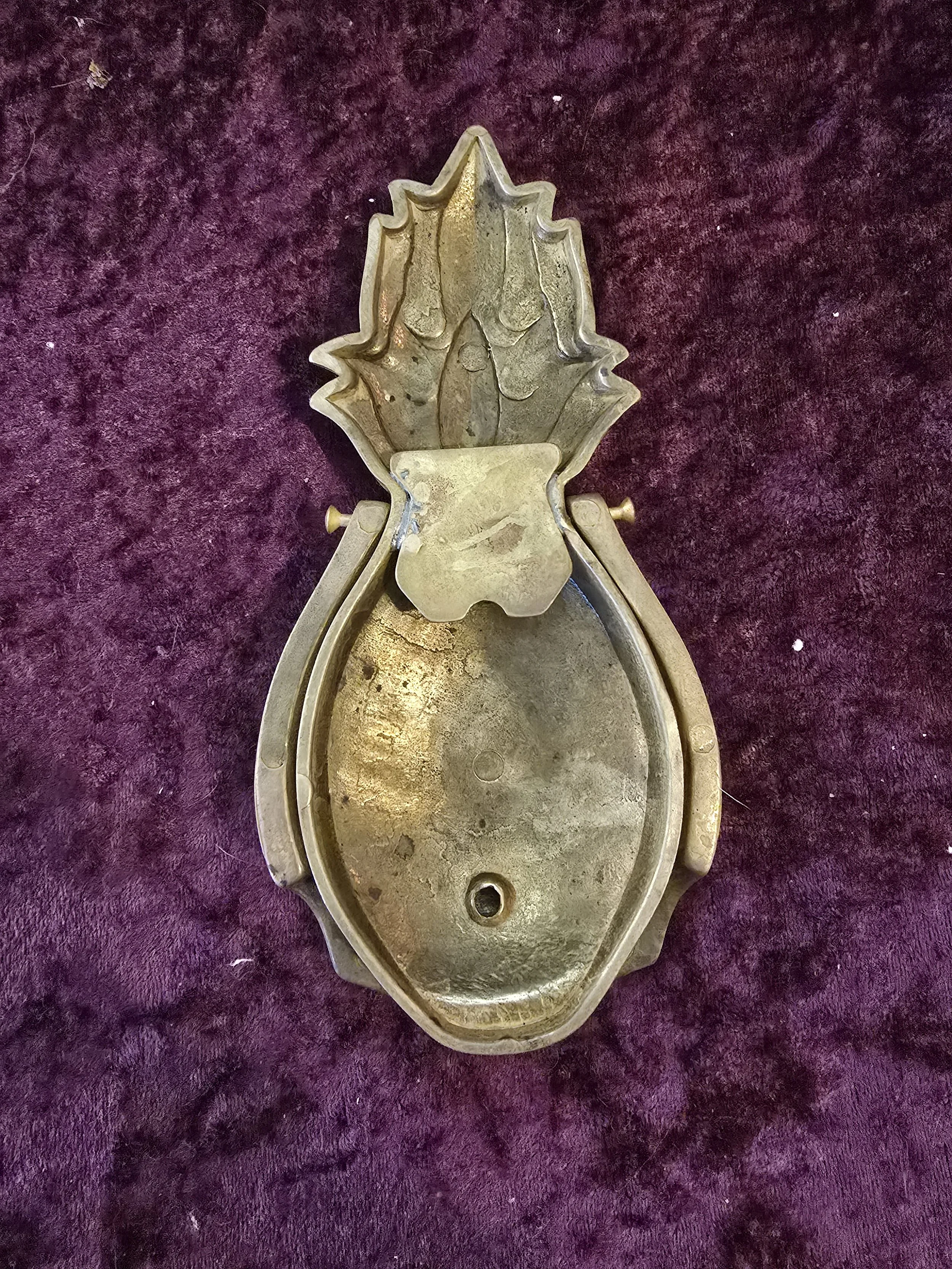 Shop › Brass Pineapple Door Knocker Image 1 of 5 Image 2 of 5 Image 3 of 5 Image 4 of 5 Image 5 of 5 Brass Pineapple Door Knocker $65.00 Solid brass pineapple door knocker. The bottom of the knocker says “Welcome”Knocker is 3.25” x 6.5” Add To Cart Added! Solid brass pineapple door knocker. The bottom of the knocker says “Welcome”Knocker is 3.25” x 6.5”