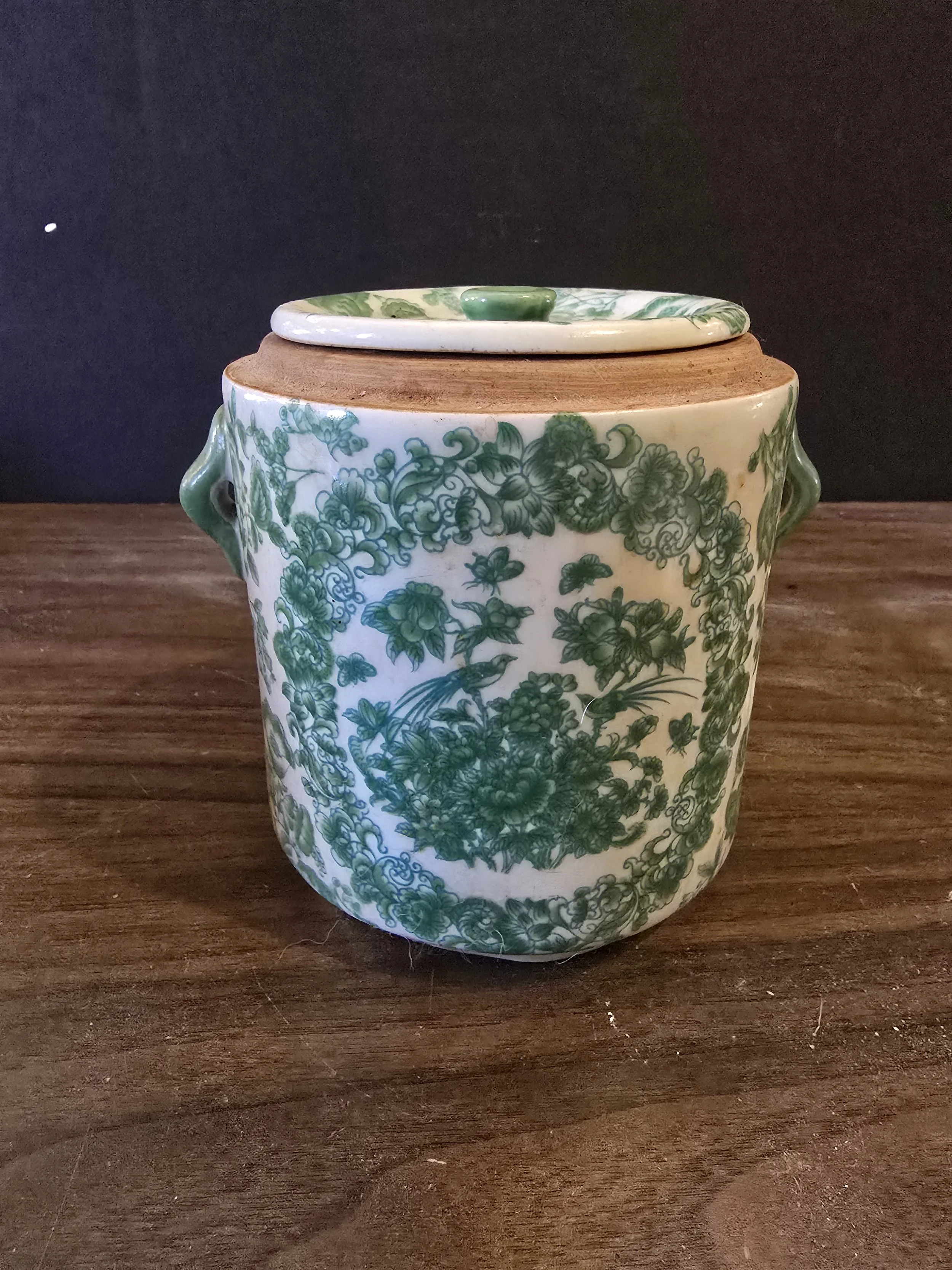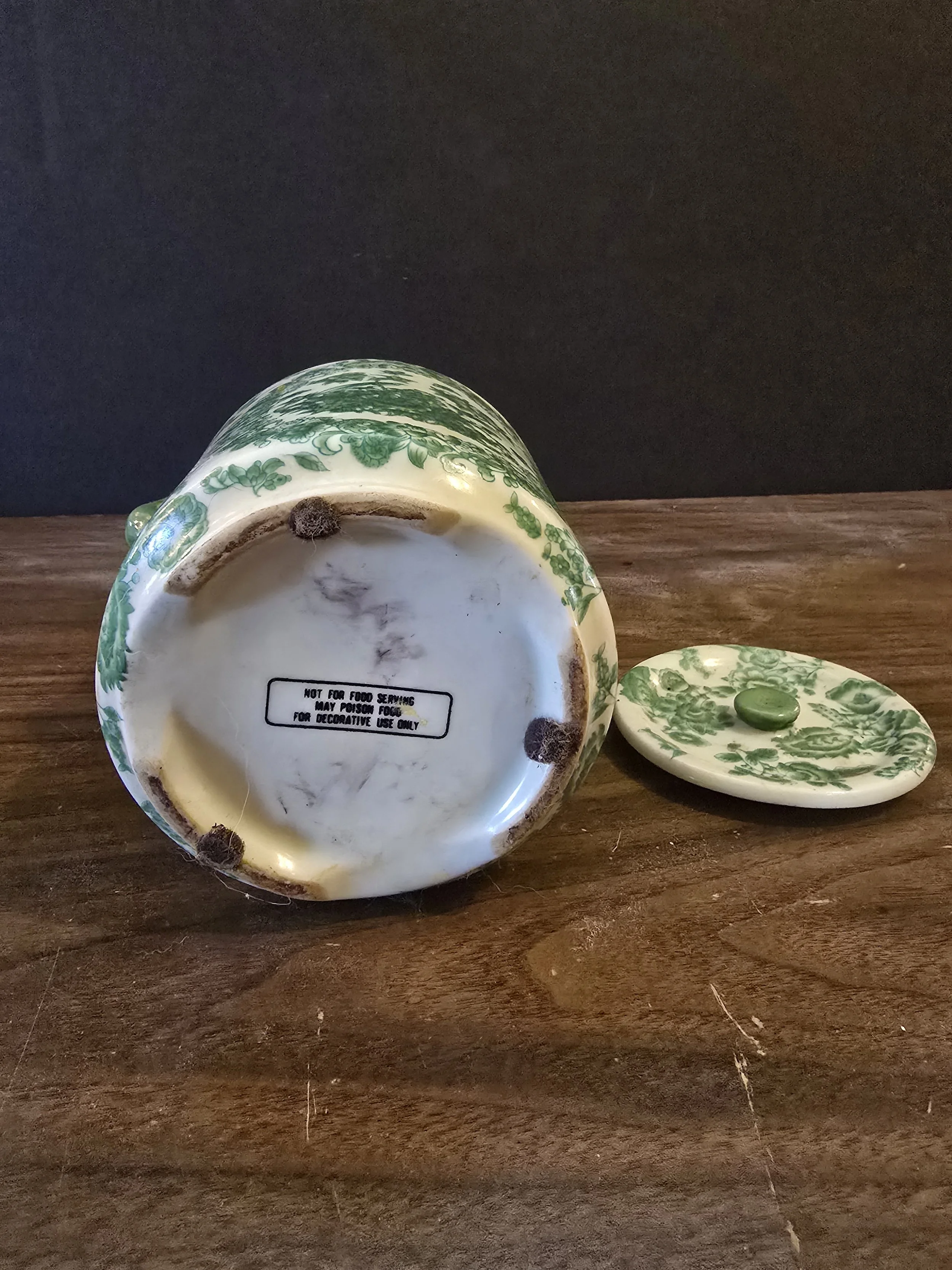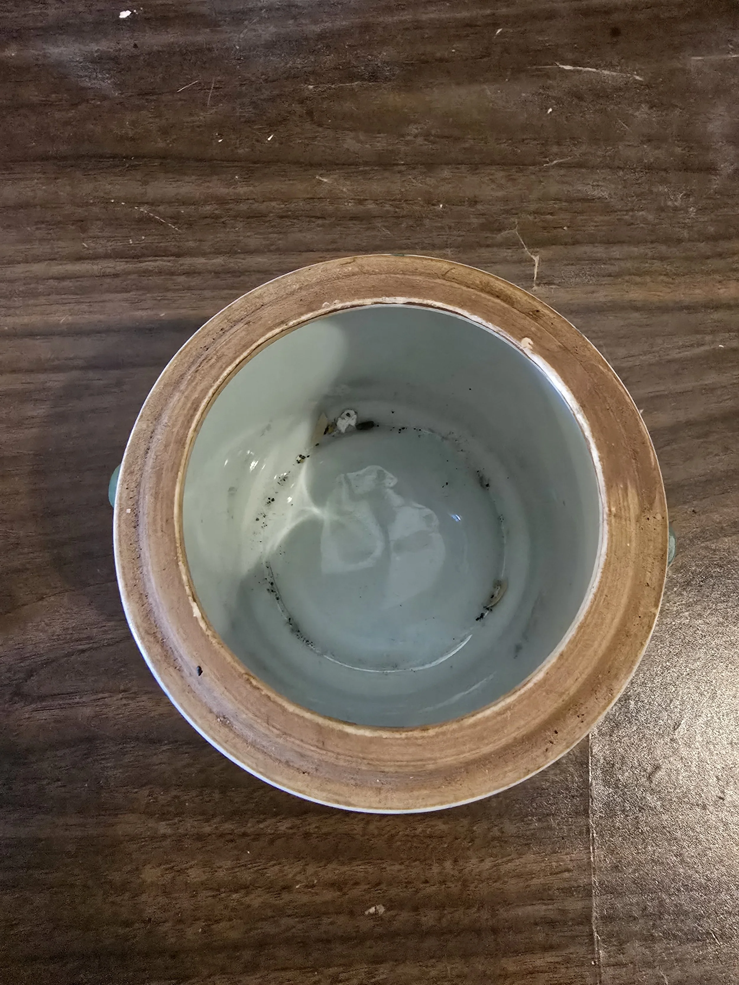 It is really pretty and does not appear to have chips. The lid is weird. It clearly fits and is made for it, but I do not like how it fits. This piece is 6” x 5.25” x 5.75”