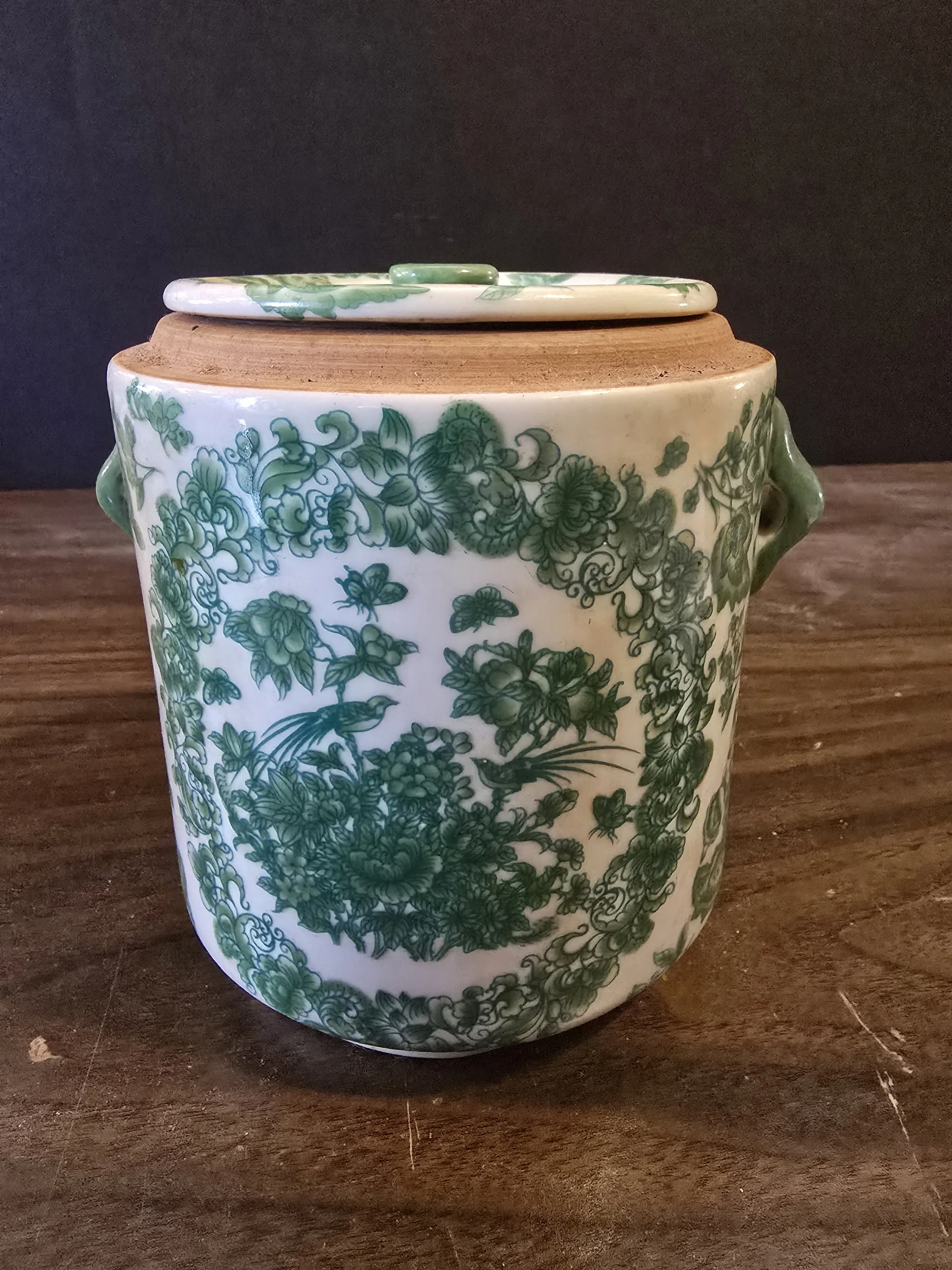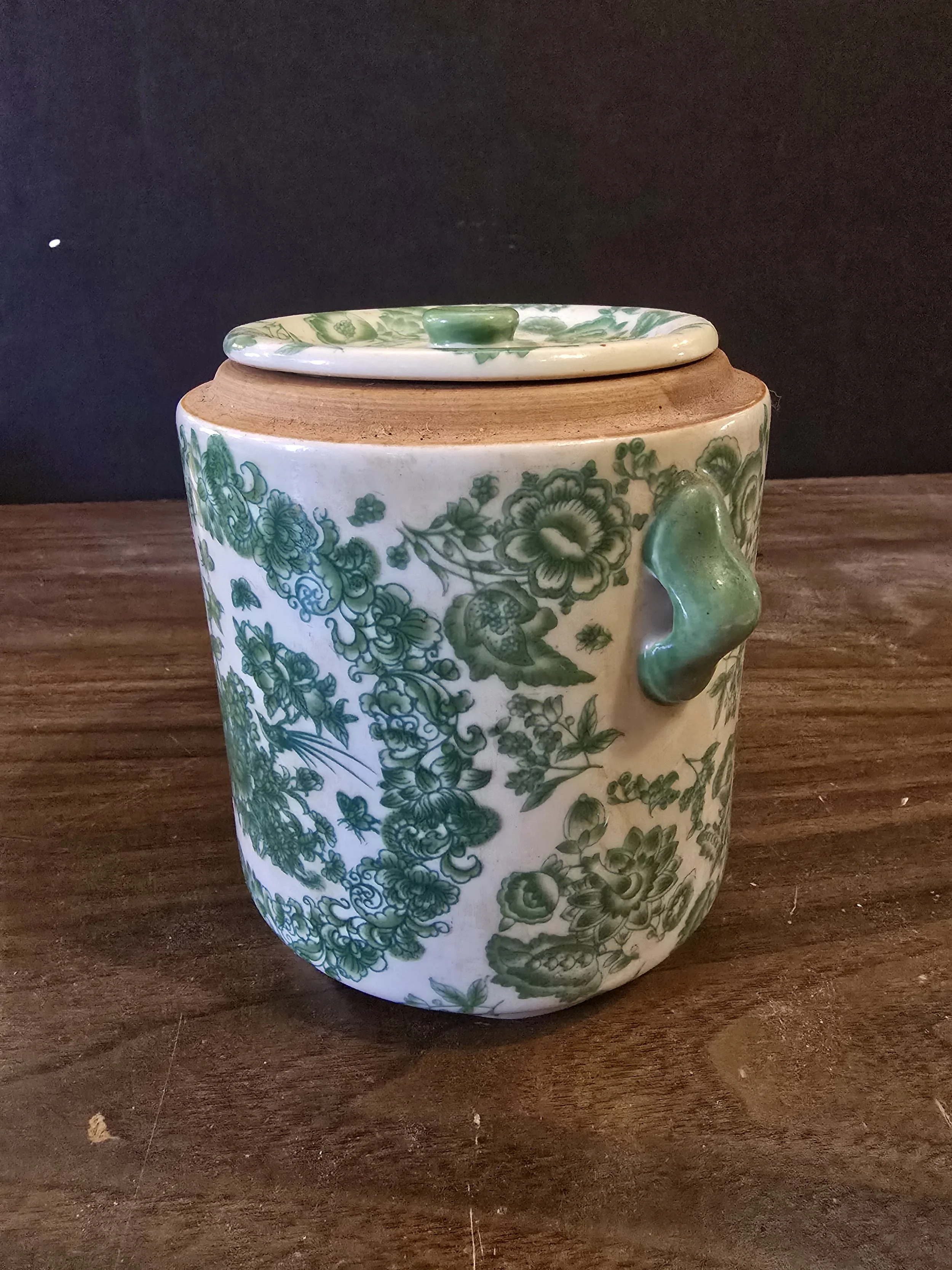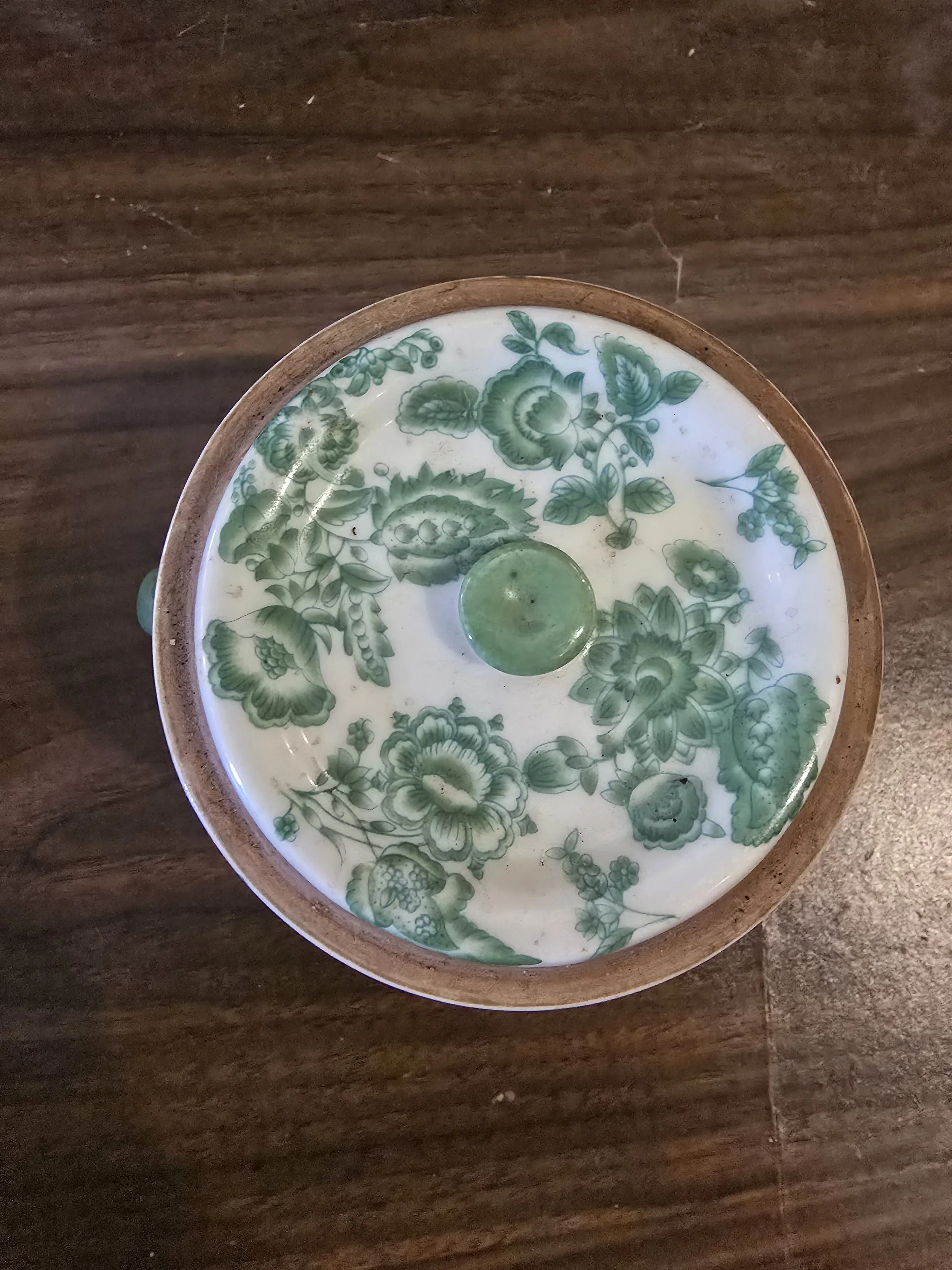 It is really pretty and does not appear to have chips. The lid is weird. It clearly fits and is made for it, but I do not like how it fits. This piece is 6” x 5.25” x 5.75”
