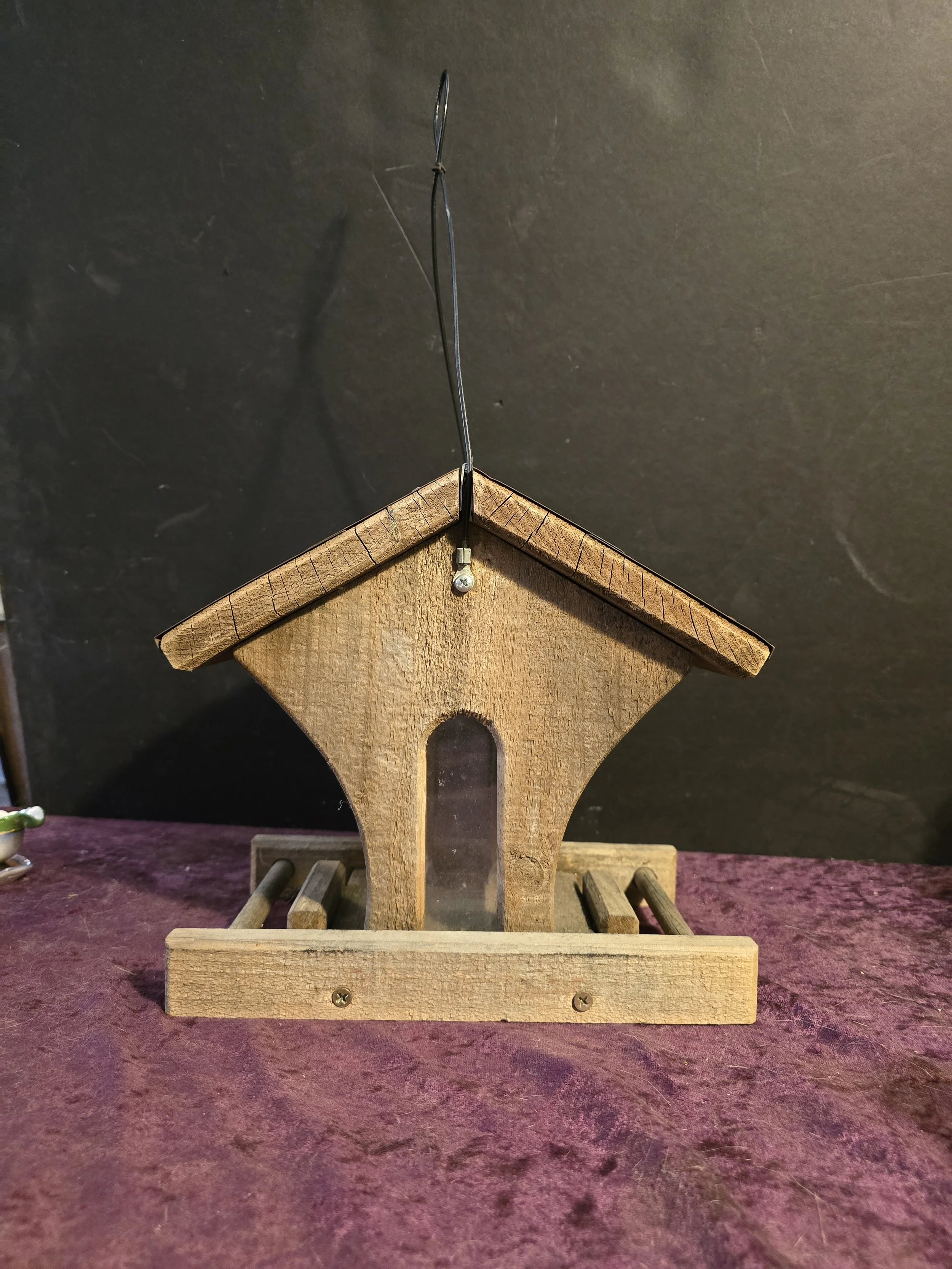 Wooden house shaped hanging bird feeder.