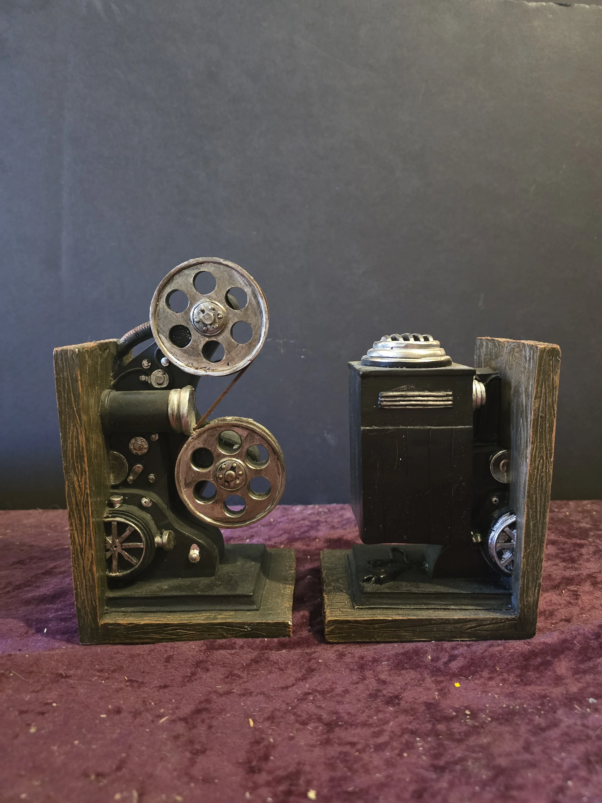 Pair of modern bookends meant to look like a vintage camera. Made of resin.
