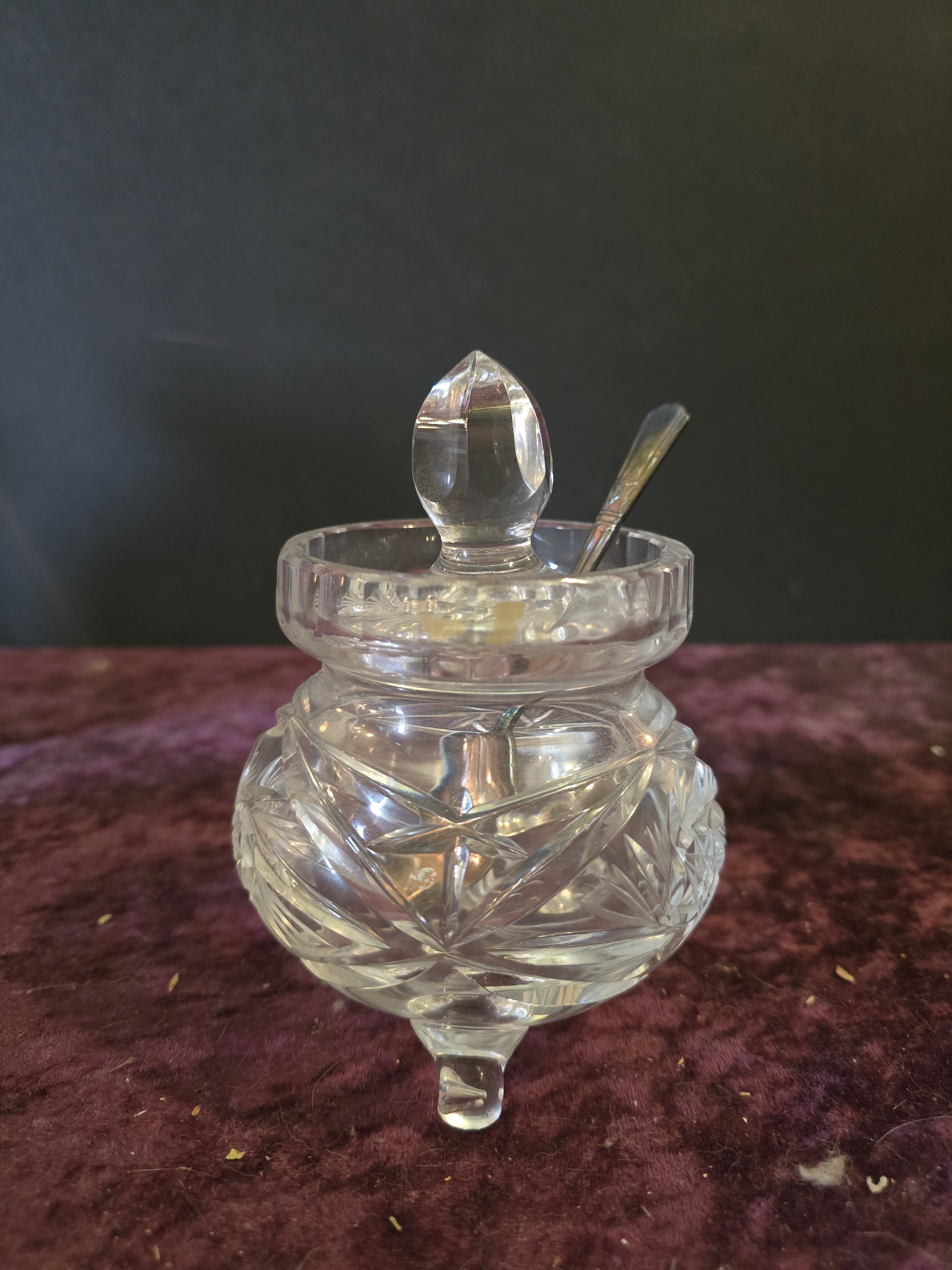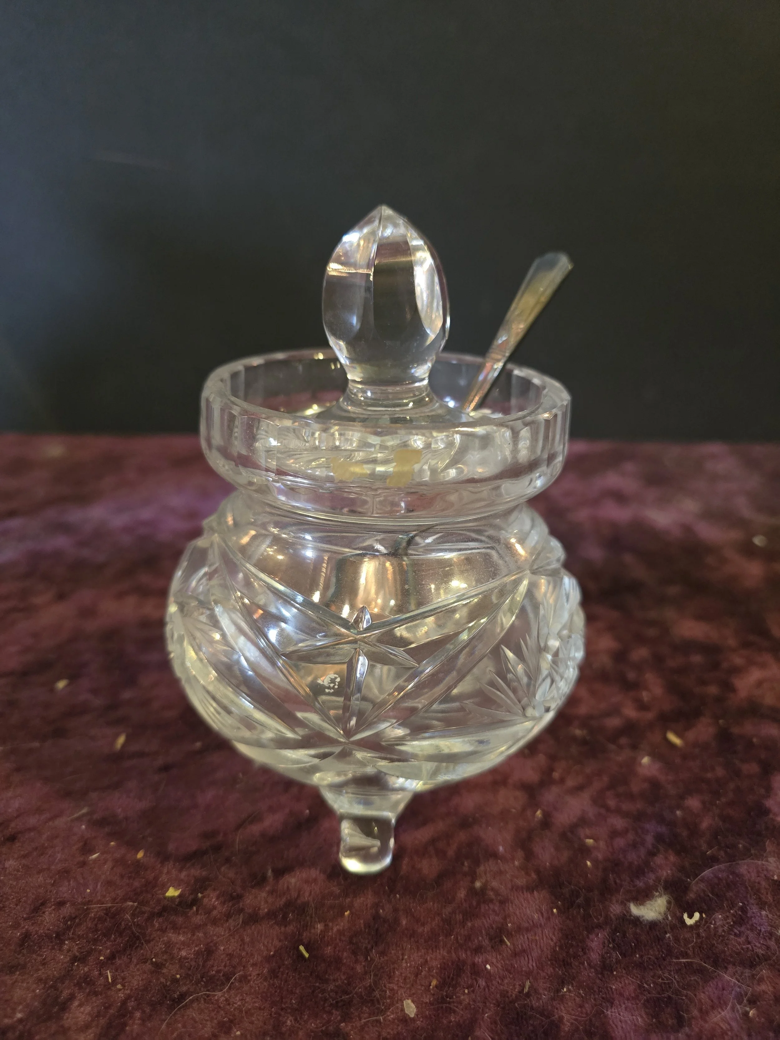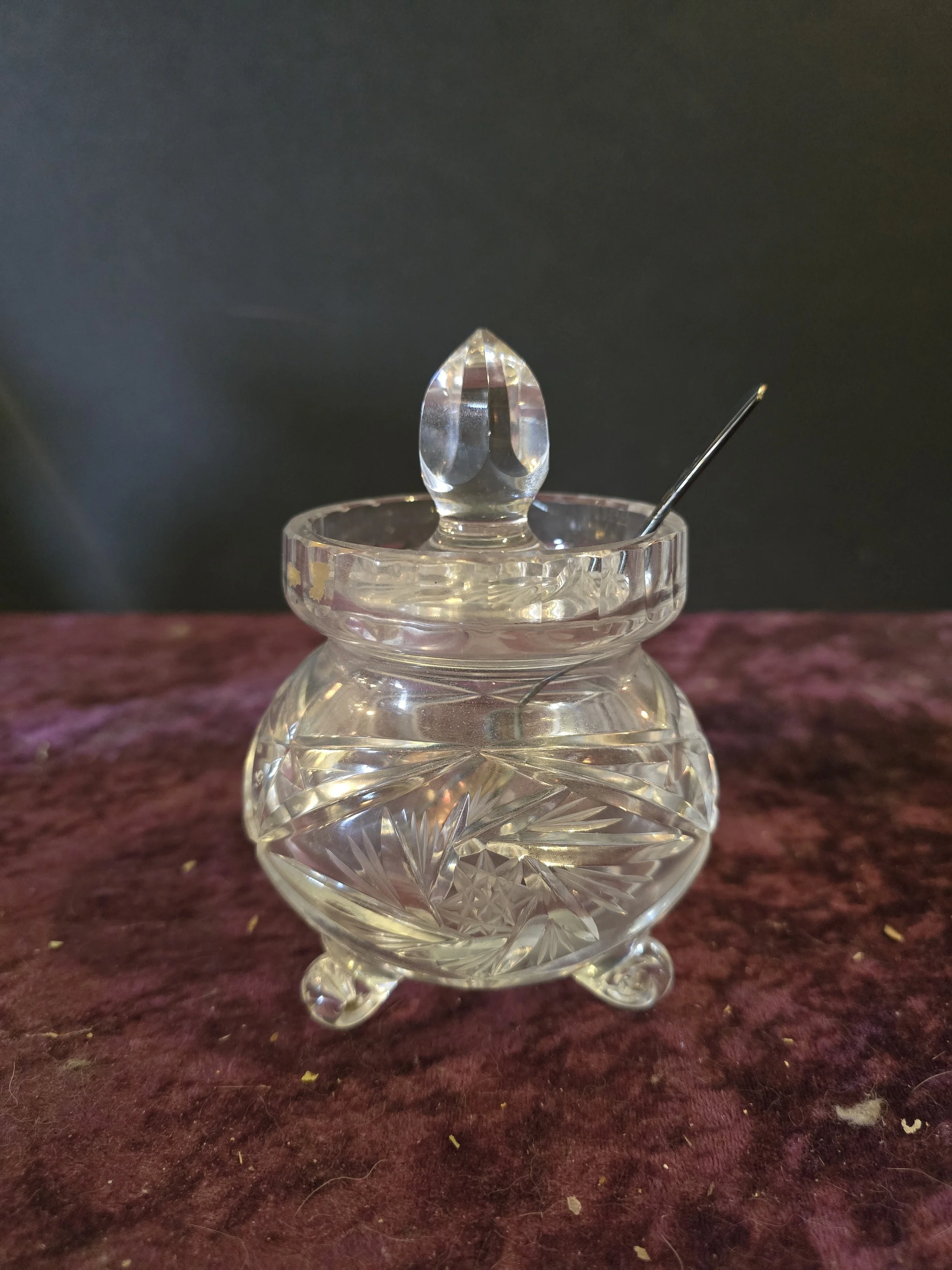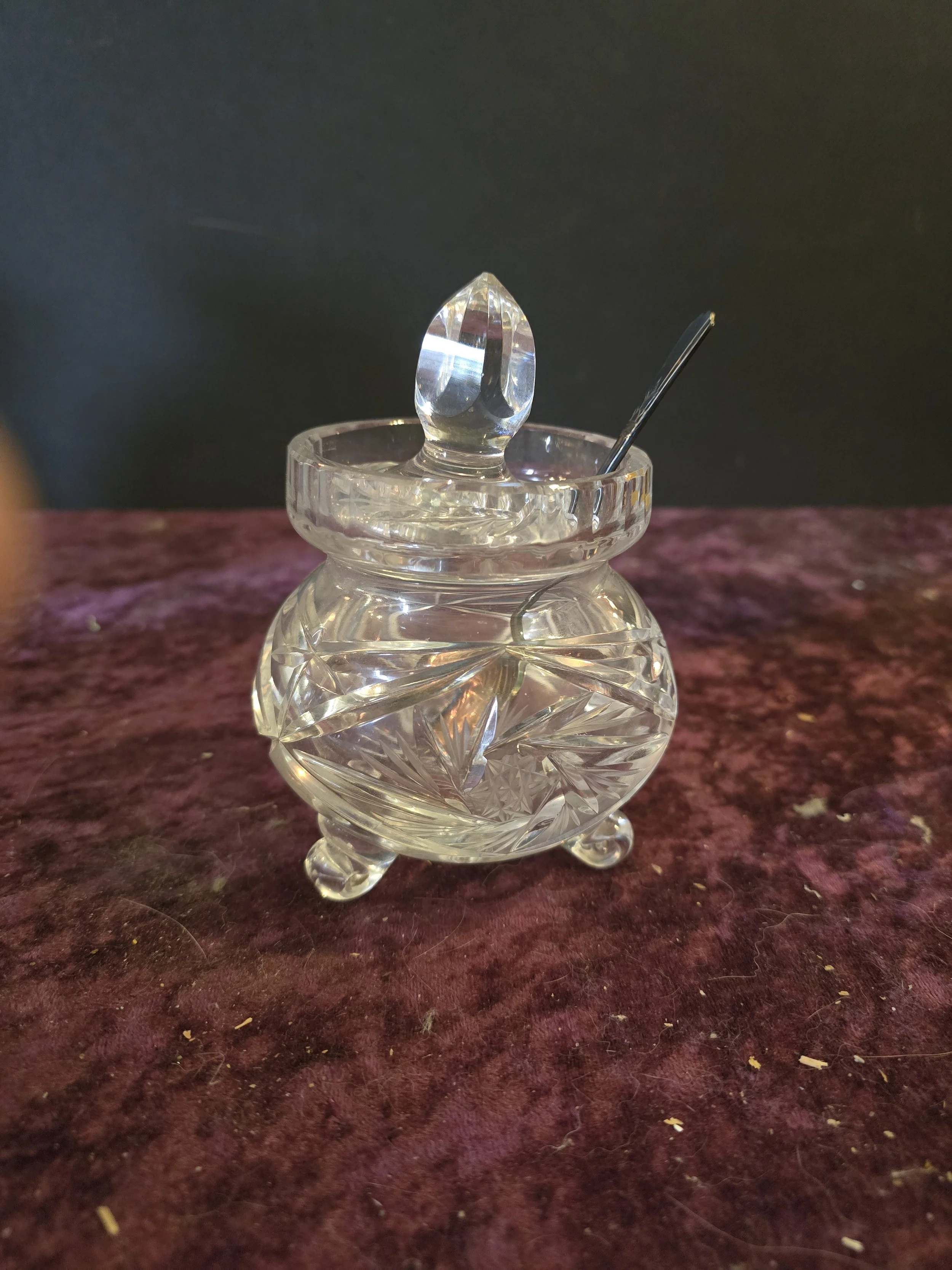 Beautiful cut glass footed jam pot with lid and spoon. It is in excellent condition