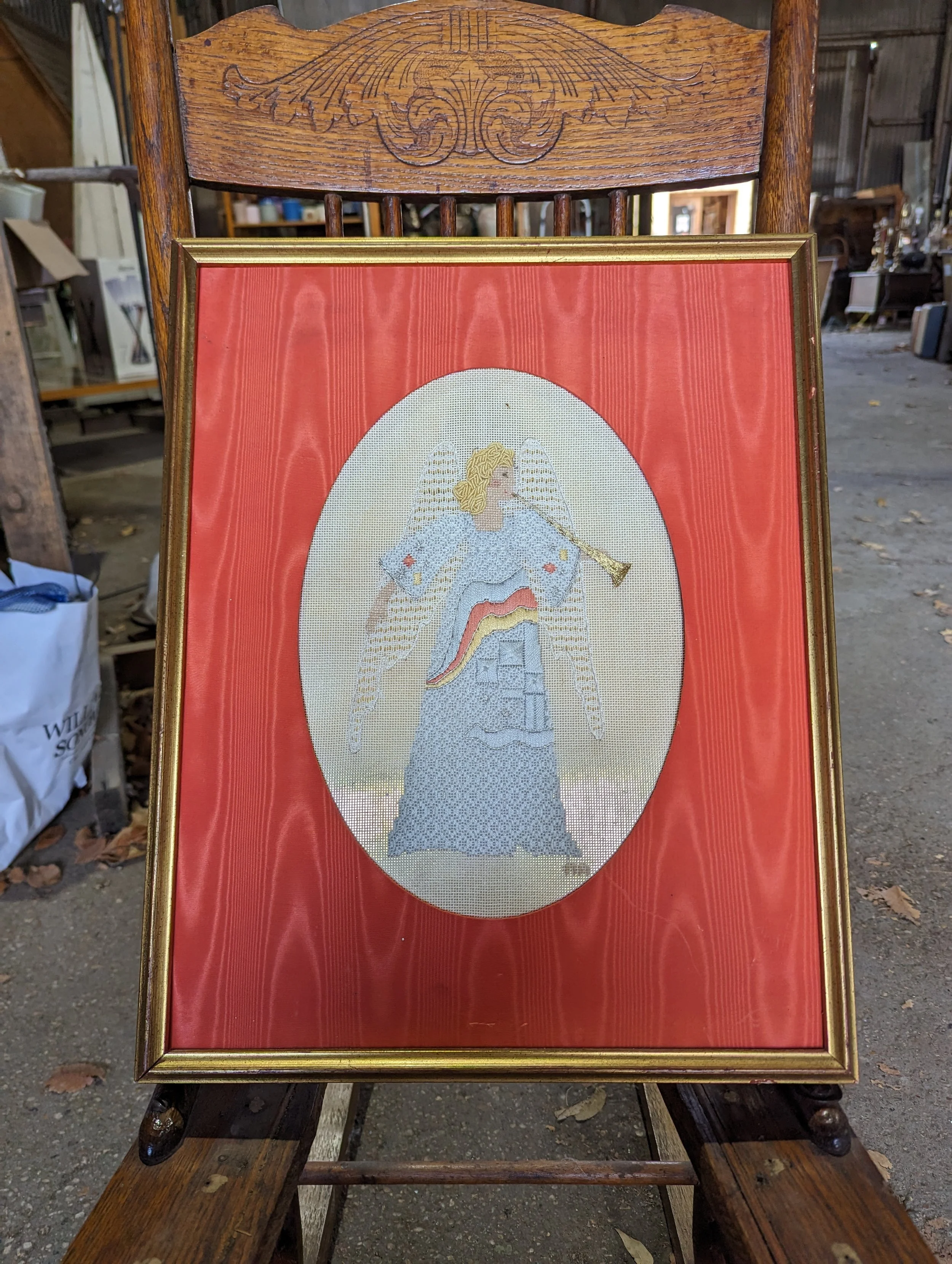 Needle work of an angel with a horn in frame. There's some nice sheen to some of the fabric backing