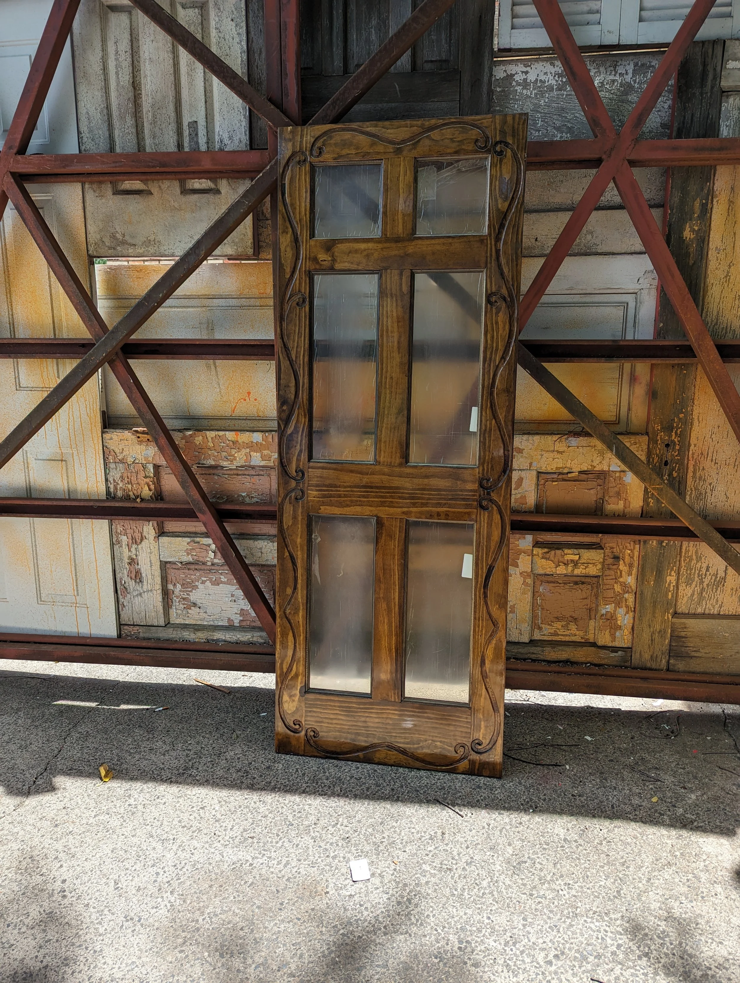 Funky interior door with glass panels and scrolly details. The glass has some stickers on it. Door has no hole for the knob or hinges.