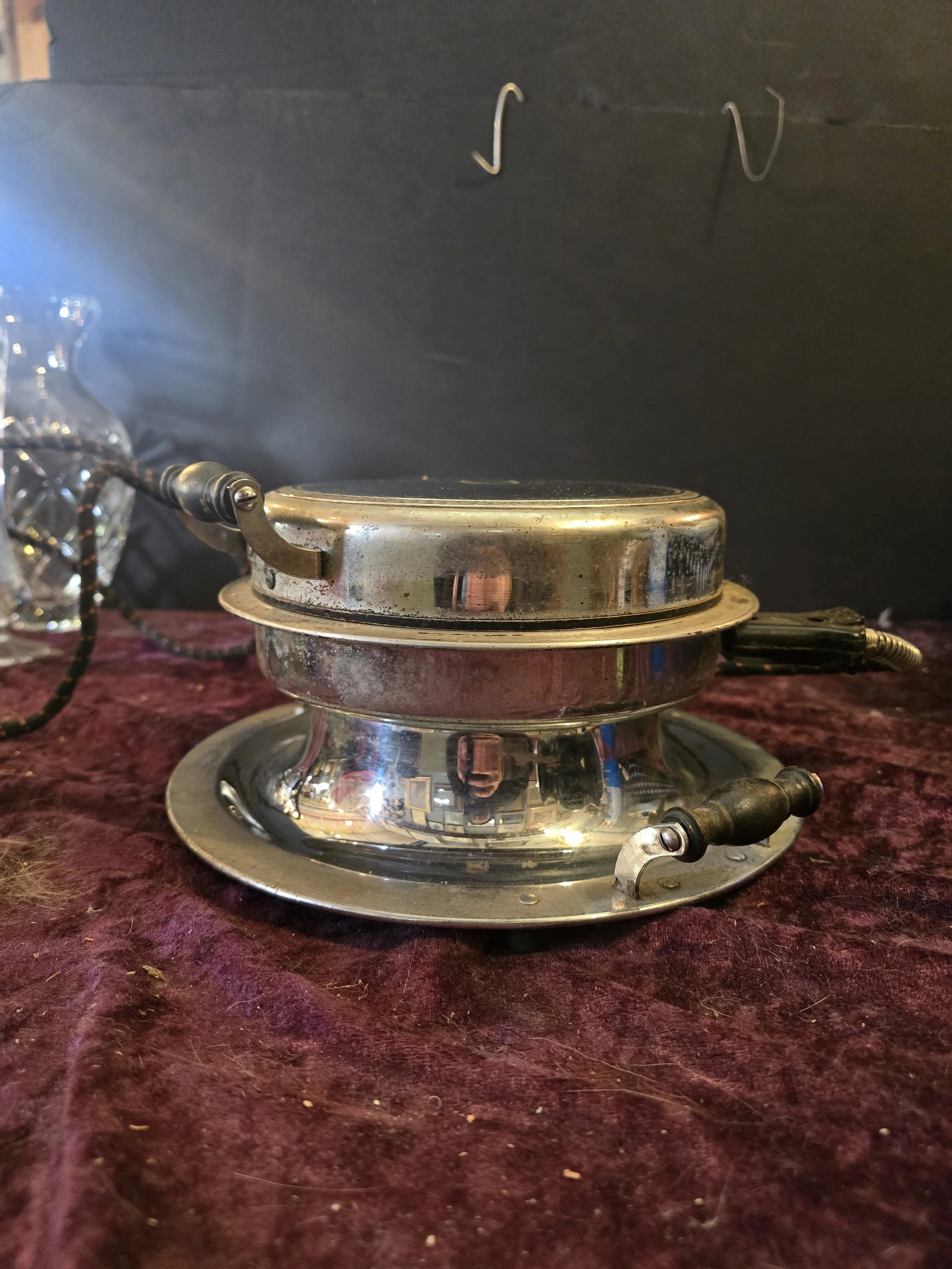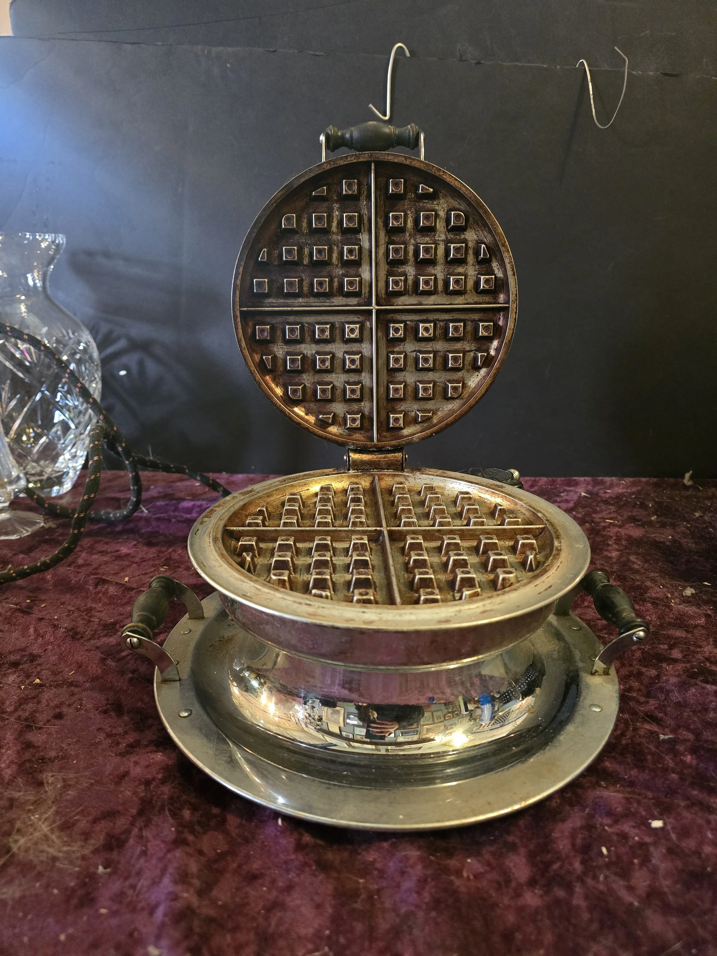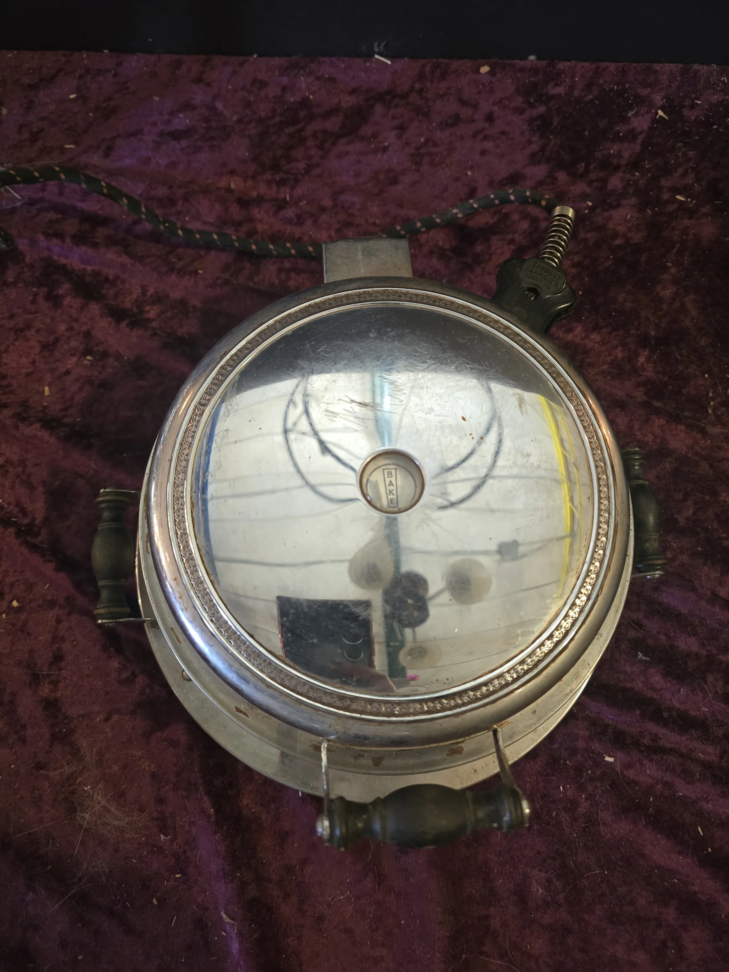 1930's Manning Bowman electric Waffle maker. We tested this Waffle maker and it is still works. The dial on the top still indicates whe it’s reached the temperature to use. This model has wooden handles.