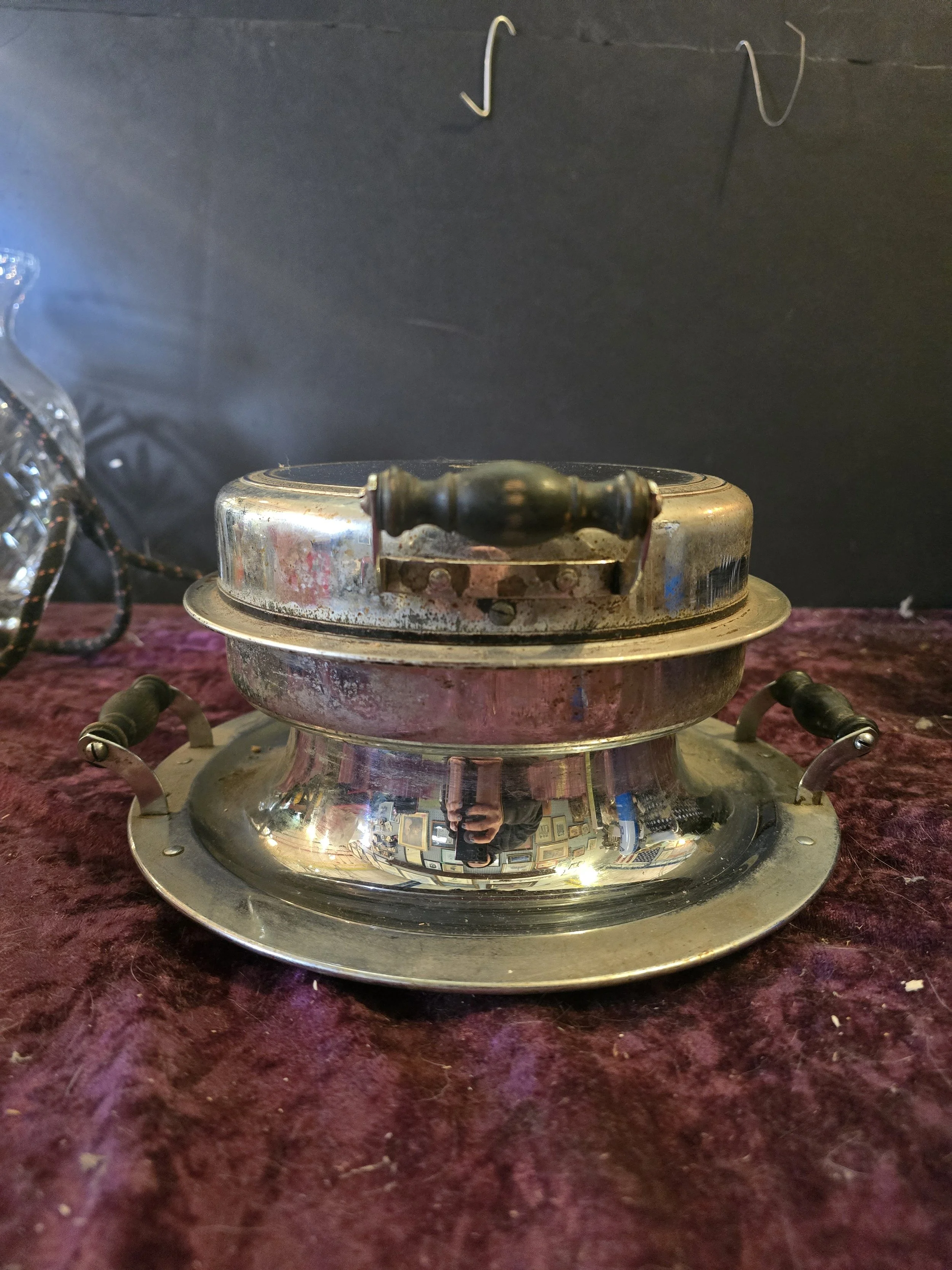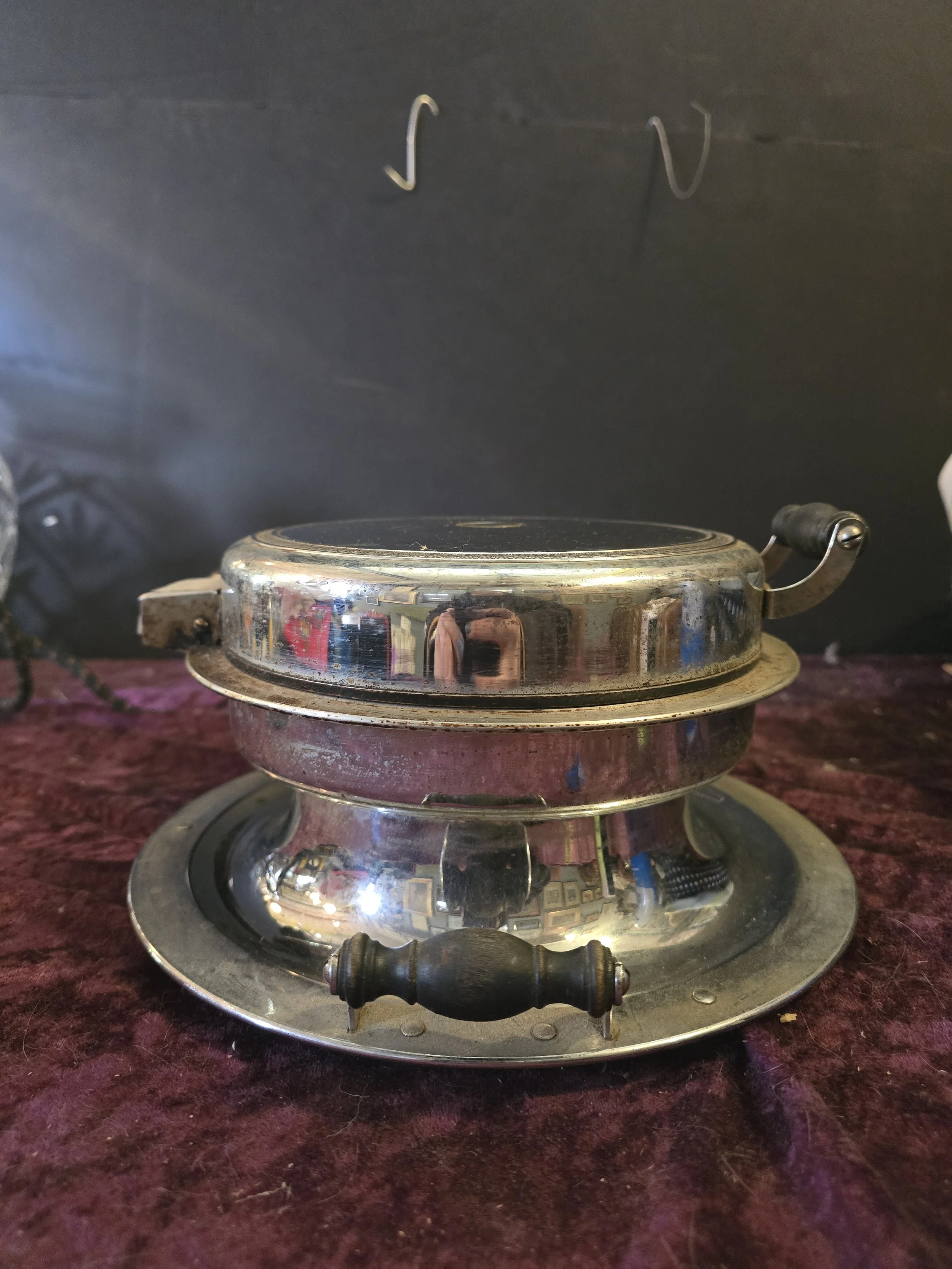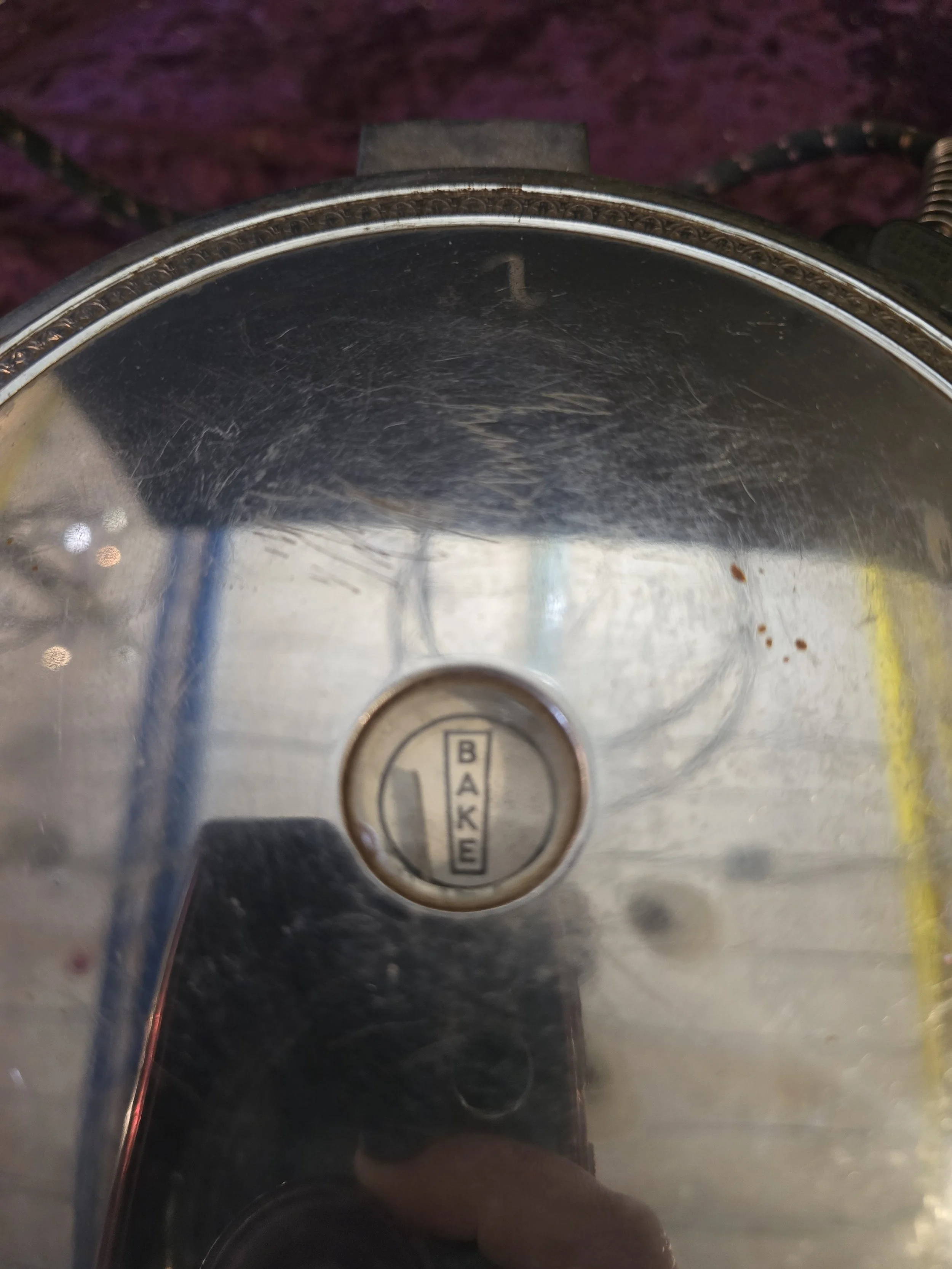 1930's Manning Bowman electric Waffle maker. We tested this Waffle maker and it is still works. The dial on the top still indicates whe it’s reached the temperature to use. This model has wooden handles.
