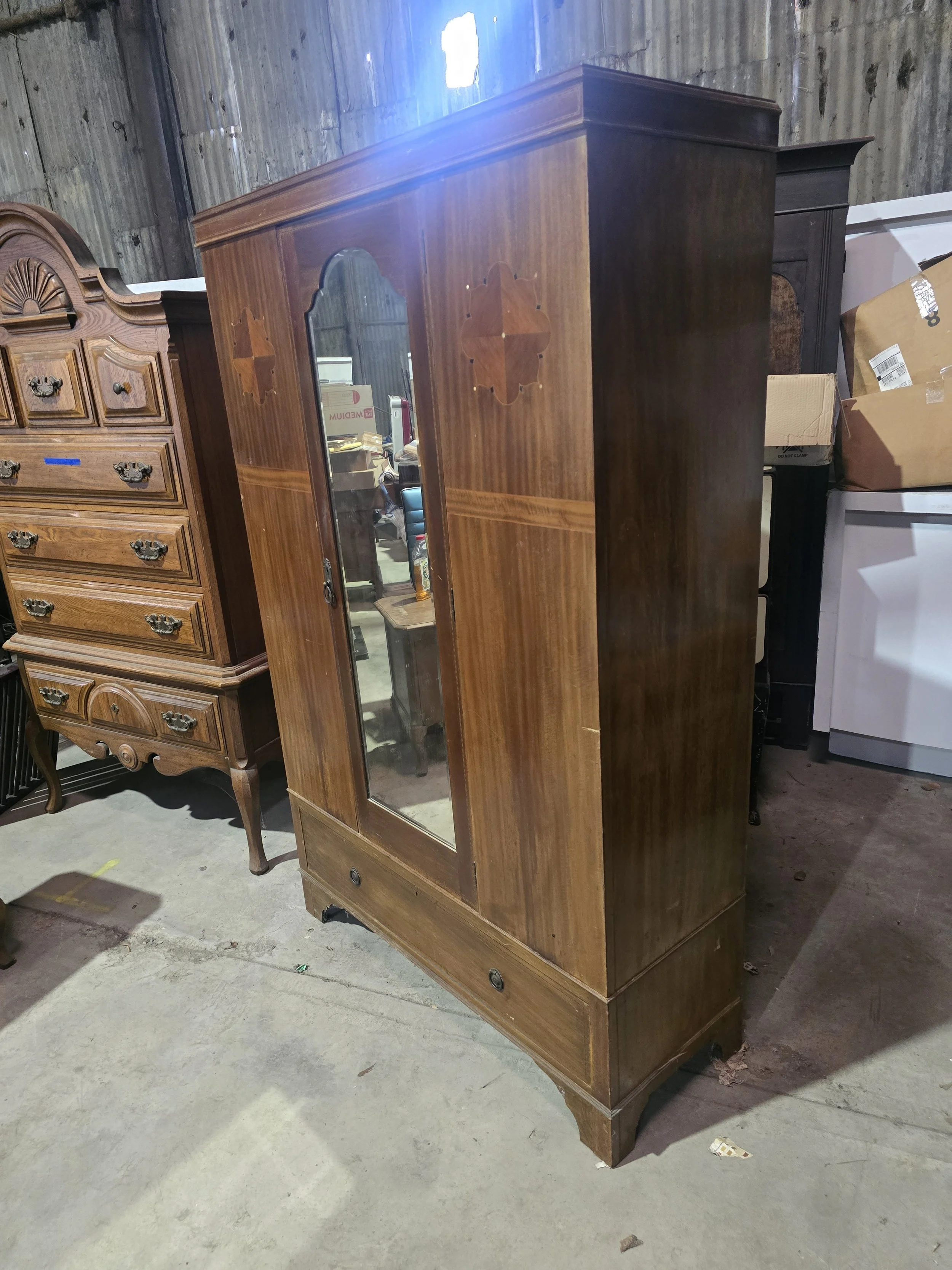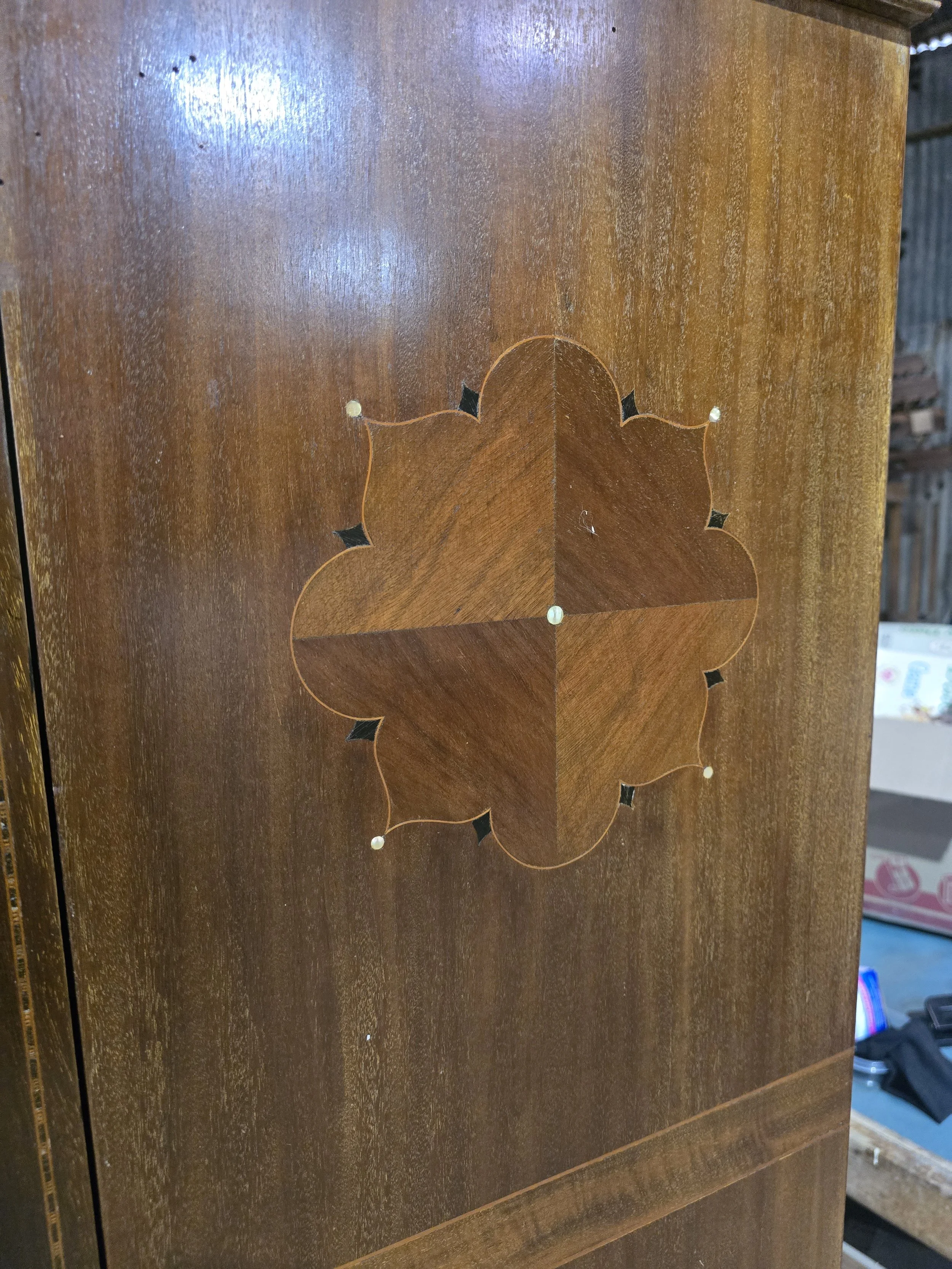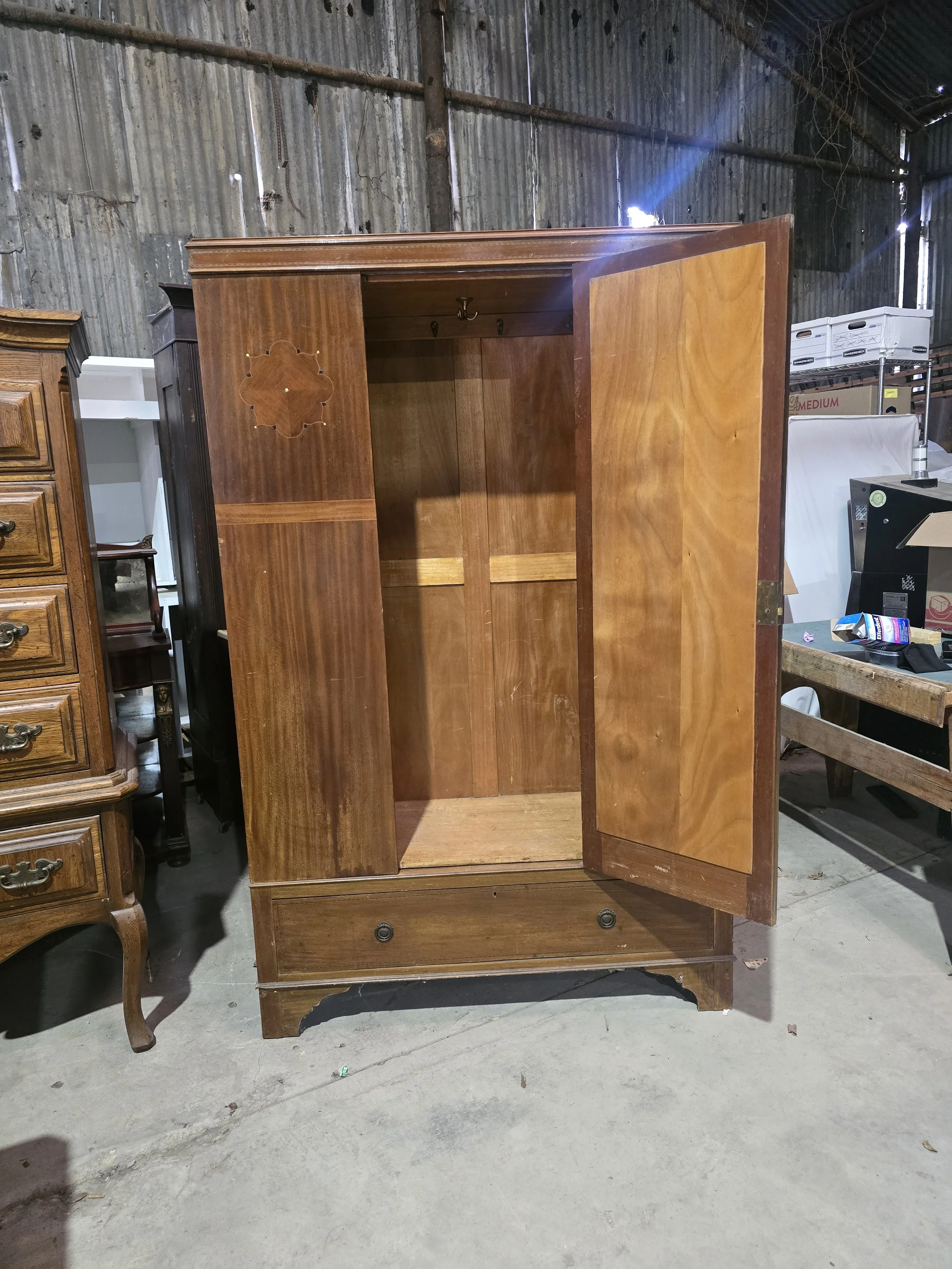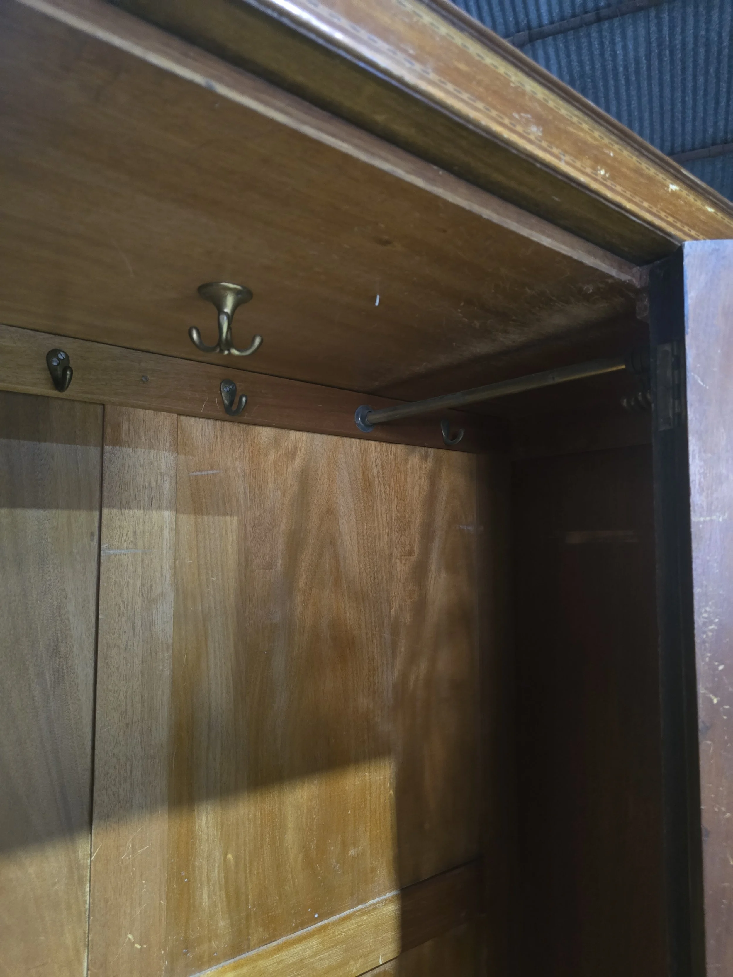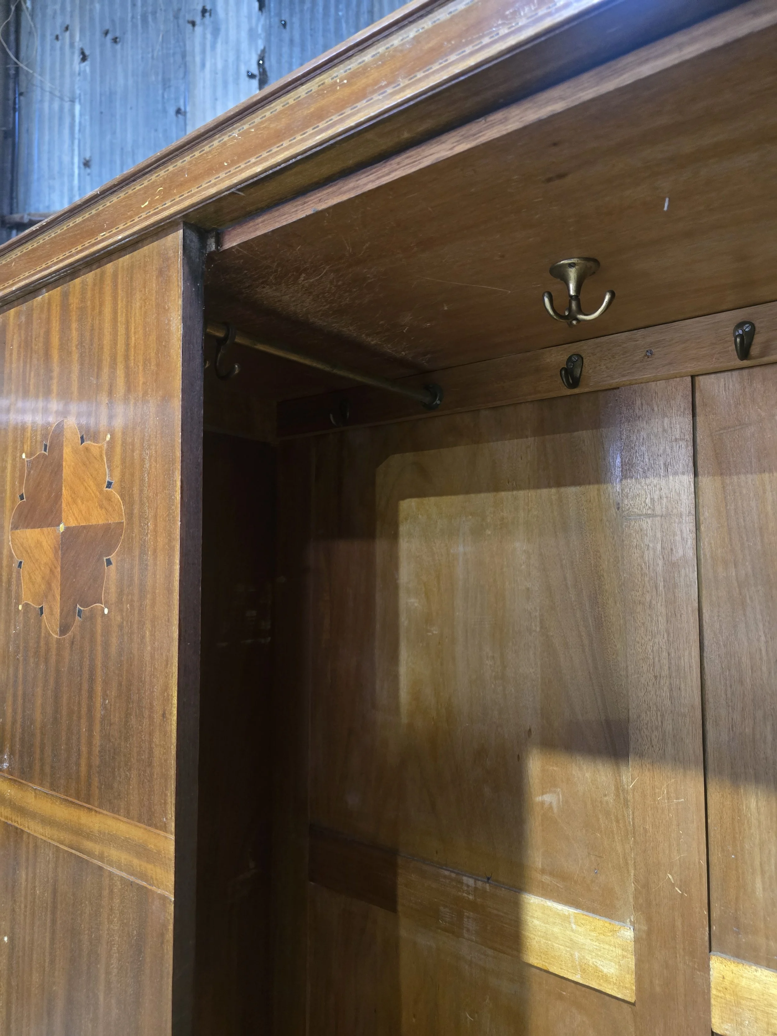 Gorgeous early 1900’s Edwardian style inlay double wardrobe. Inside the armoire has a rod for hanging coats and things on each side and lots of hooks. There is a drawer on the bottom. Overall this armoire is in very good condition.