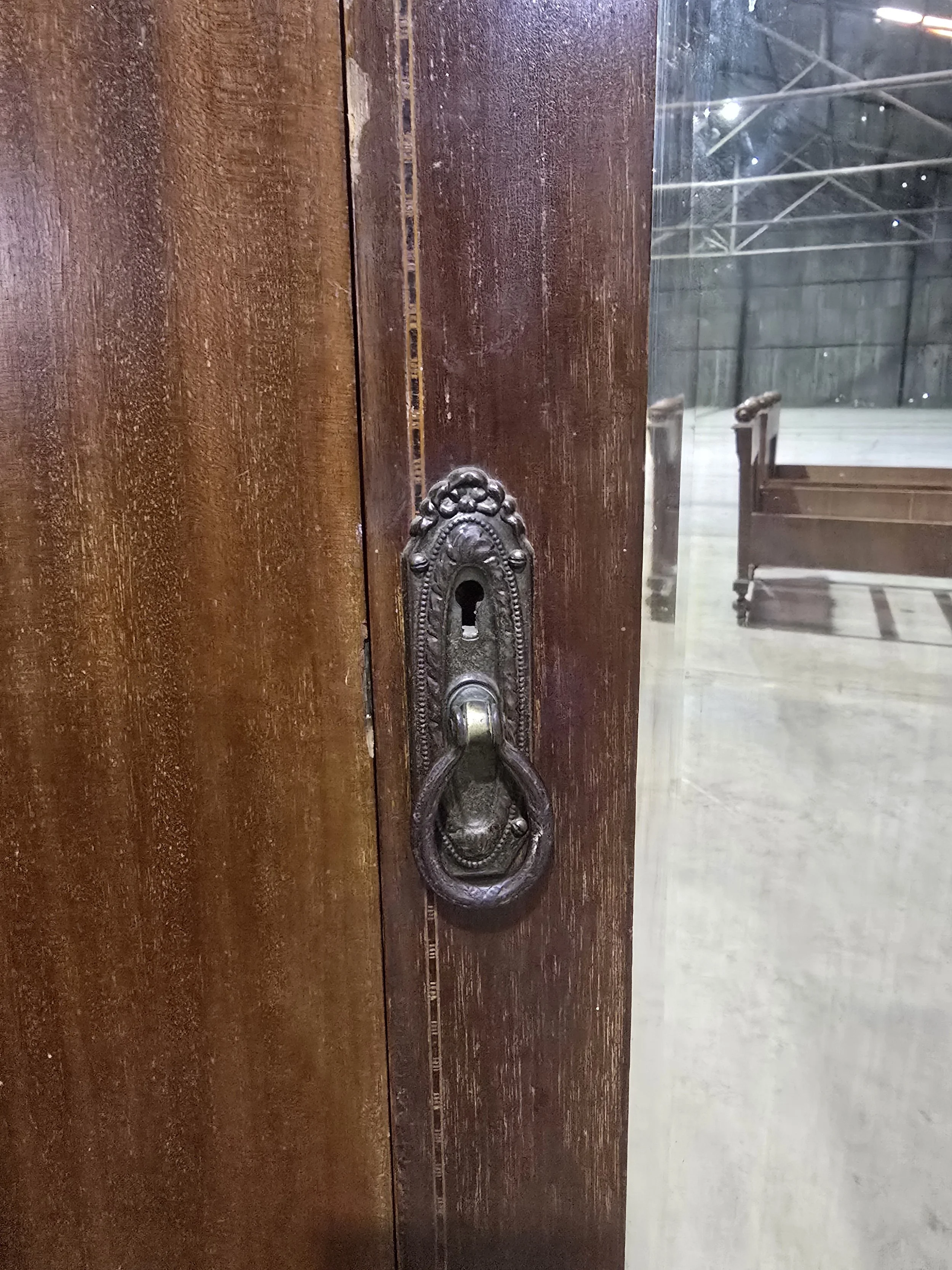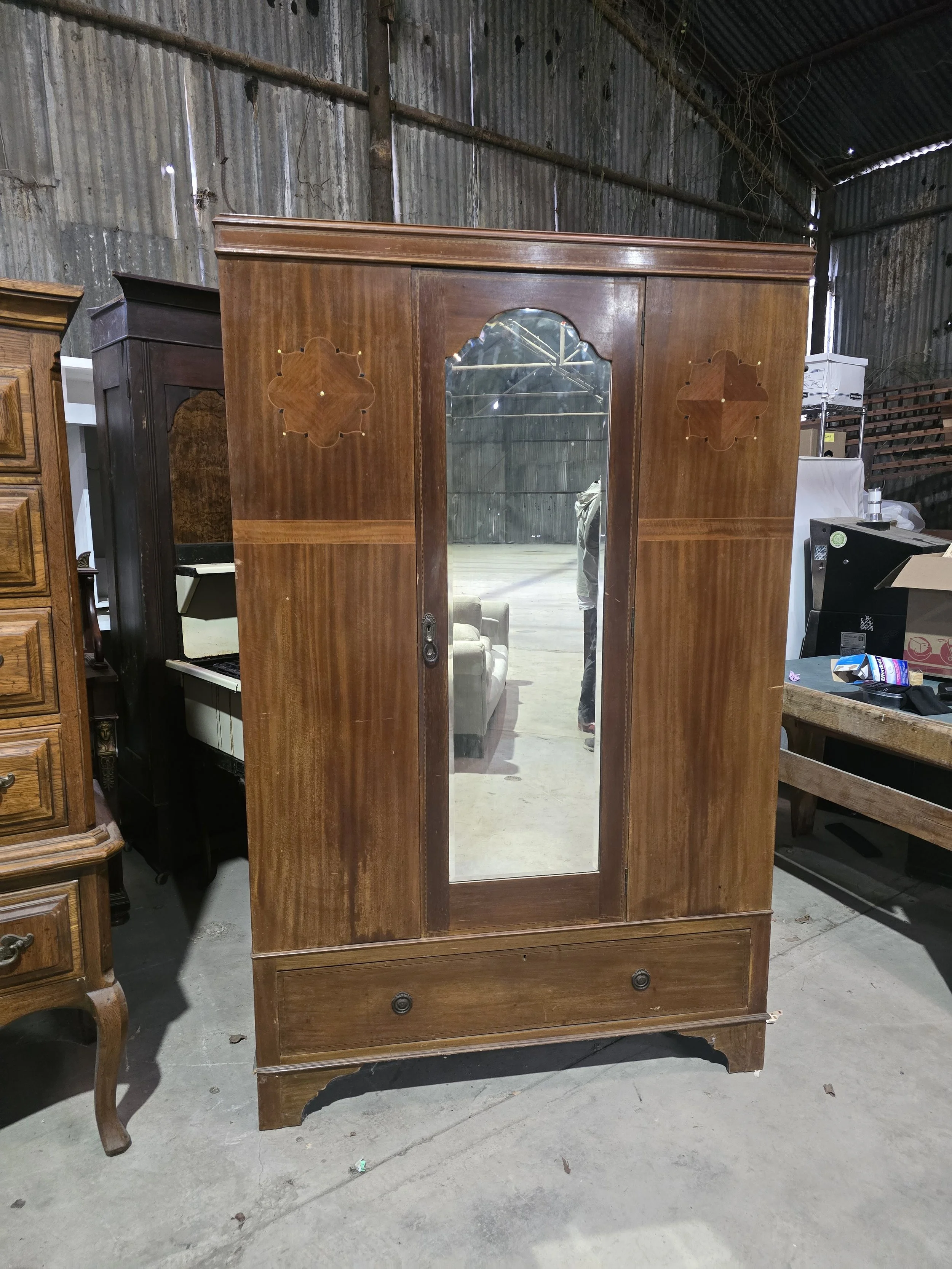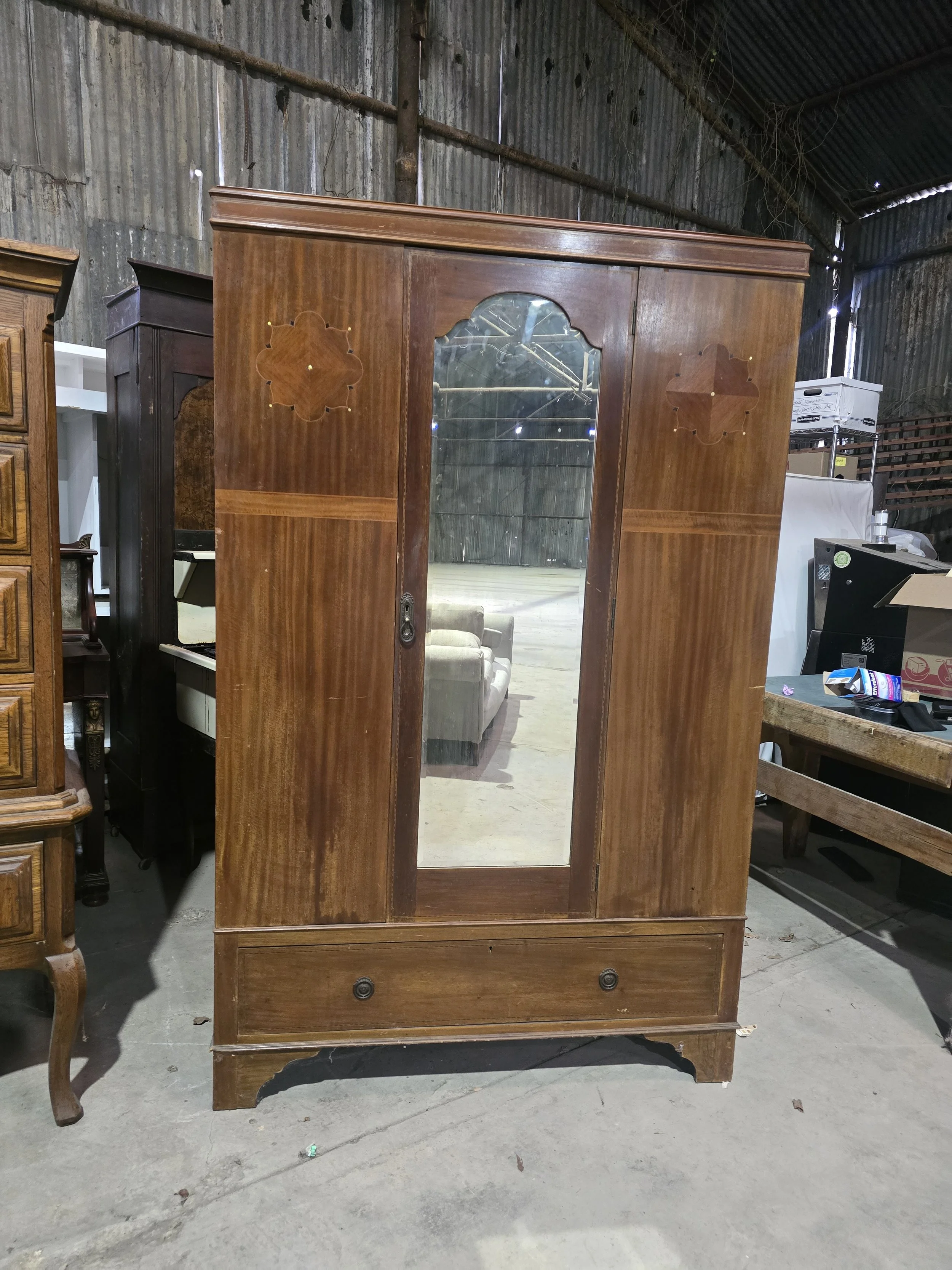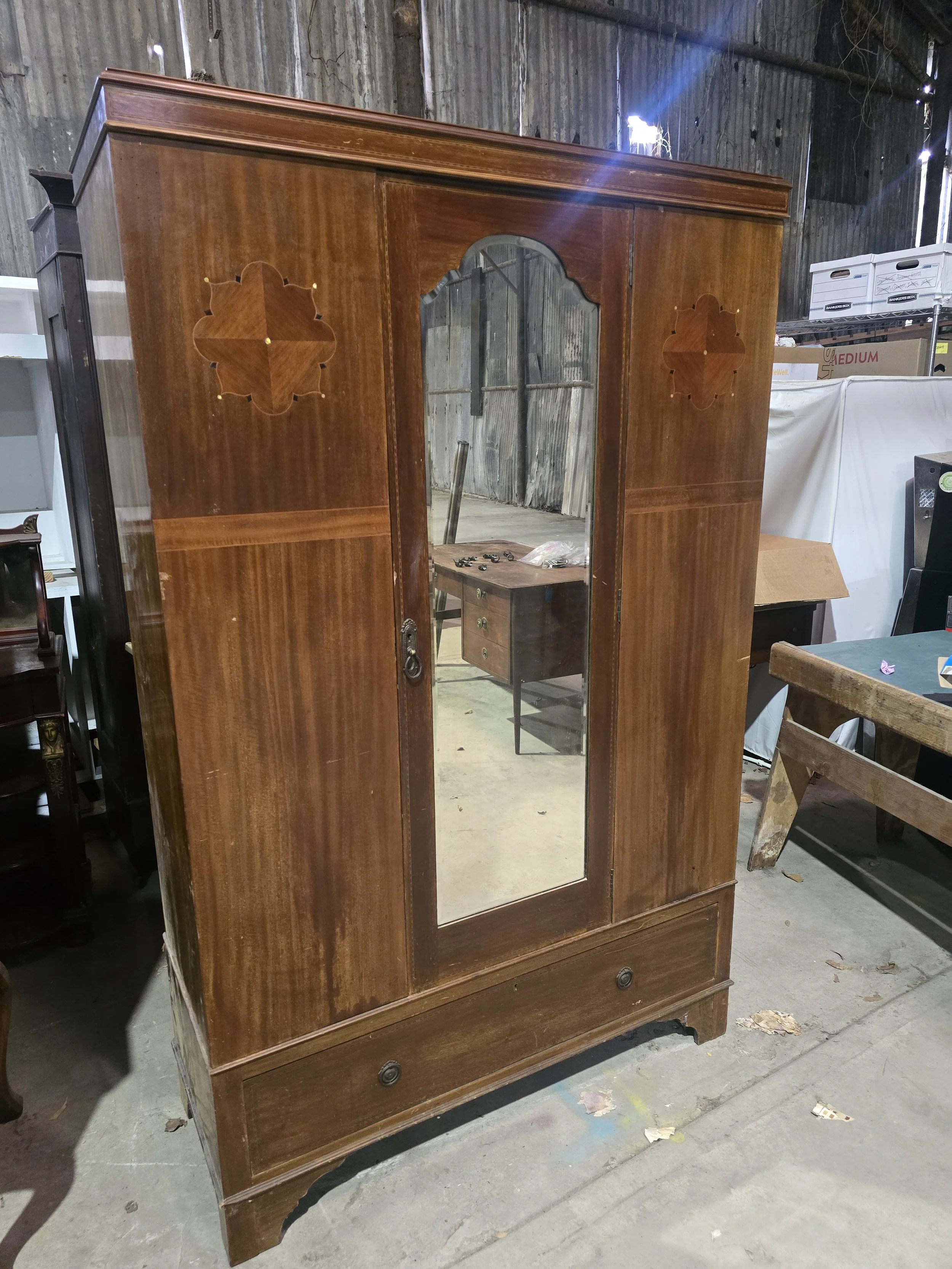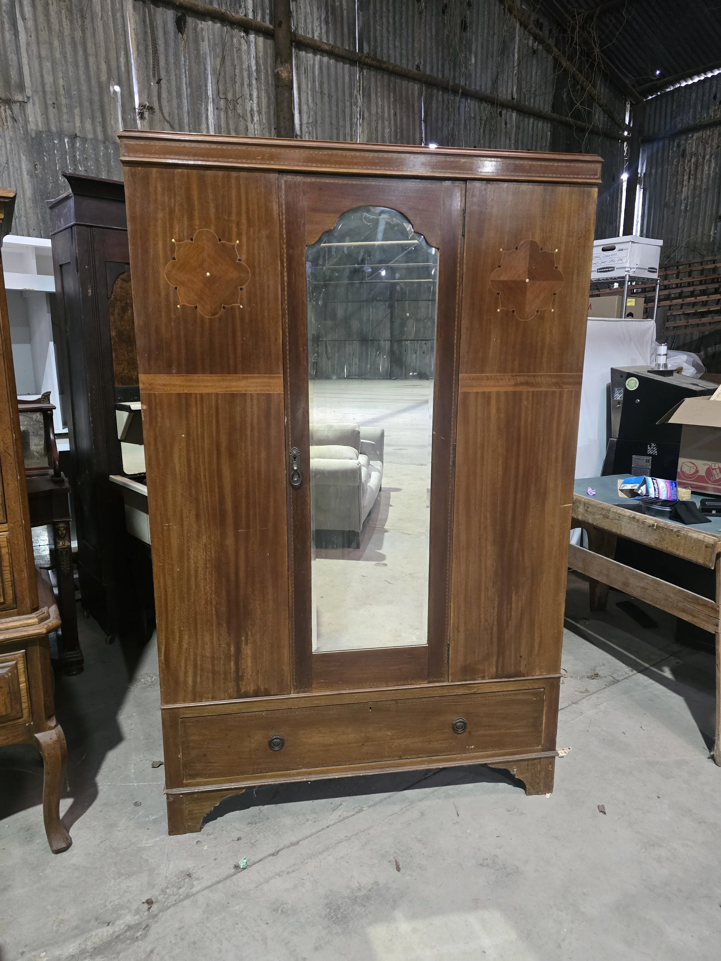 Gorgeous early 1900’s Edwardian style inlay double wardrobe. Inside the armoire has a rod for hanging coats and things on each side and lots of hooks. There is a drawer on the bottom. Overall this armoire is in very good condition.