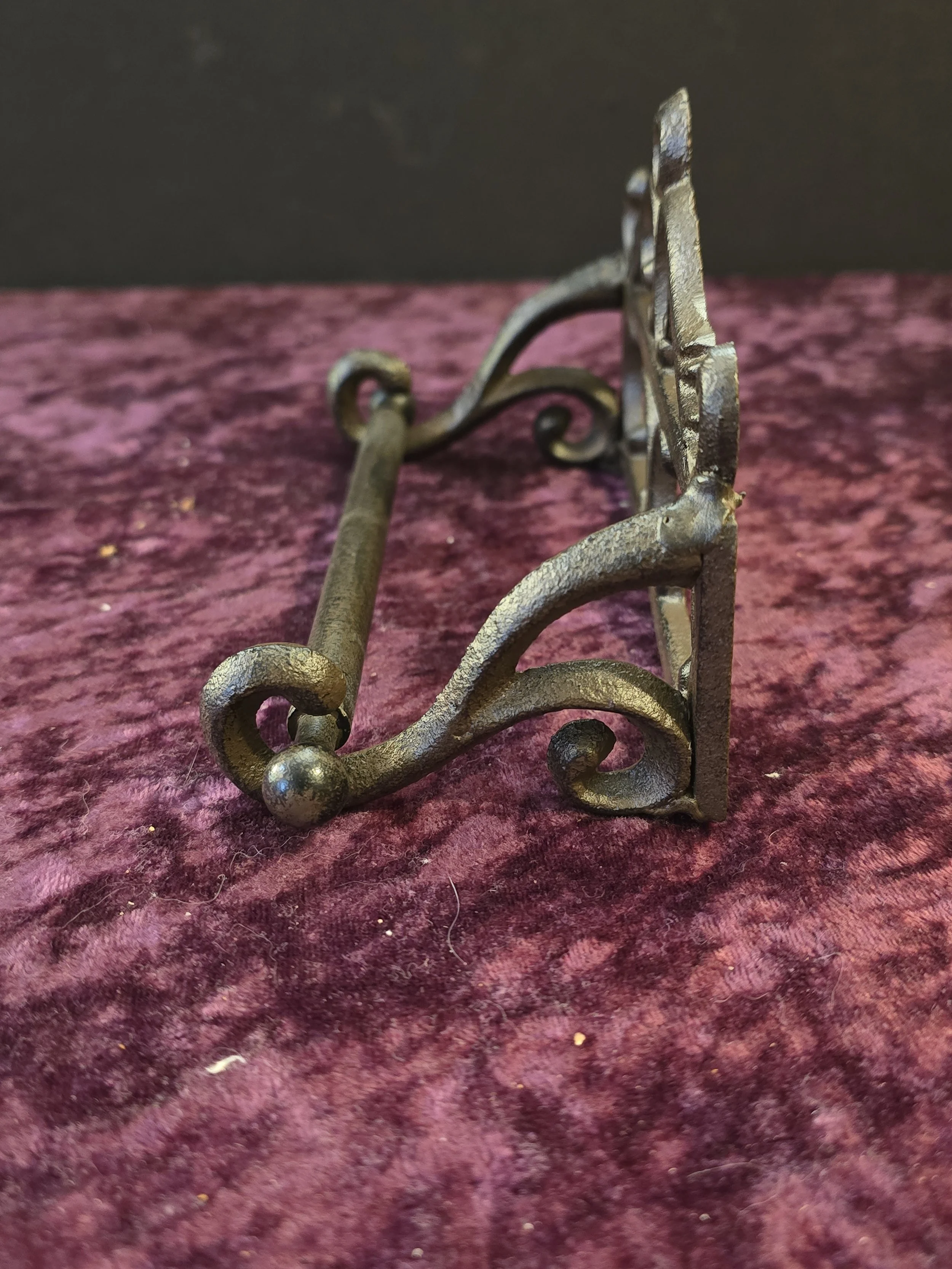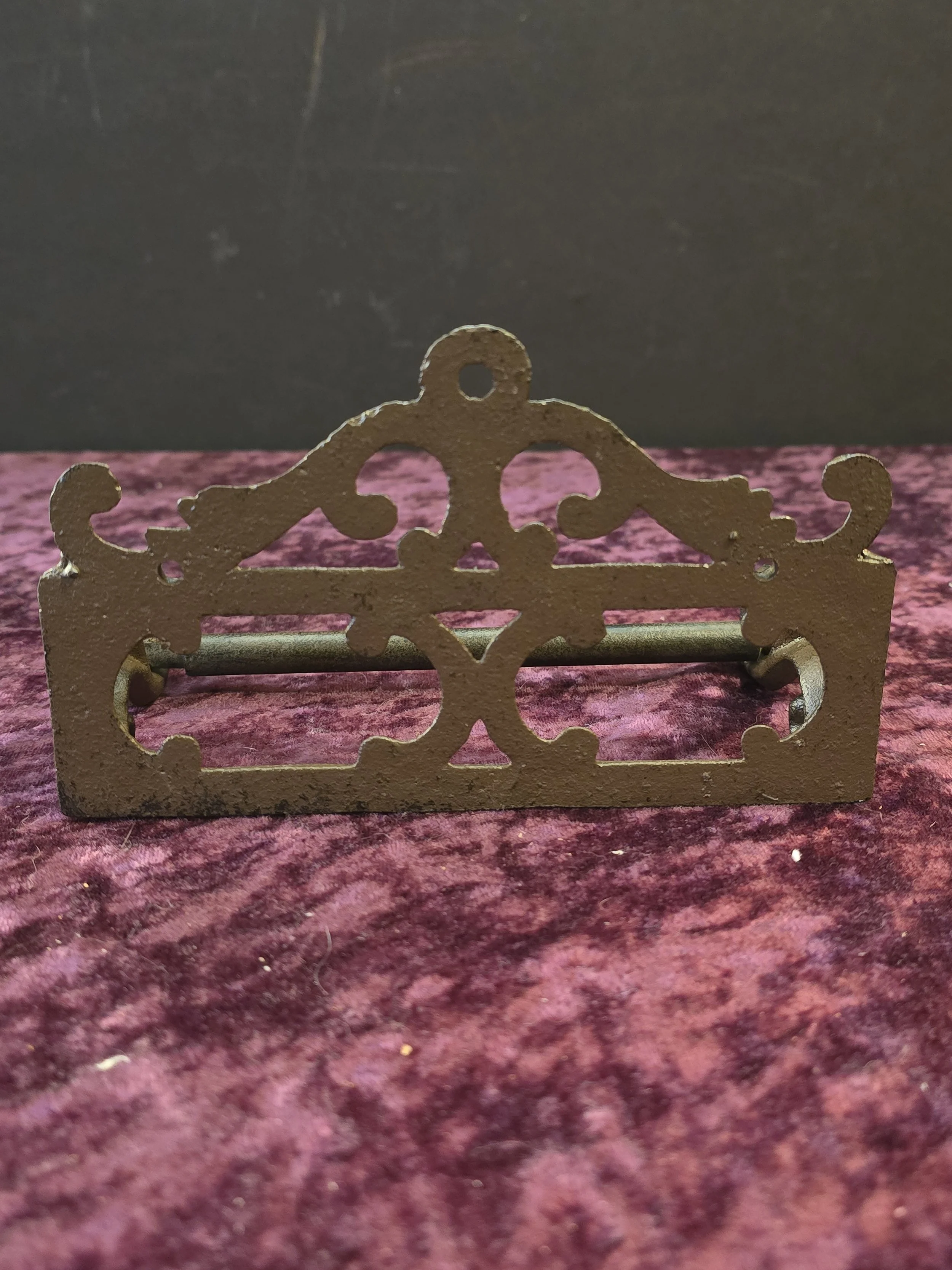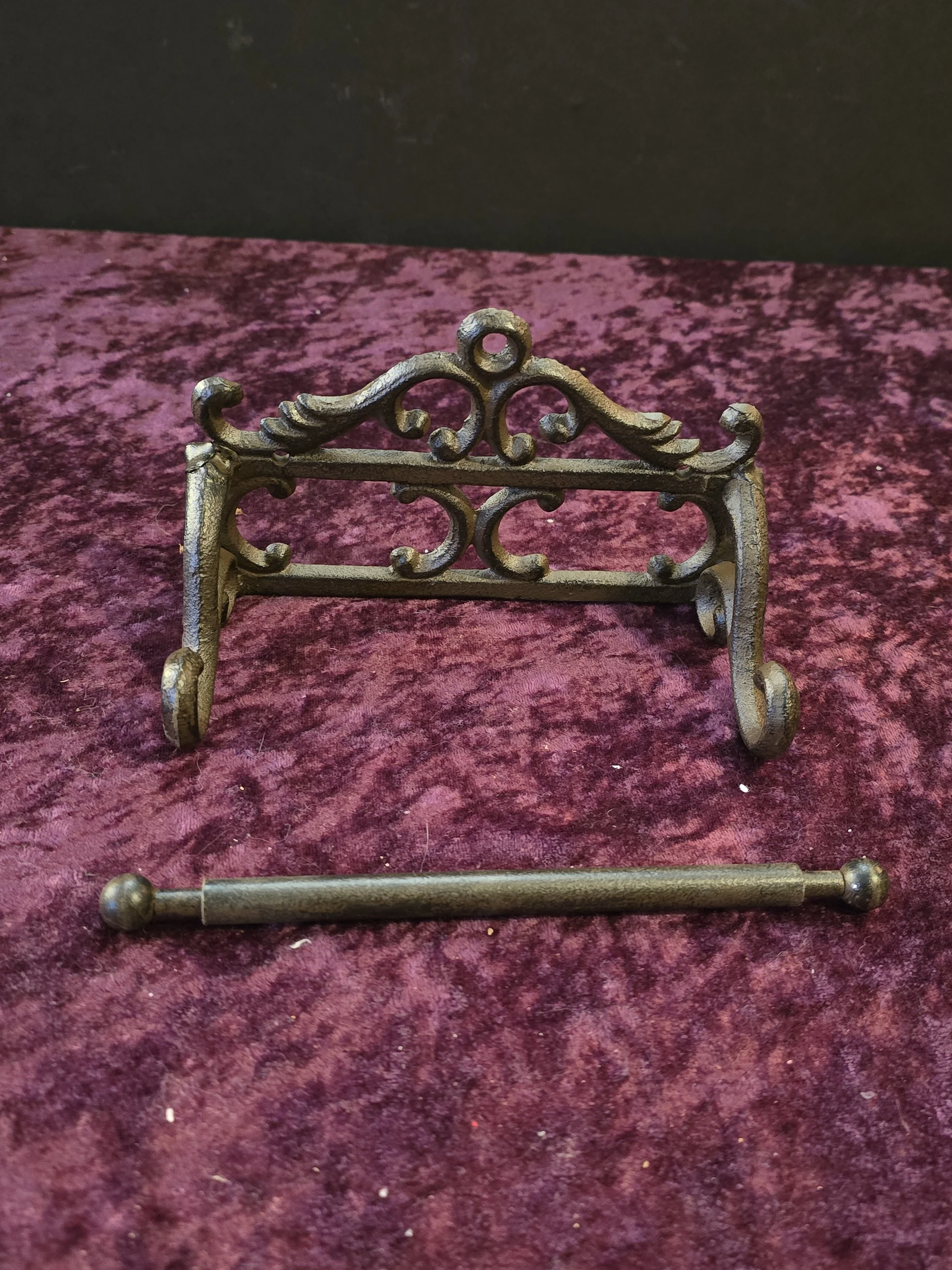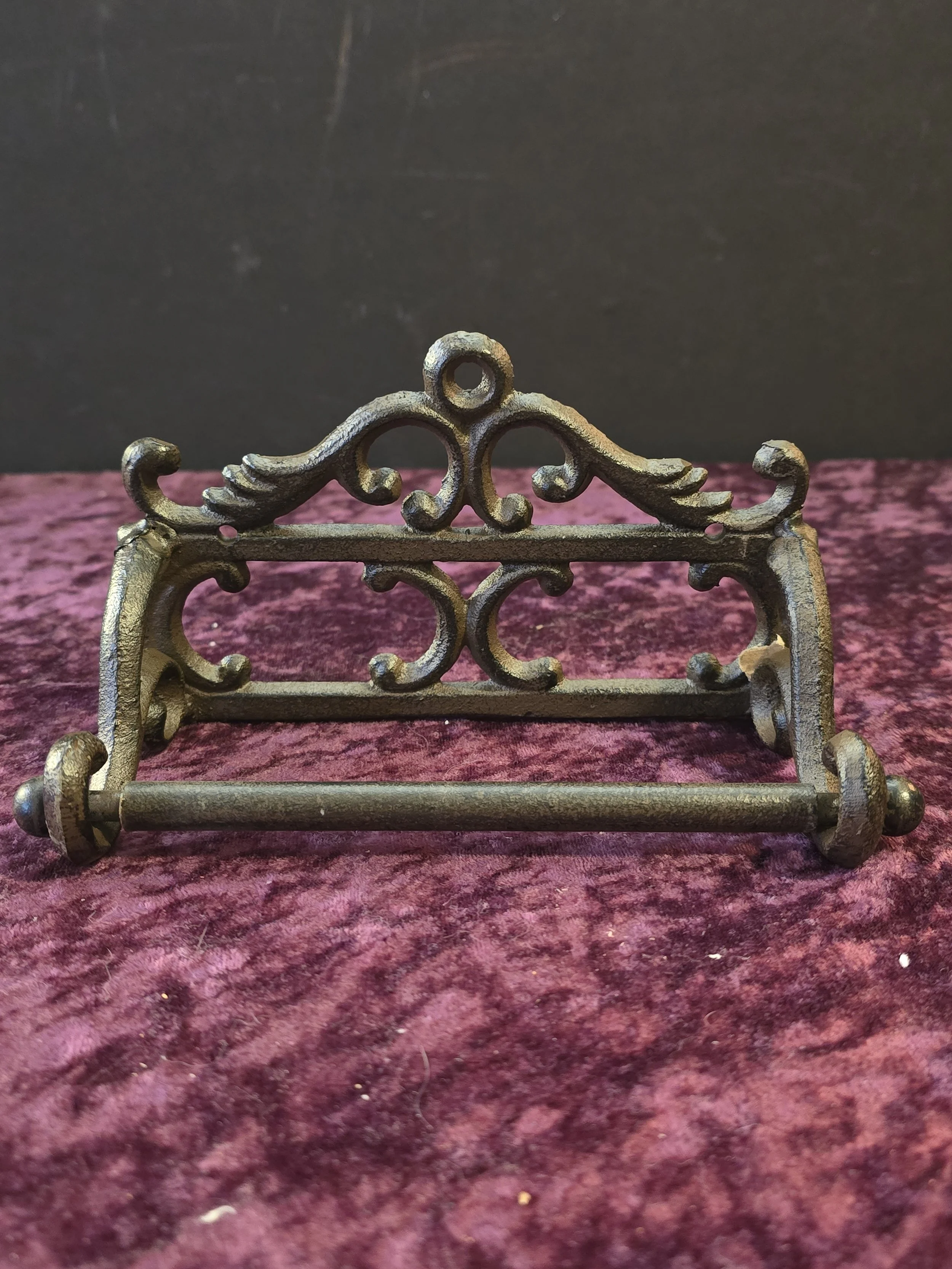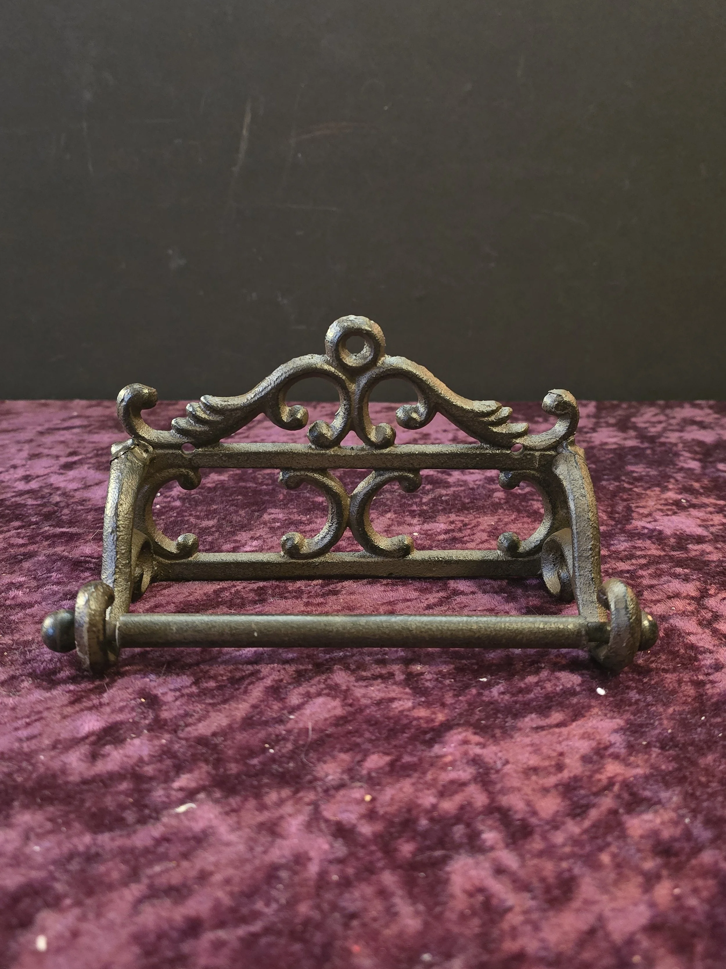 Cast iron holder for toilet paper with decorative scrollwork.