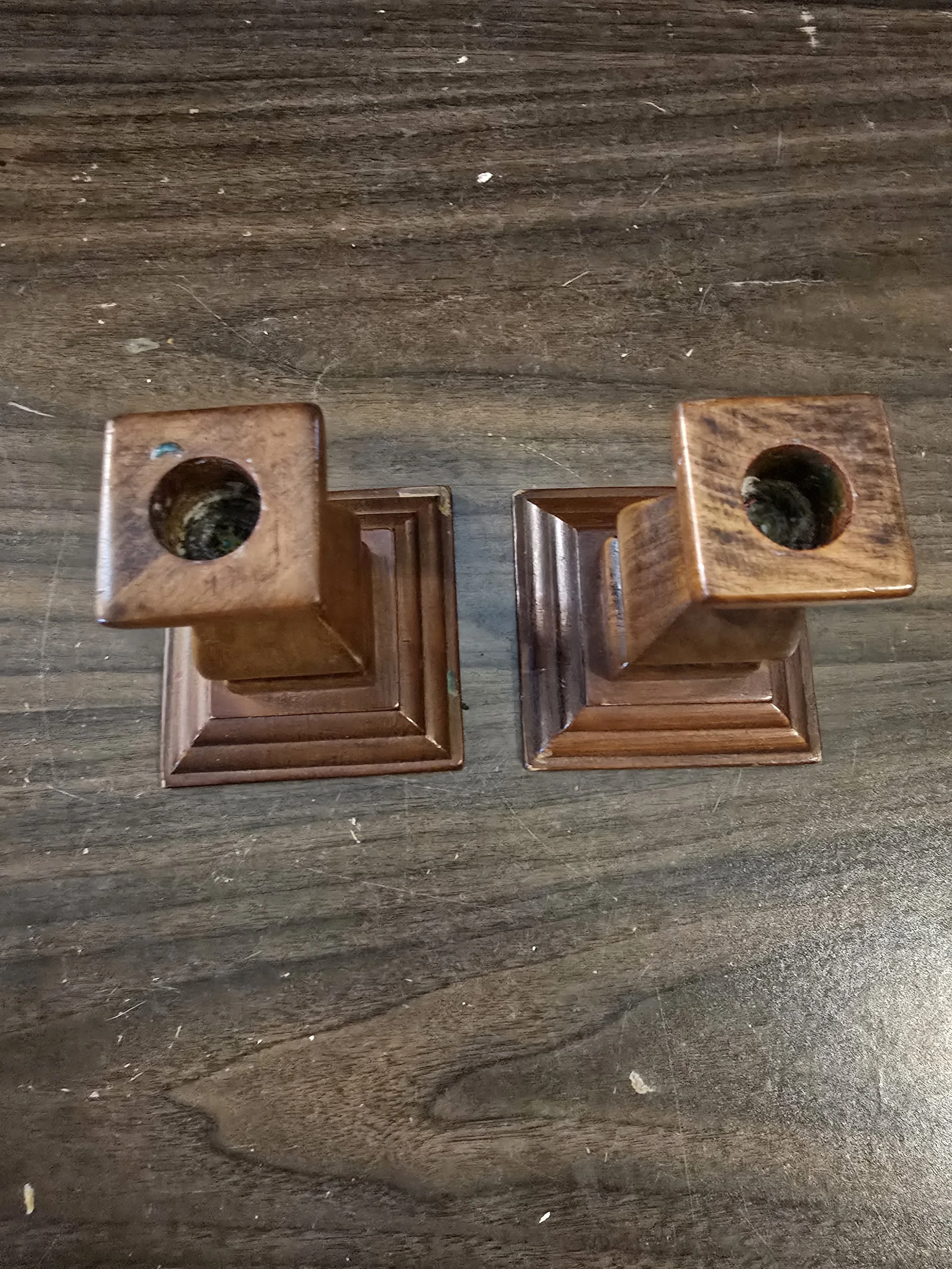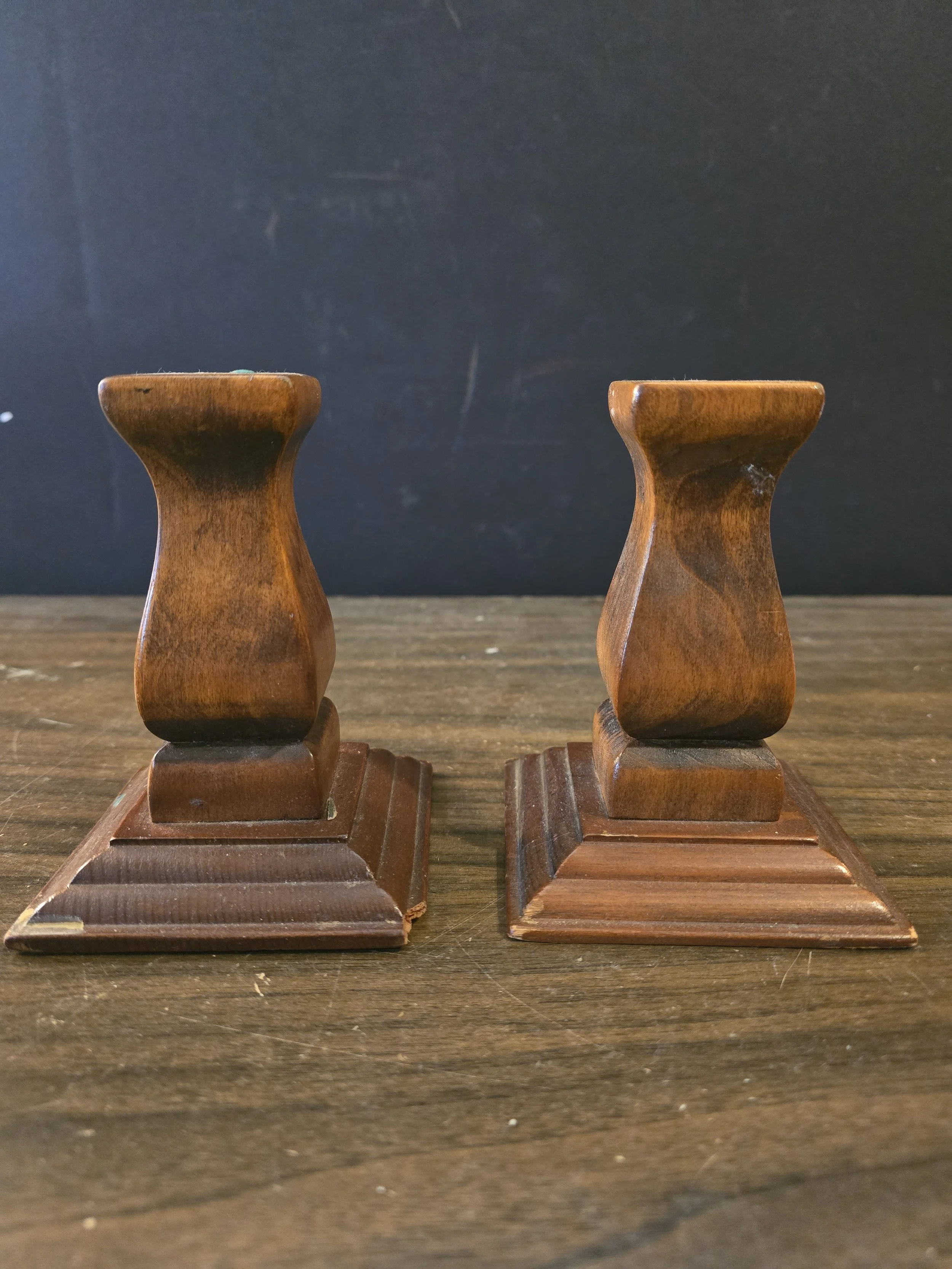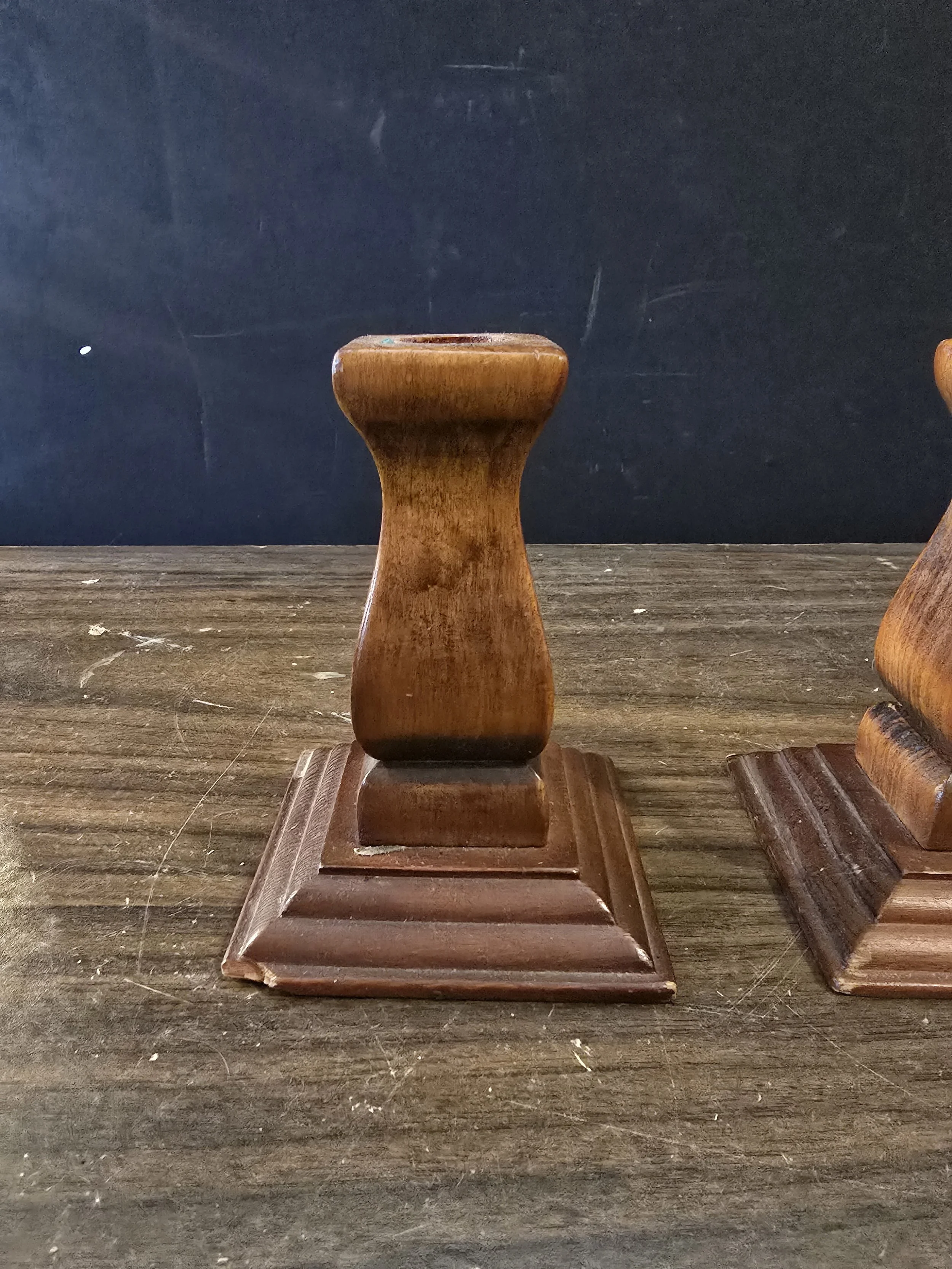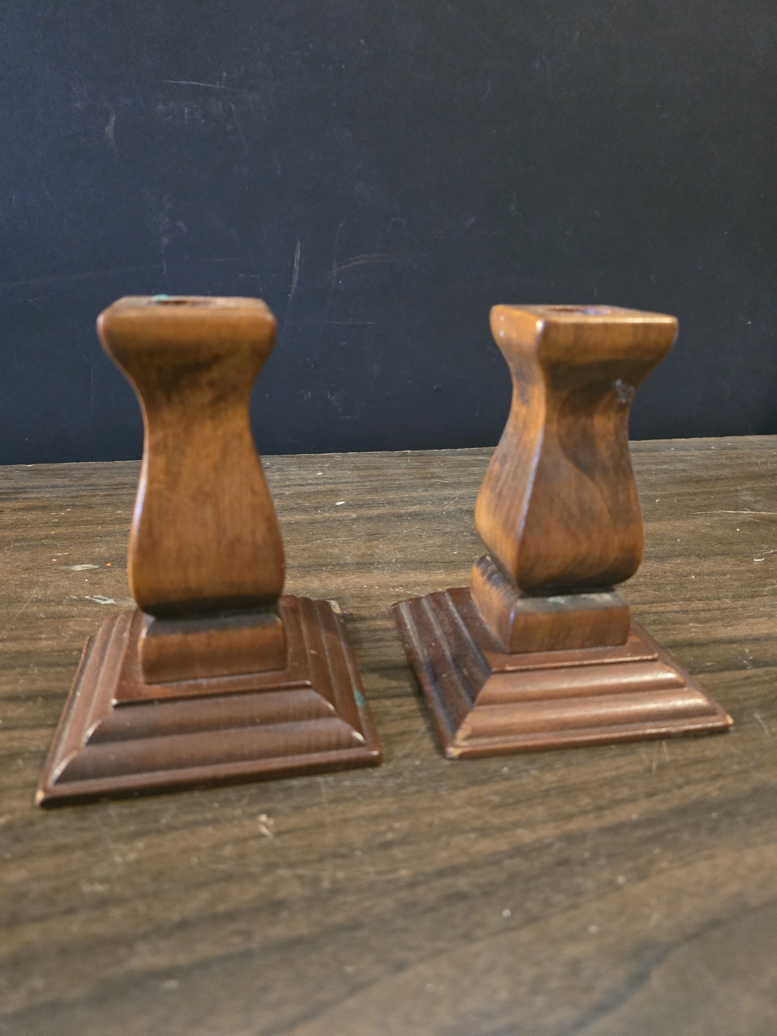 Cute pair of stained wood candleholders. There is a chip on one of the corners.