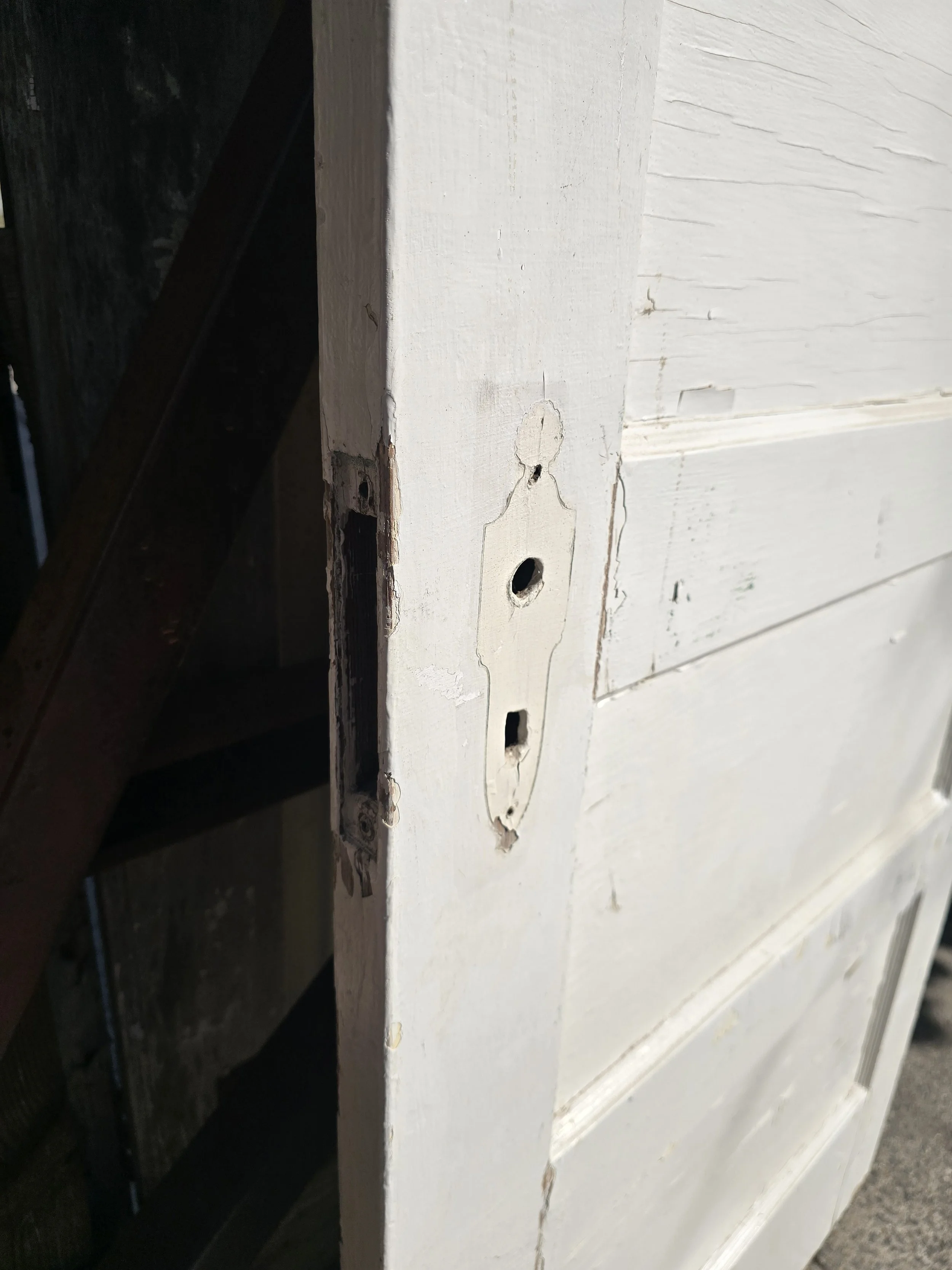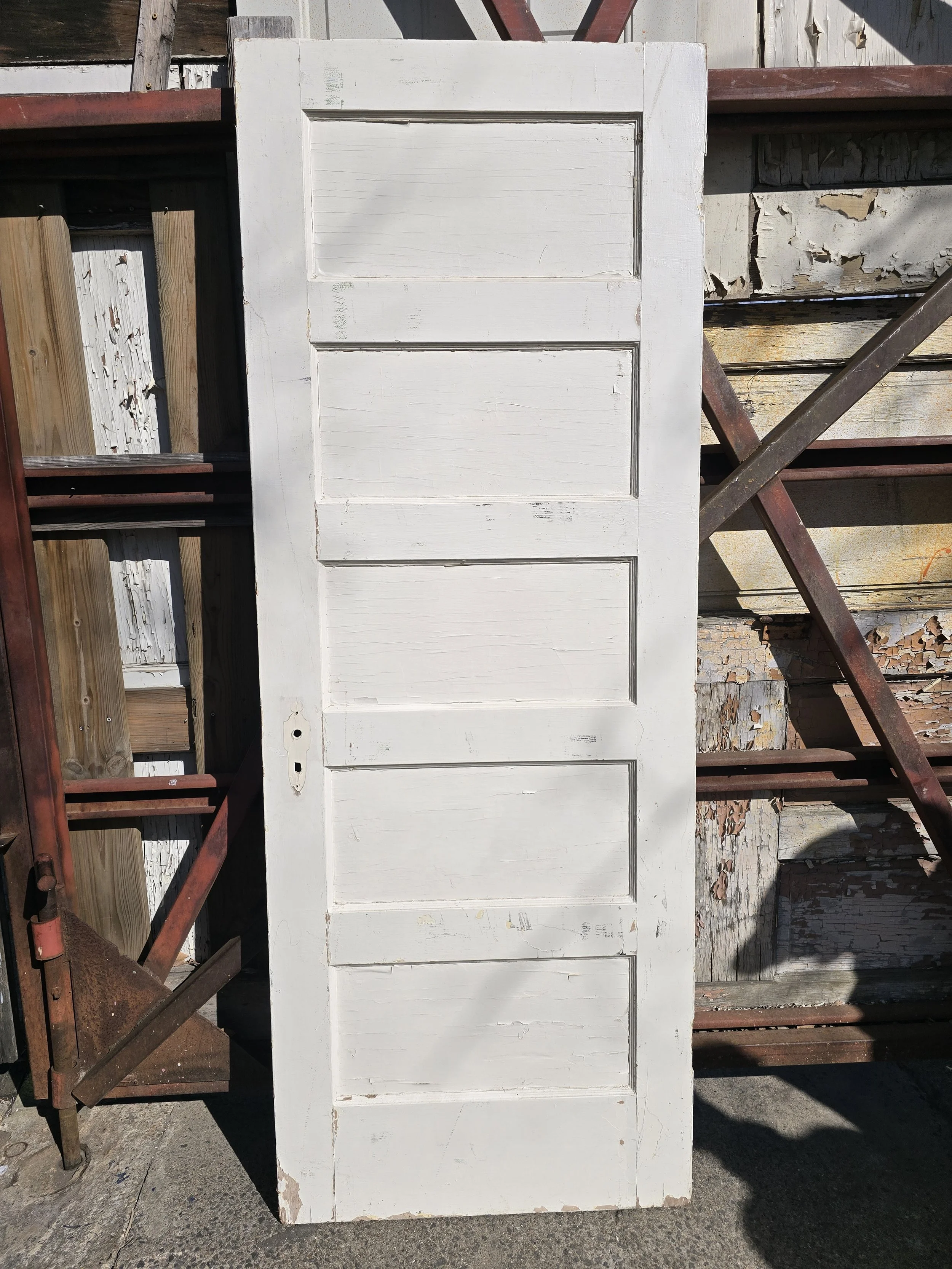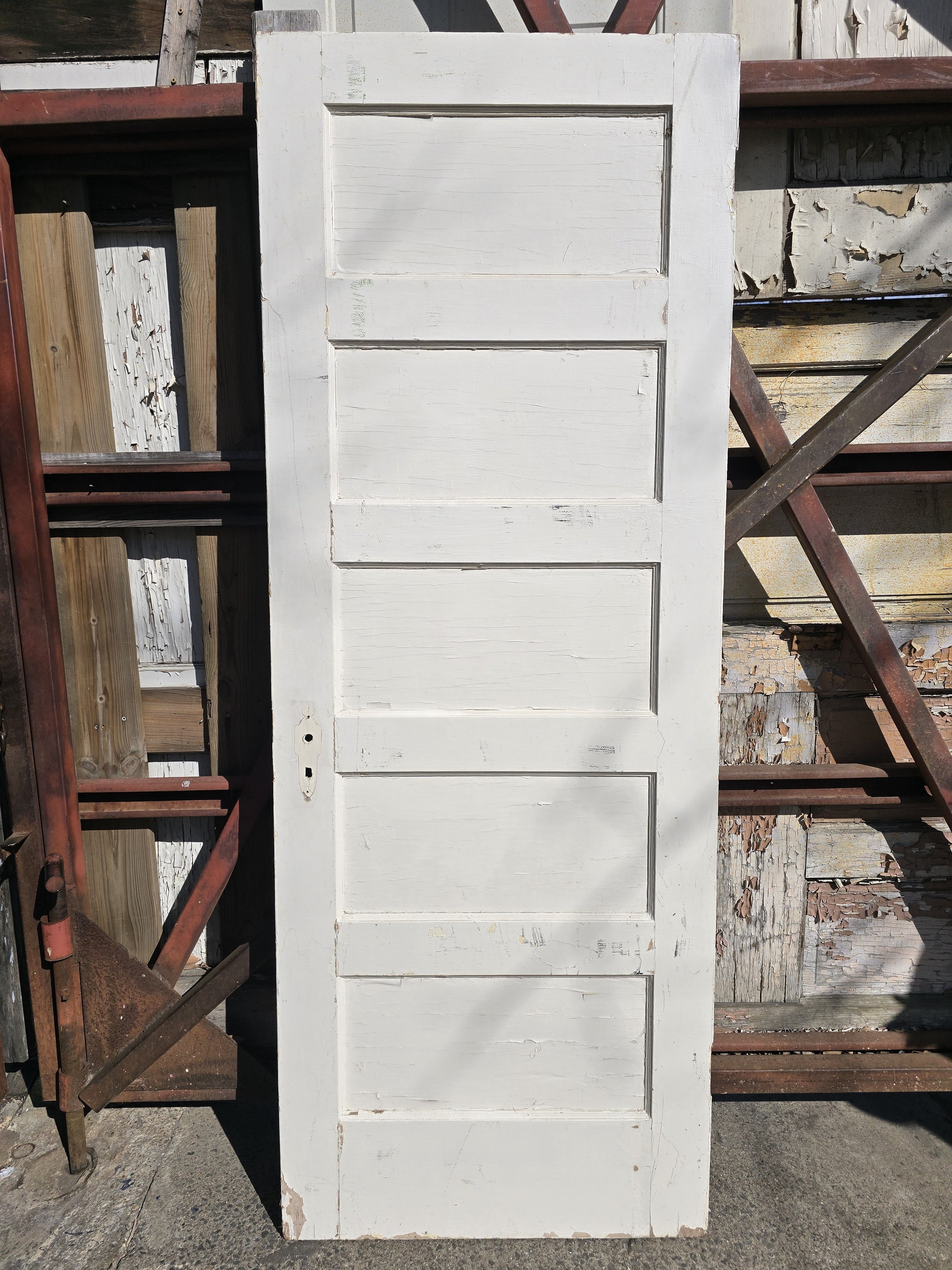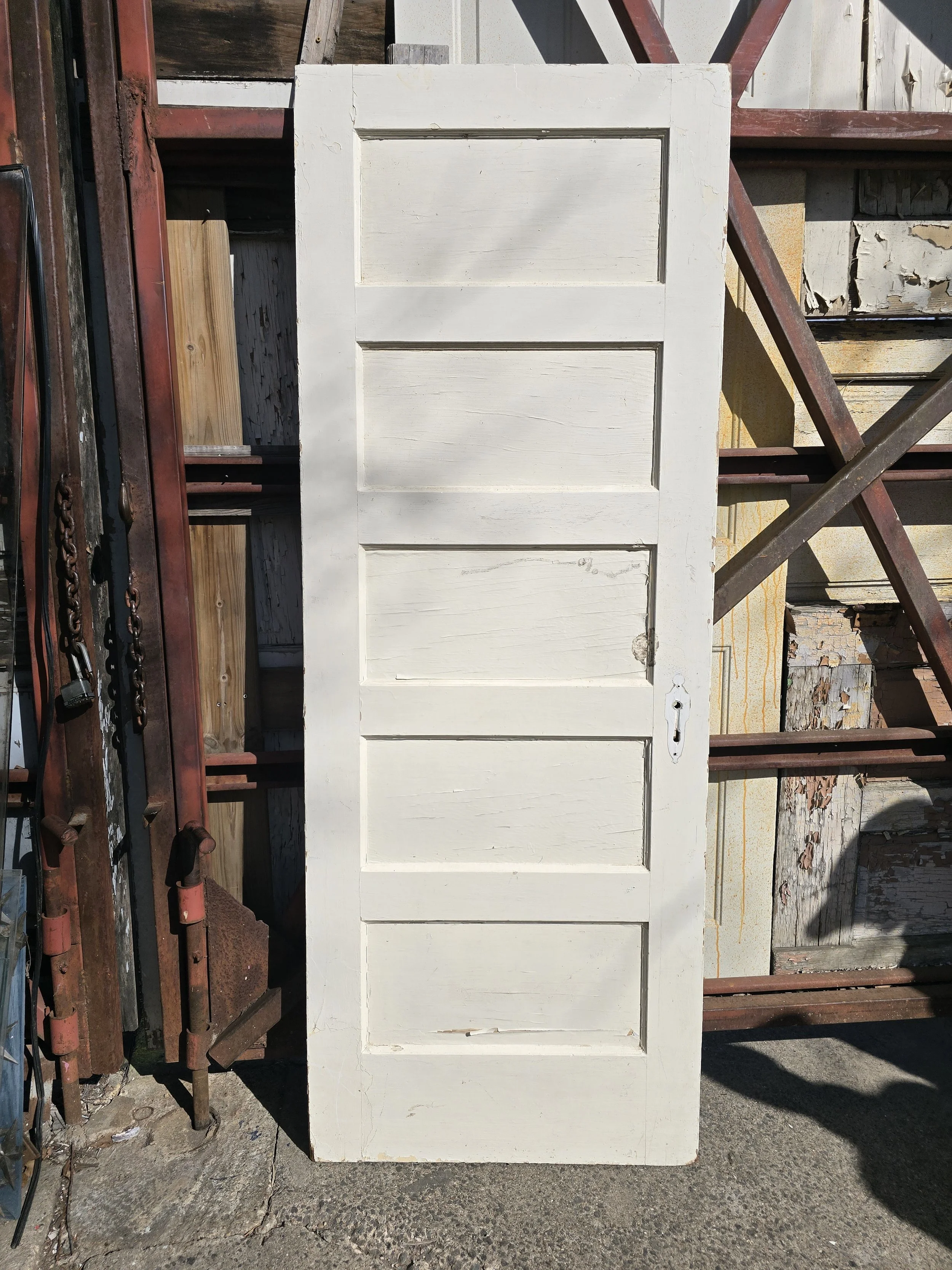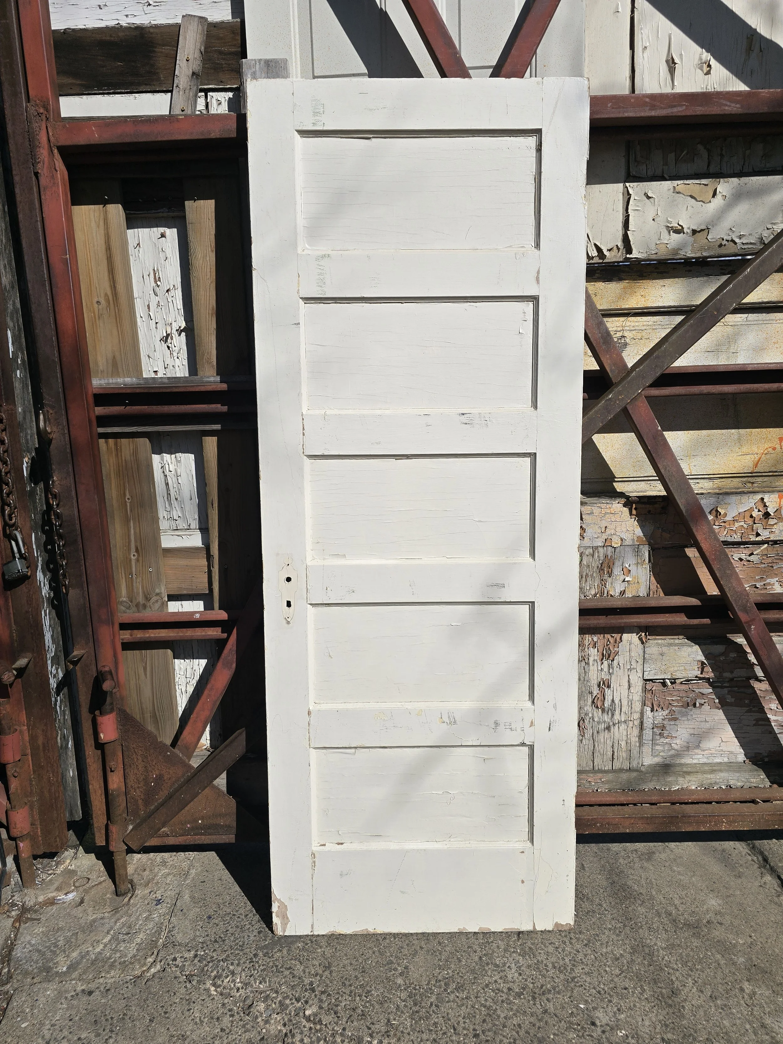 Solid wood 5 panel door. Cut for a mortise lock. The door is in pretty good condition for its age.