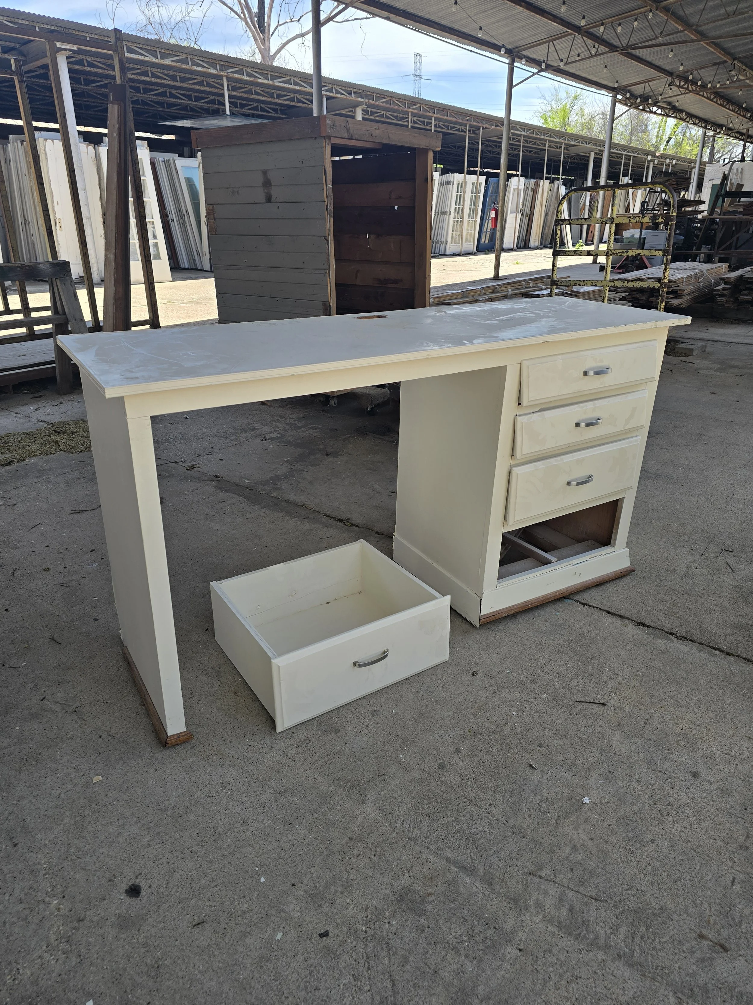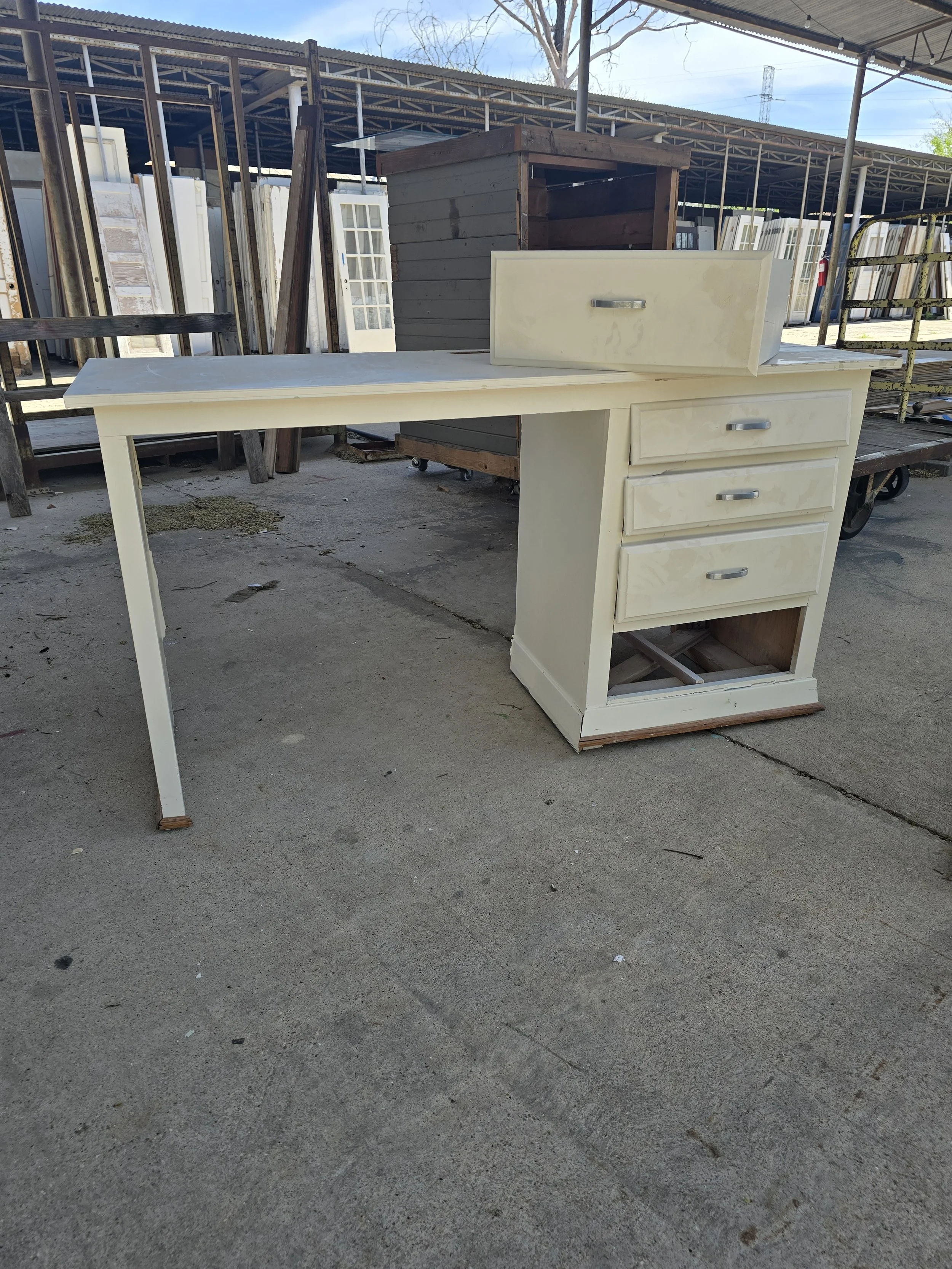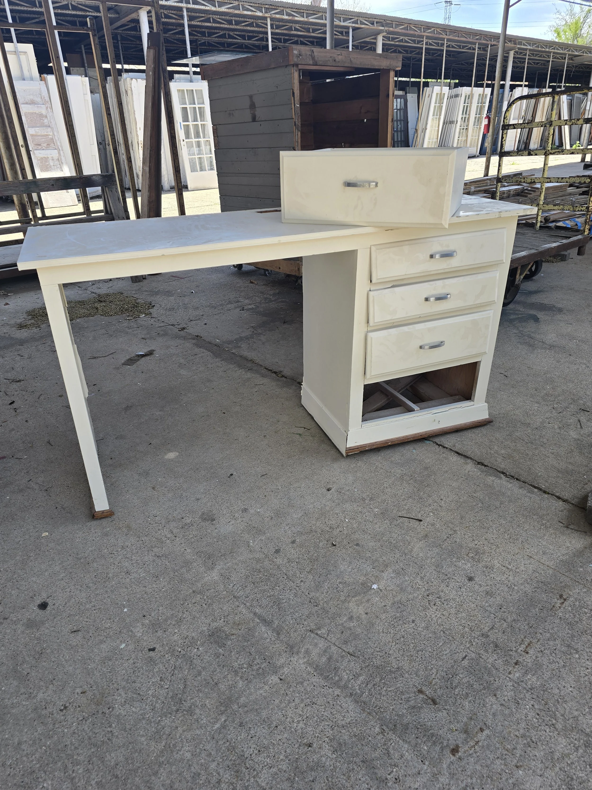 This is a project piece. The wood that builds the desk is in pretty good shape, but the drawers need help. There are no rails or runners for the drawers and the bottom drawer seems slightly too large to fit.