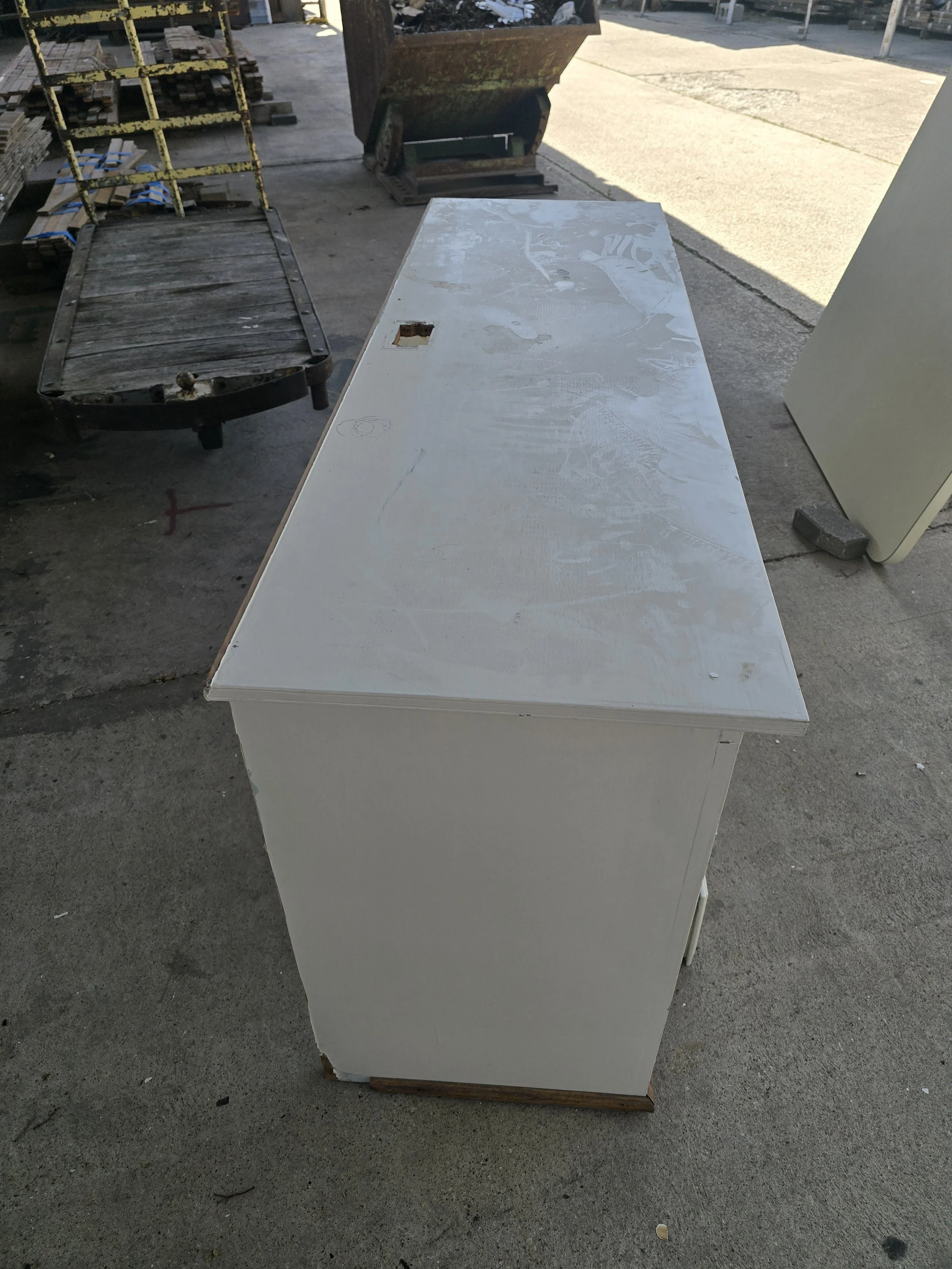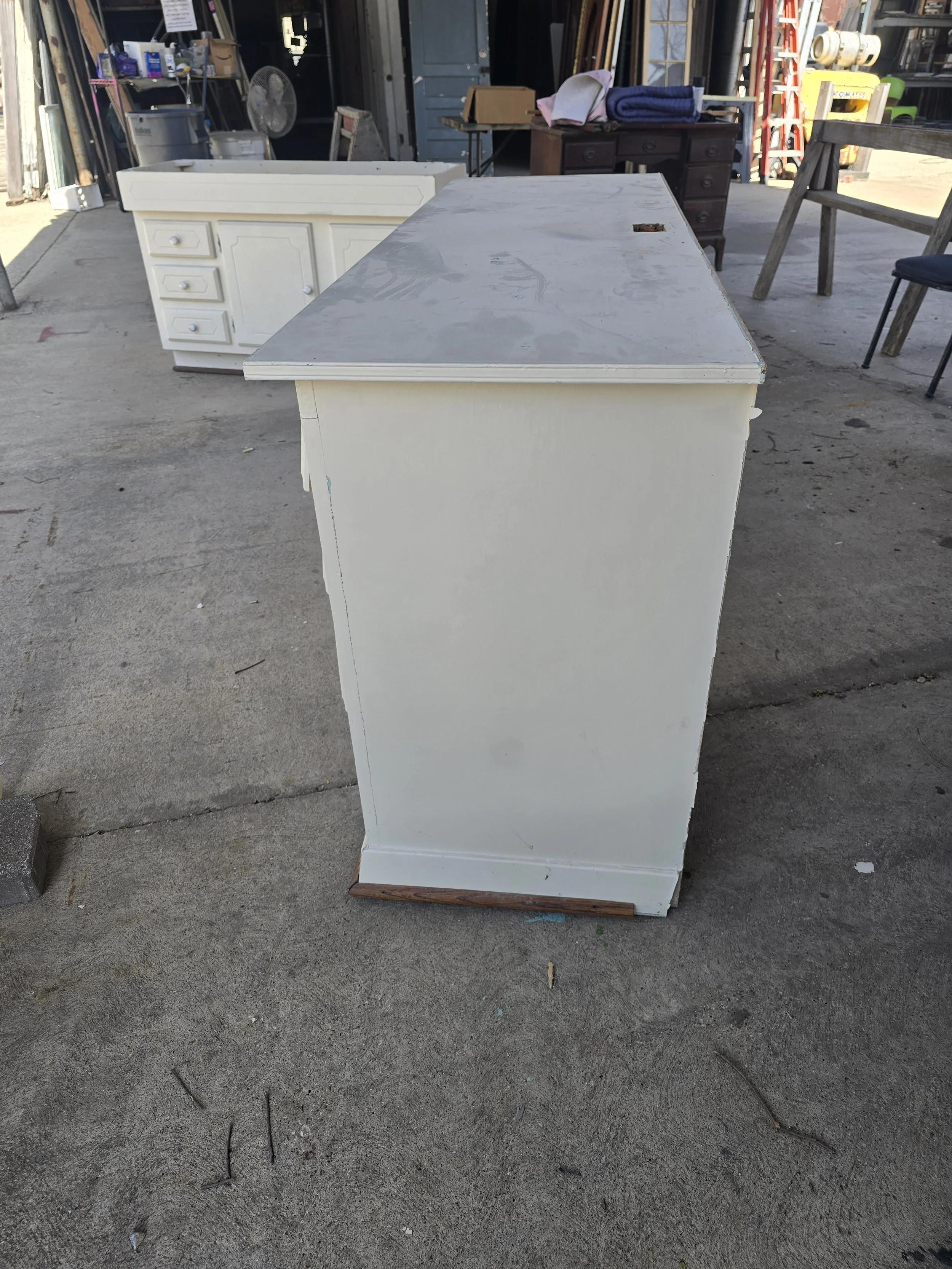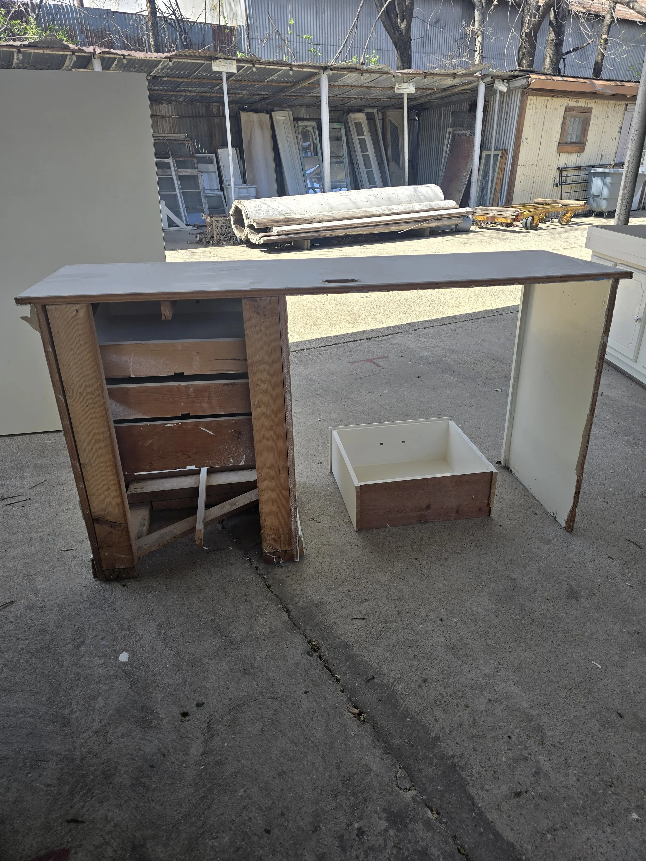 This is a project piece. The wood that builds the desk is in pretty good shape, but the drawers need help. There are no rails or runners for the drawers and the bottom drawer seems slightly too large to fit.