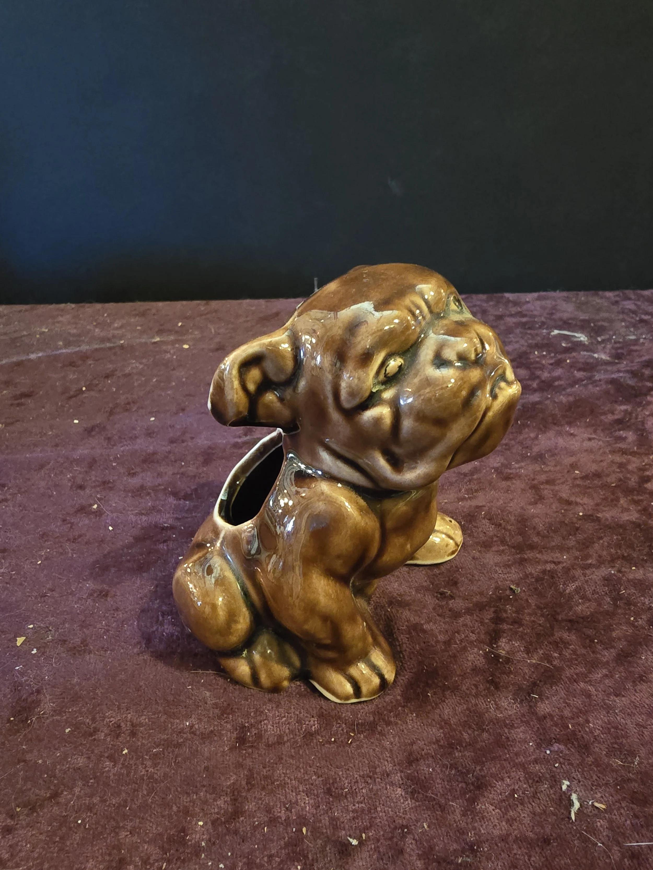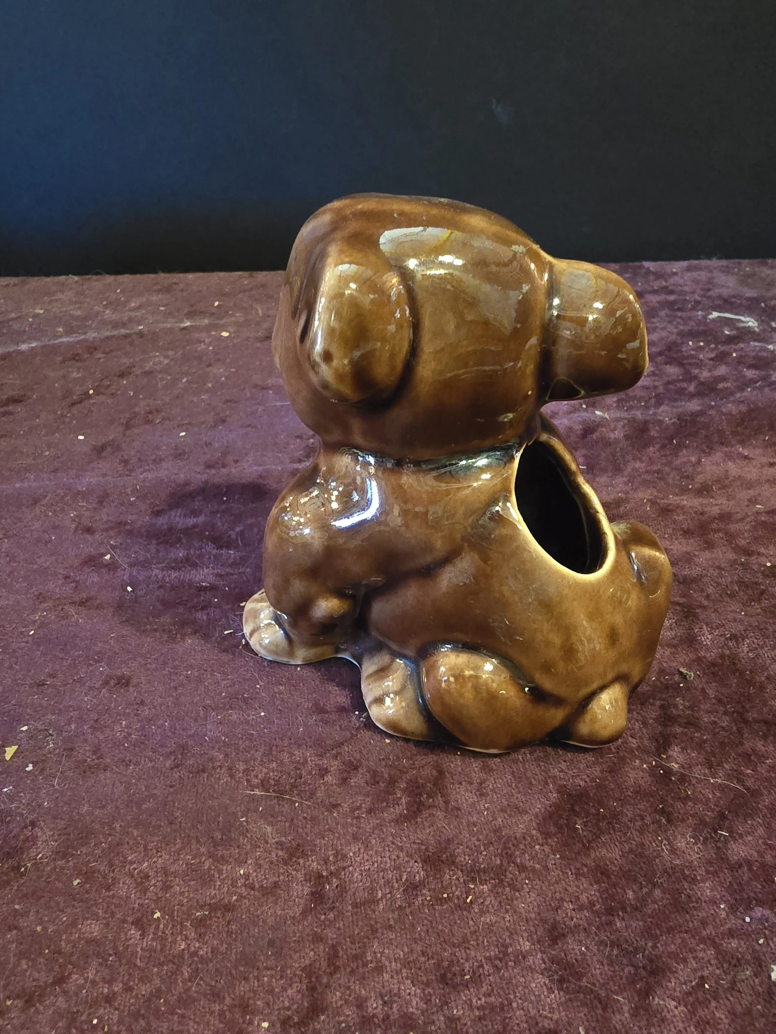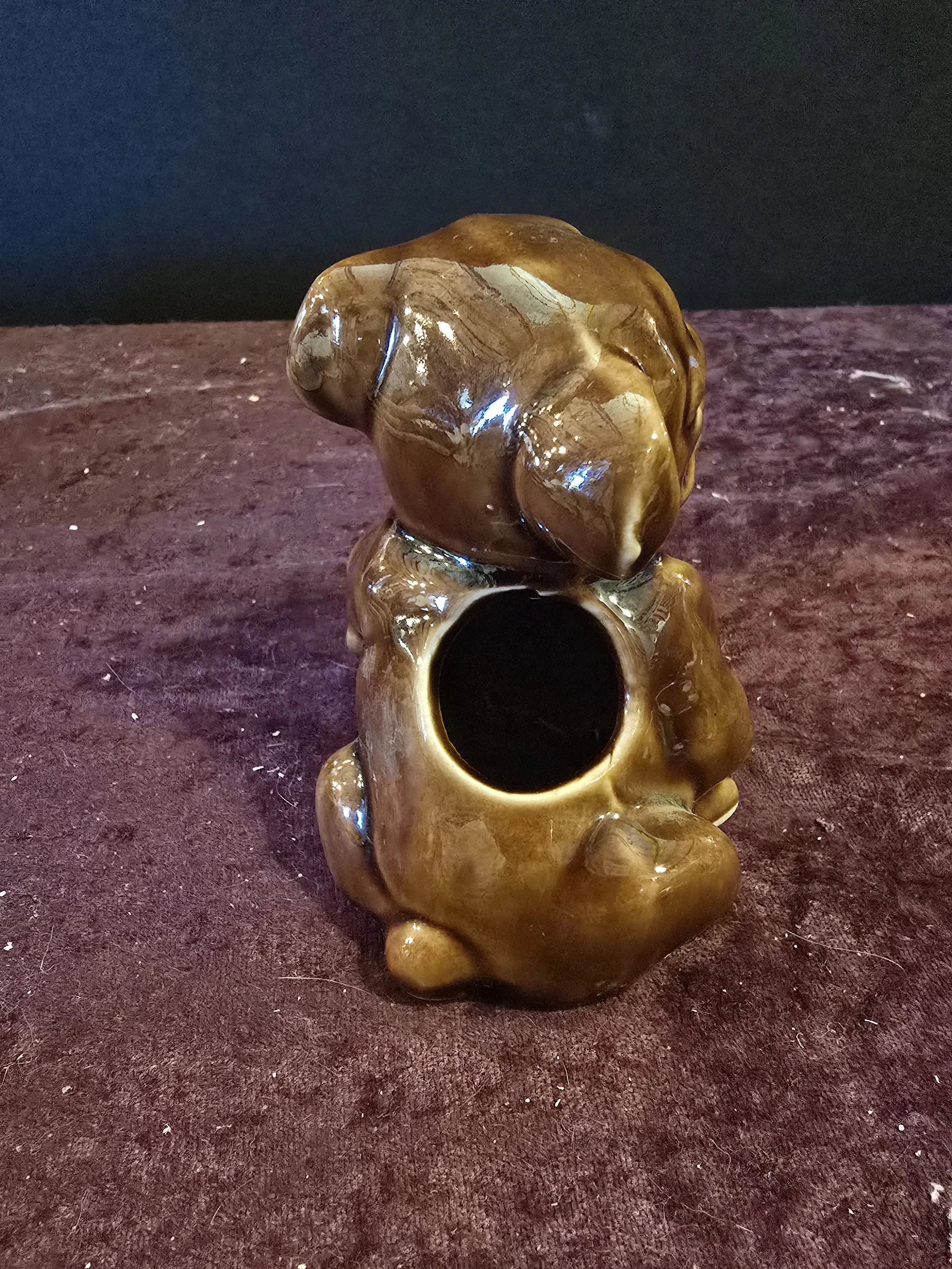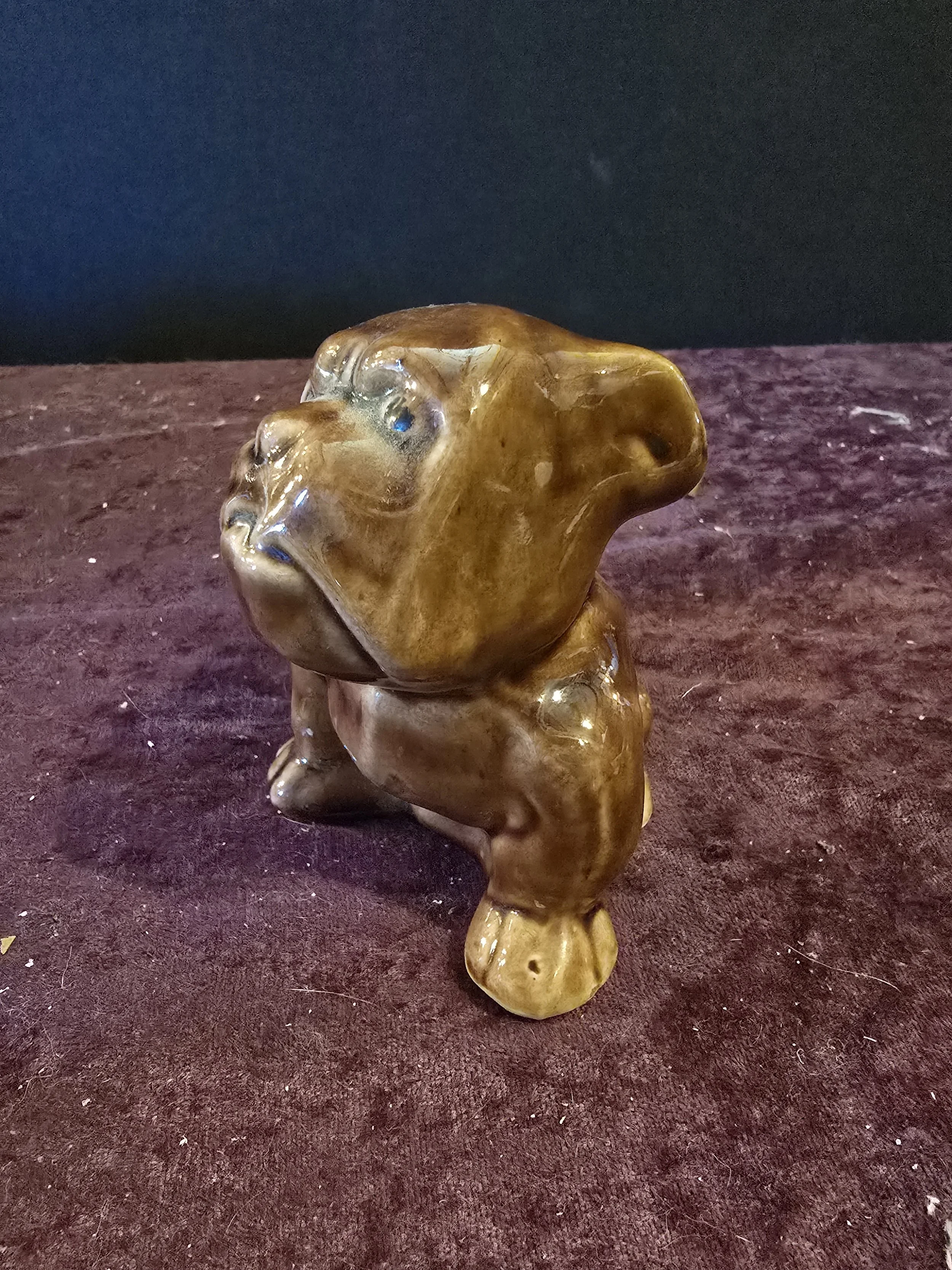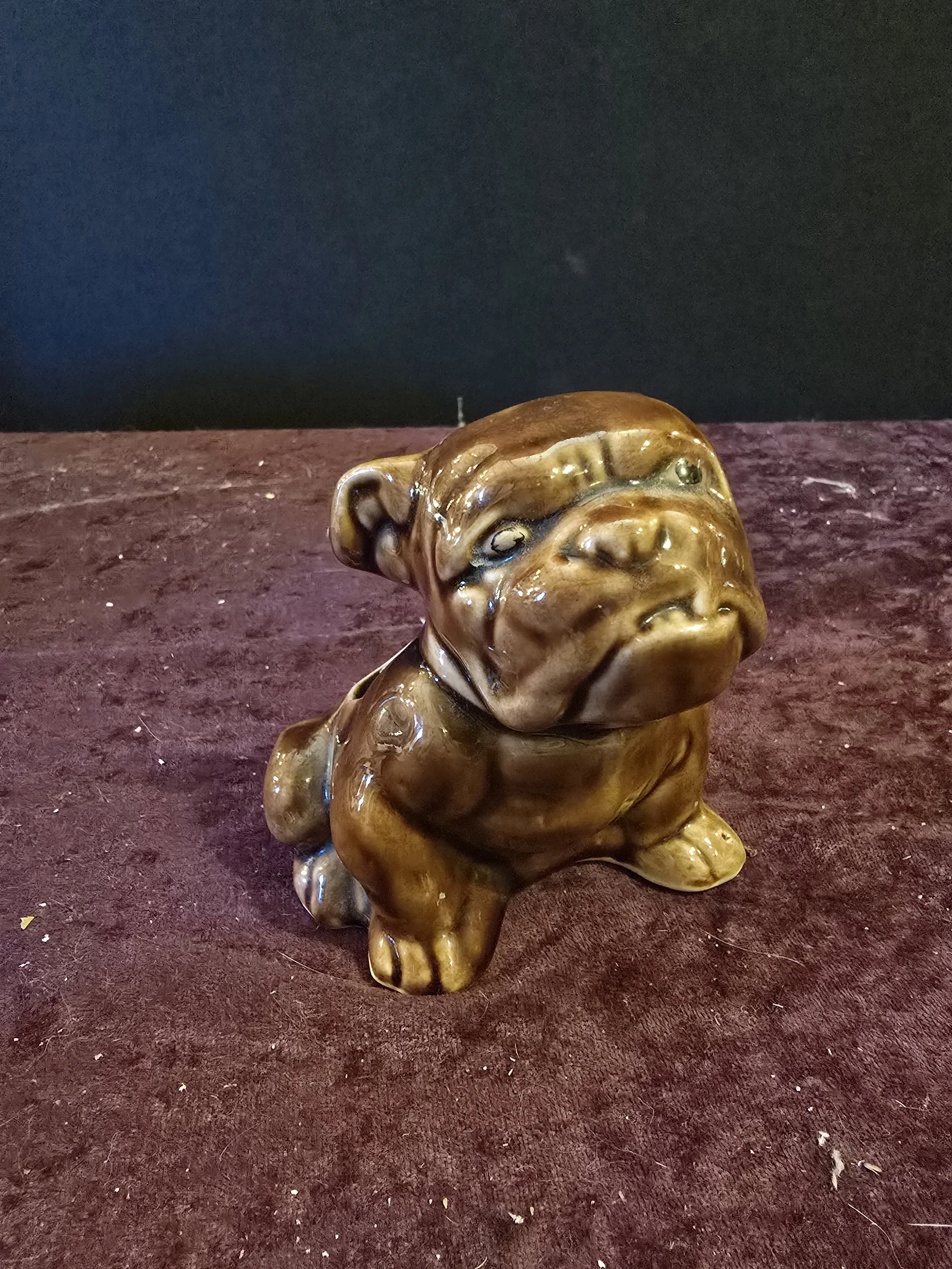 Made of ceramic. Woof Woof. This piece is 3.25” x 4” x 4”