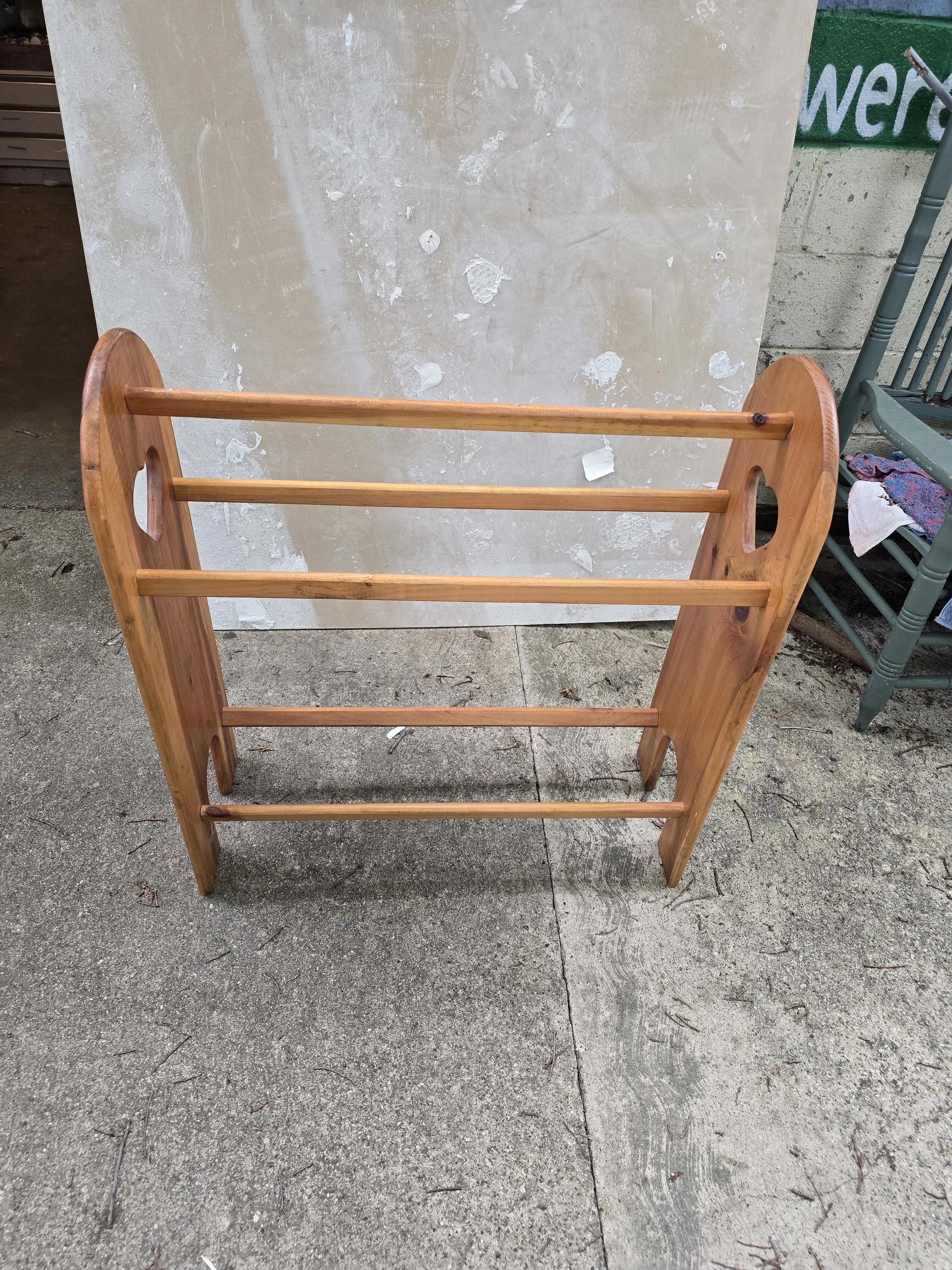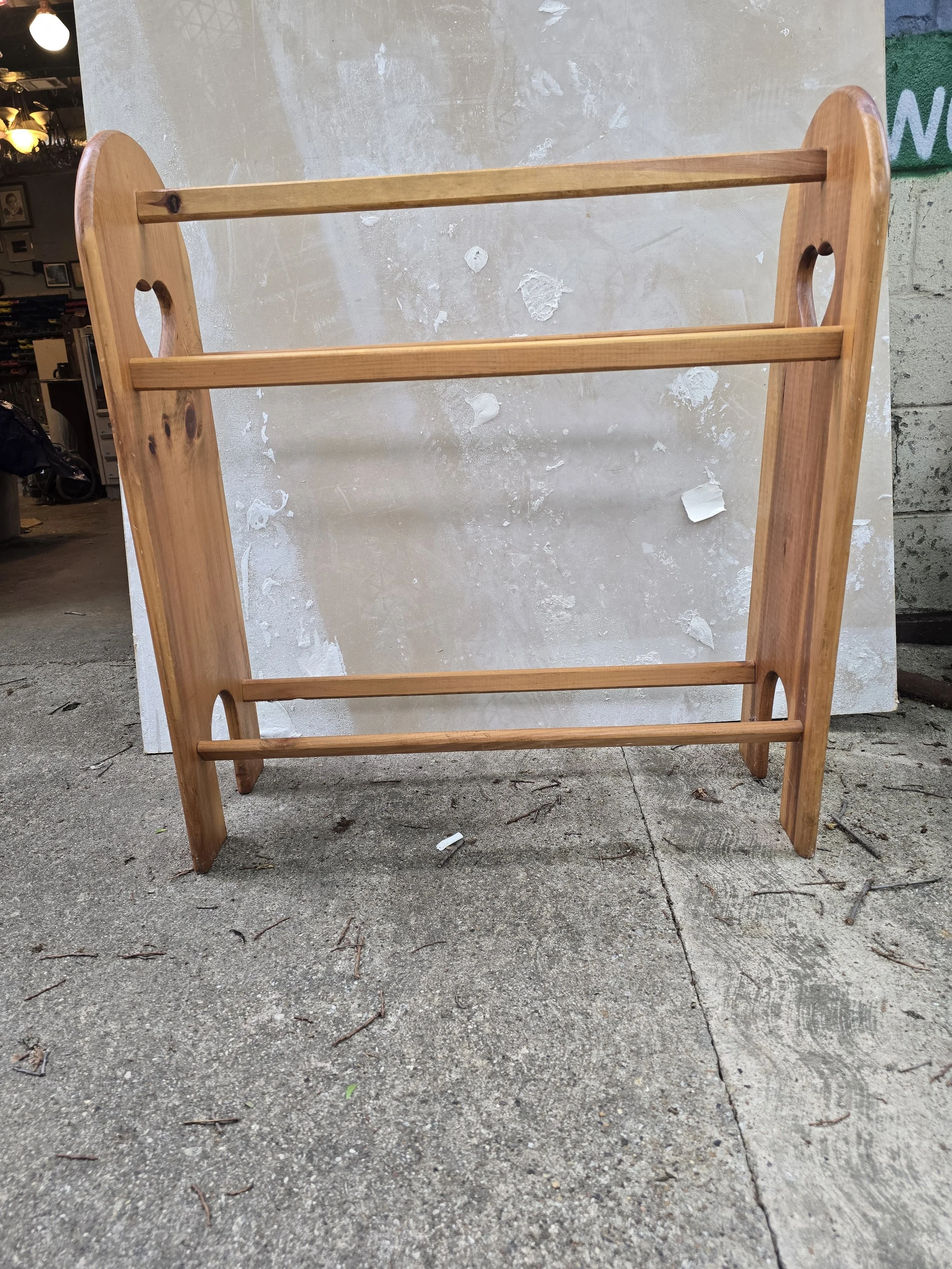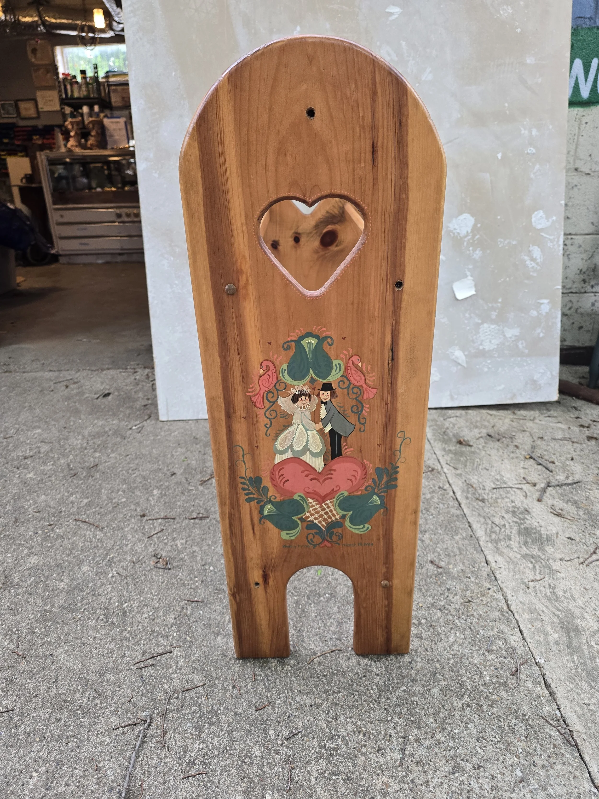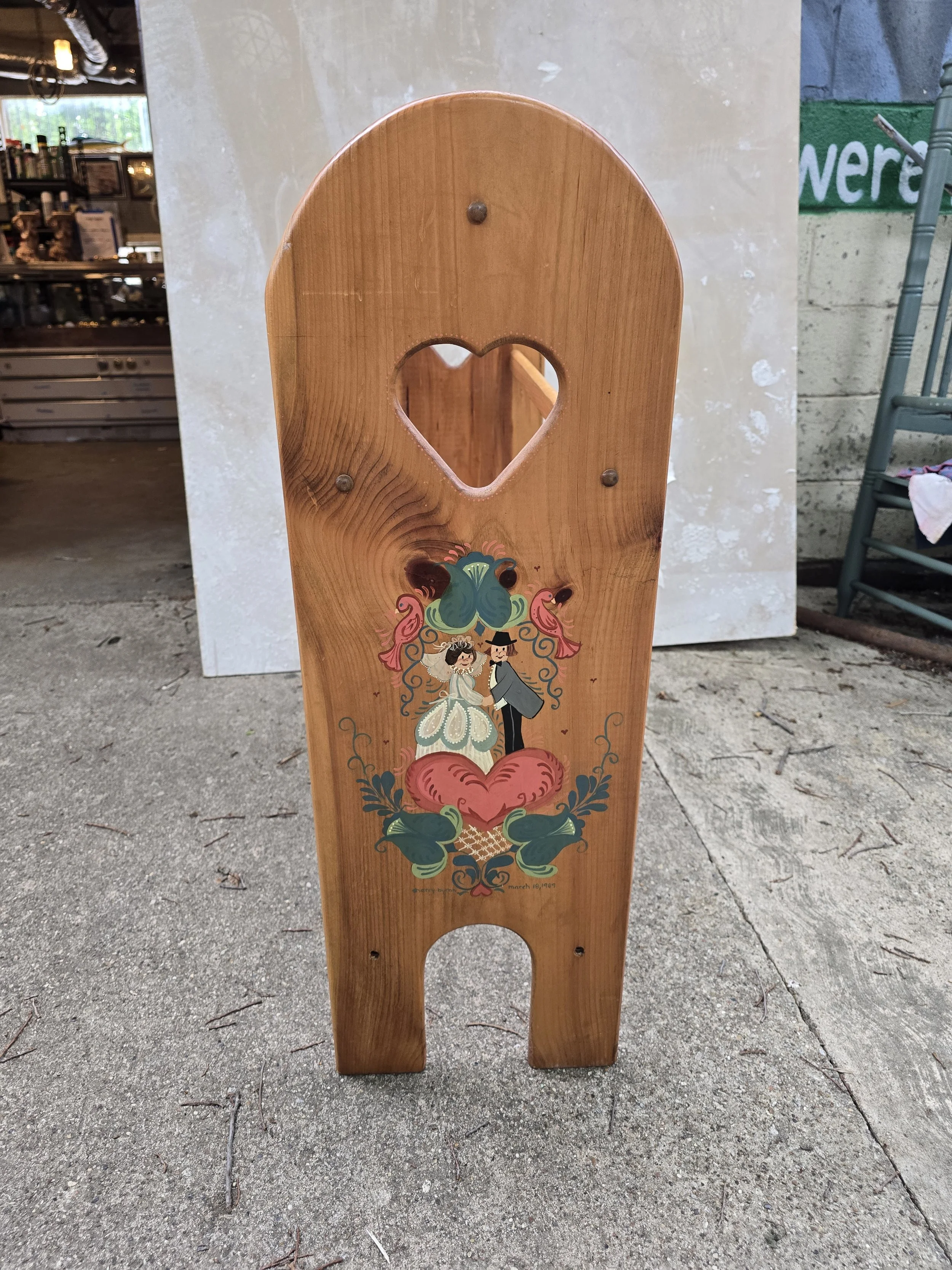 Vintage solid wood quilt or blanket rack. The sides of this rack have a heart shape cut out and a hand-painted bride and groom.