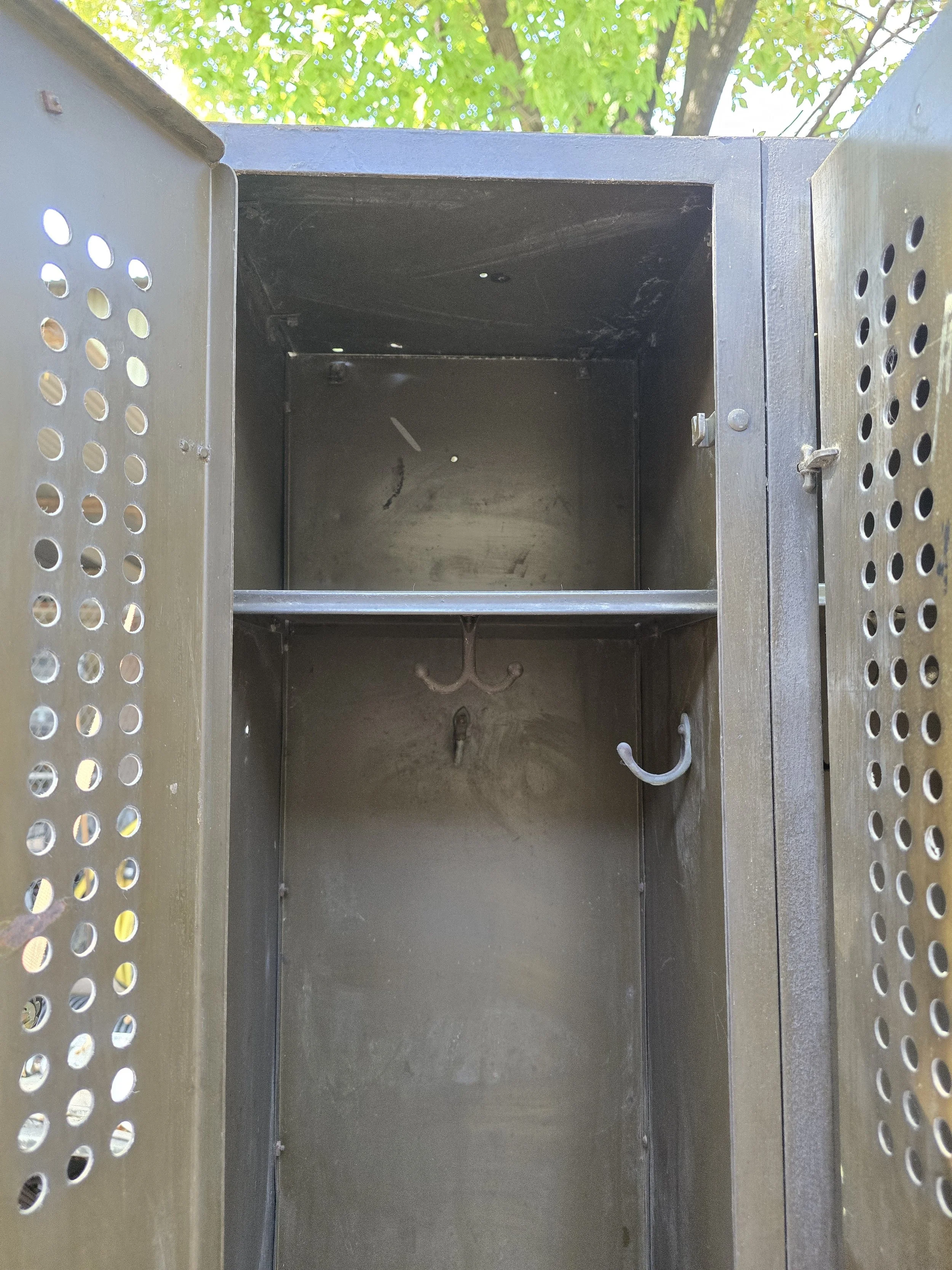 Okay look, While these lockers look cool in photos, they are even more rad in person. Like, so awesome even I am geeking out over them. My research deep dive had led me to believe they were produced by Terrell’s Steel Lockers out Grand Rapids Michigan pre WWI. That assumption is based off the hardware because it matches the ad from 1911. That being said, they were in business until at least the 1950s, so take with that what you. All of the (original) hardware functions exactly as it should. The doors are properly lined up and nothing is sticking or making that awful metal on metal noise. Basically, who ever ends up with these is someone who has fabulous taste and is very lucky. Semi related, Rejuvenation has a single unit listed for $800, which I suppose should not shock me, yet it does. Lockers are 35 7/8” wide x 12” deep x 66 1/8” tall