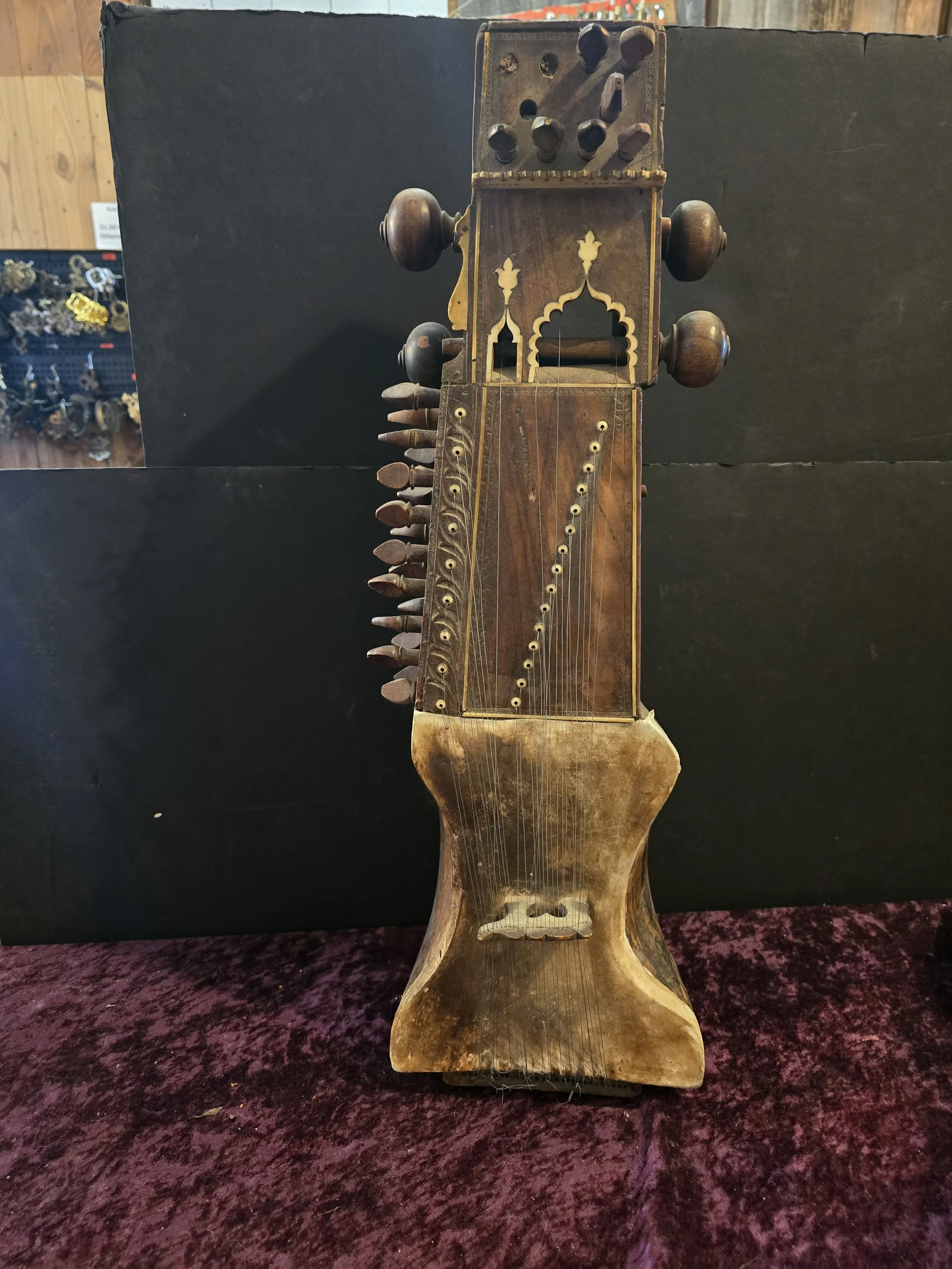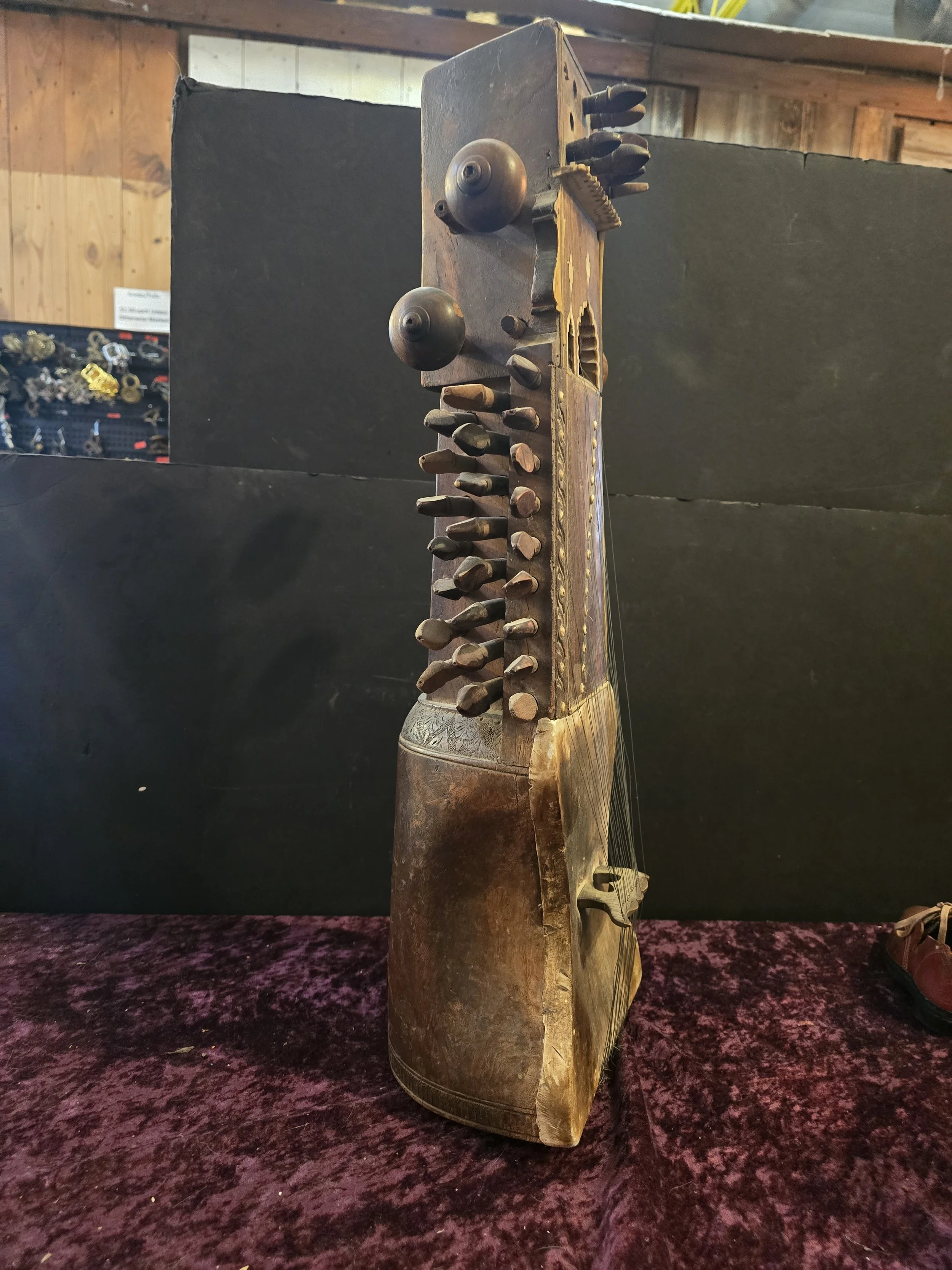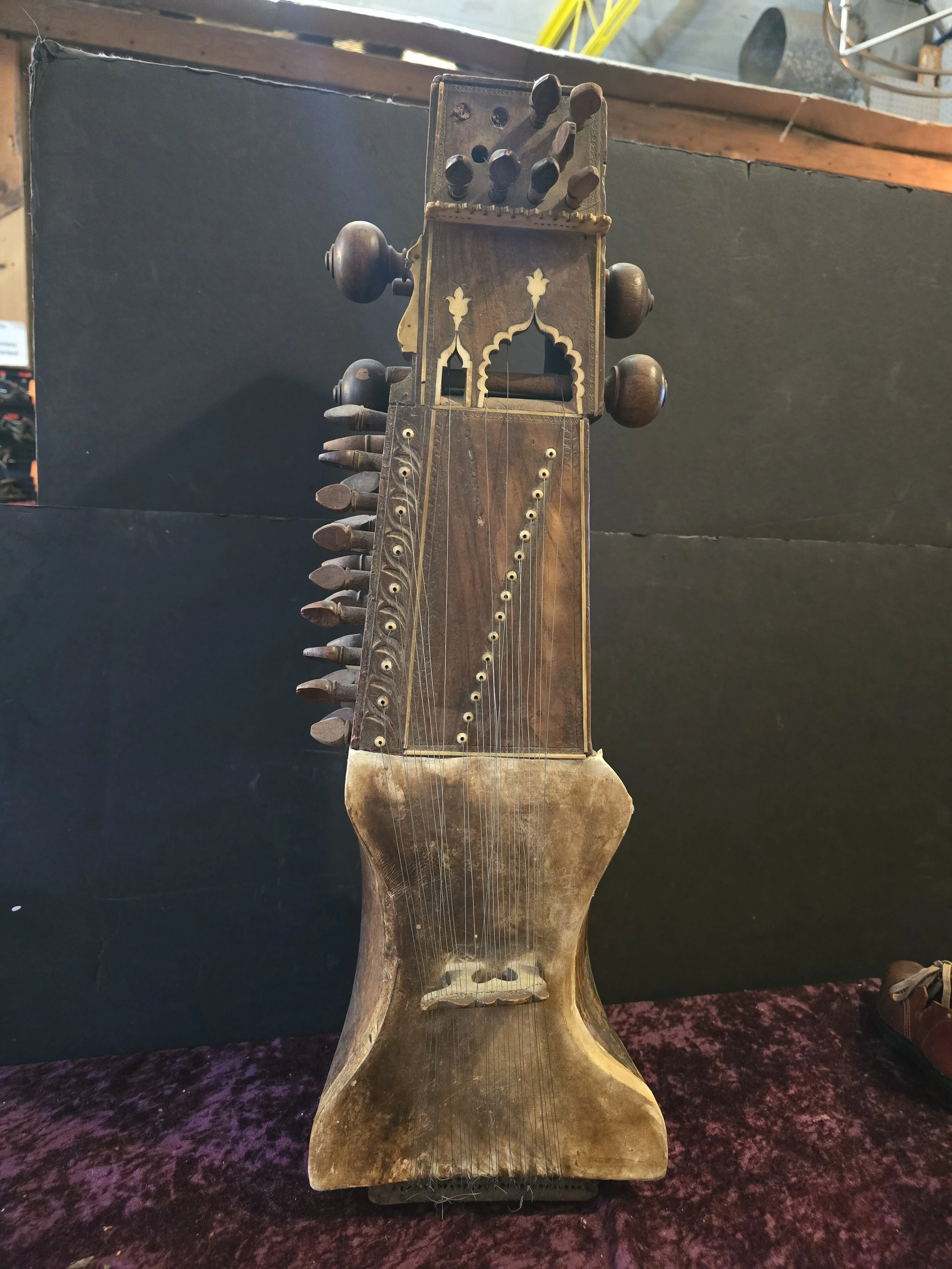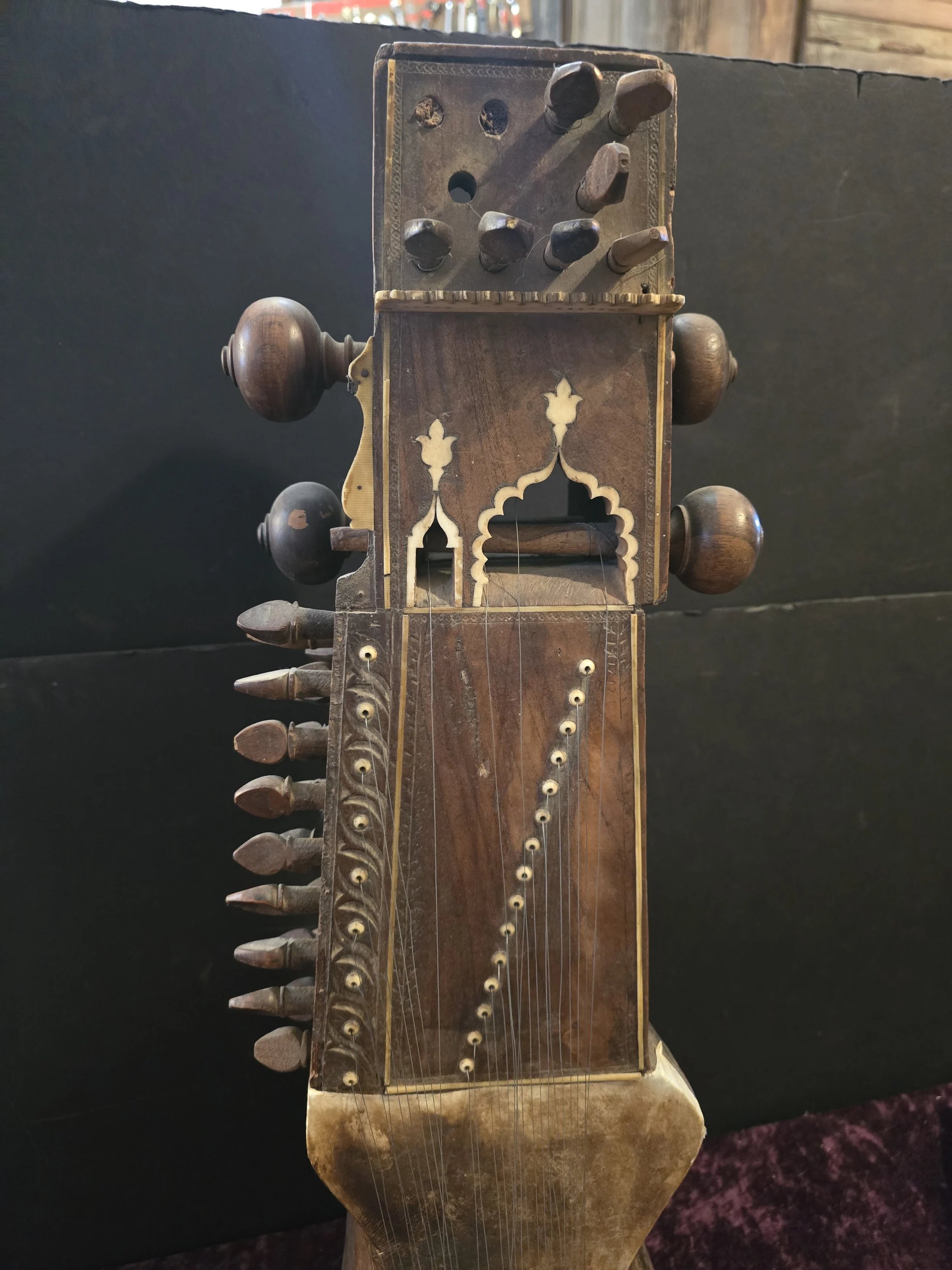 Carved wooden Sarangi, which is an Indian stringed instrument played with a bow. The details on this pieces are beautiful.