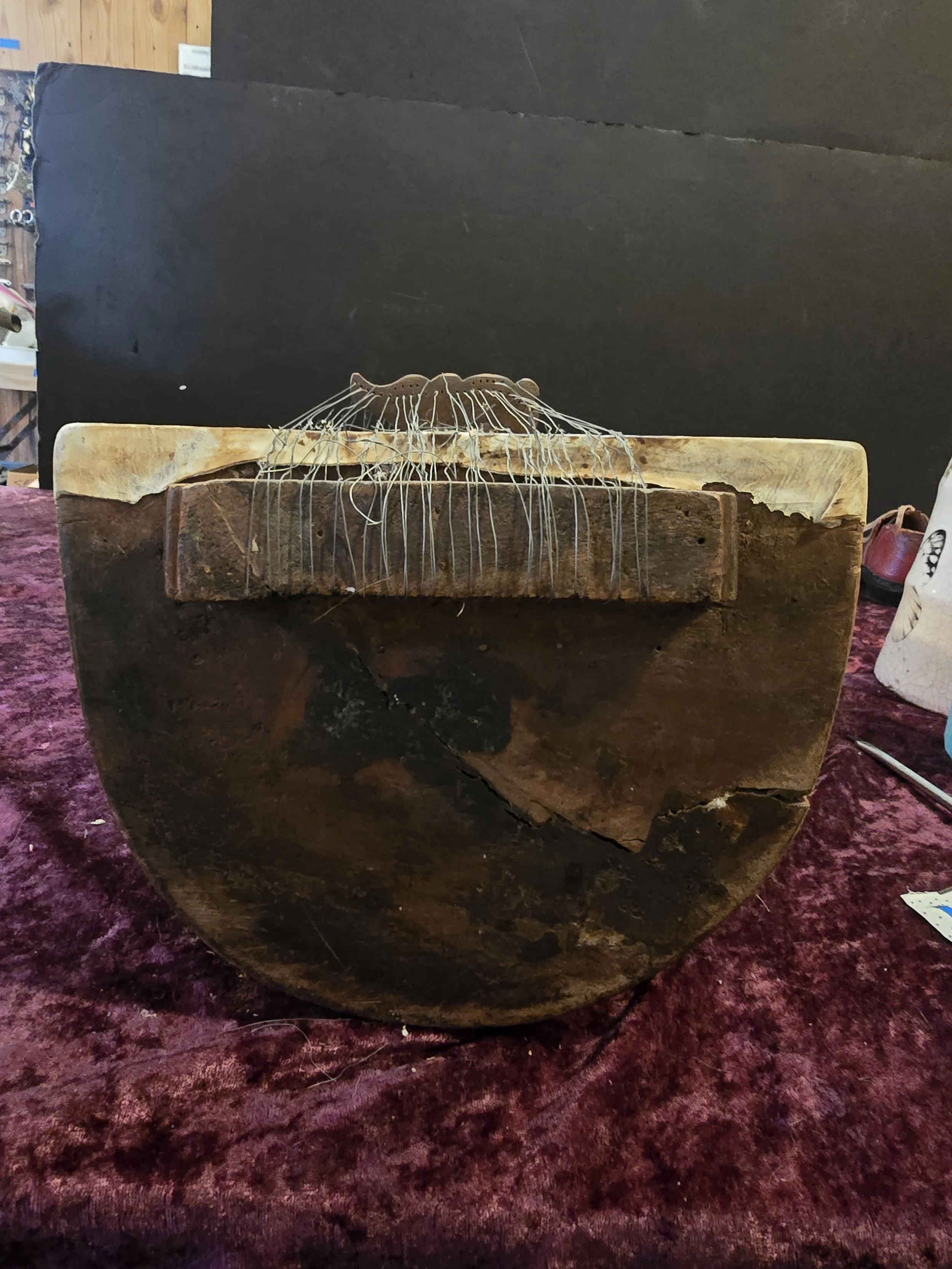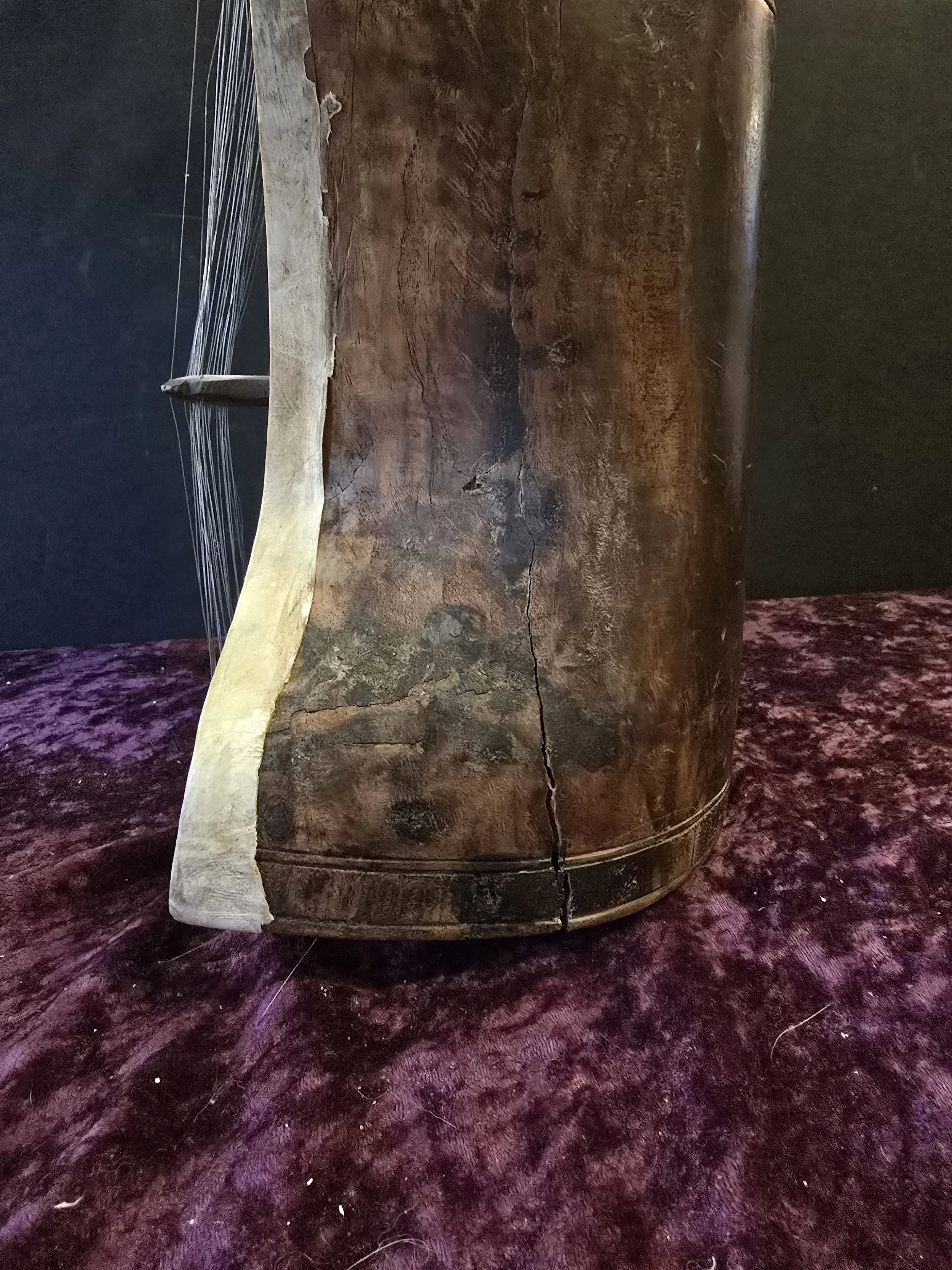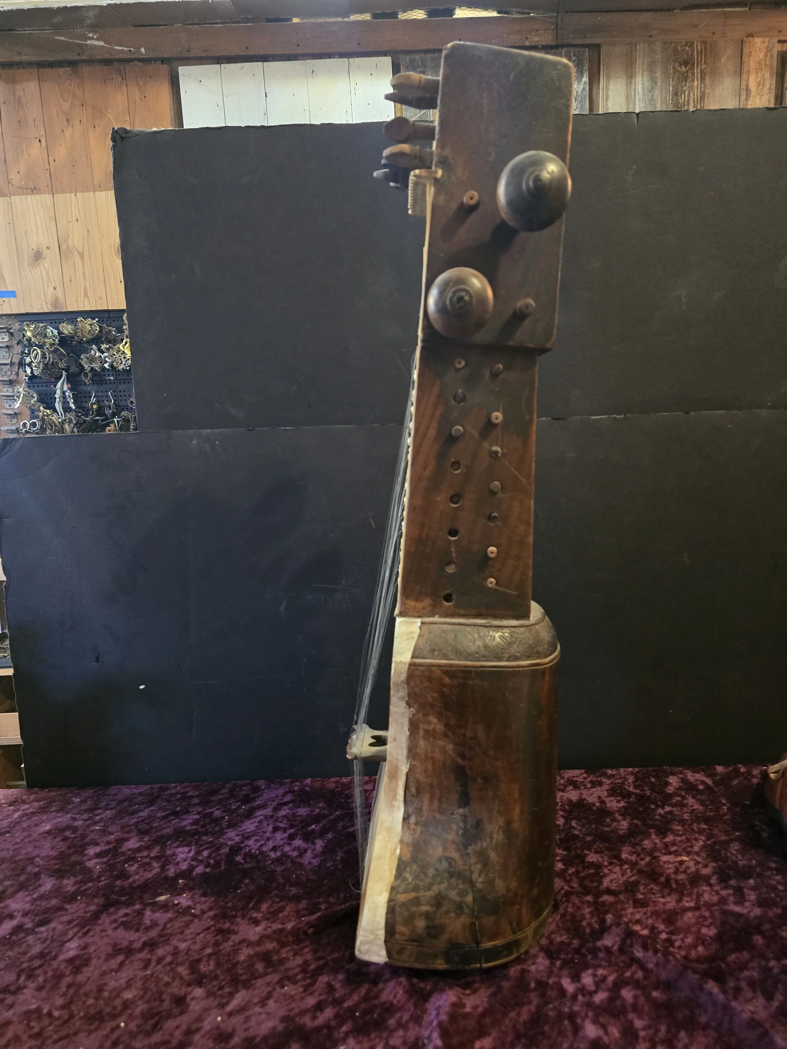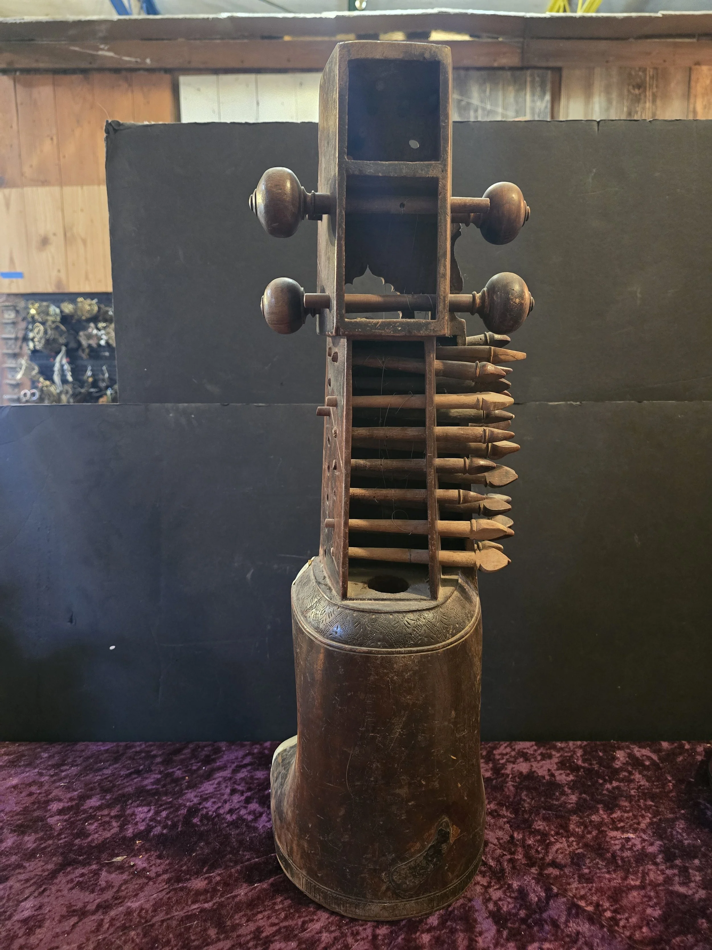 Carved wooden Sarangi, which is an Indian stringed instrument played with a bow. The details on this pieces are beautiful.