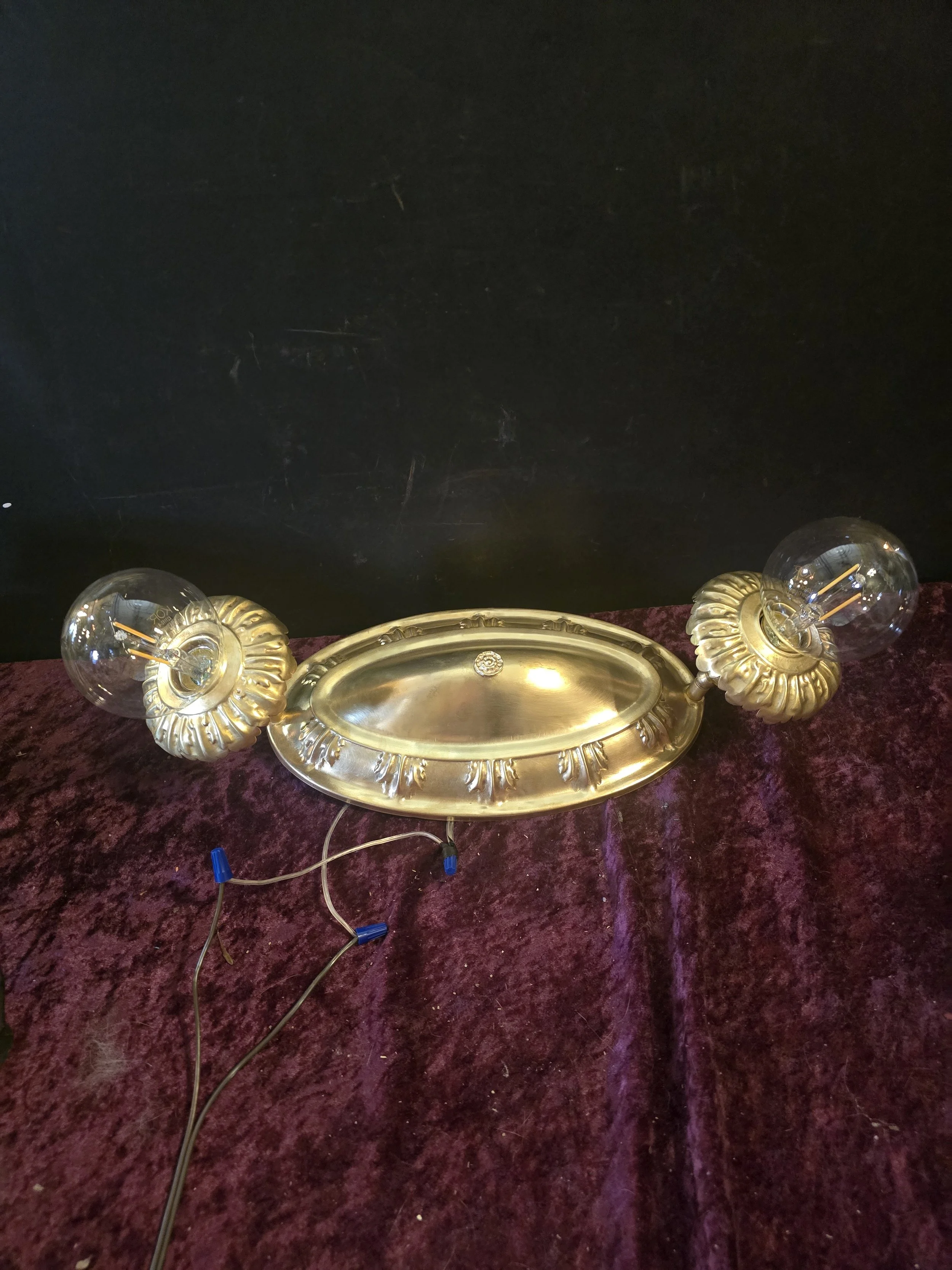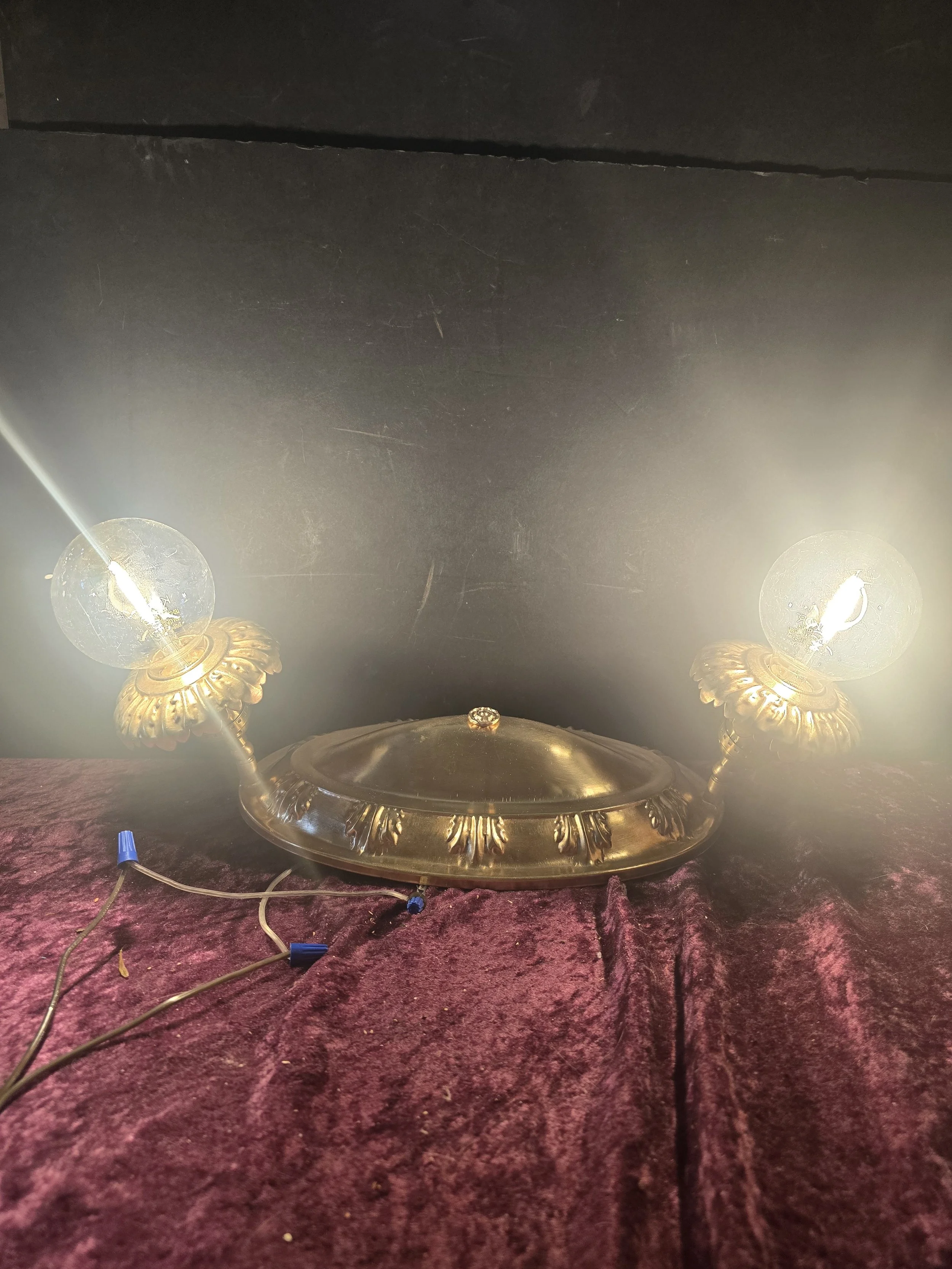 1920's beautiful brass pan light flush mount fixture with 2 bulbs. This fixture has been completely restored. It has all new wiring and sockets.