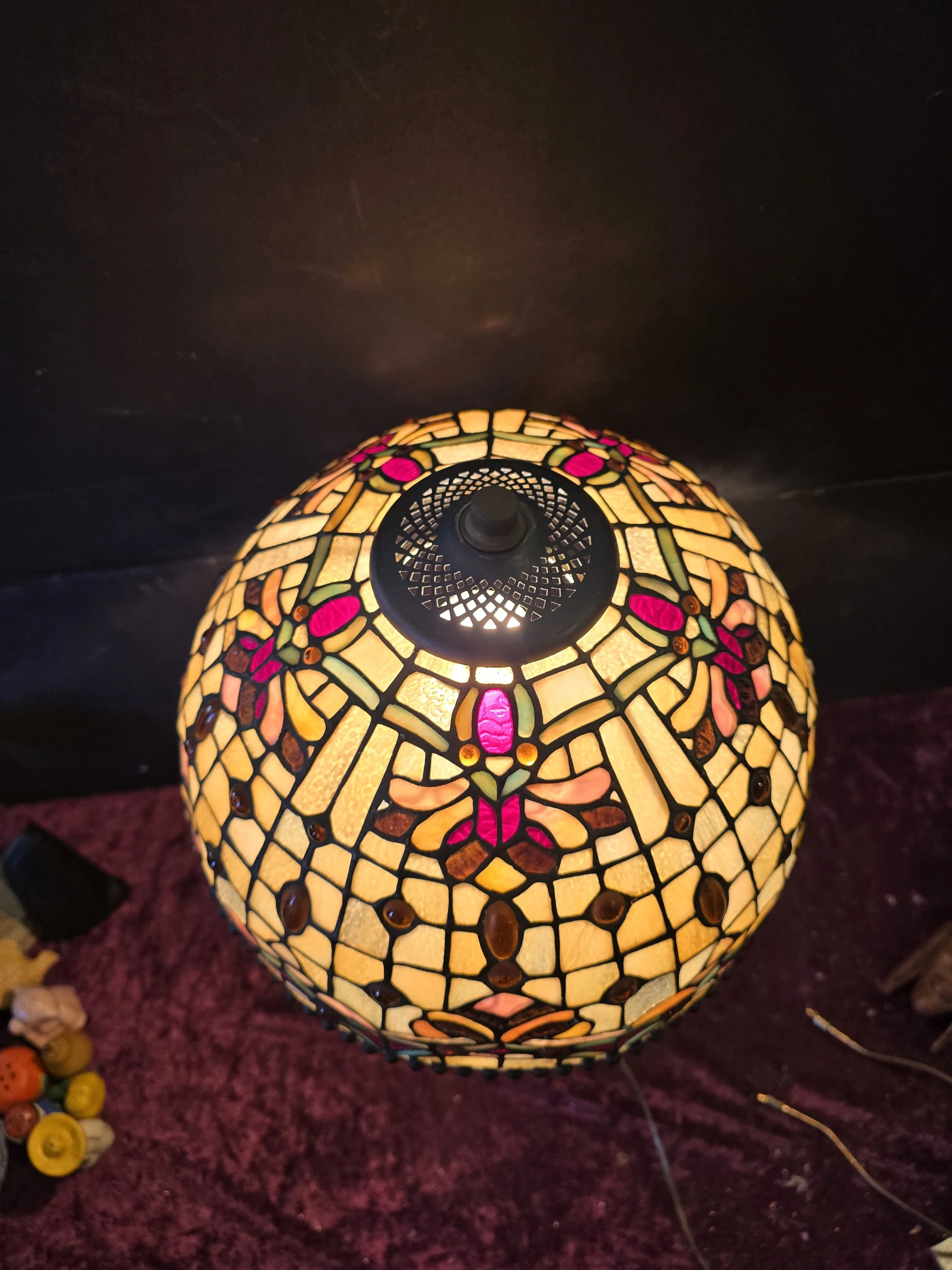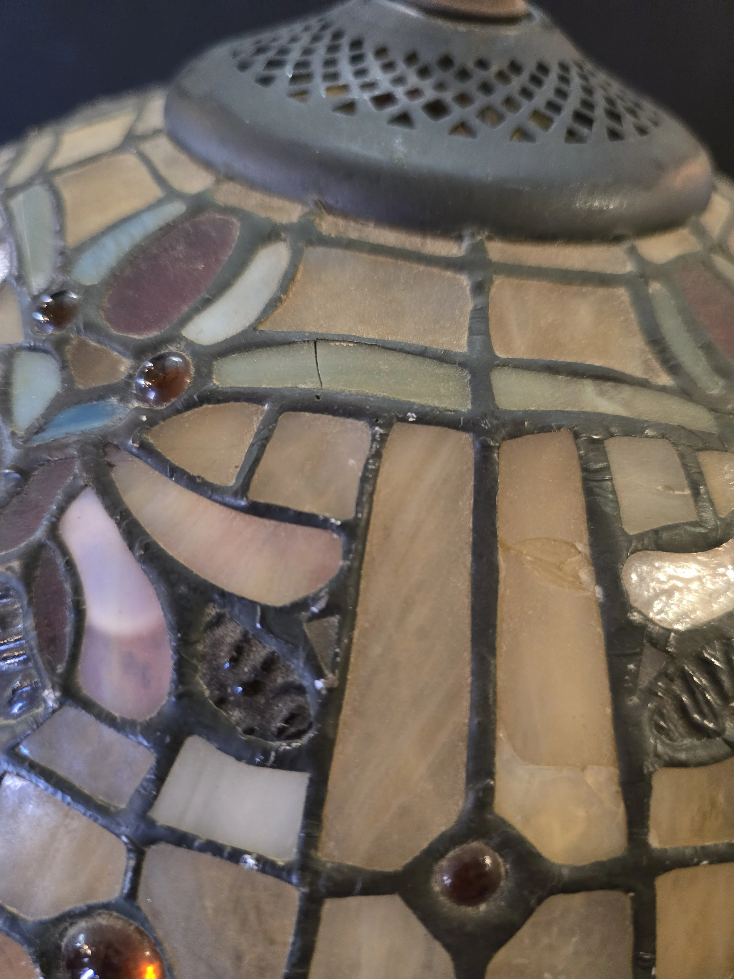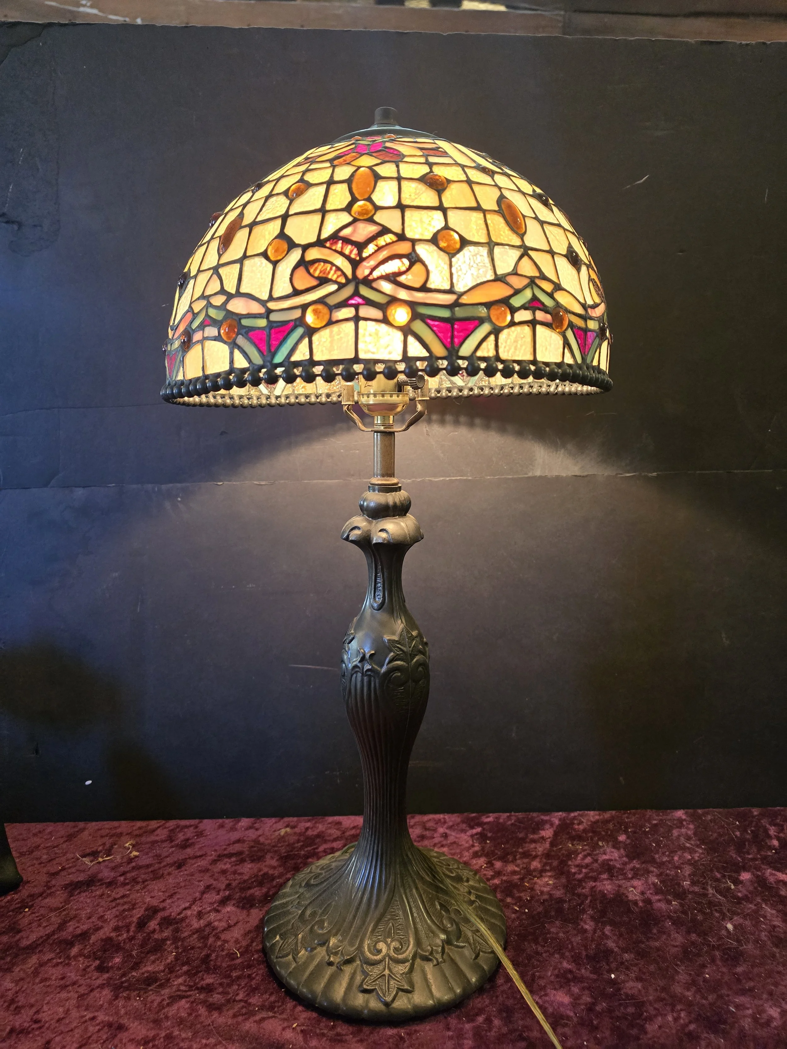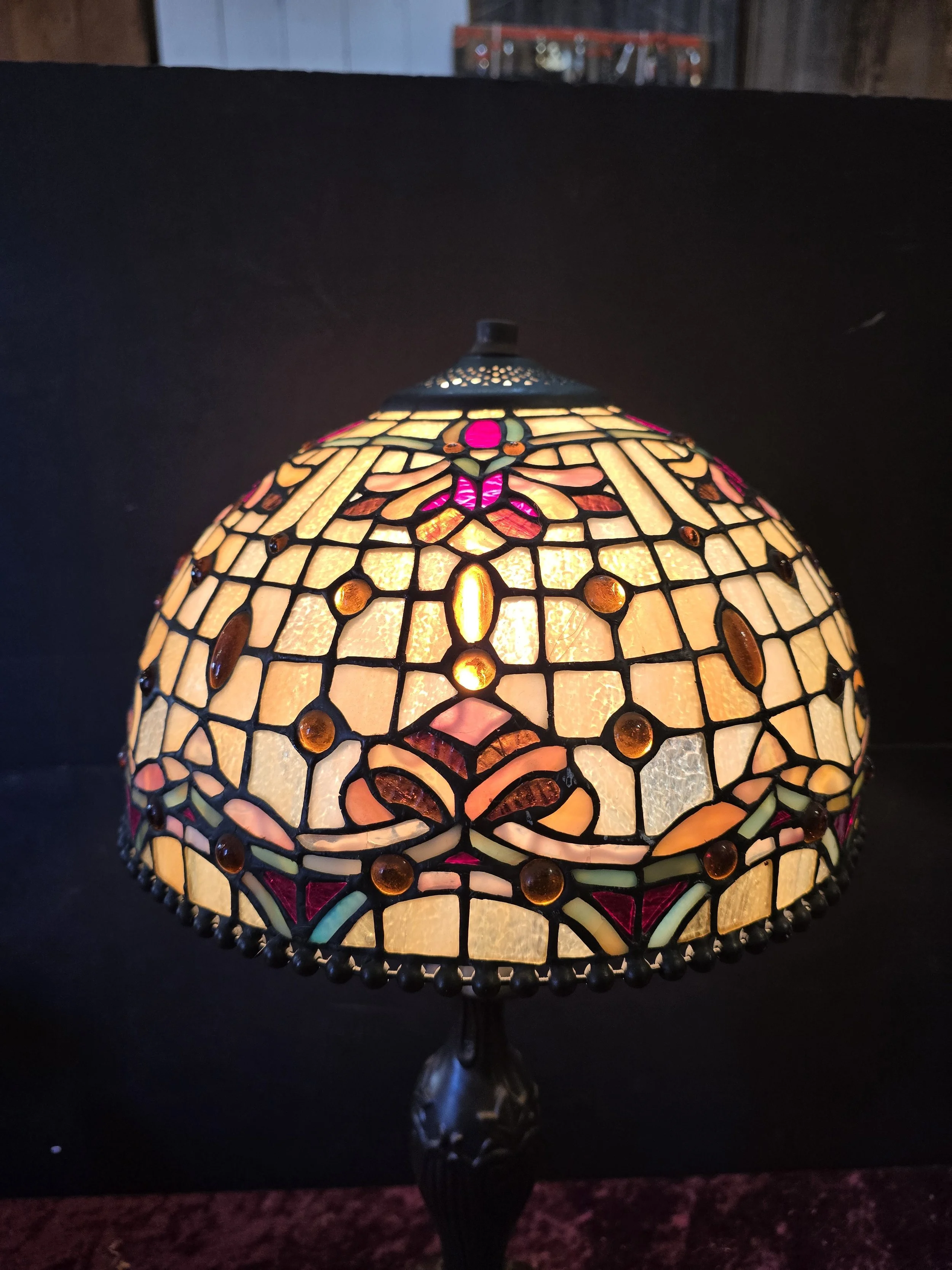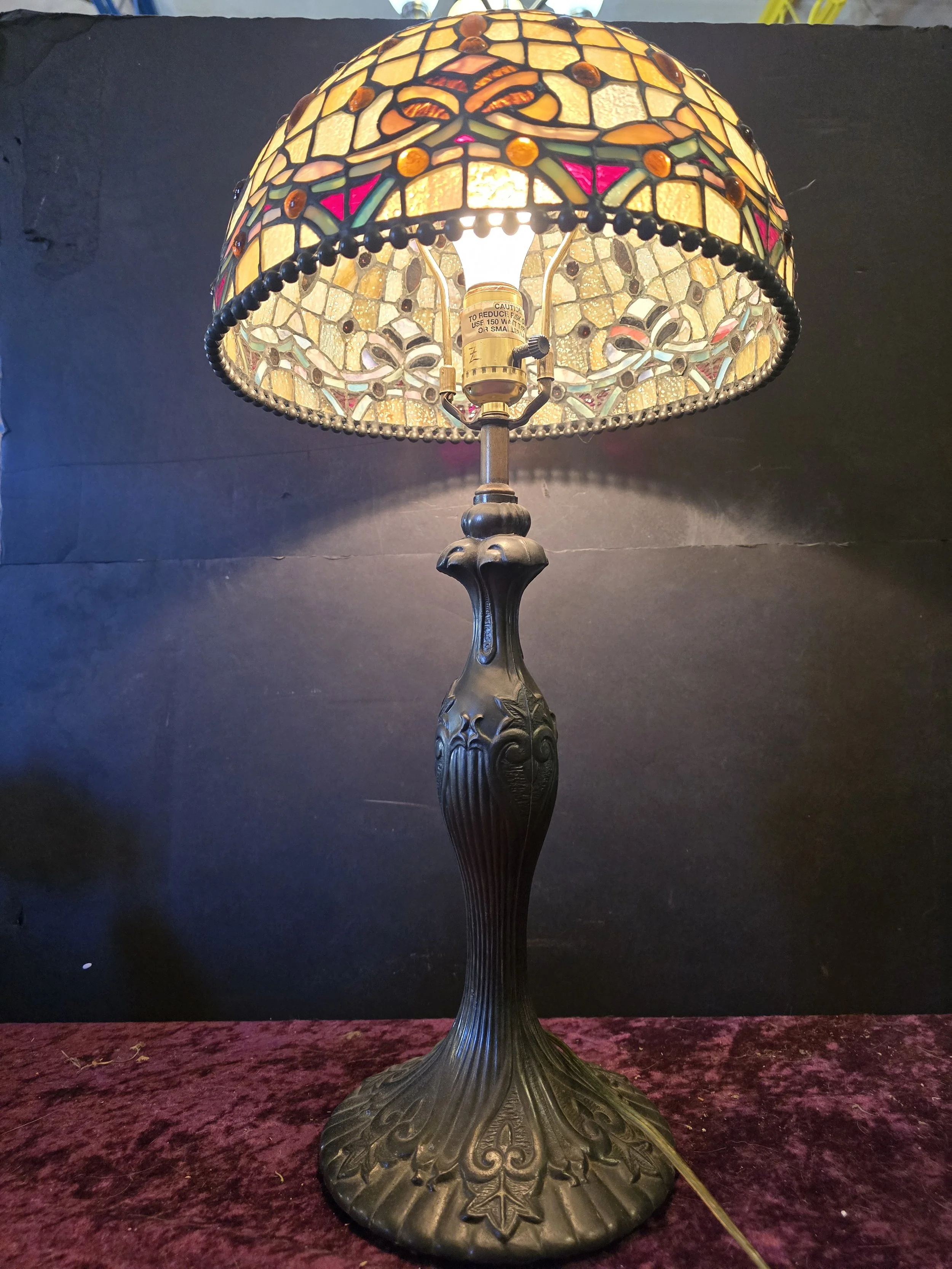 Tiffany style lamp with stained glass shade and metal base. This lamp is stunning. The shade has one spot where it appears to have been repaired and a few spots with minor cracks.