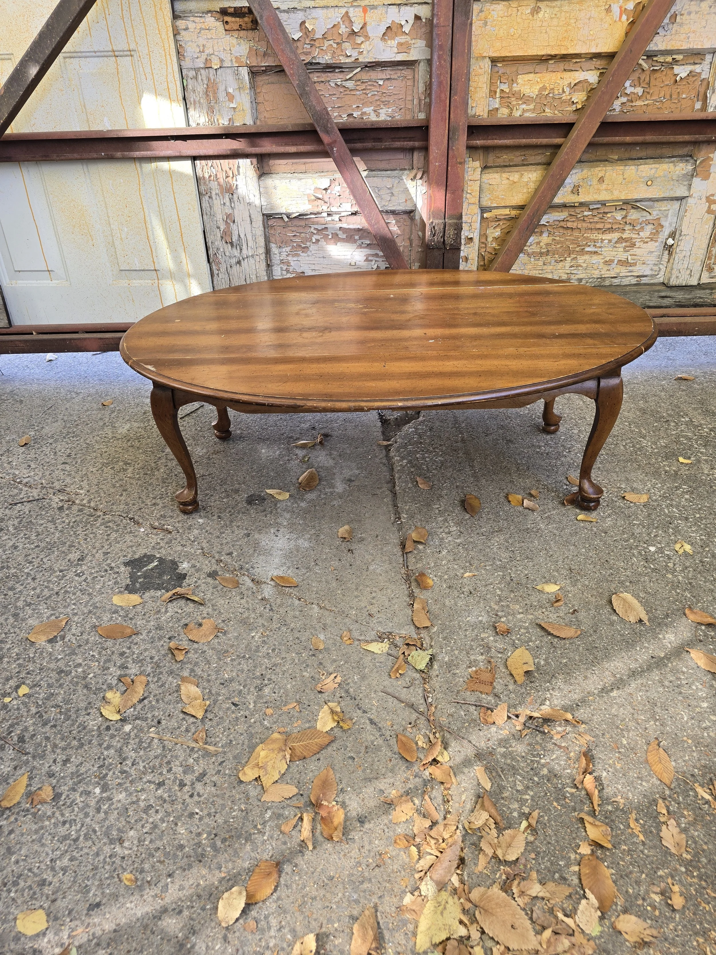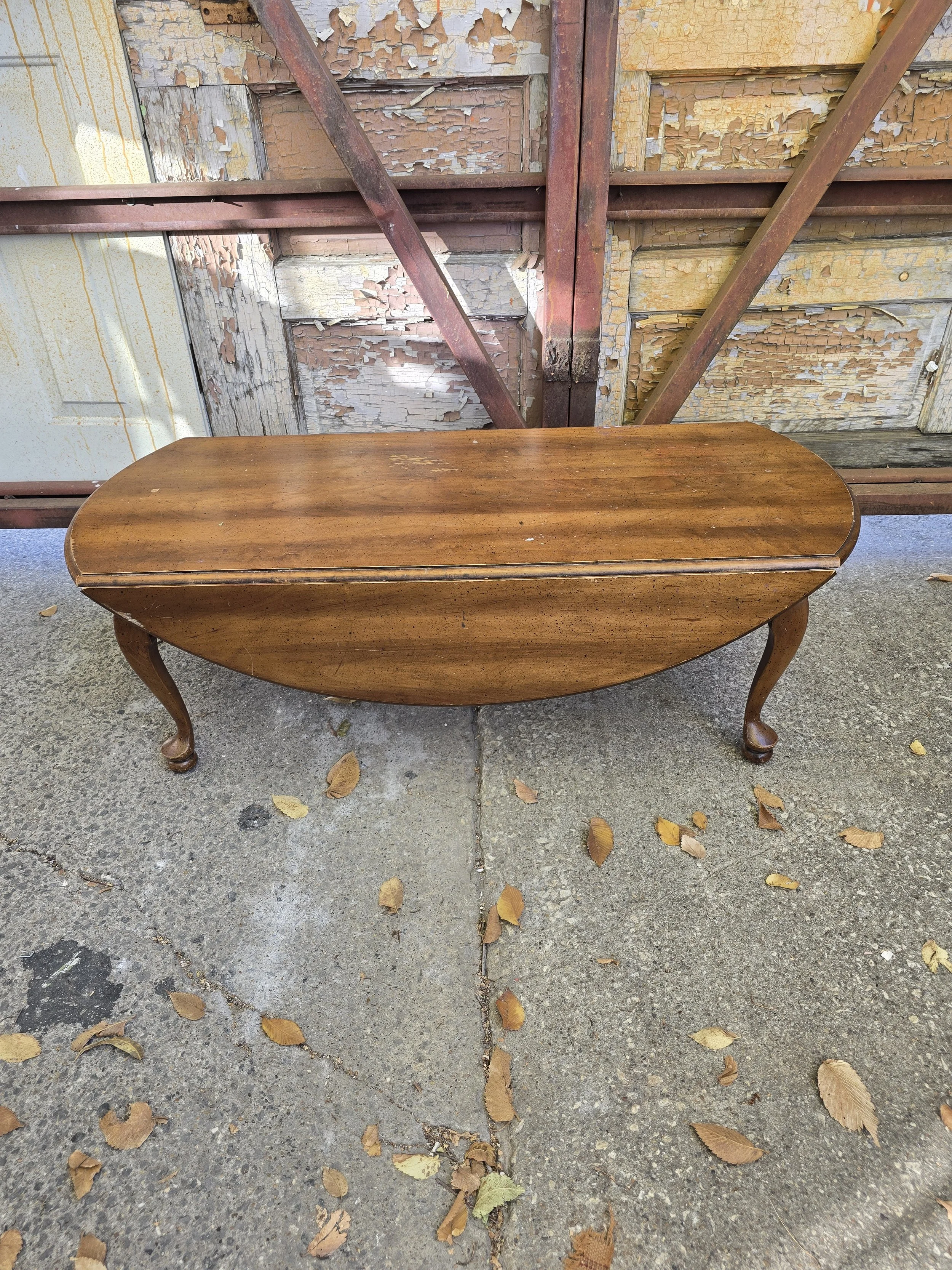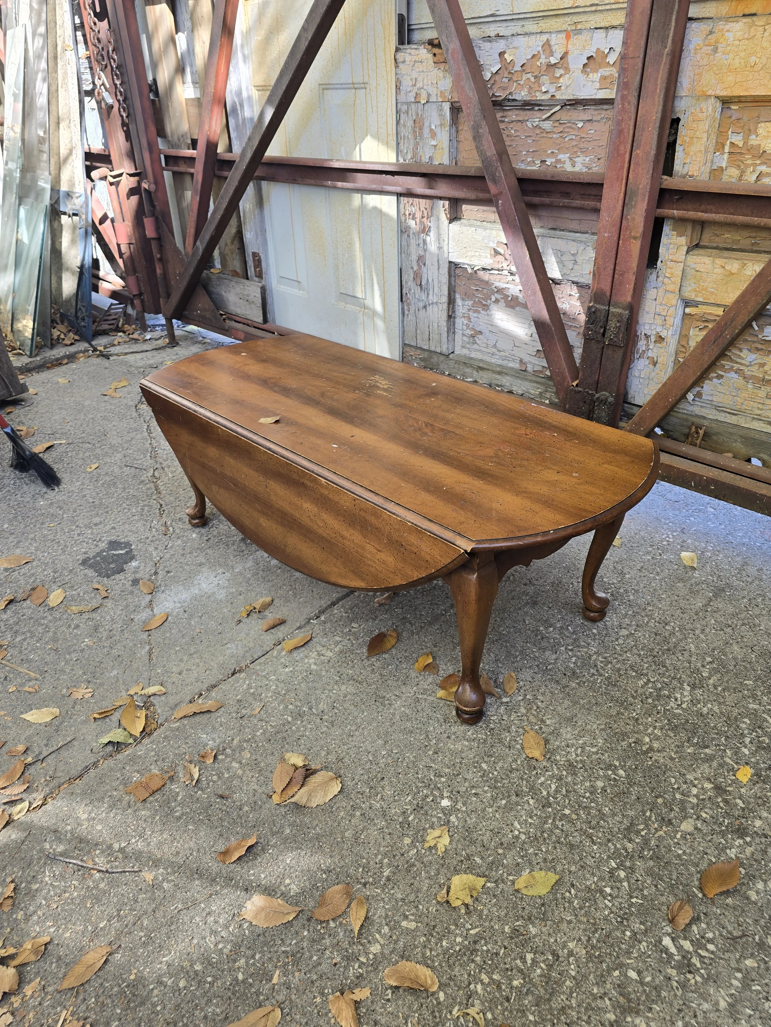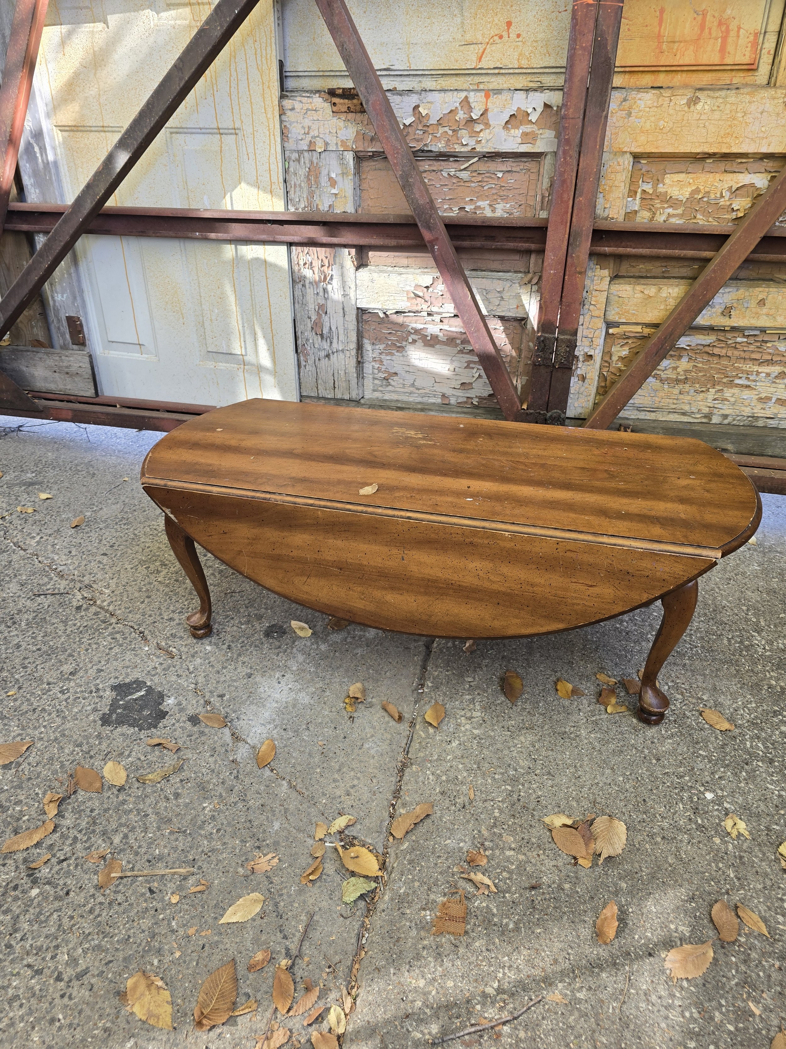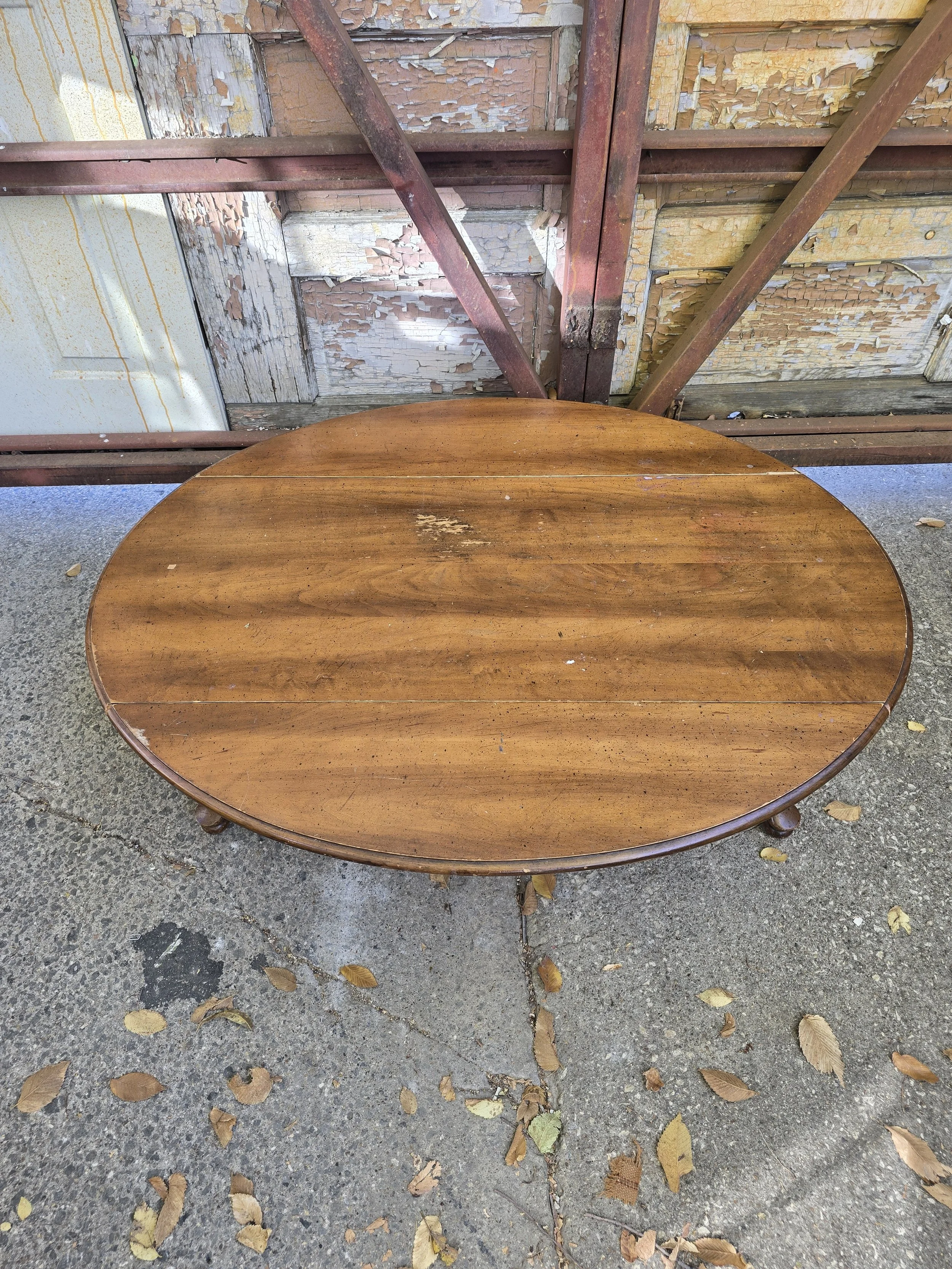 Got to love such a versatile piece. In the mood for a oval table? Flip up the sides. Need some more space? Fold them down. Very sturdy but there is some water damage in the center to the finish.