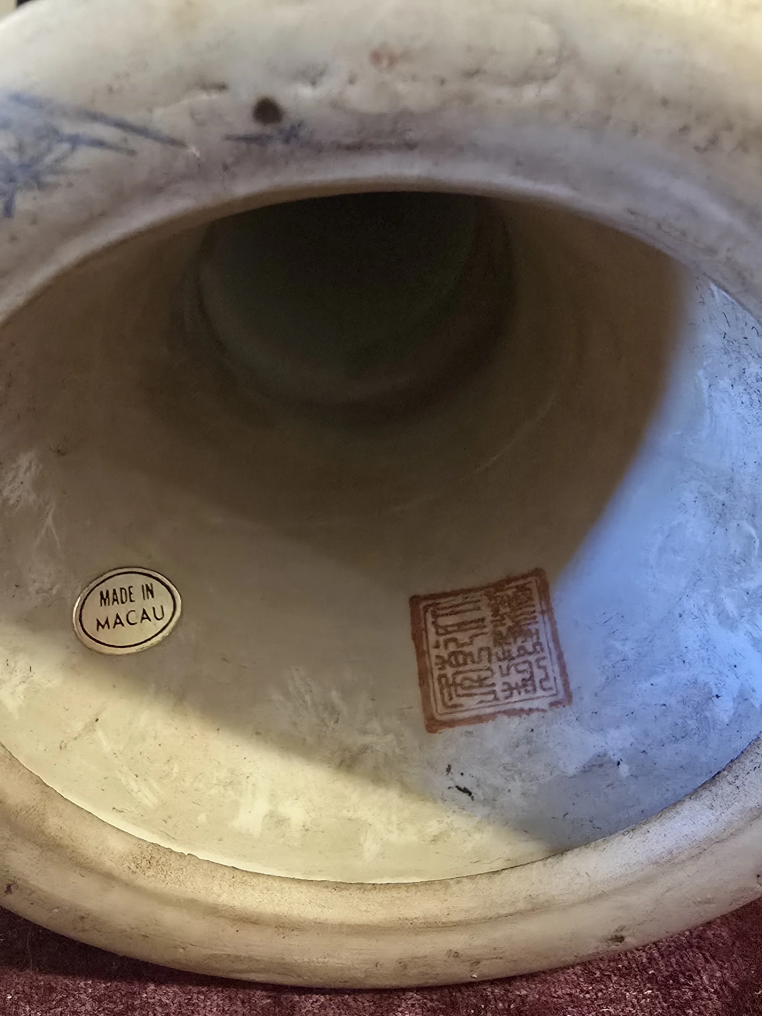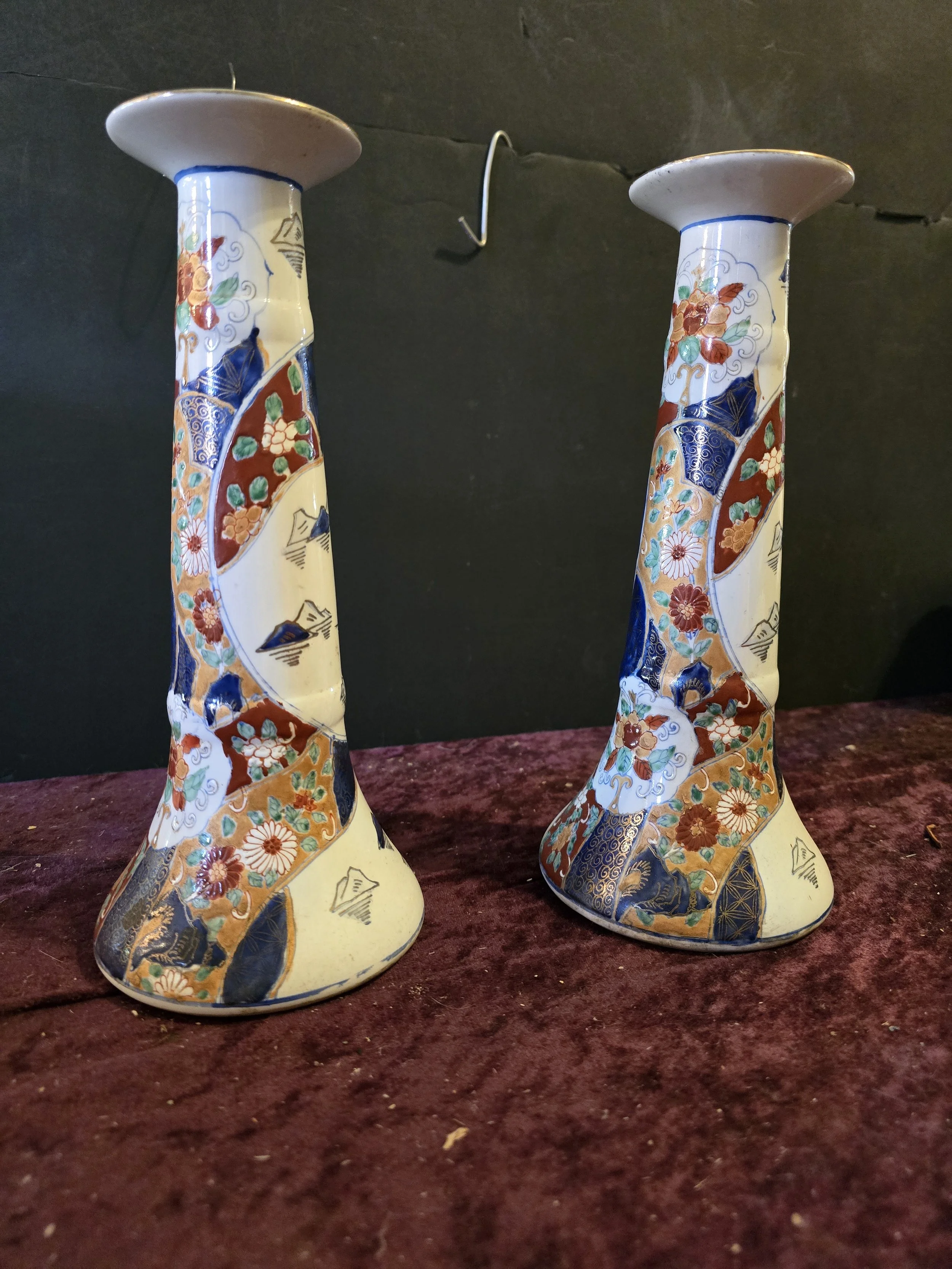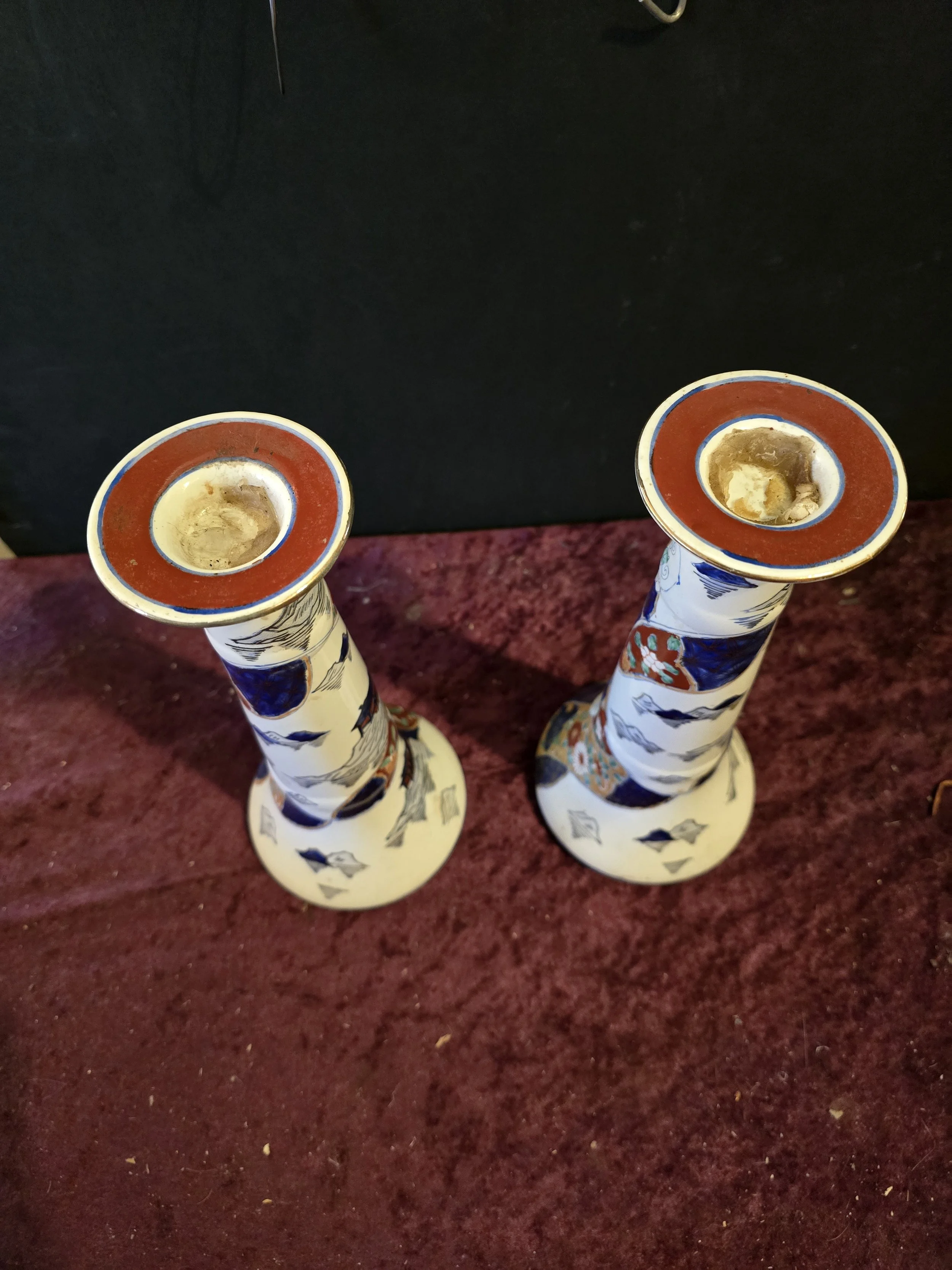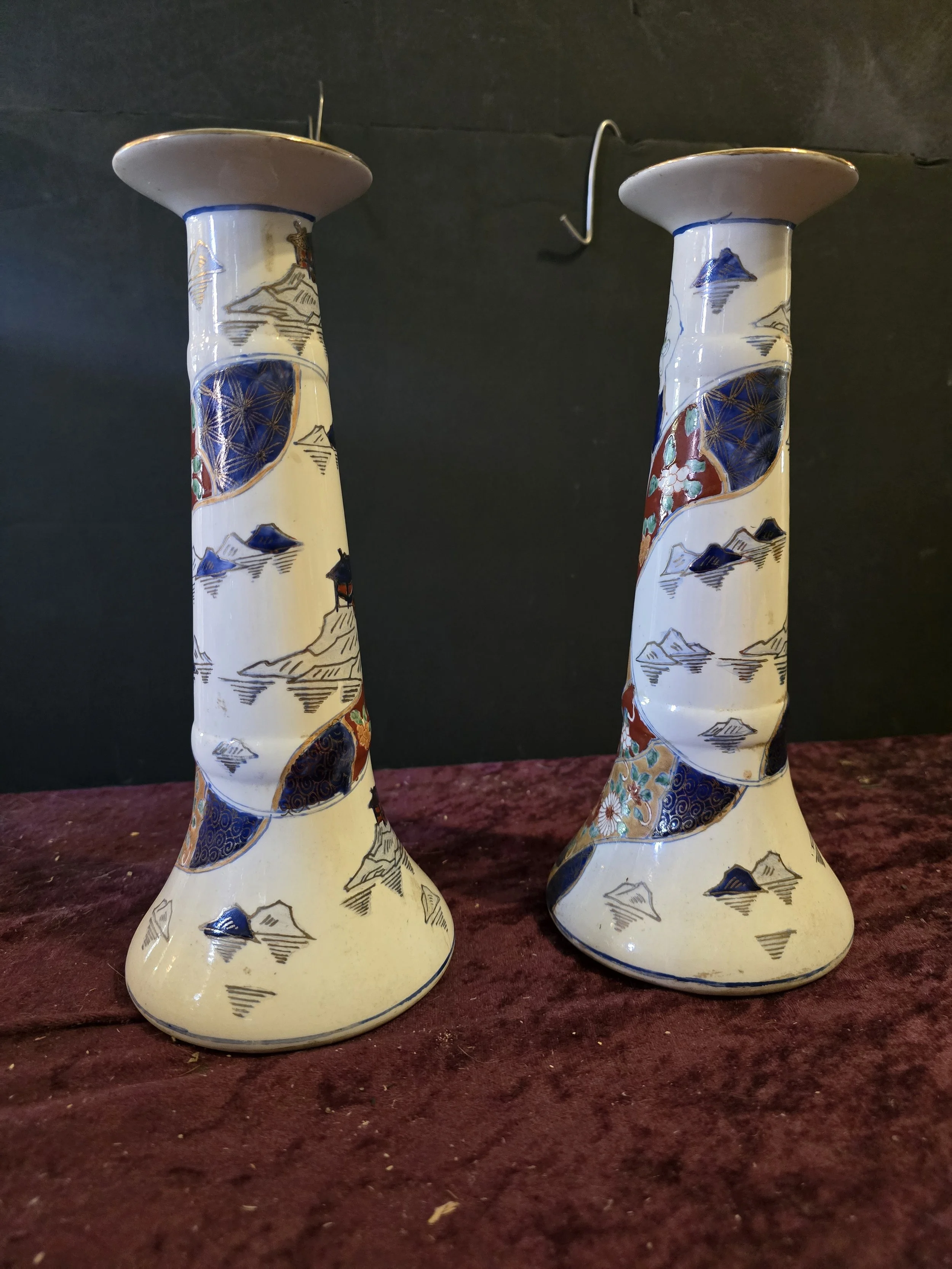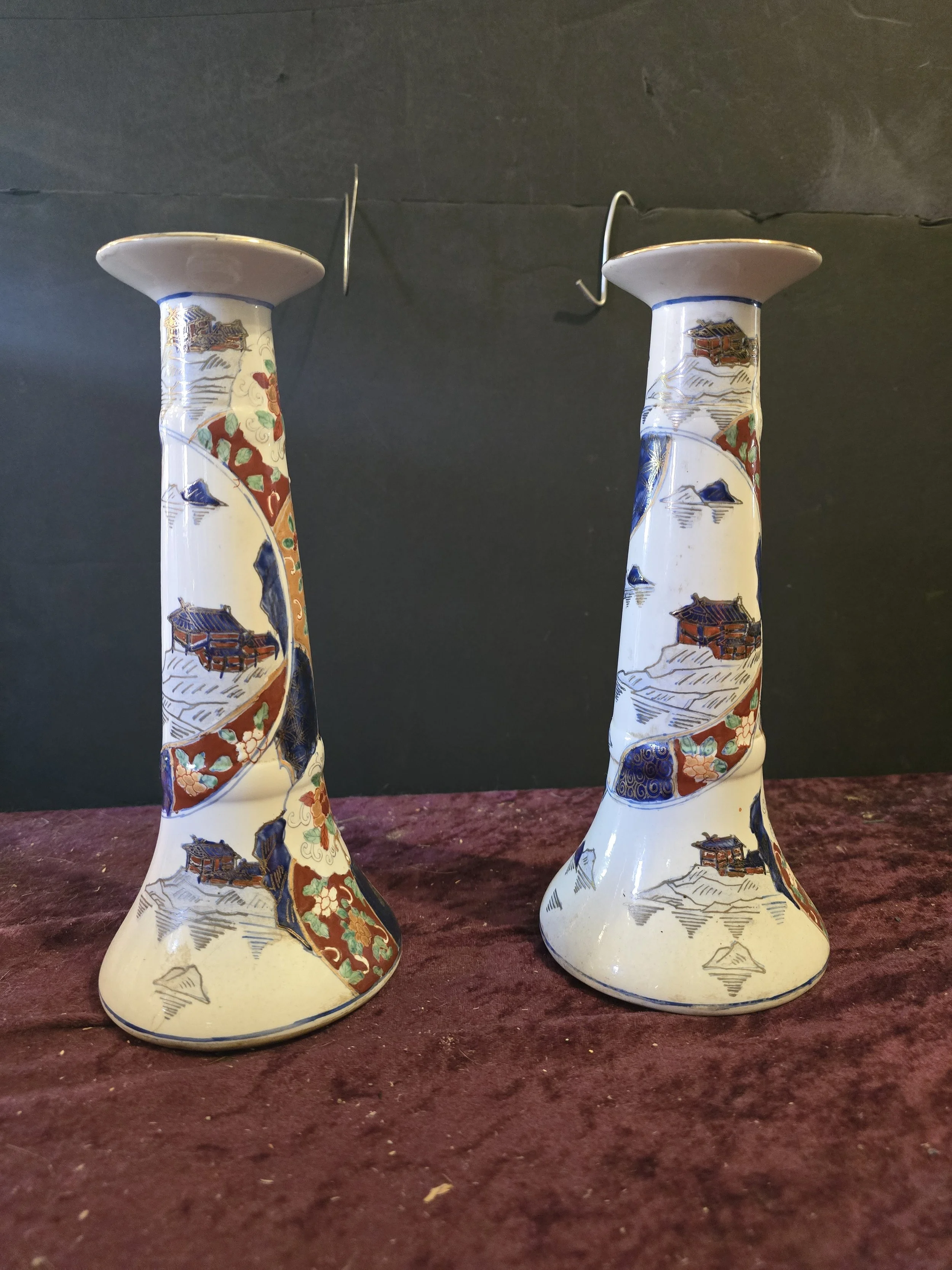 Pair of Hand Painted Vintage Chinese Porcelain Macau Imari Lotus Pod Gilded Candle Holders