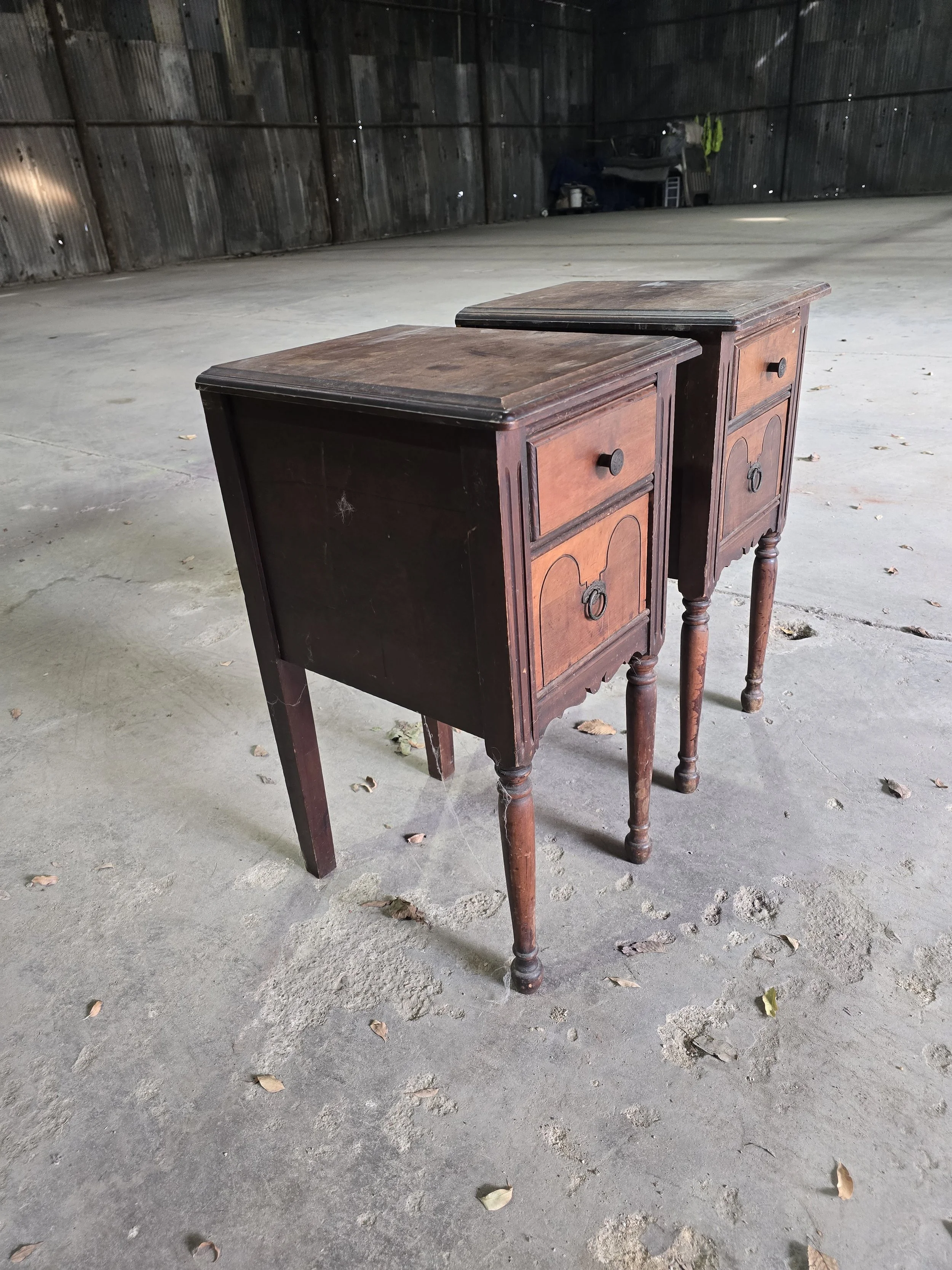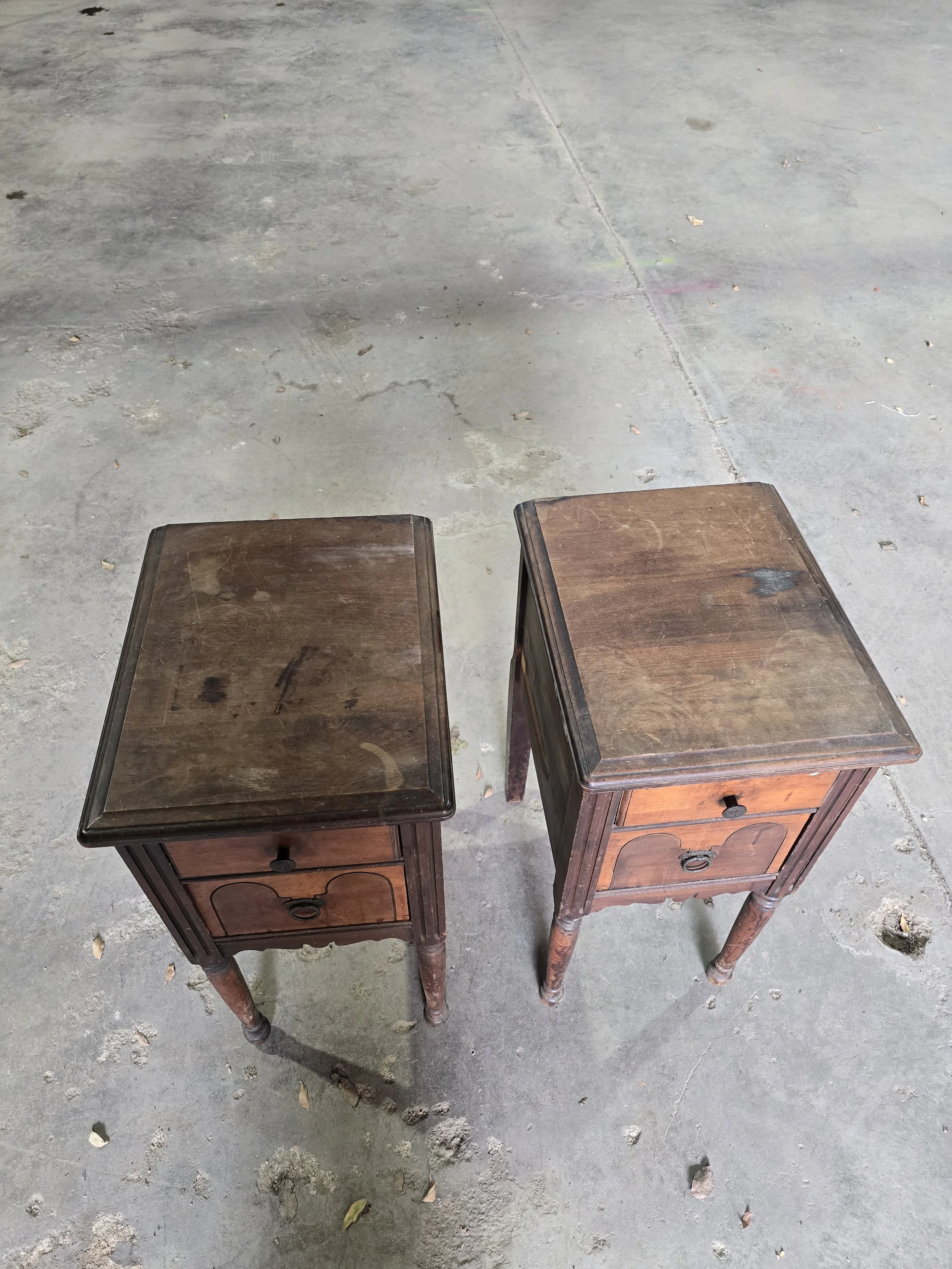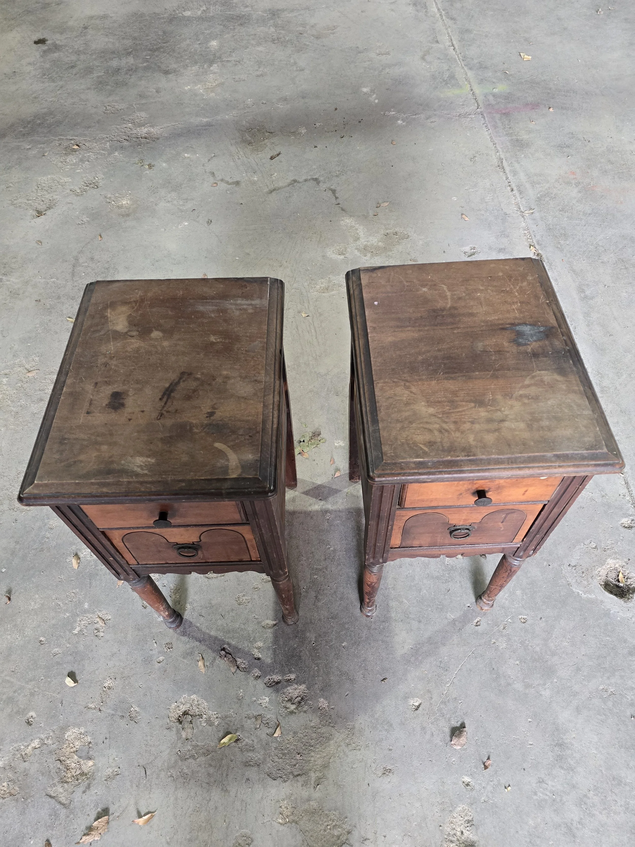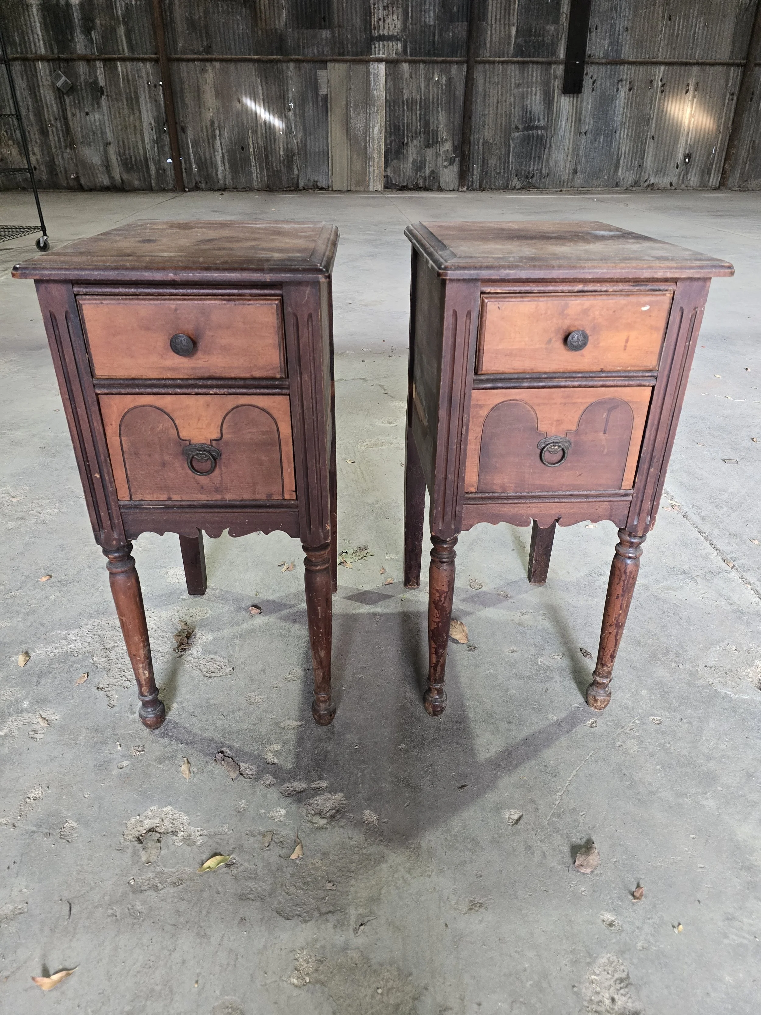 Beautiful antique pair of nightstands, made of solid wood with 2 different stains. The tops of each piece could use a bit of sanding, but really there isn’t much to complain about with this pair.