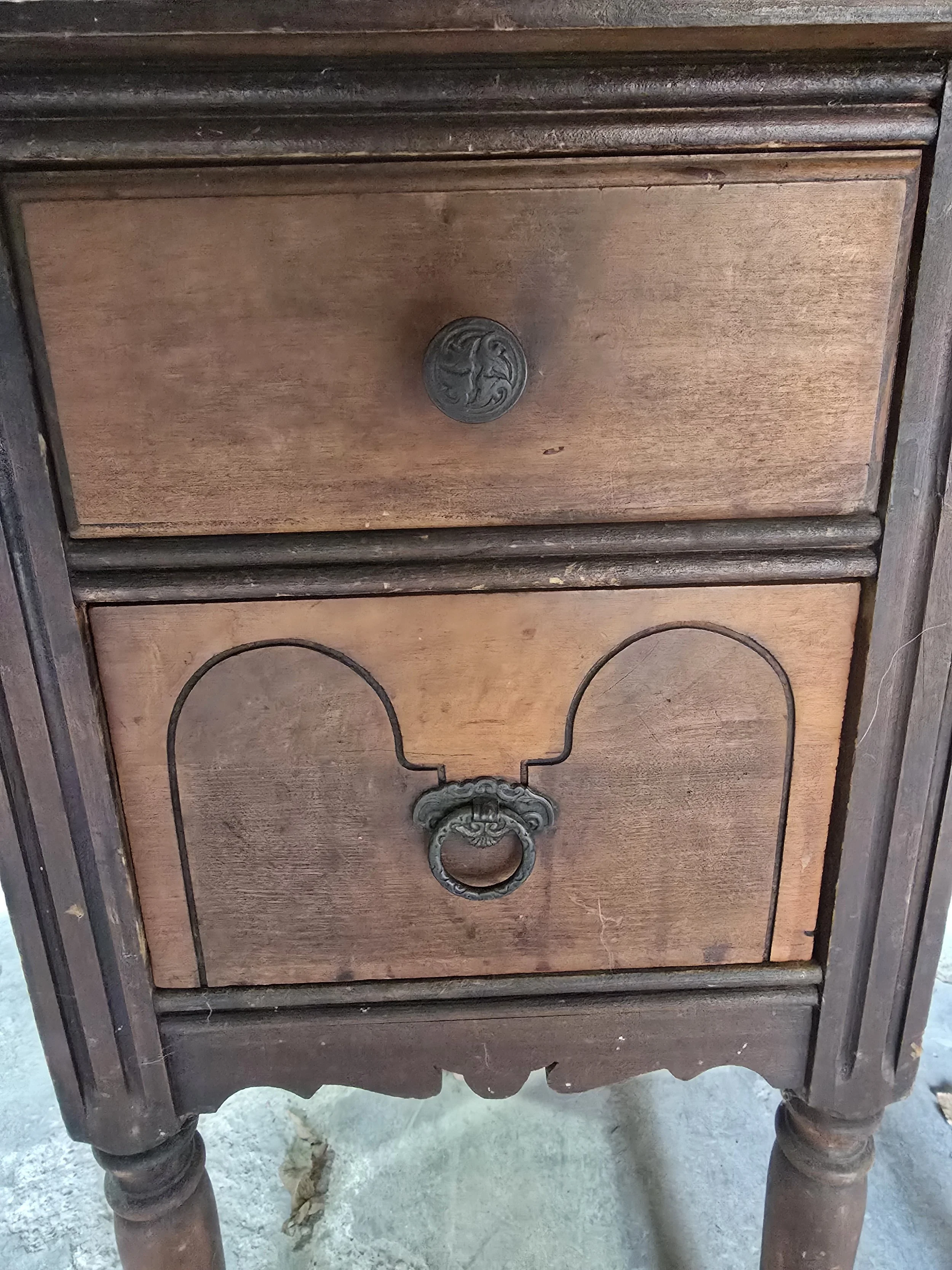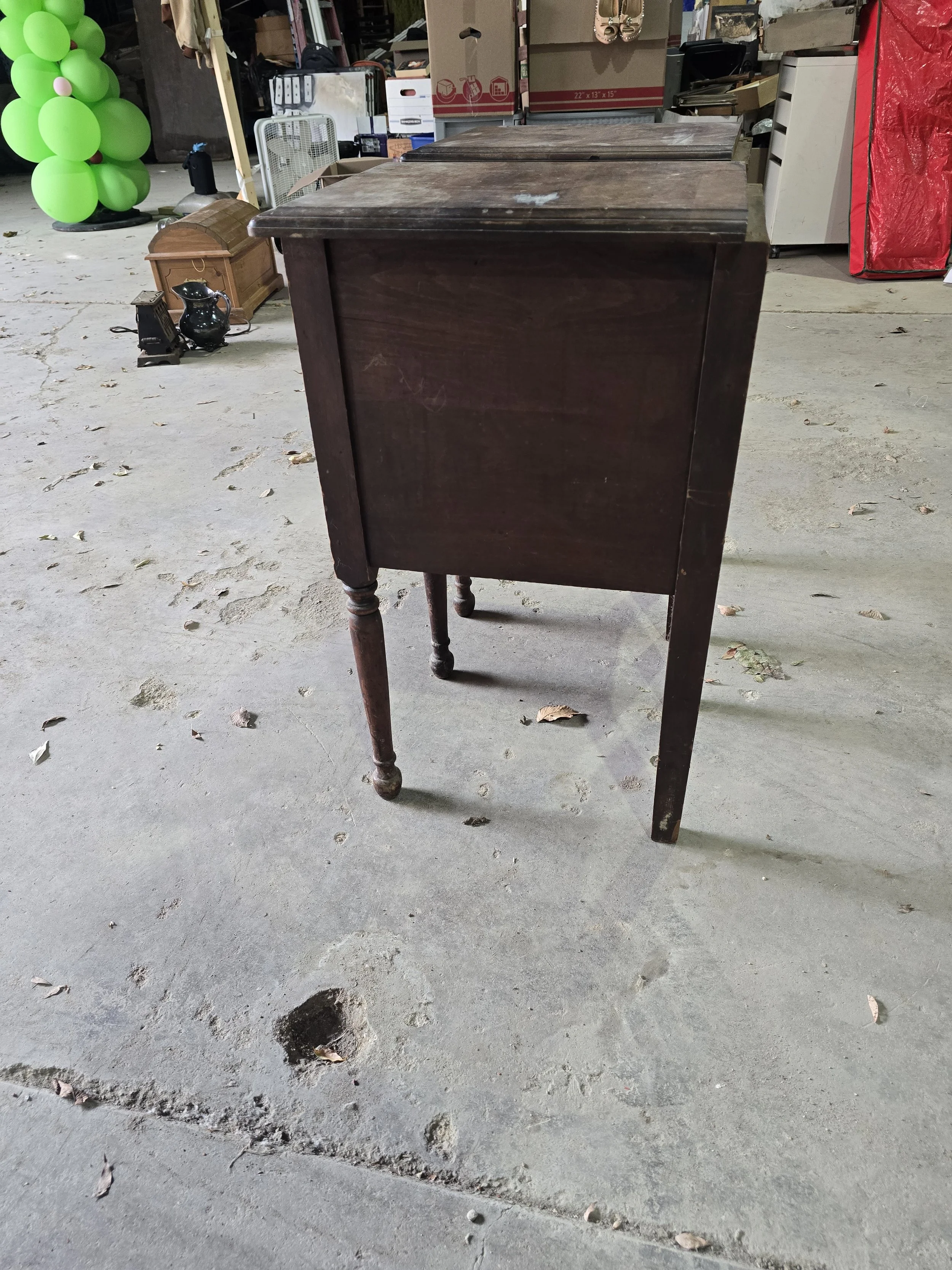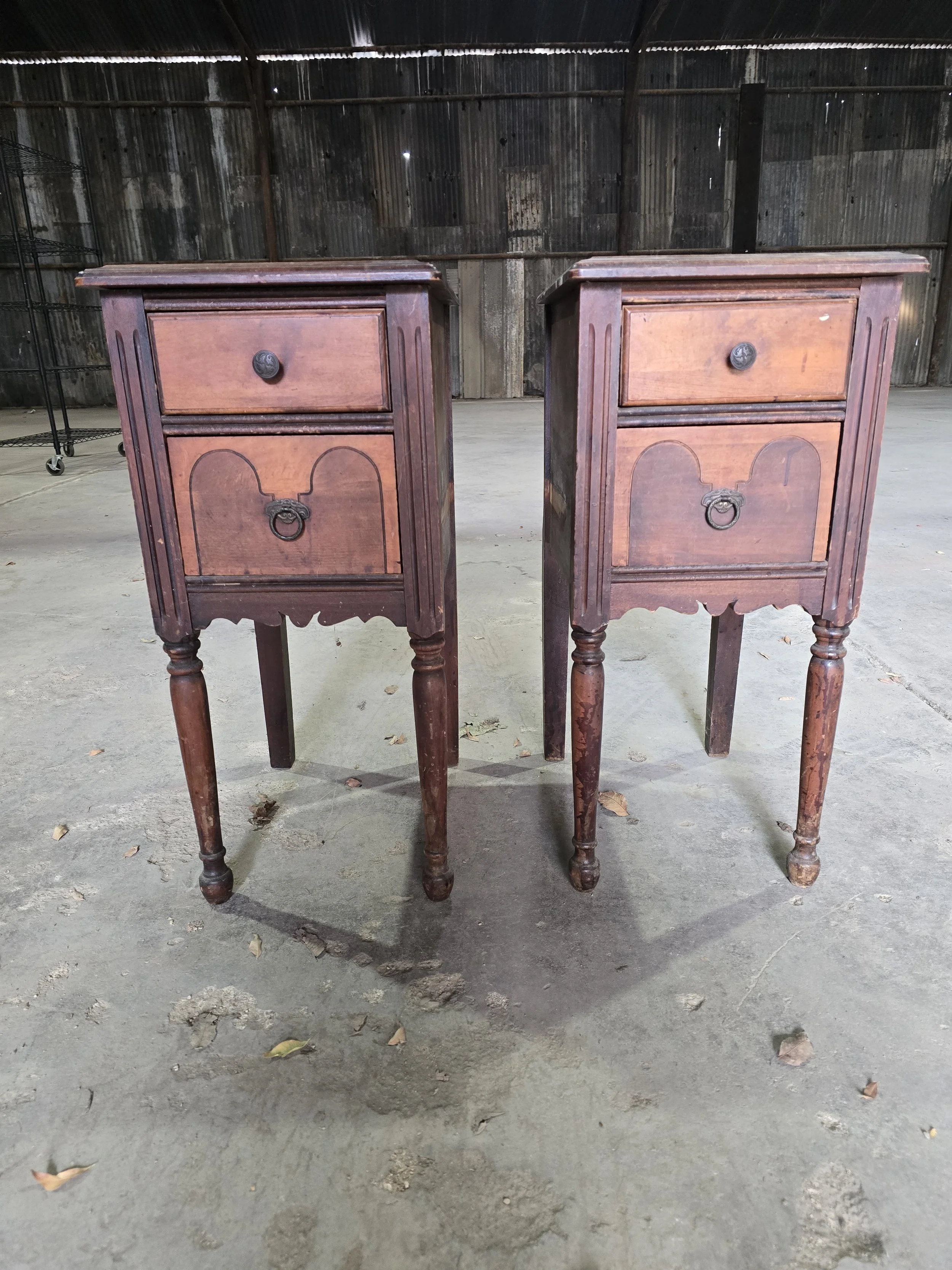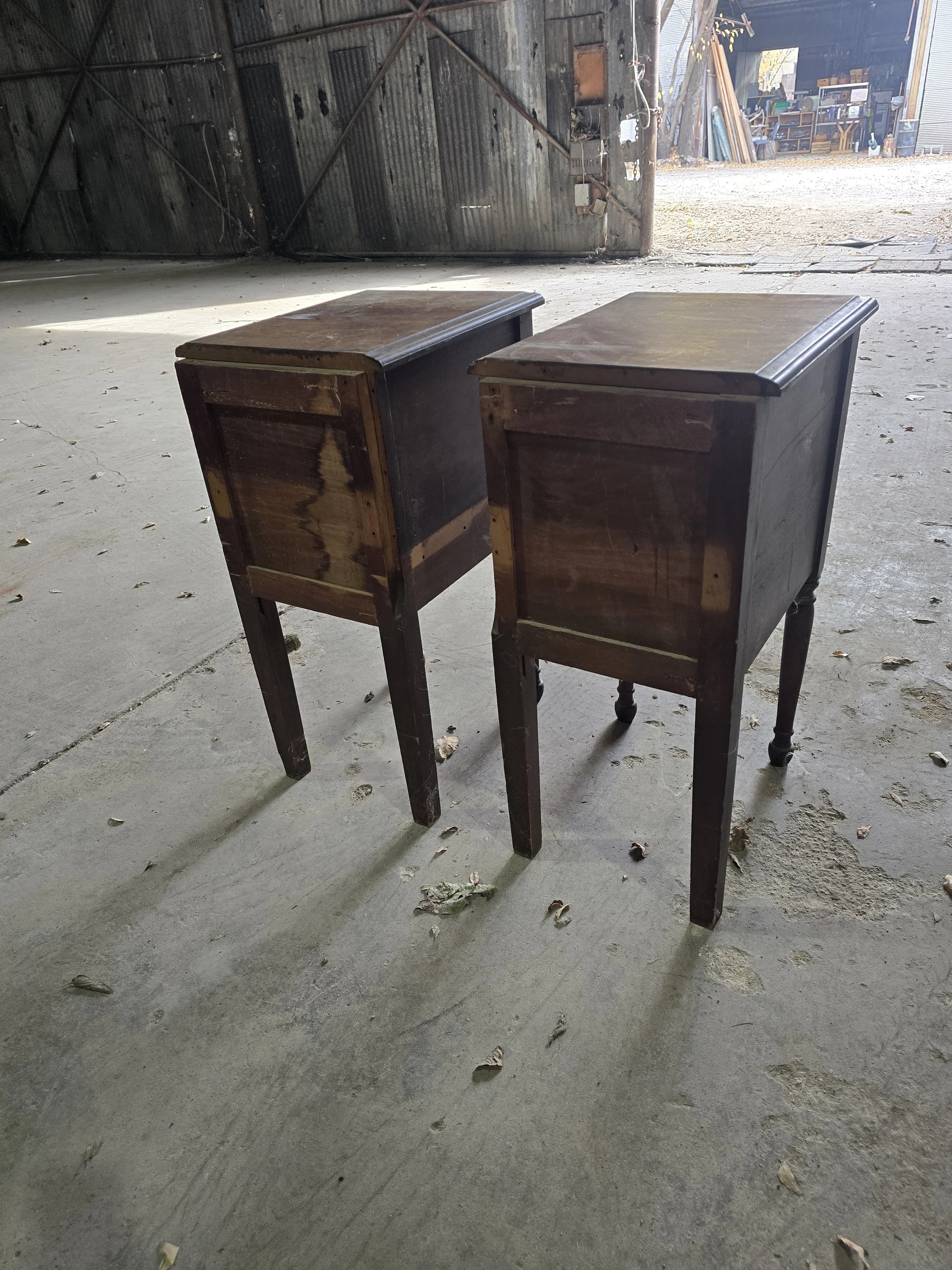 Beautiful antique pair of nightstands, made of solid wood with 2 different stains. The tops of each piece could use a bit of sanding, but really there isn’t much to complain about with this pair.