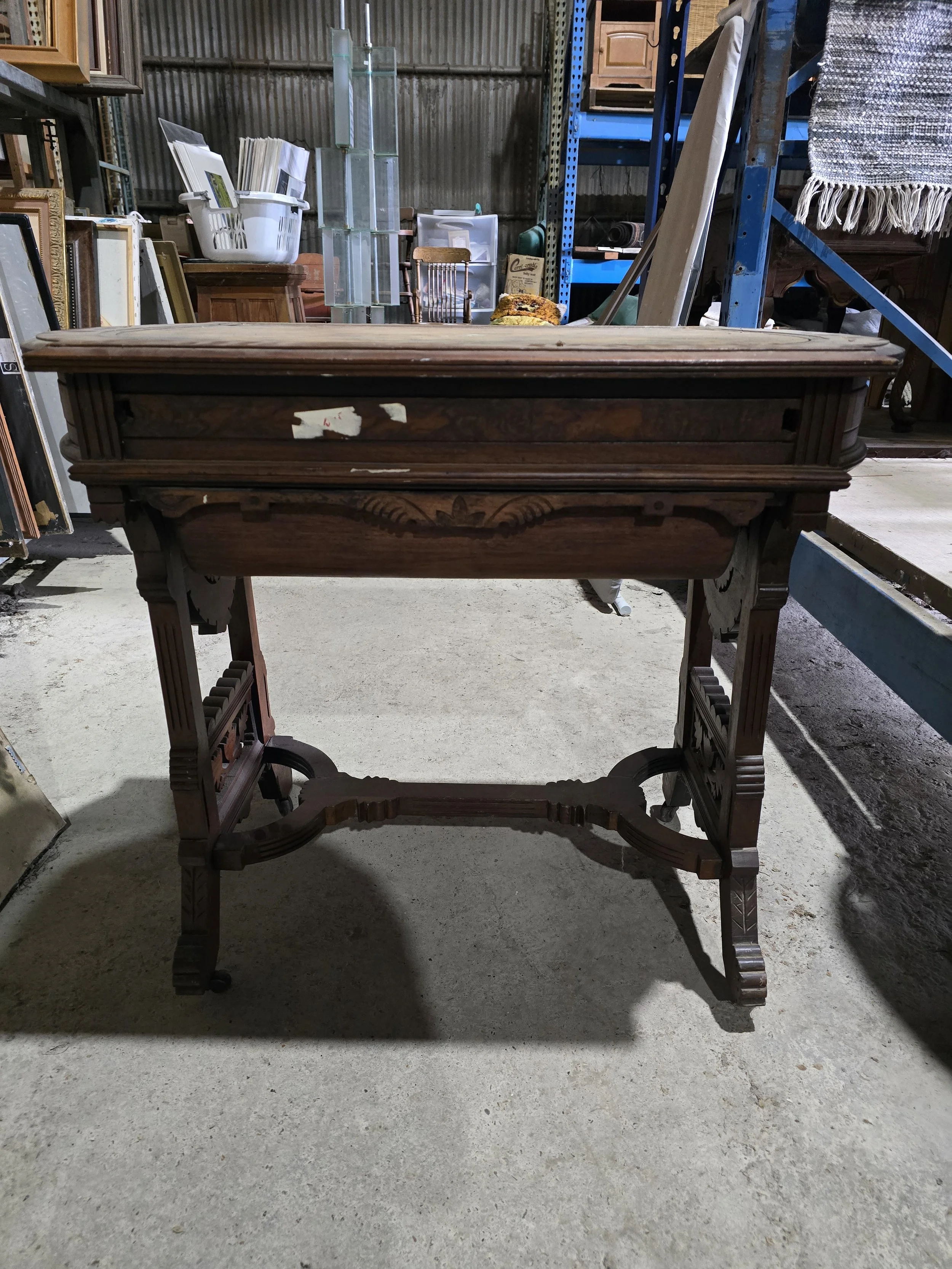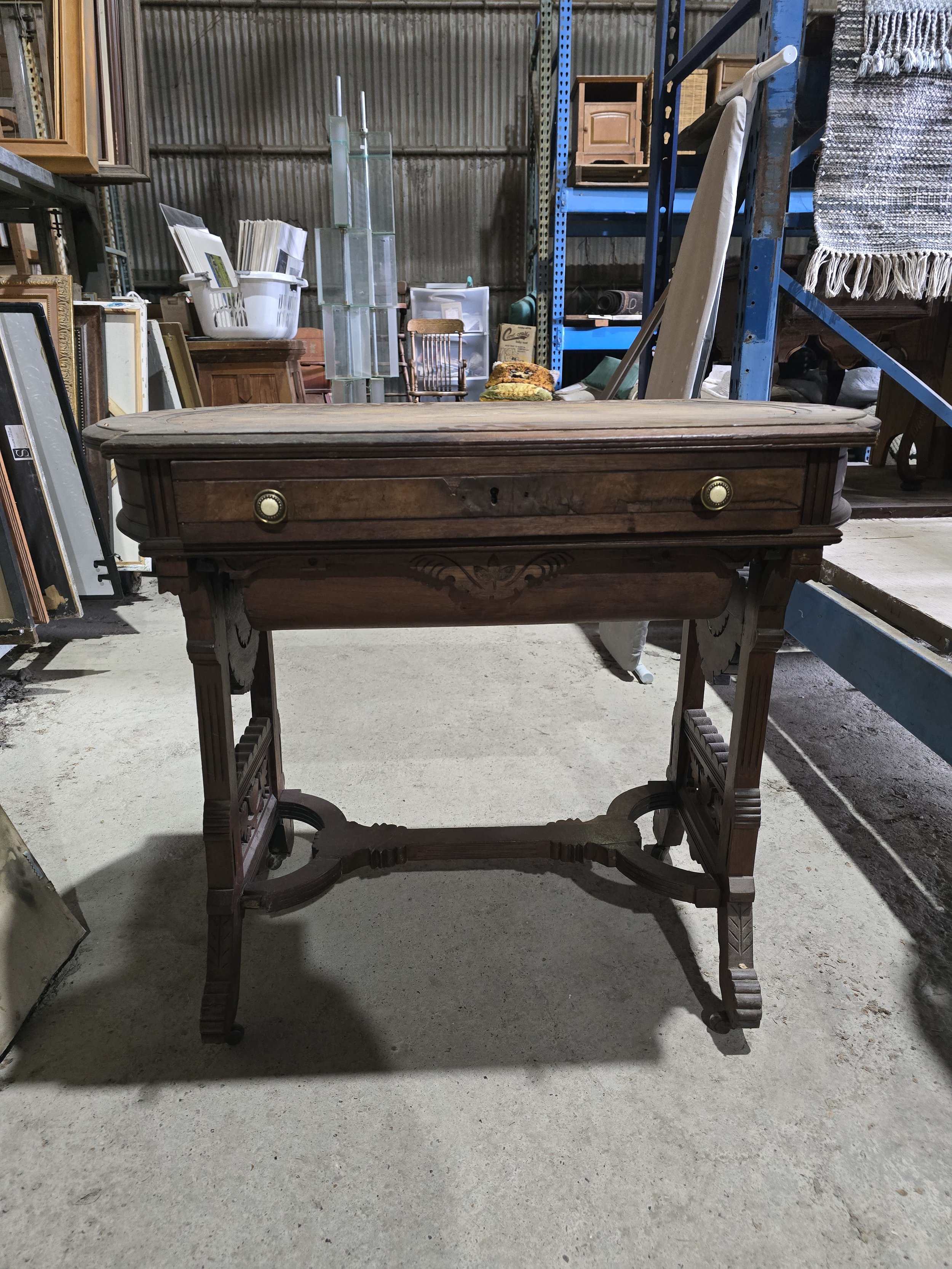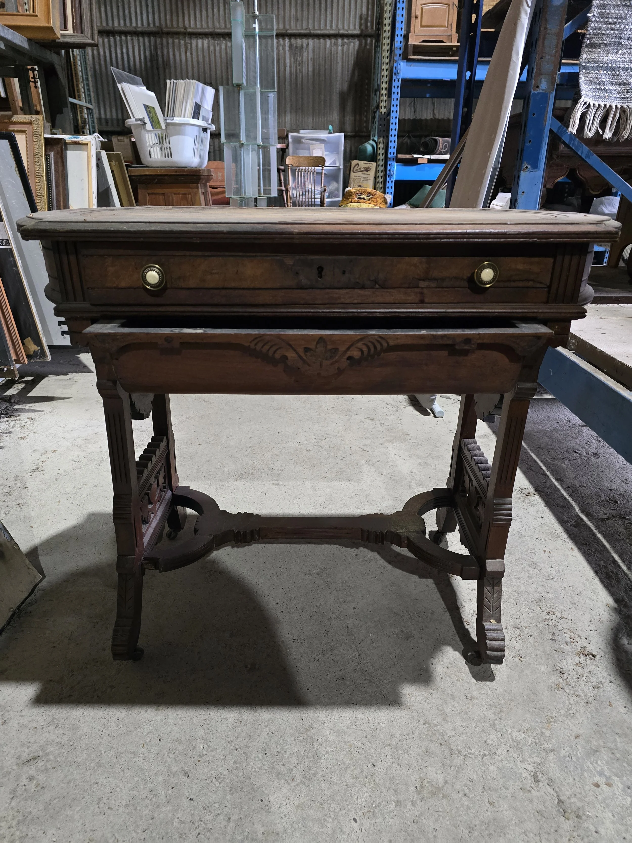 Gorgeous Victorian Eastlake style sewing table/ writing desk. It has one drawer that only opens on one side and a lower drawer that slides both ways. This piece is stunning.