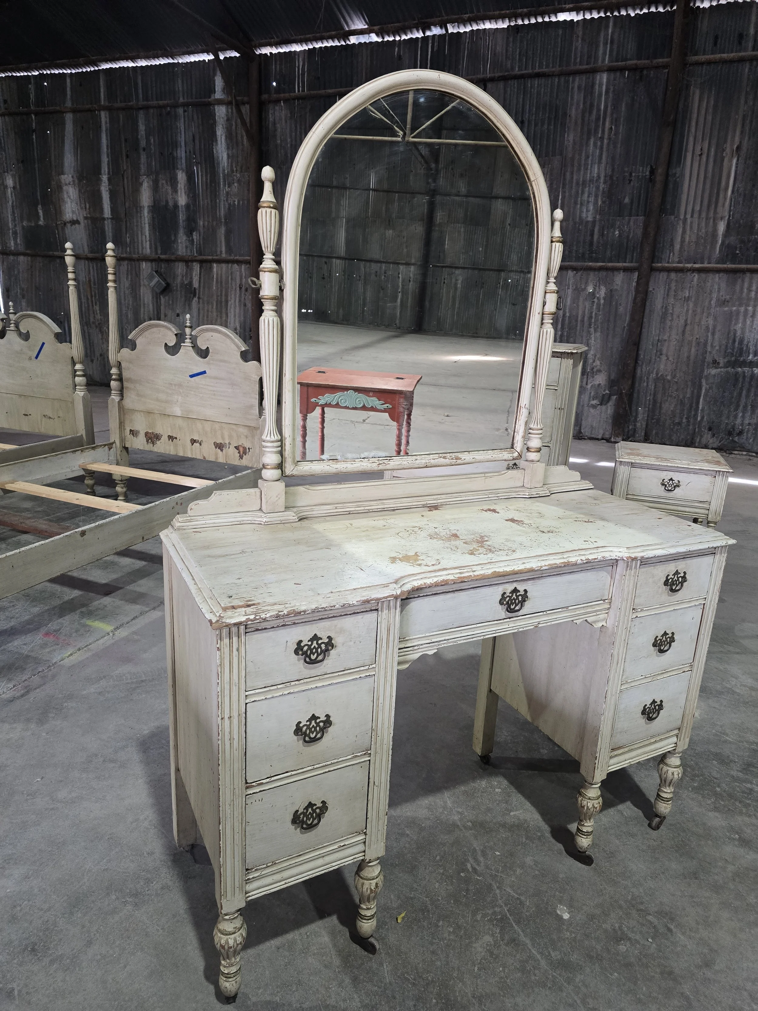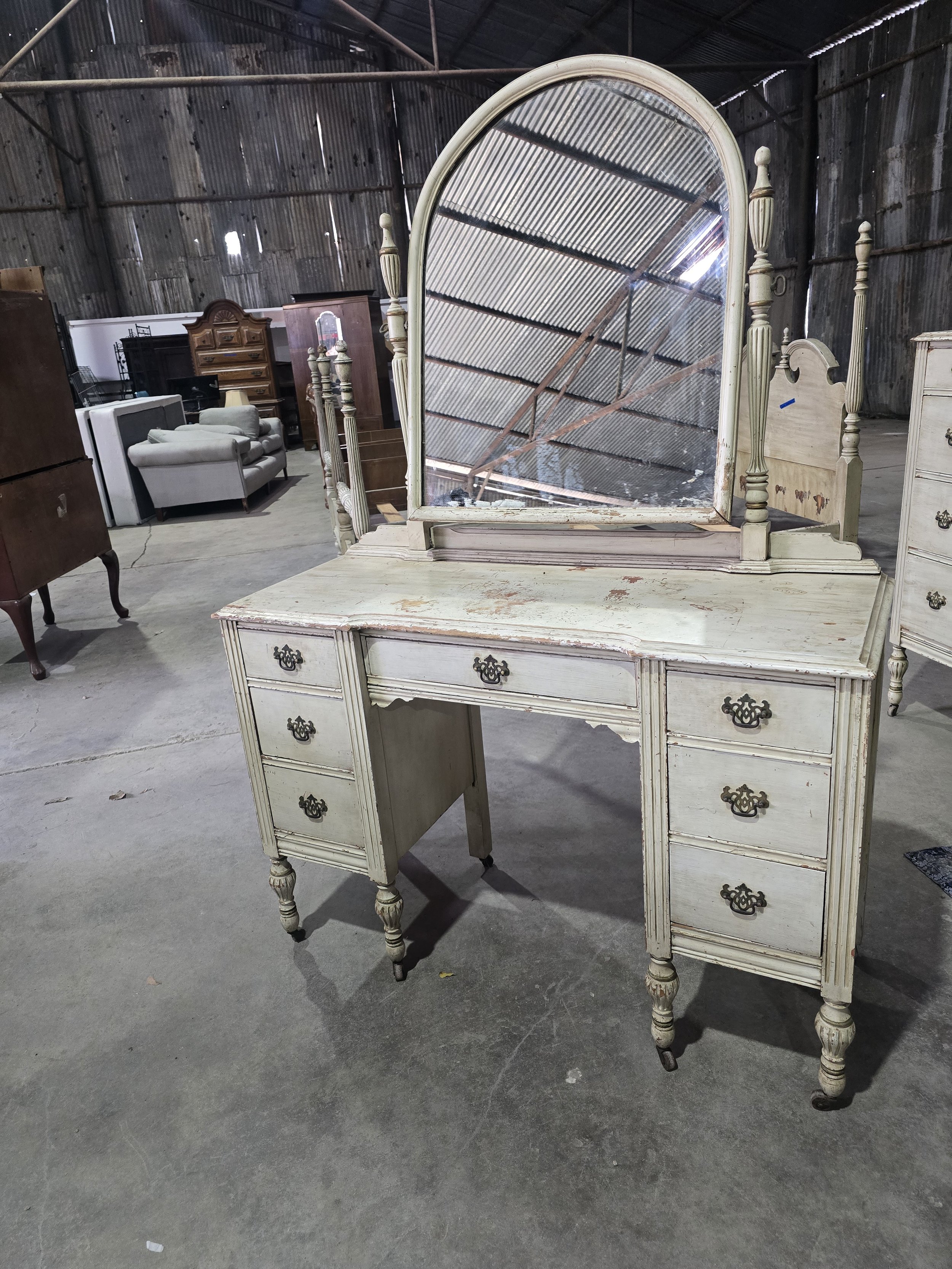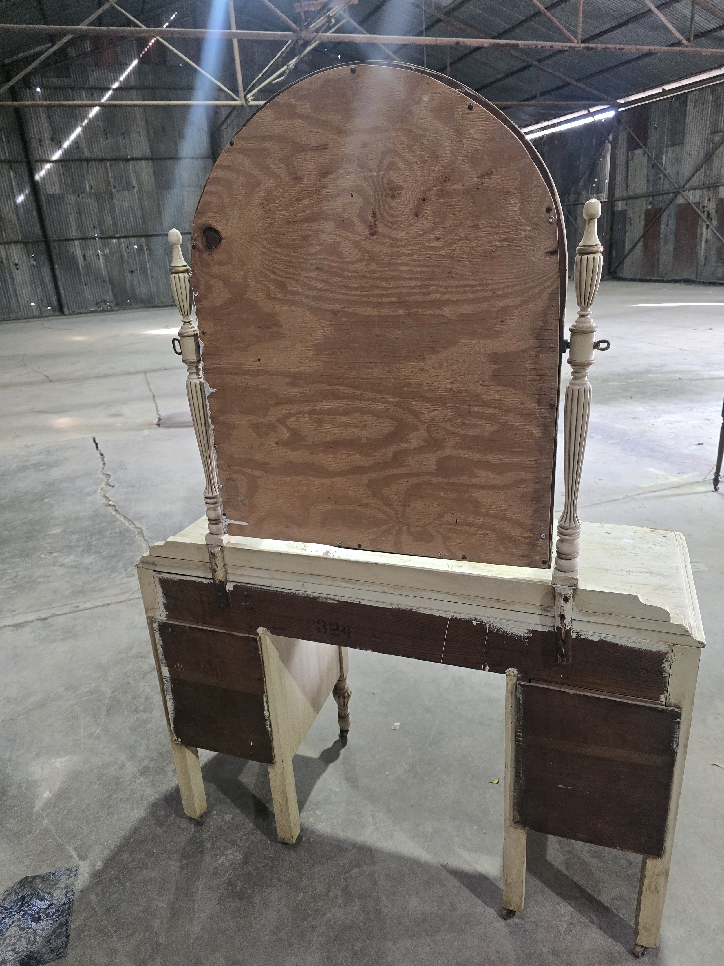 It is vintage, solid and oh so fabulous. As with all old pieces, it is not perfect-the top has missing paint and the top left corner clearly got in a battle with a wall and lost, but its issues are minor in comparison to its fabulous-ness. It has all its original hardware, including its castors (which all function). Vanity is 46” wide x 18” deep x 66.5” tall