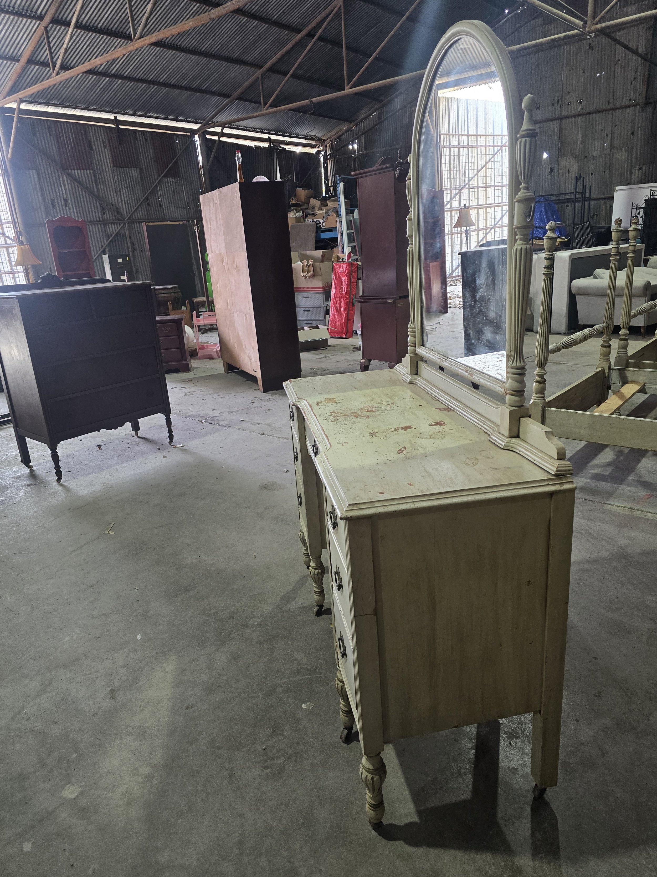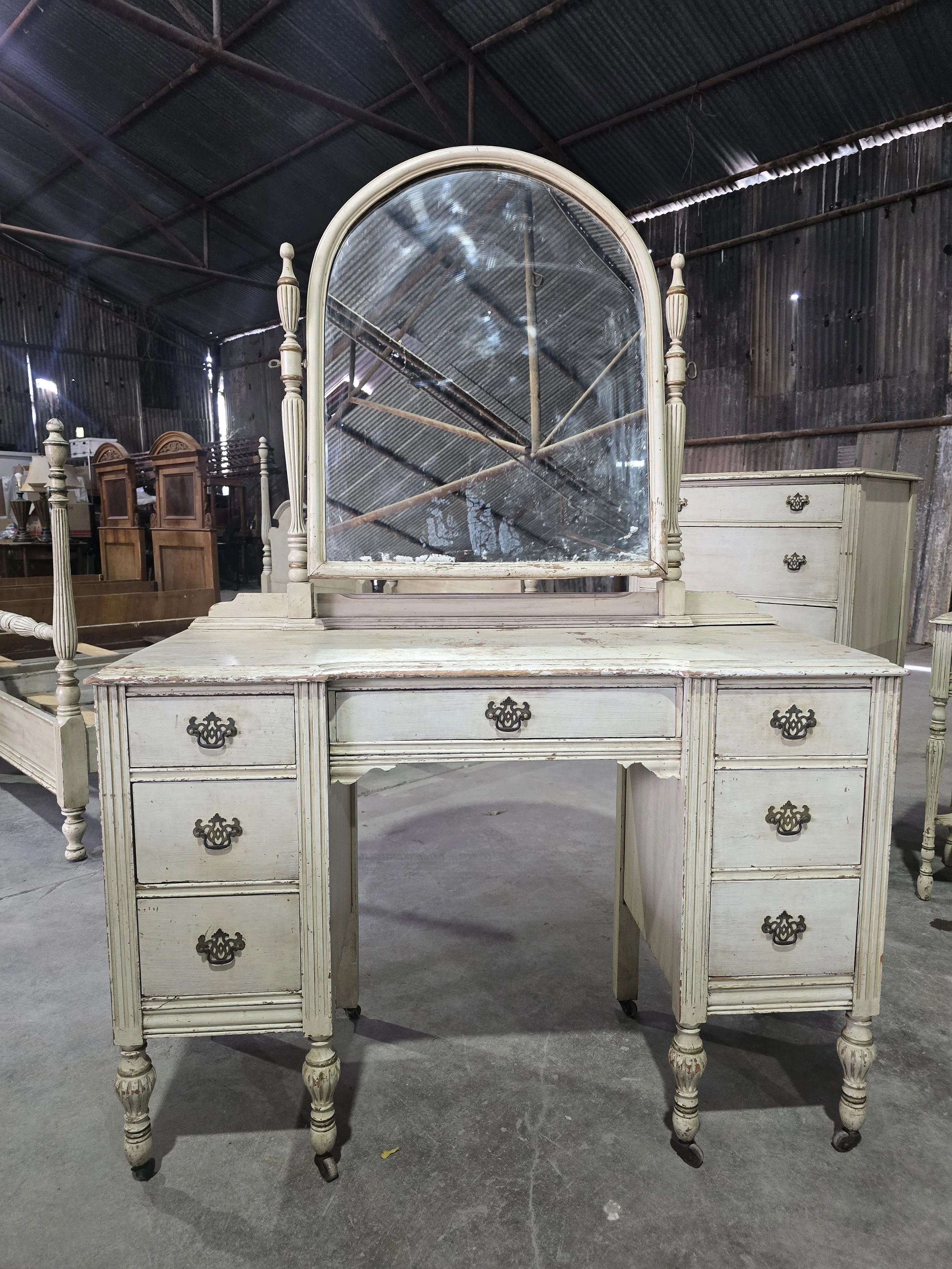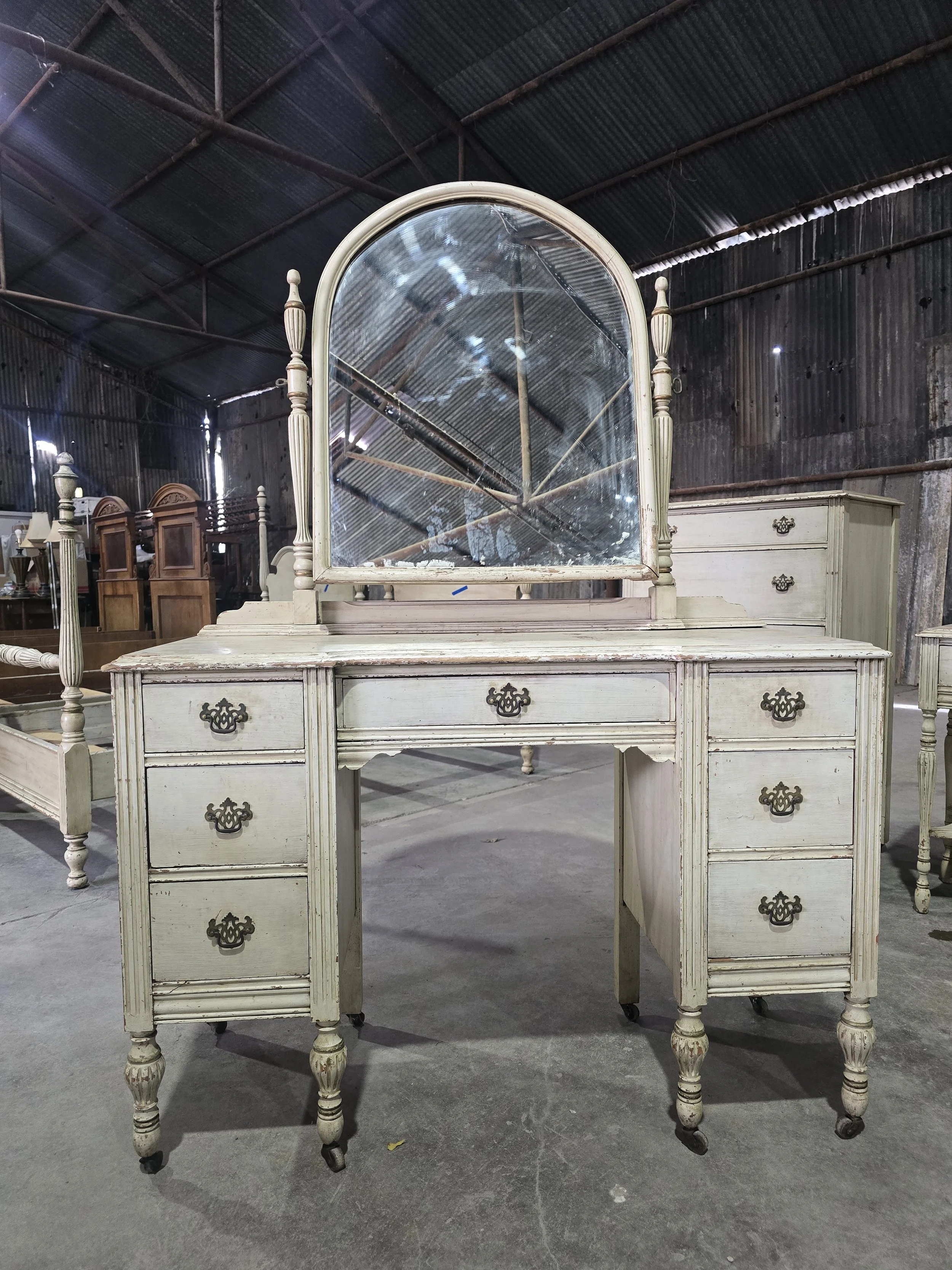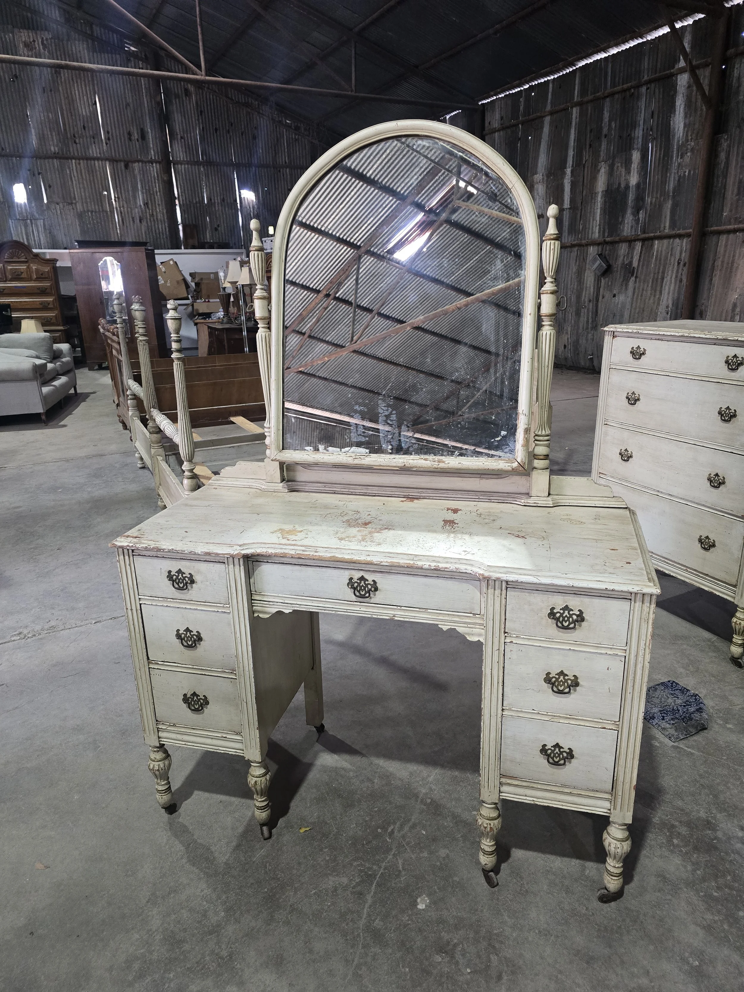 It is vintage, solid and oh so fabulous. As with all old pieces, it is not perfect-the top has missing paint and the top left corner clearly got in a battle with a wall and lost, but its issues are minor in comparison to its fabulous-ness. It has all its original hardware, including its castors (which all function). Vanity is 46” wide x 18” deep x 66.5” tall