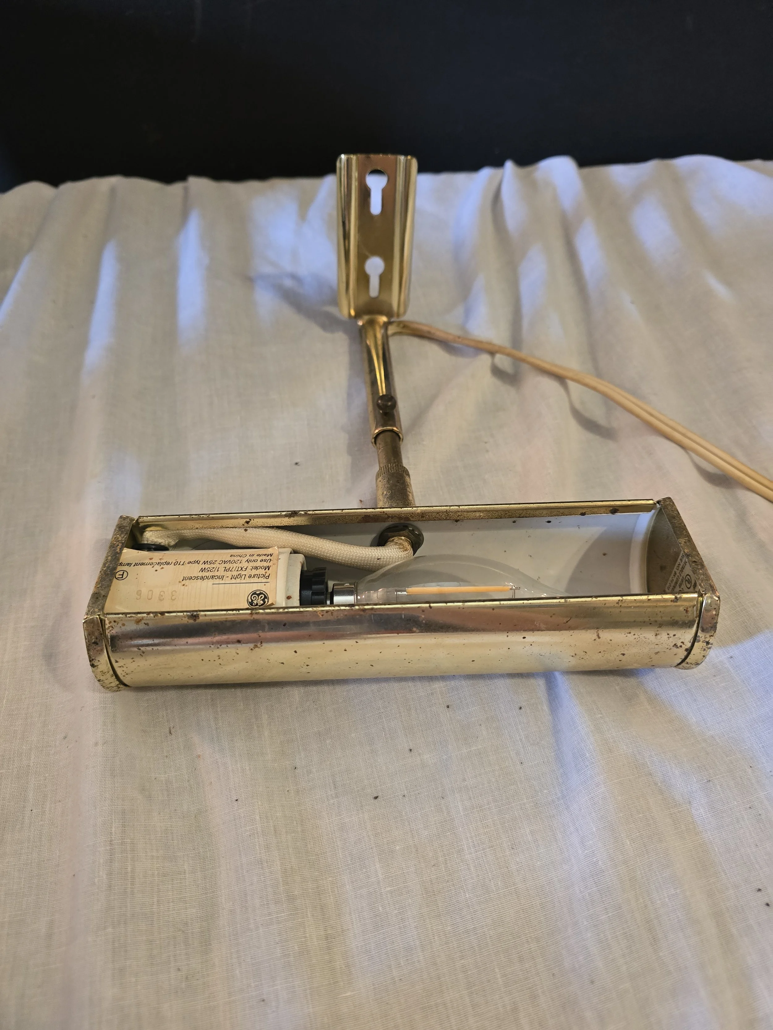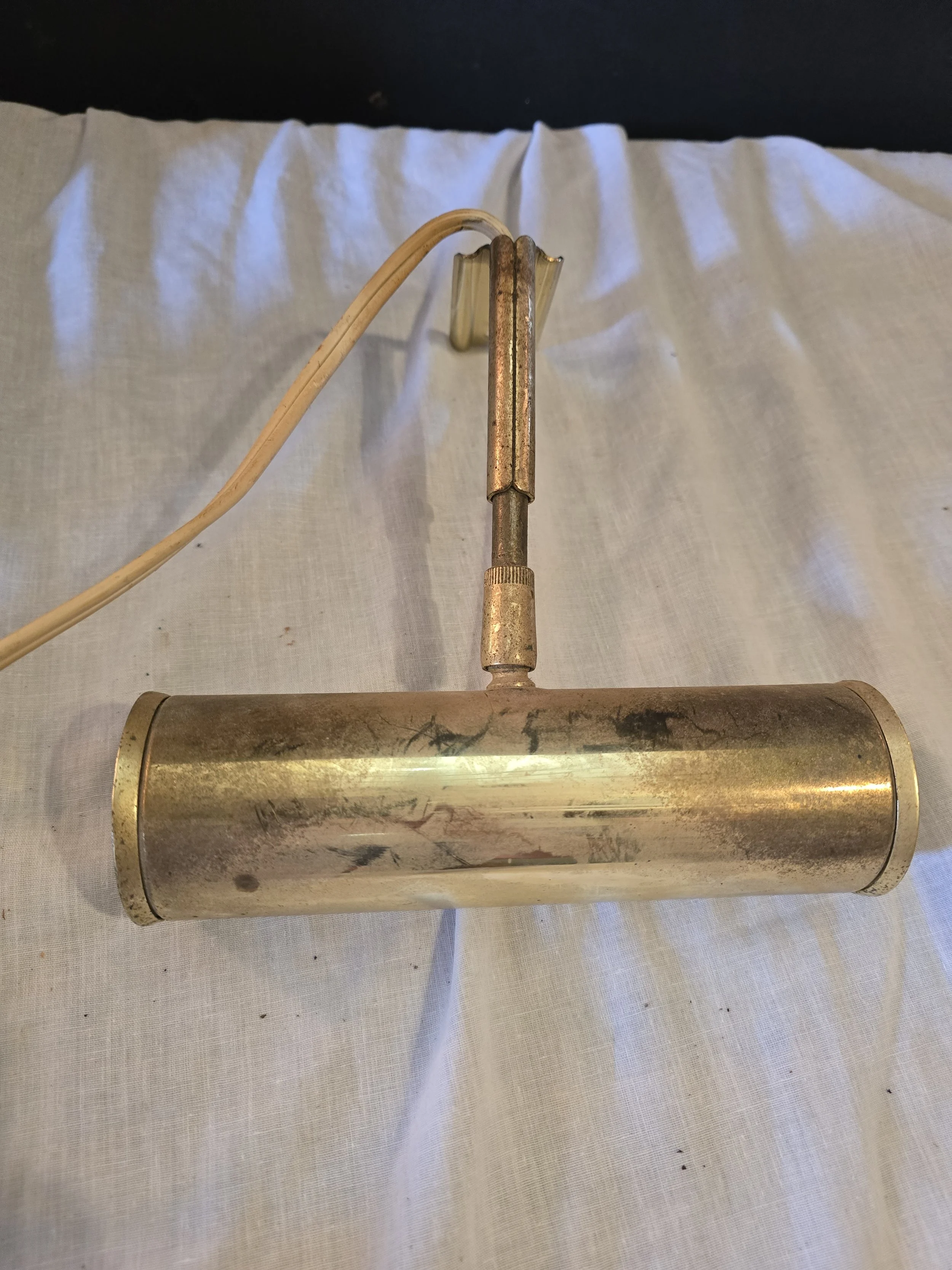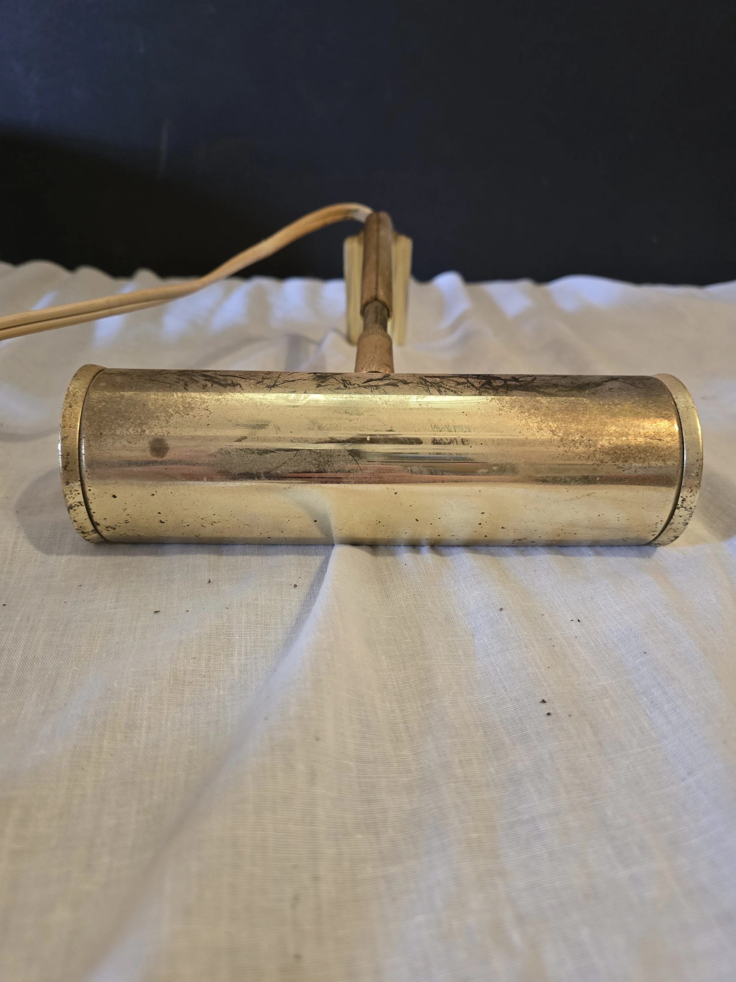 Brass toned vintage picture light. The head of the light is adjustable, as well as the length of the bar. Light does work.