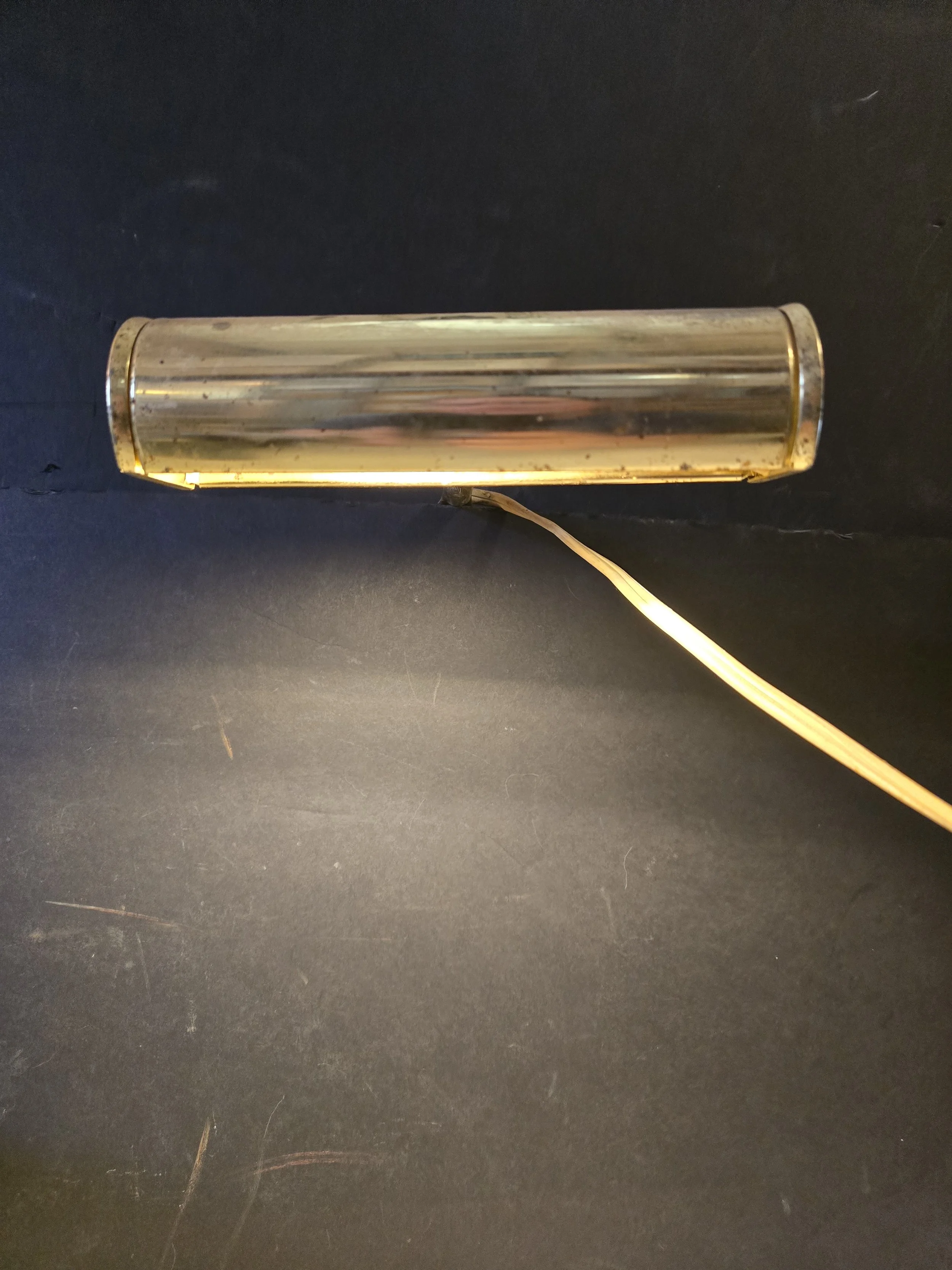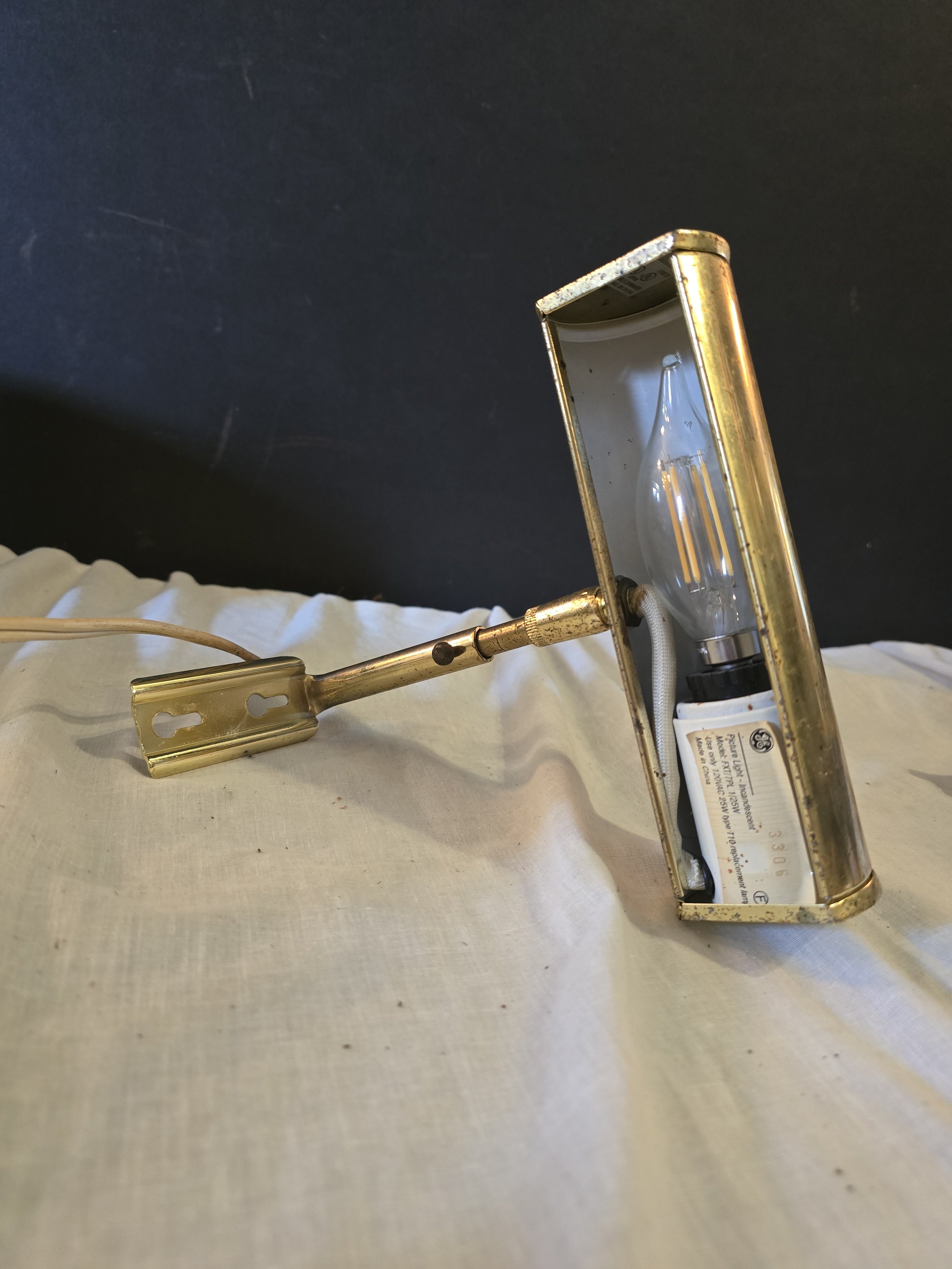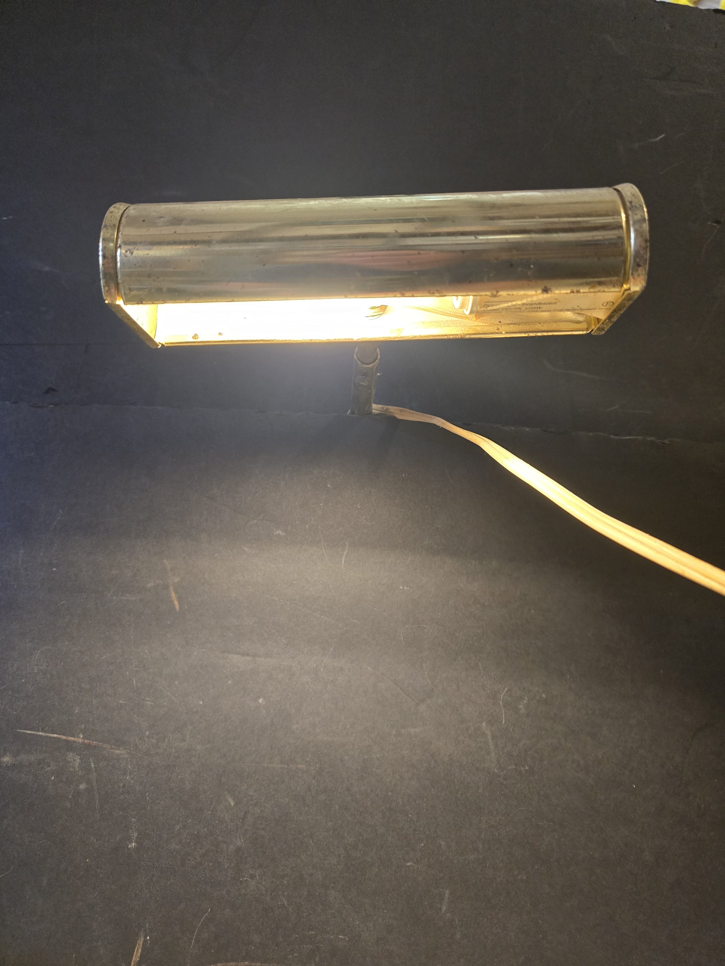 Brass toned vintage picture light. The head of the light is adjustable, as well as the length of the bar. Light does work.