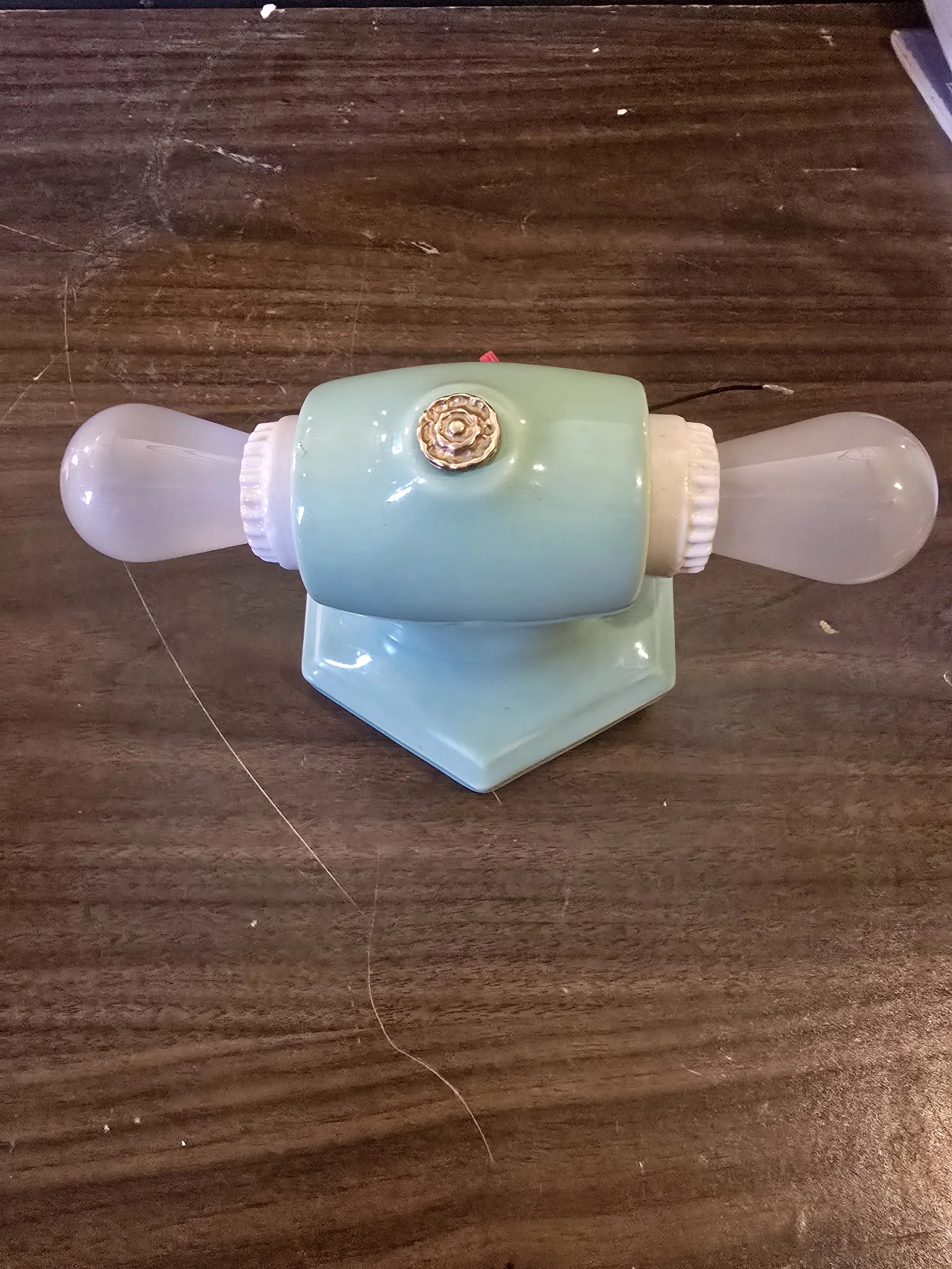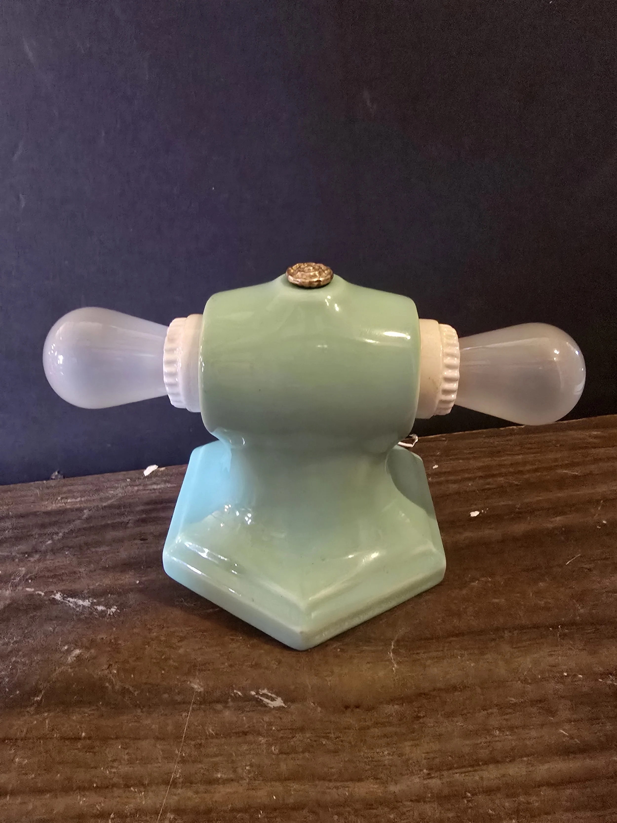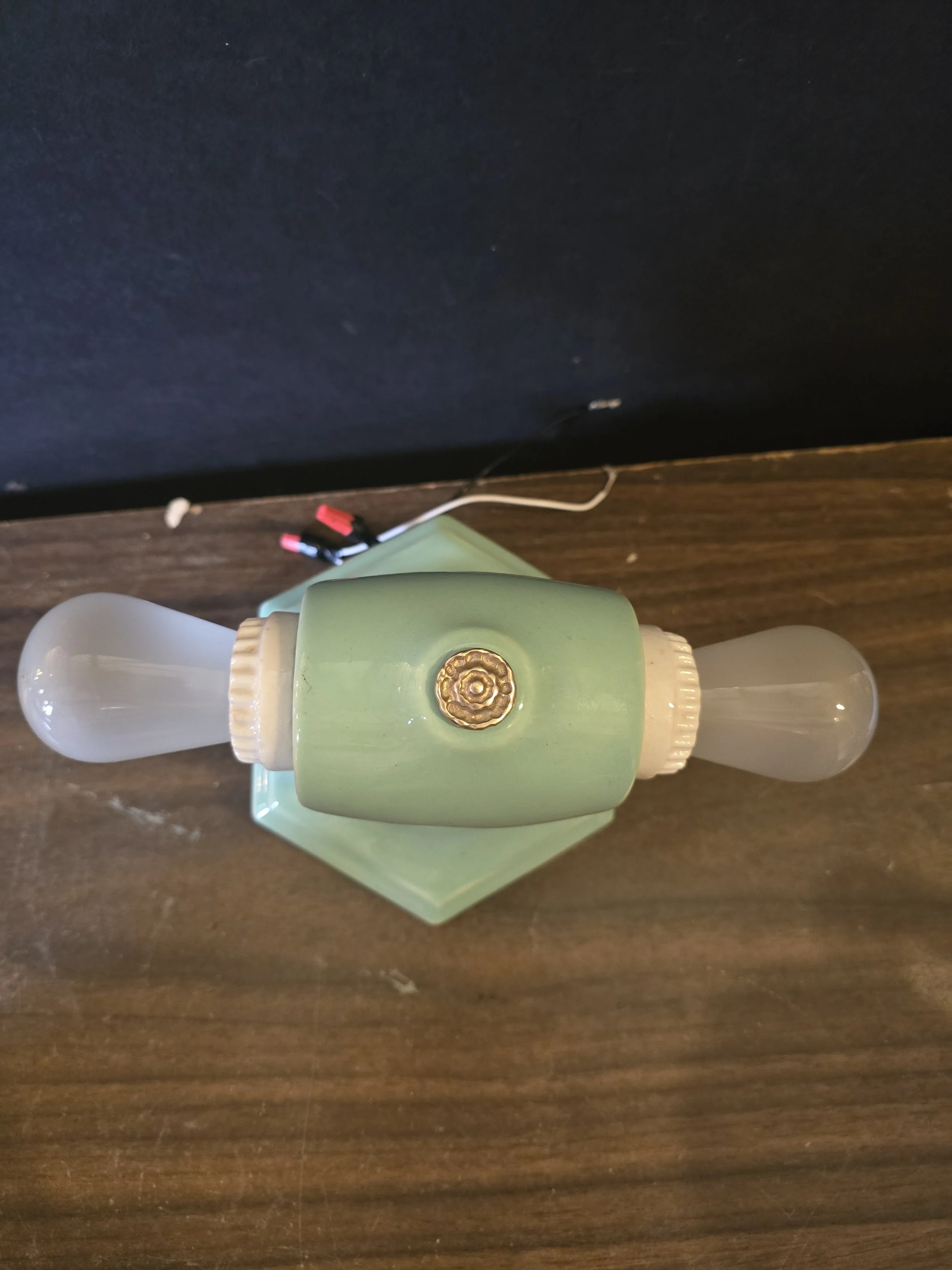 1930's mint green ceramic light fixture. This fully restored fixture has new wire and sockets. Would typically have been found in a bathroom but could be used anywhere.