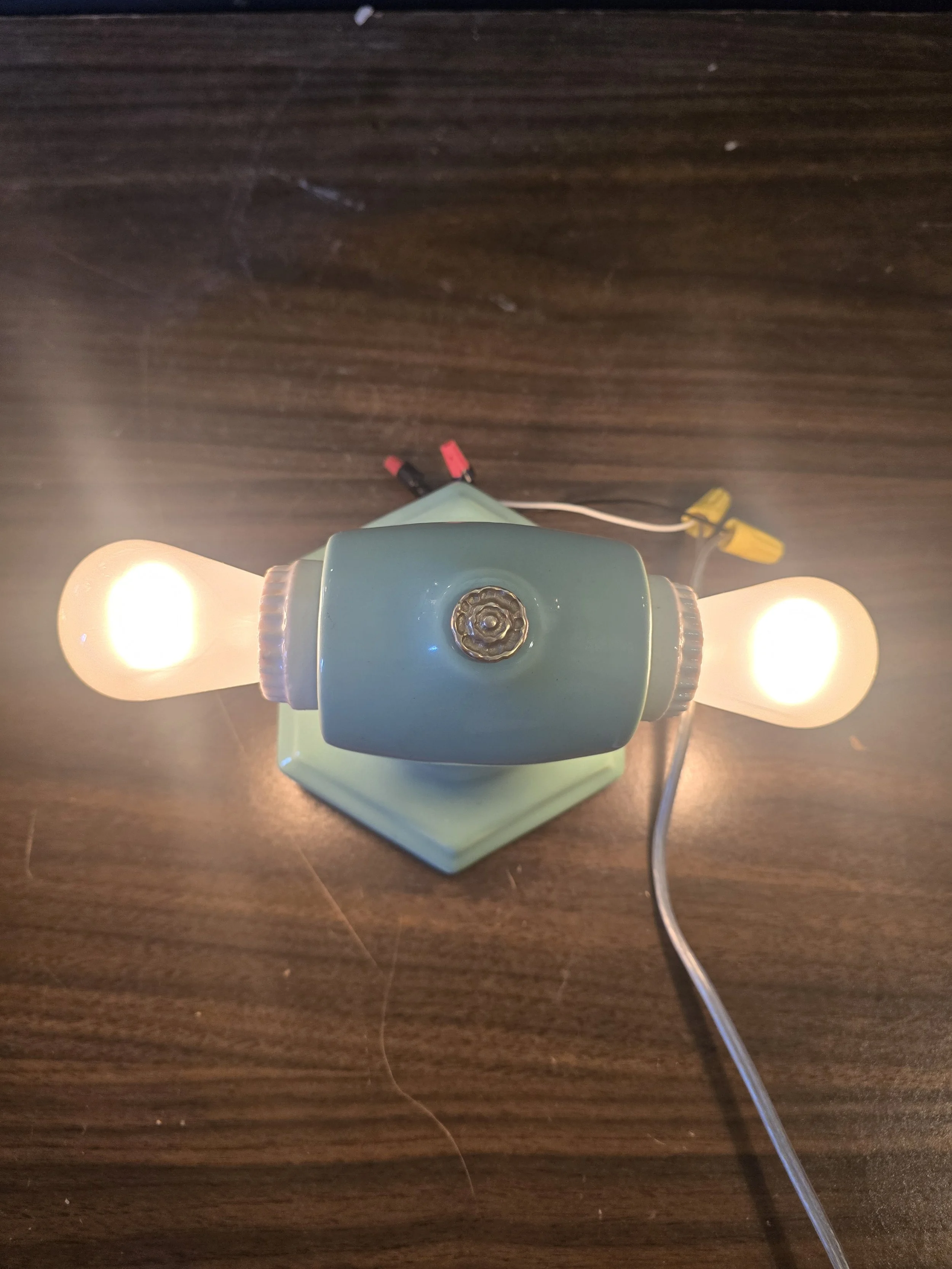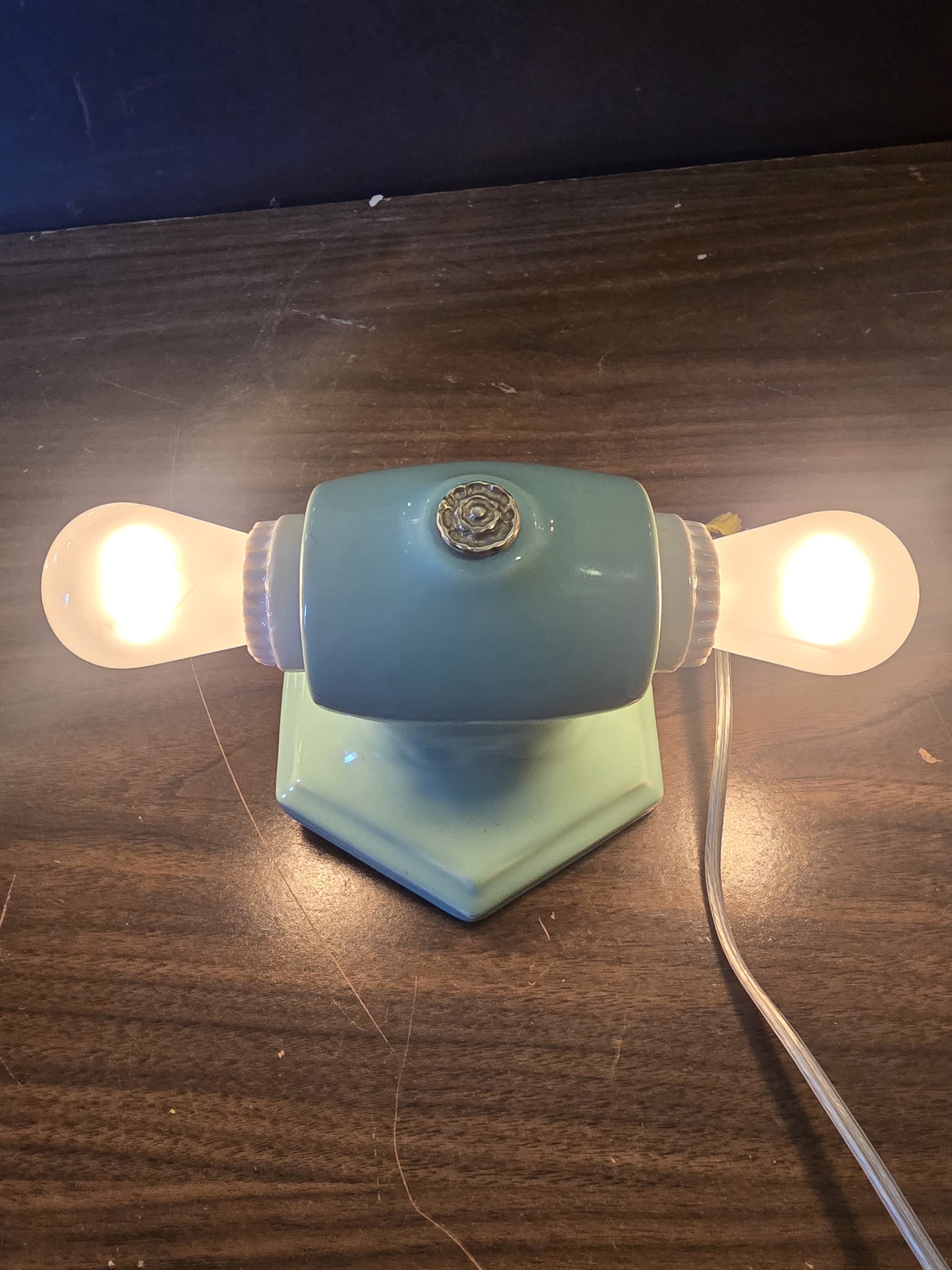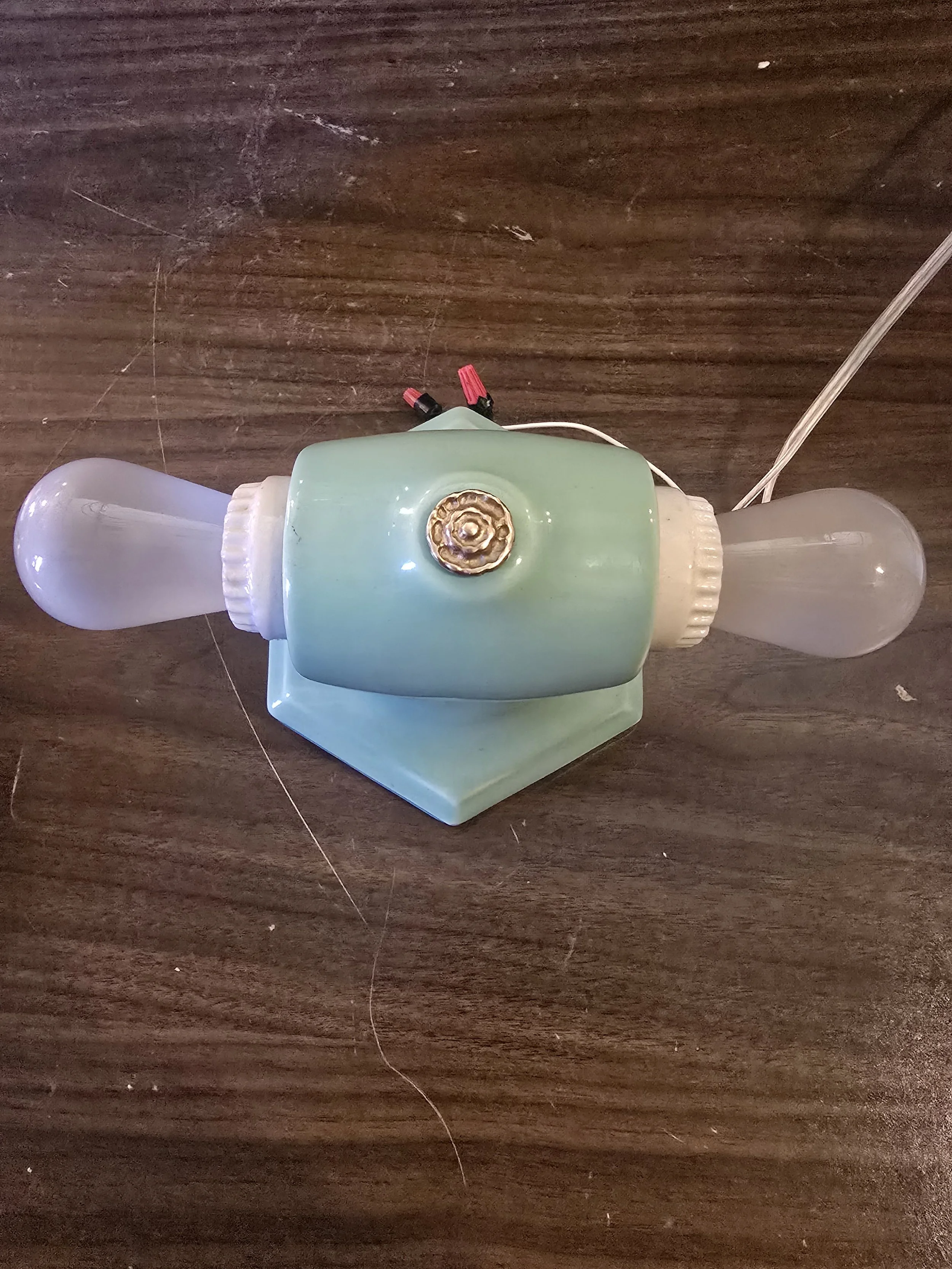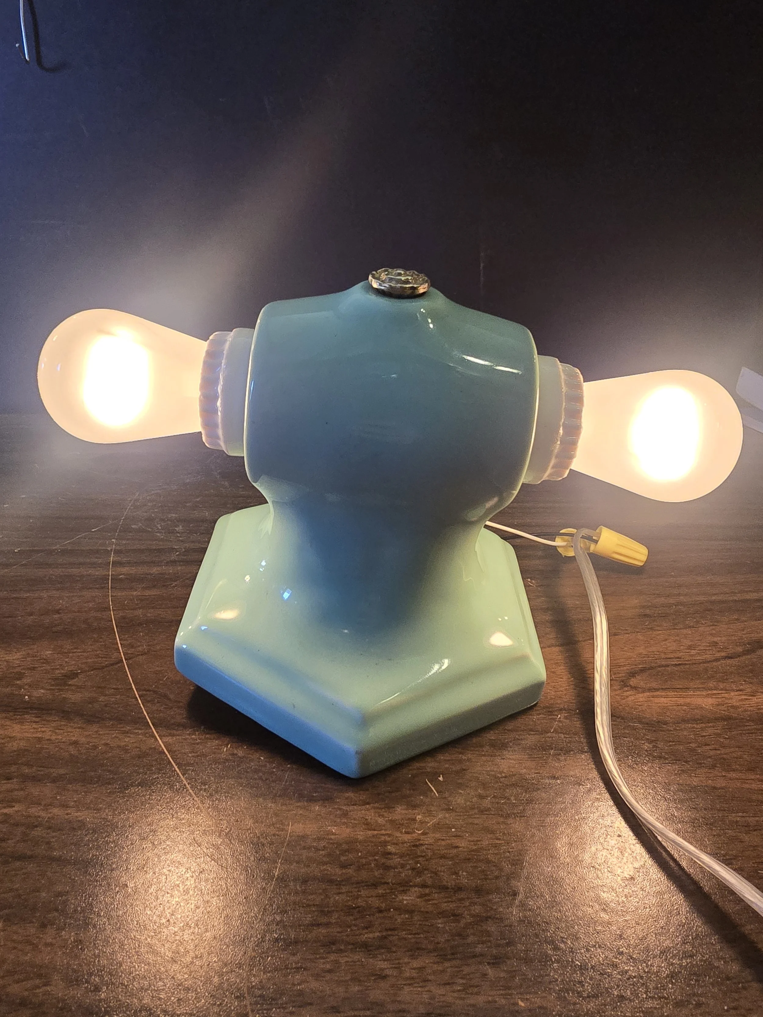 1930's mint green ceramic light fixture. This fully restored fixture has new wire and sockets. Would typically have been found in a bathroom but could be used anywhere.
