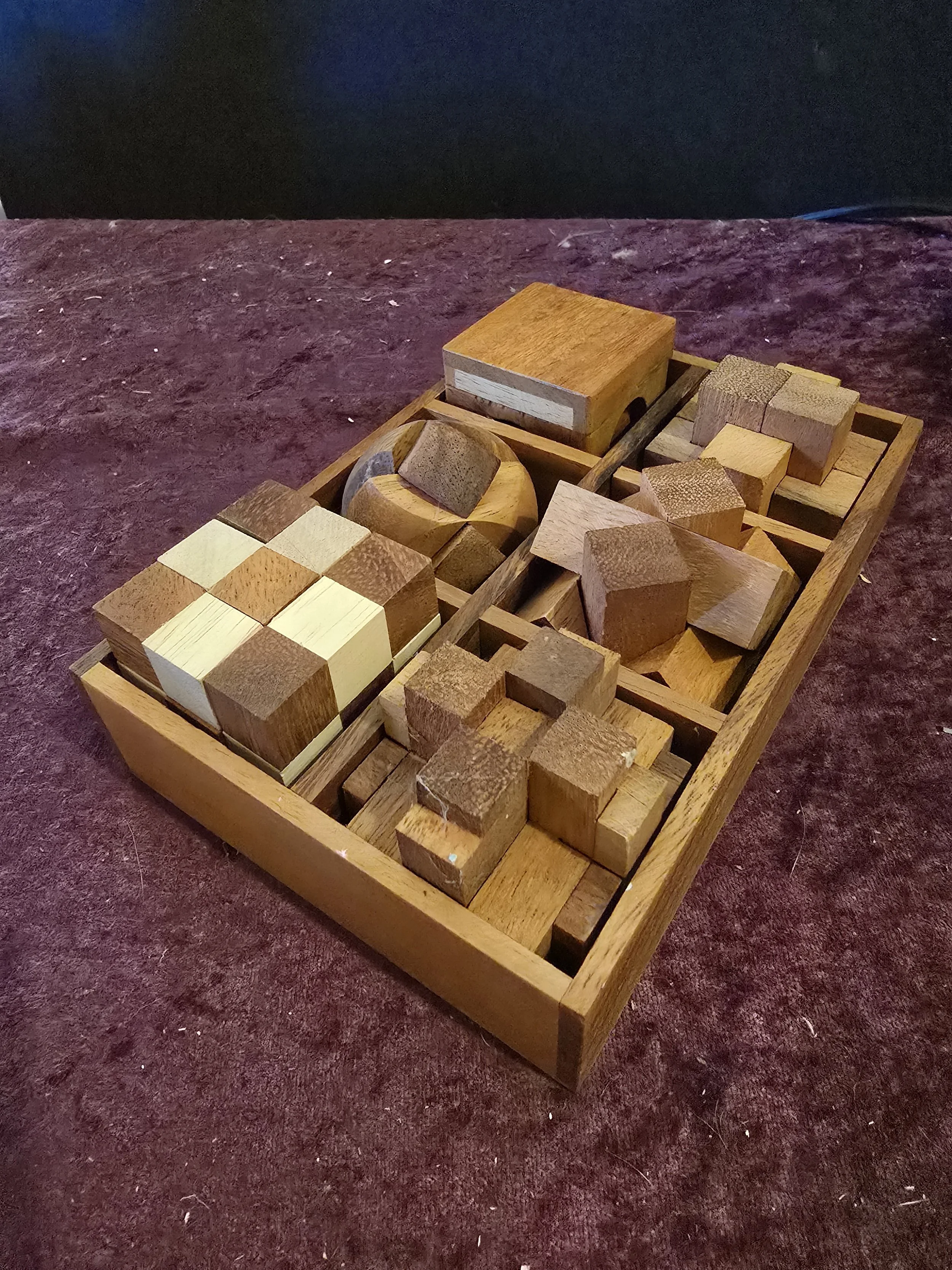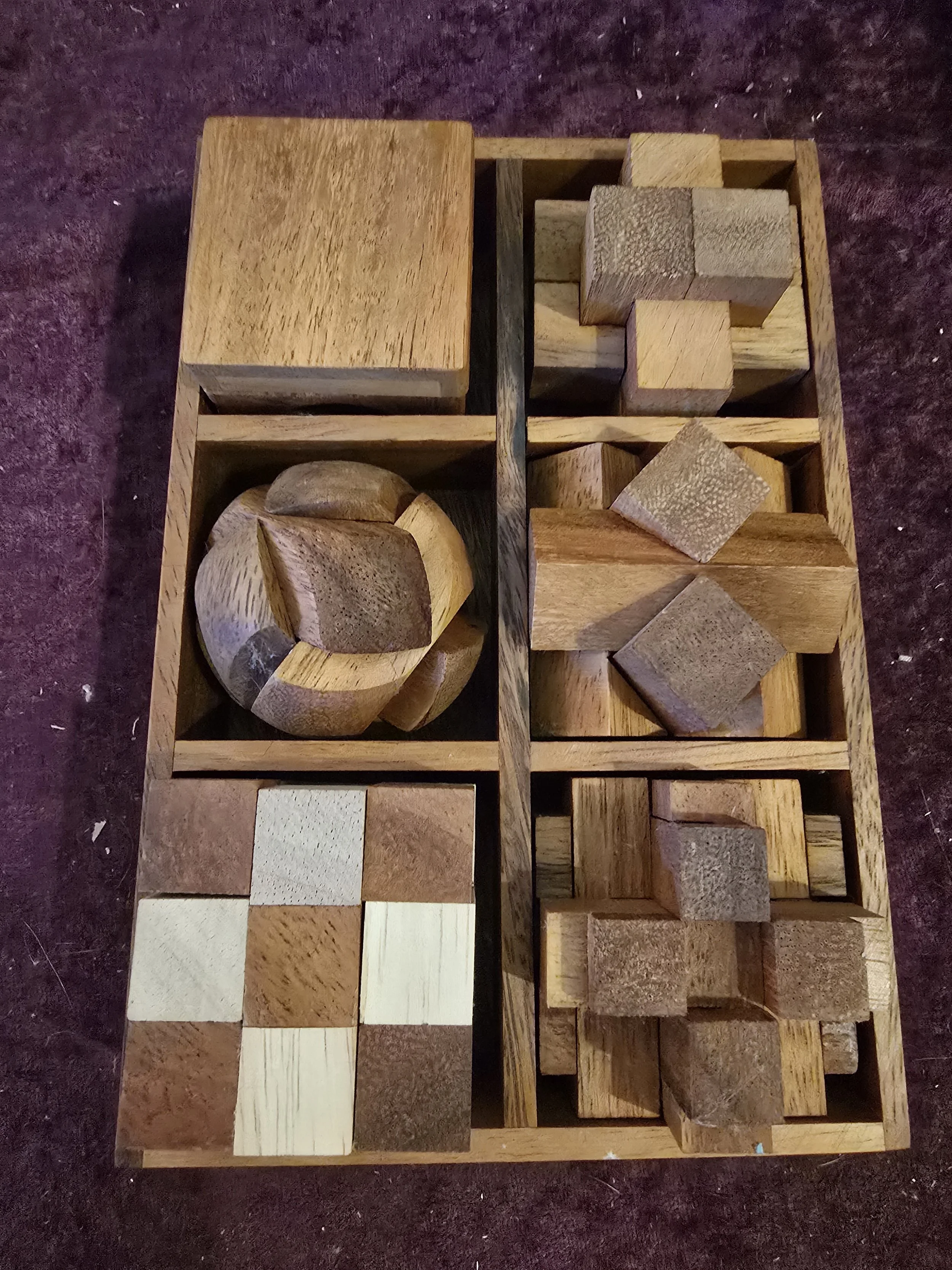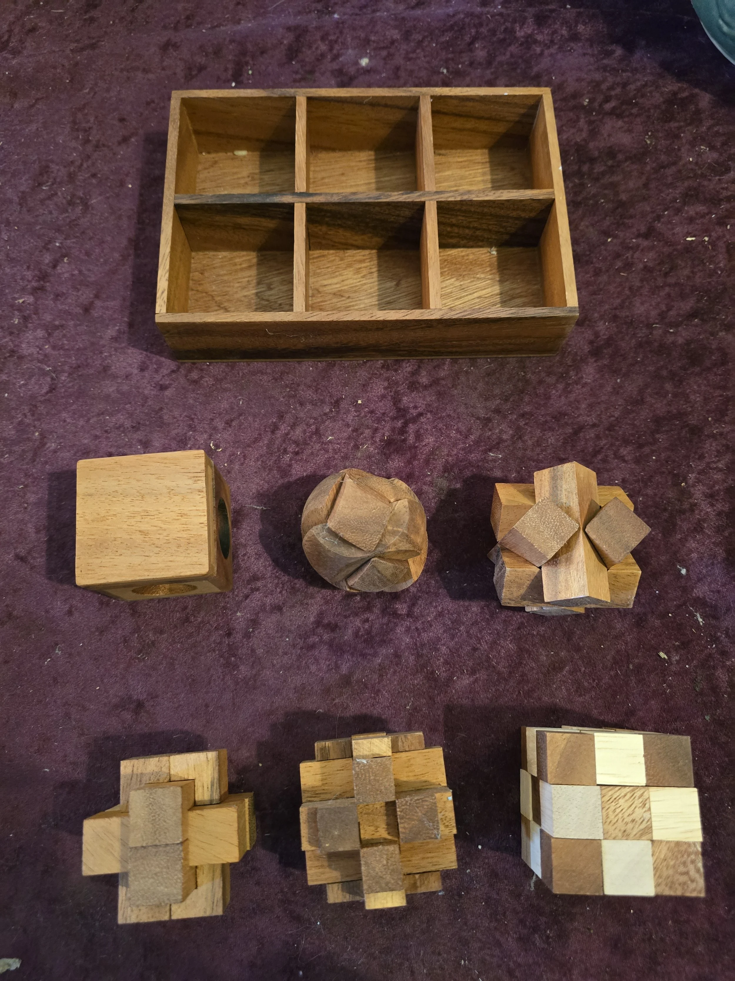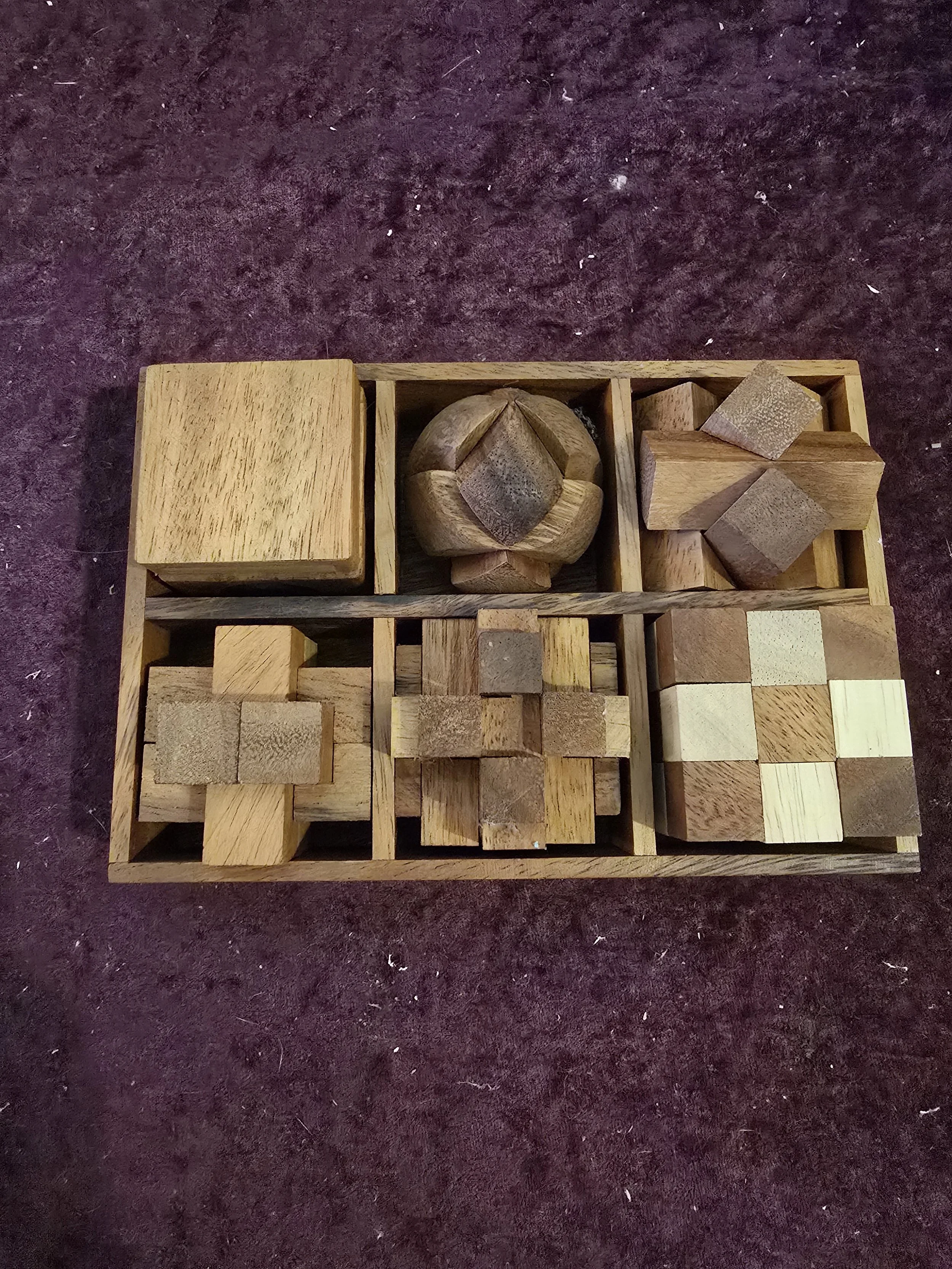 Set of 6 wood puzzles in a wood box.