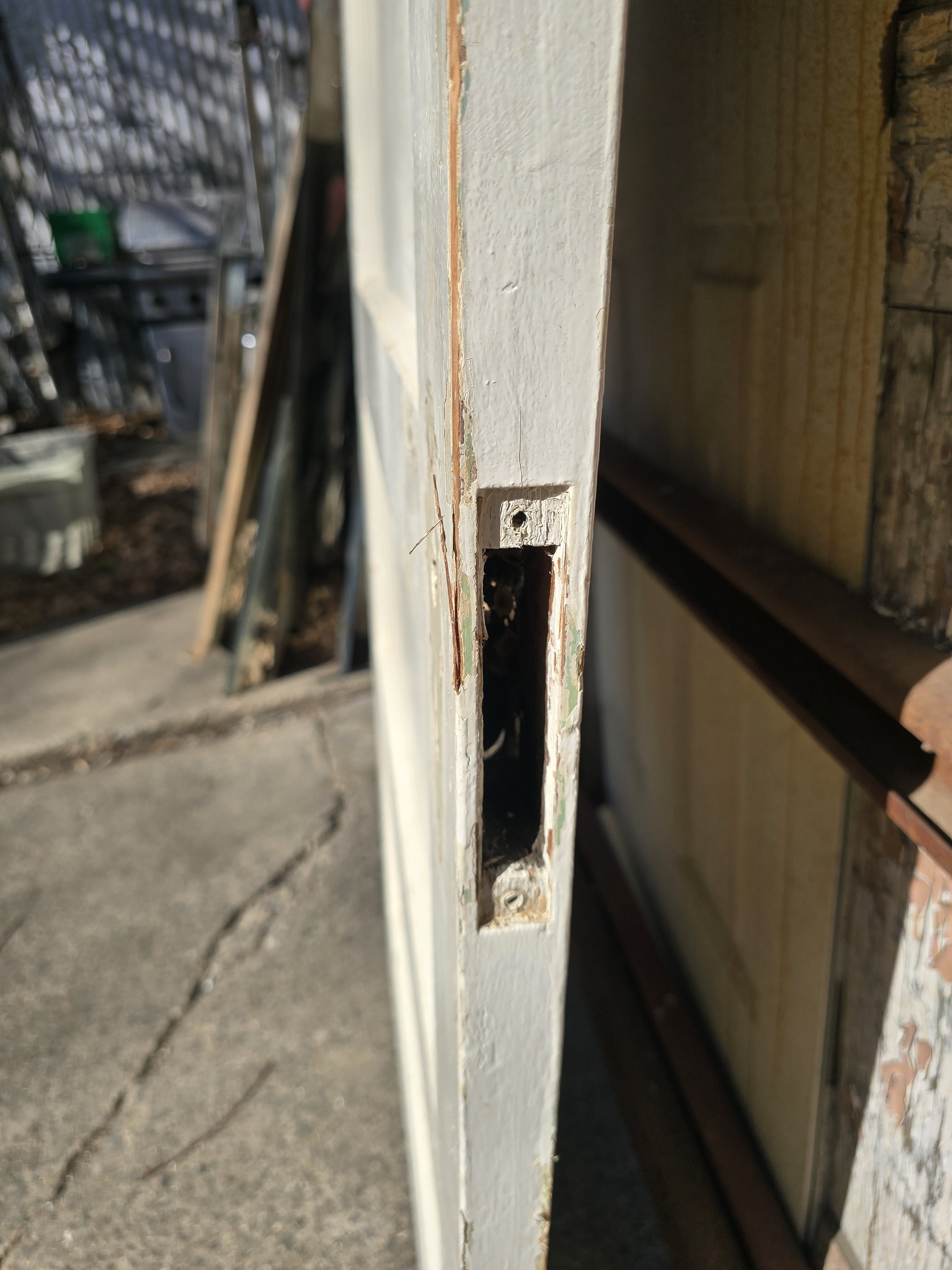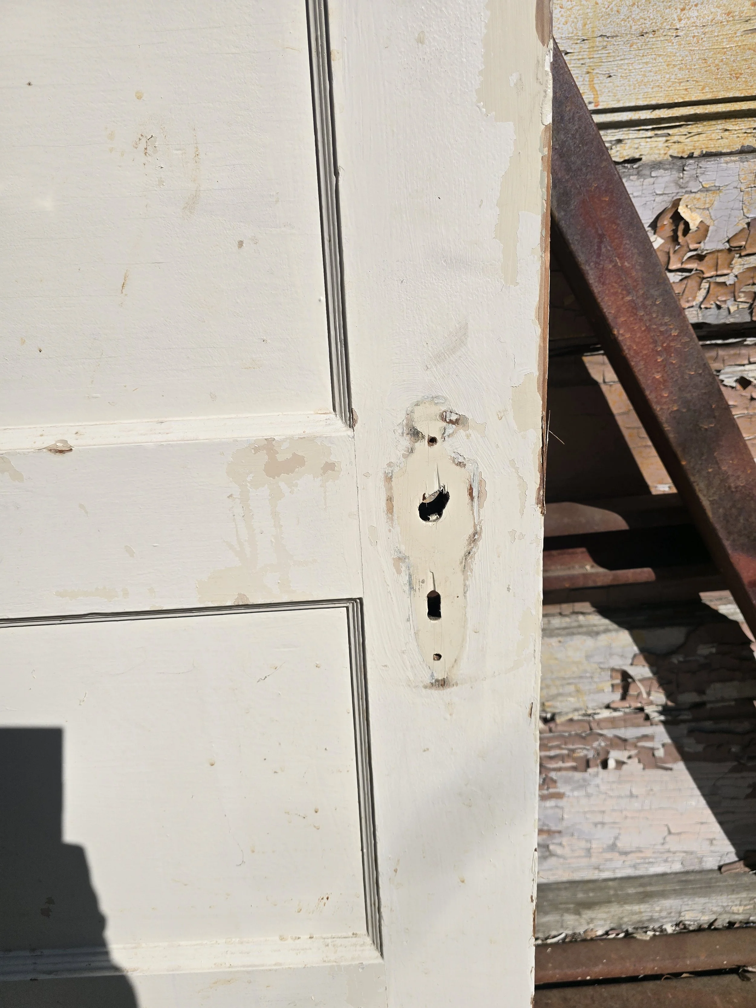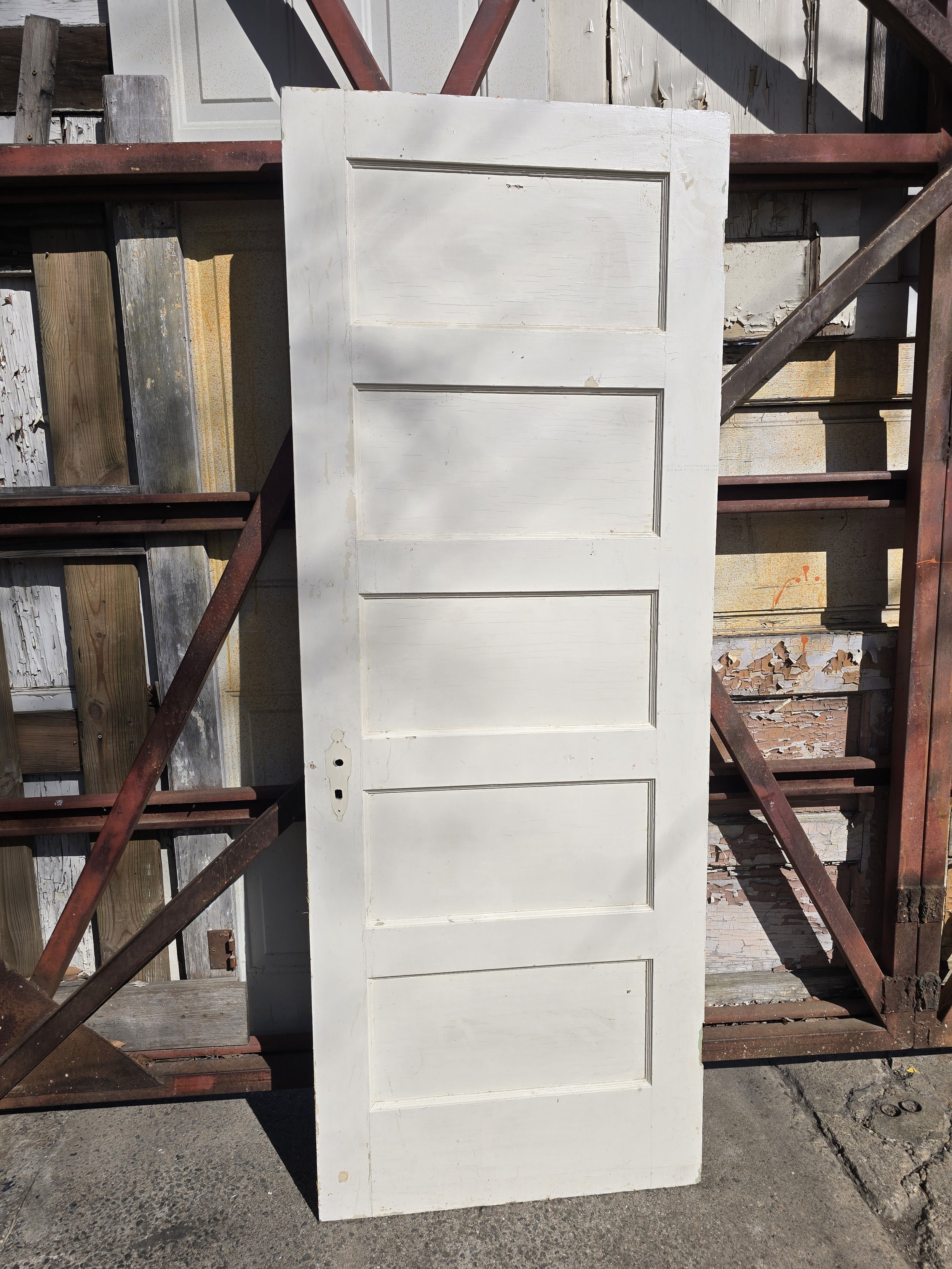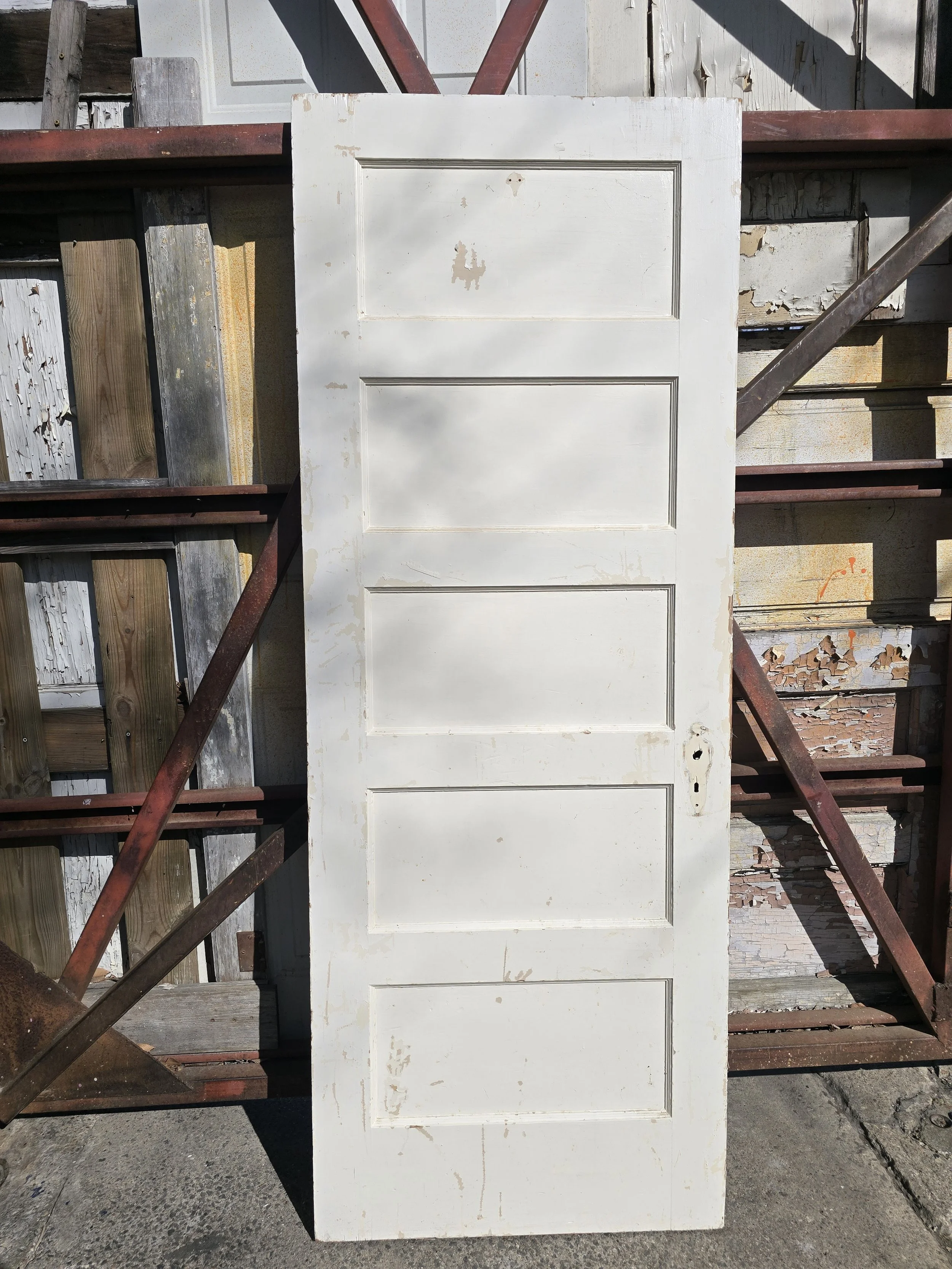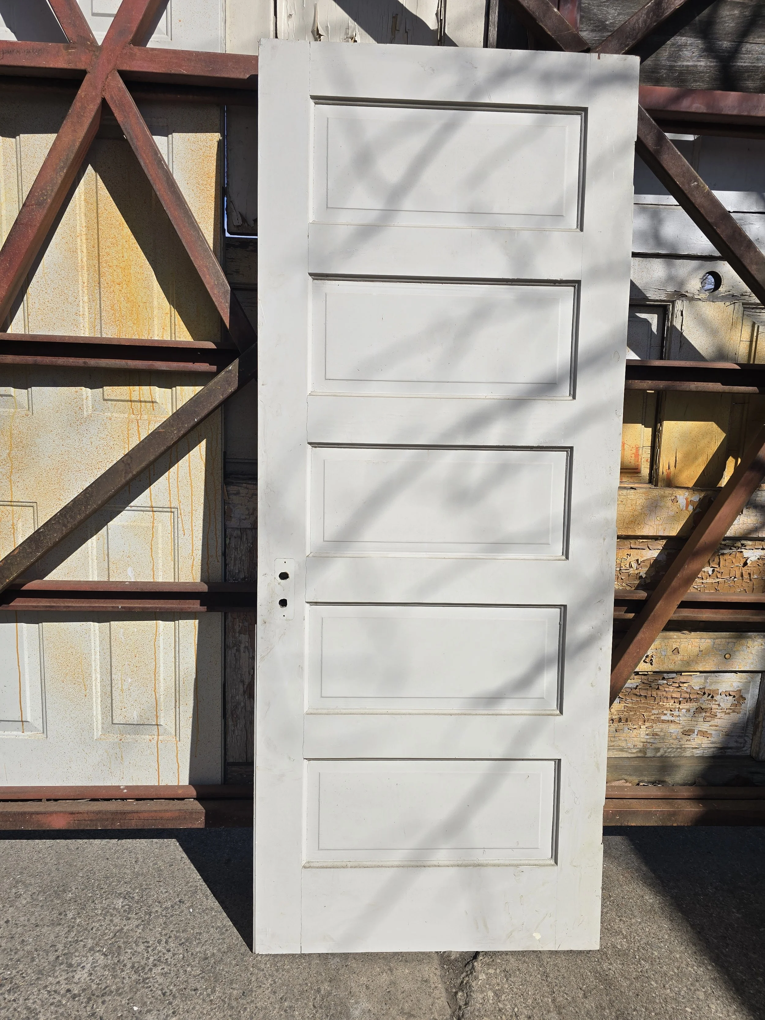 Solid wood interior 5 panel door. Door is cut for a mortise lock. Overall in good condition.