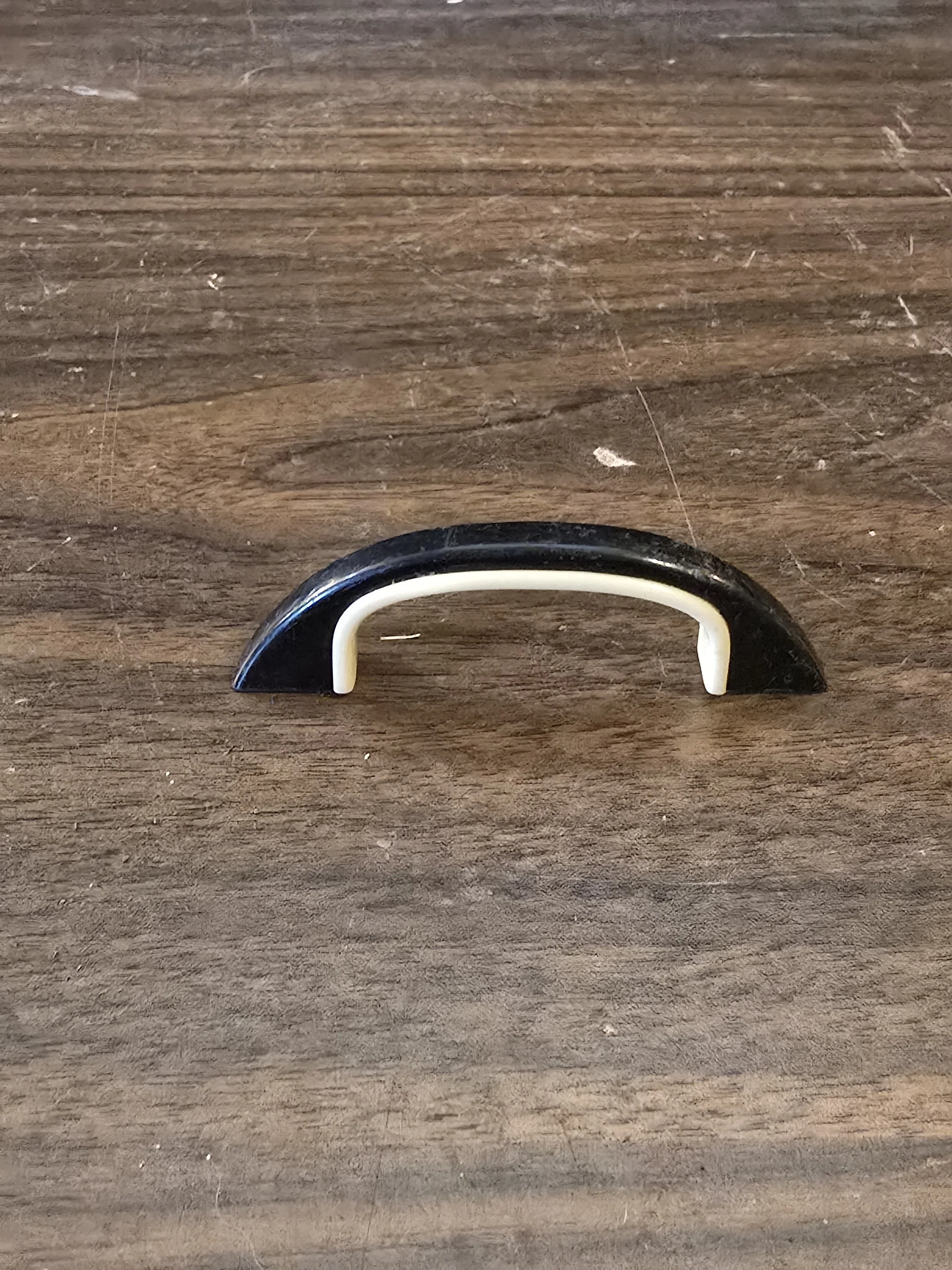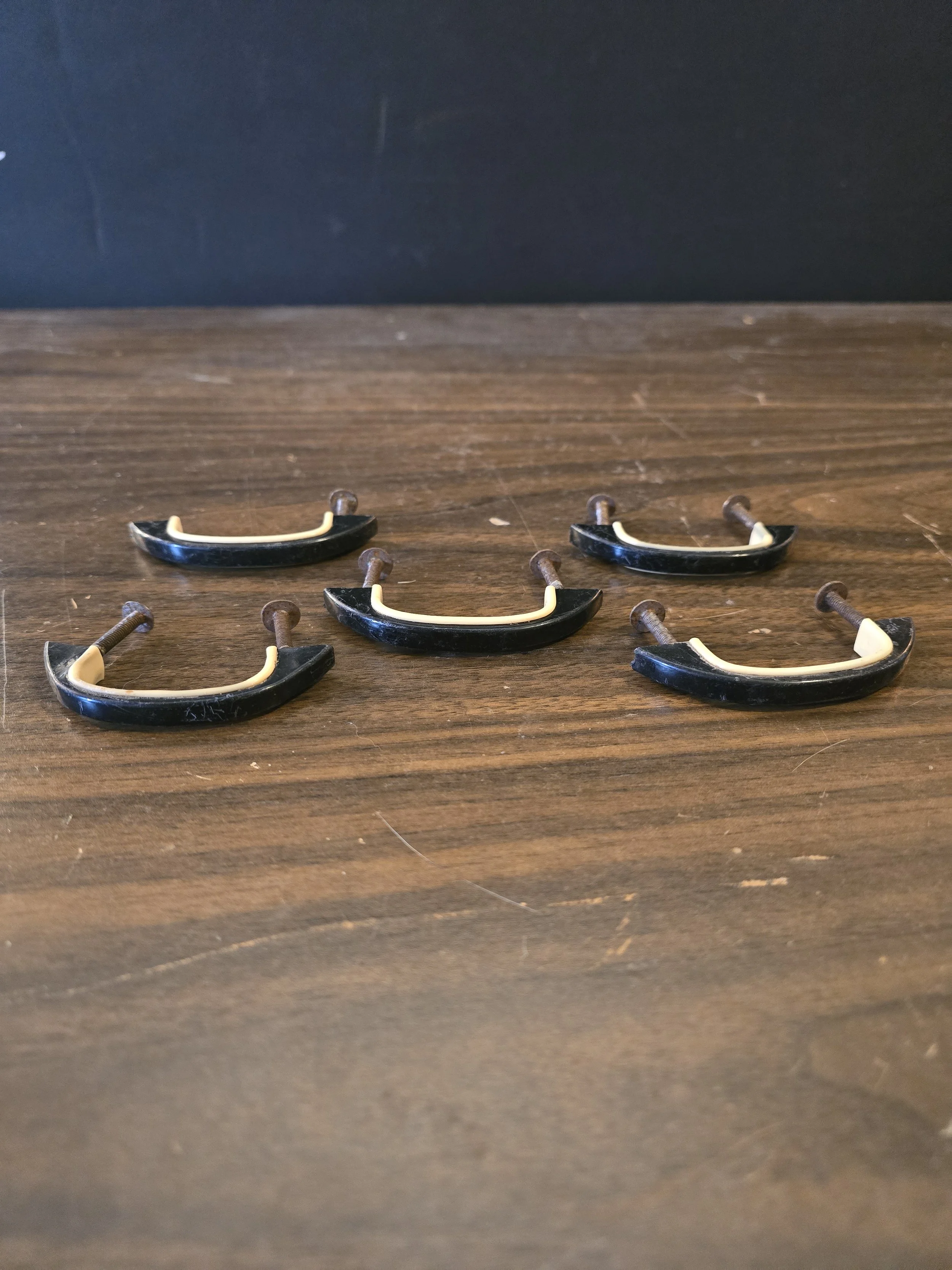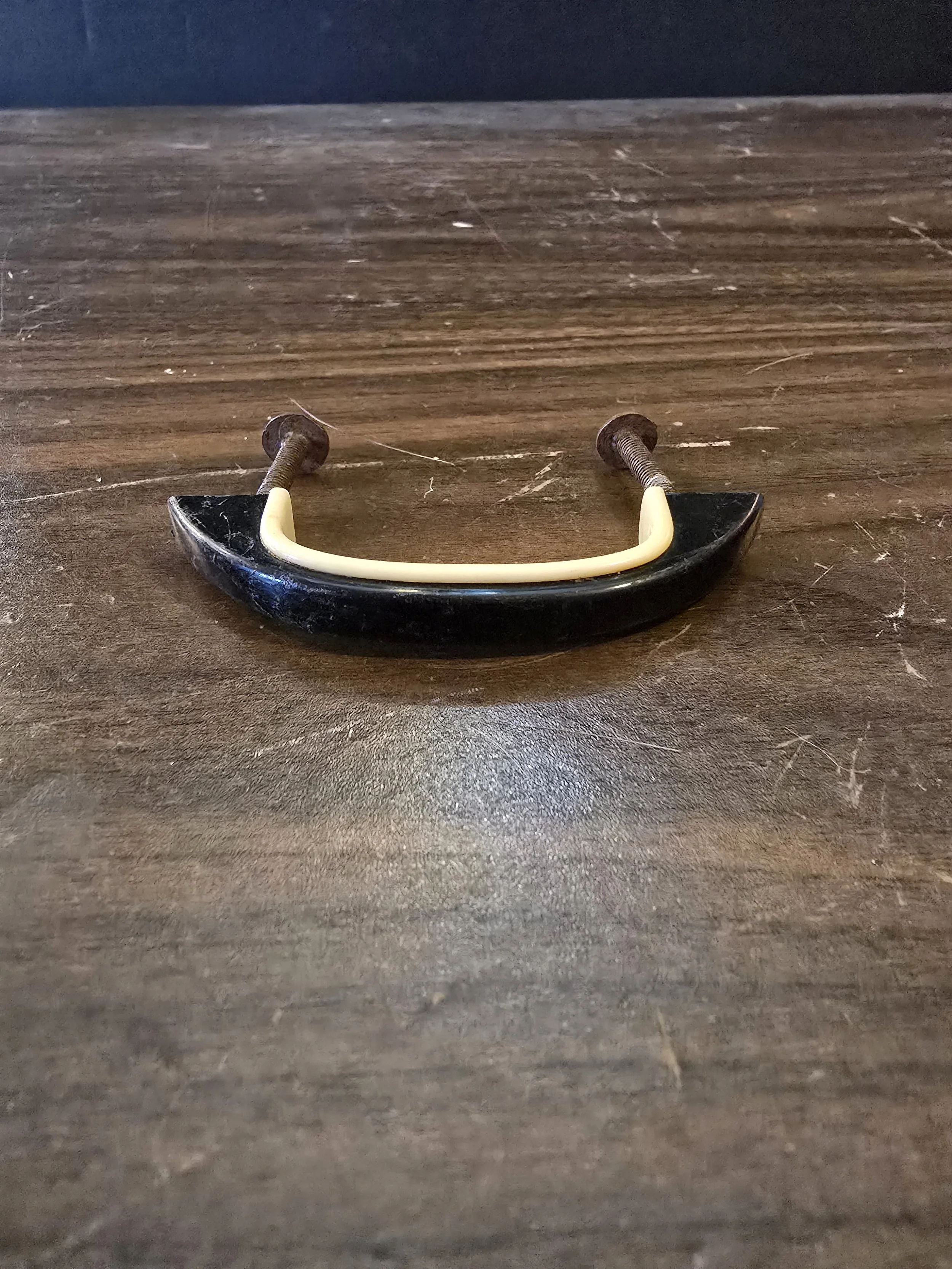 1940's bakelite pull. The pulls are black and Cream. We currently have 5 matching. We also currently have 13 matching knobs.