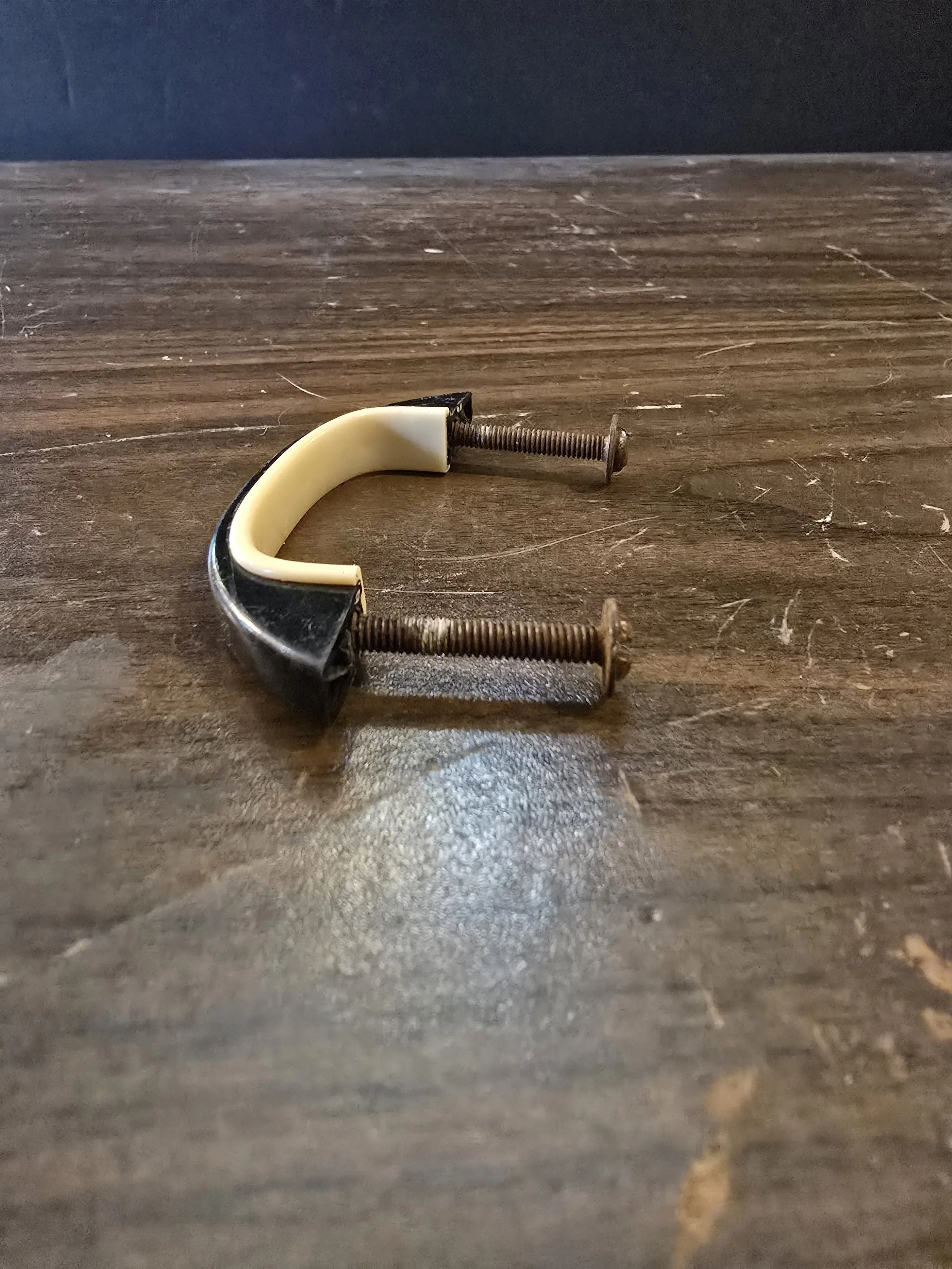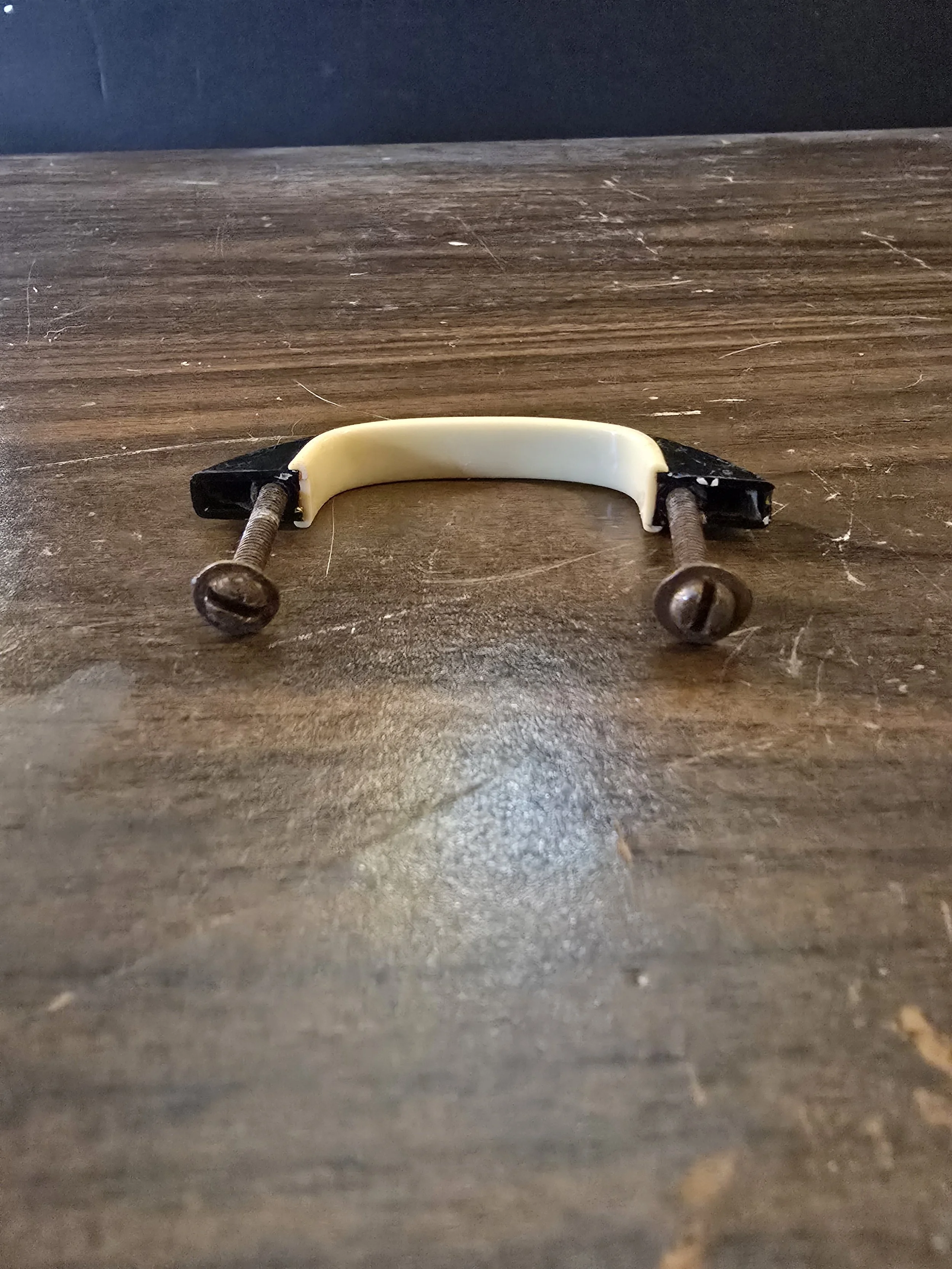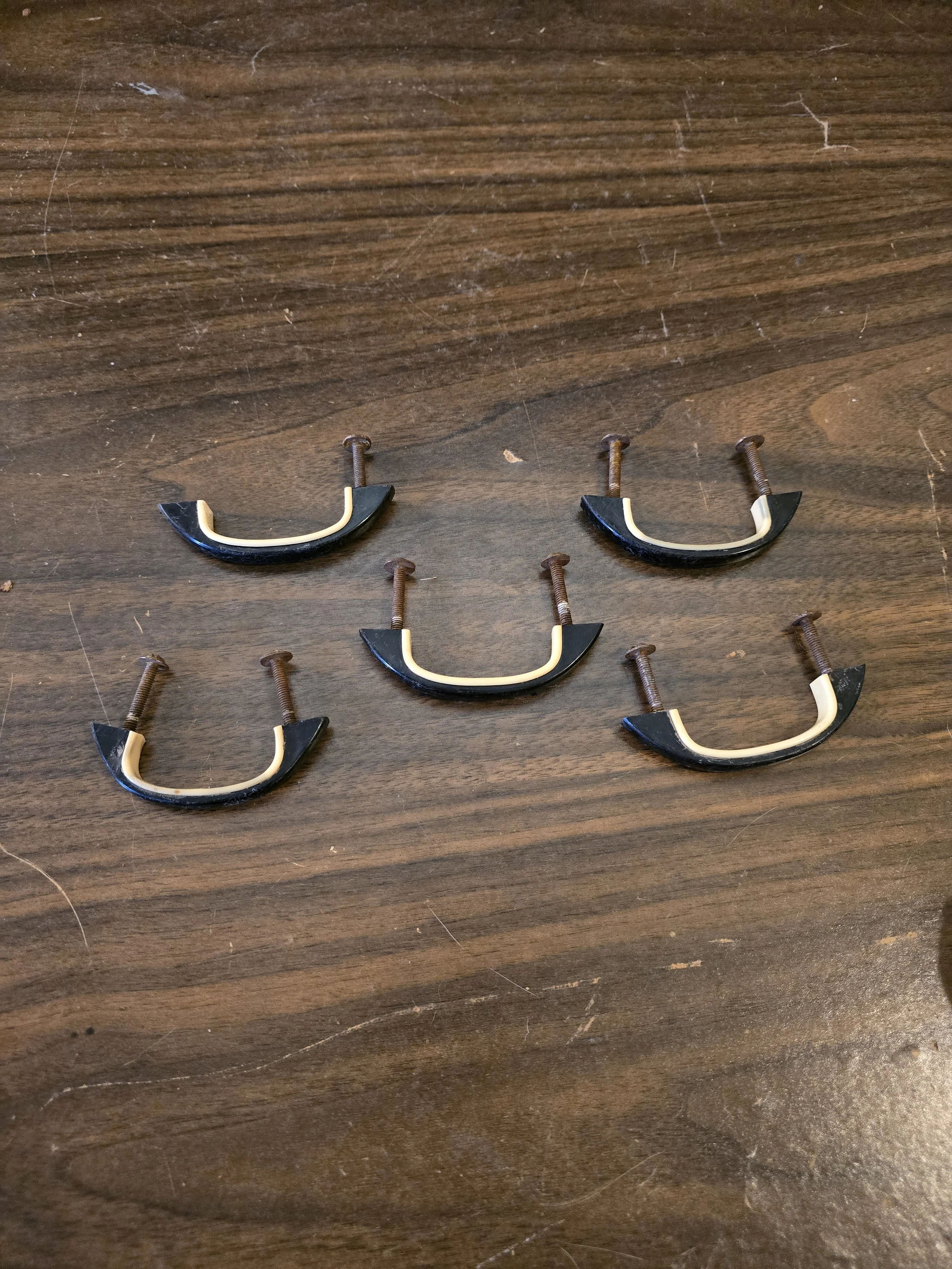 1940's bakelite pull. The pulls are black and Cream. We currently have 5 matching. We also currently have 13 matching knobs.